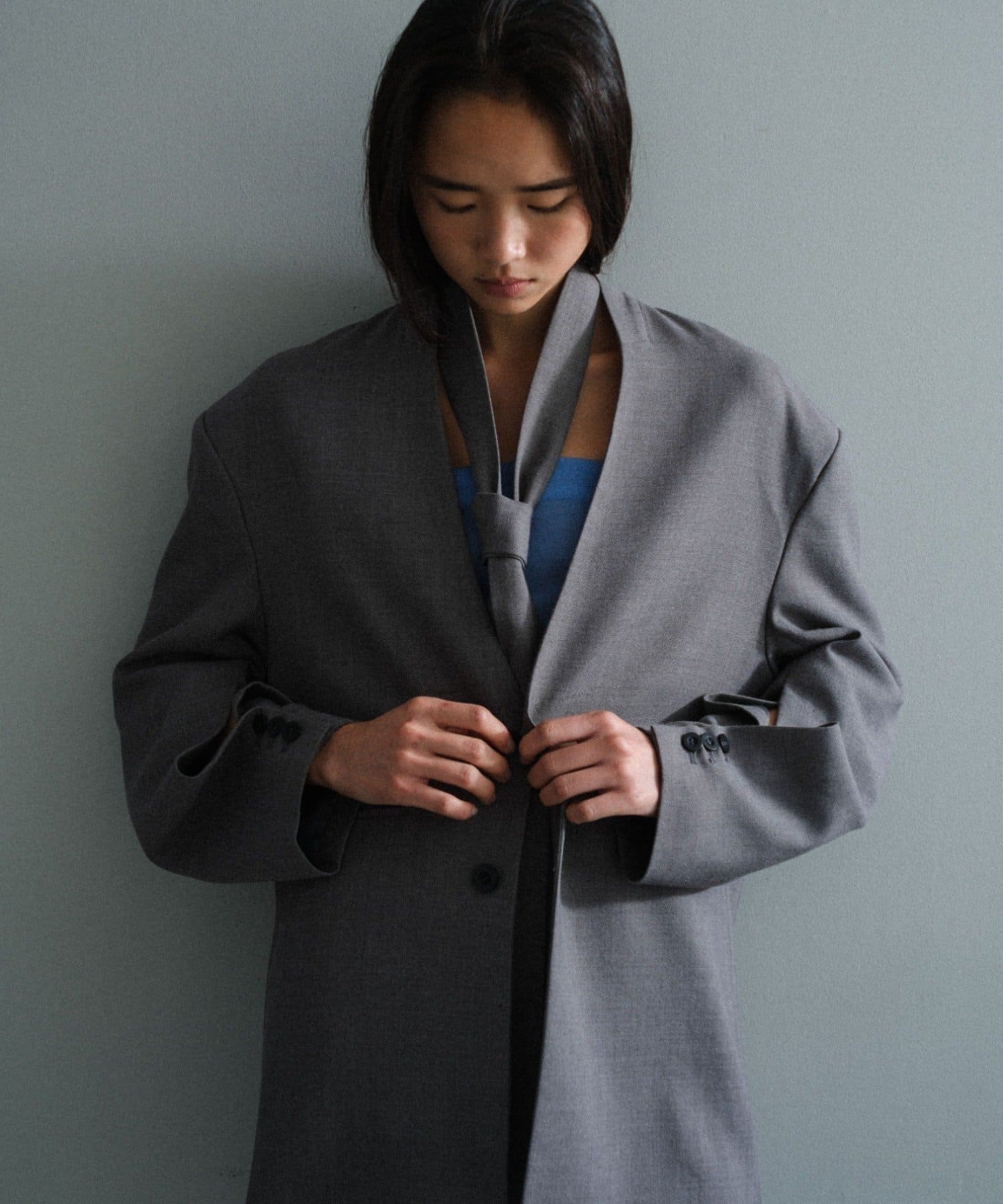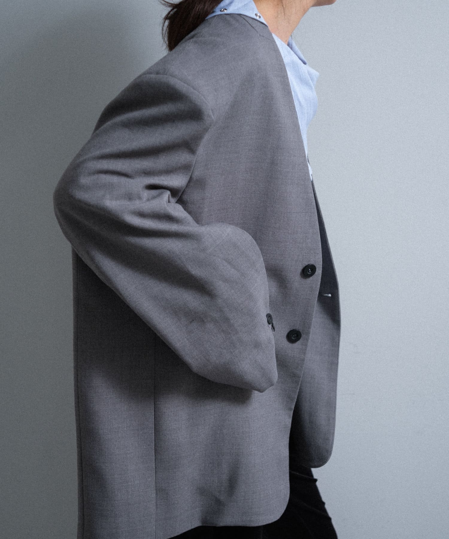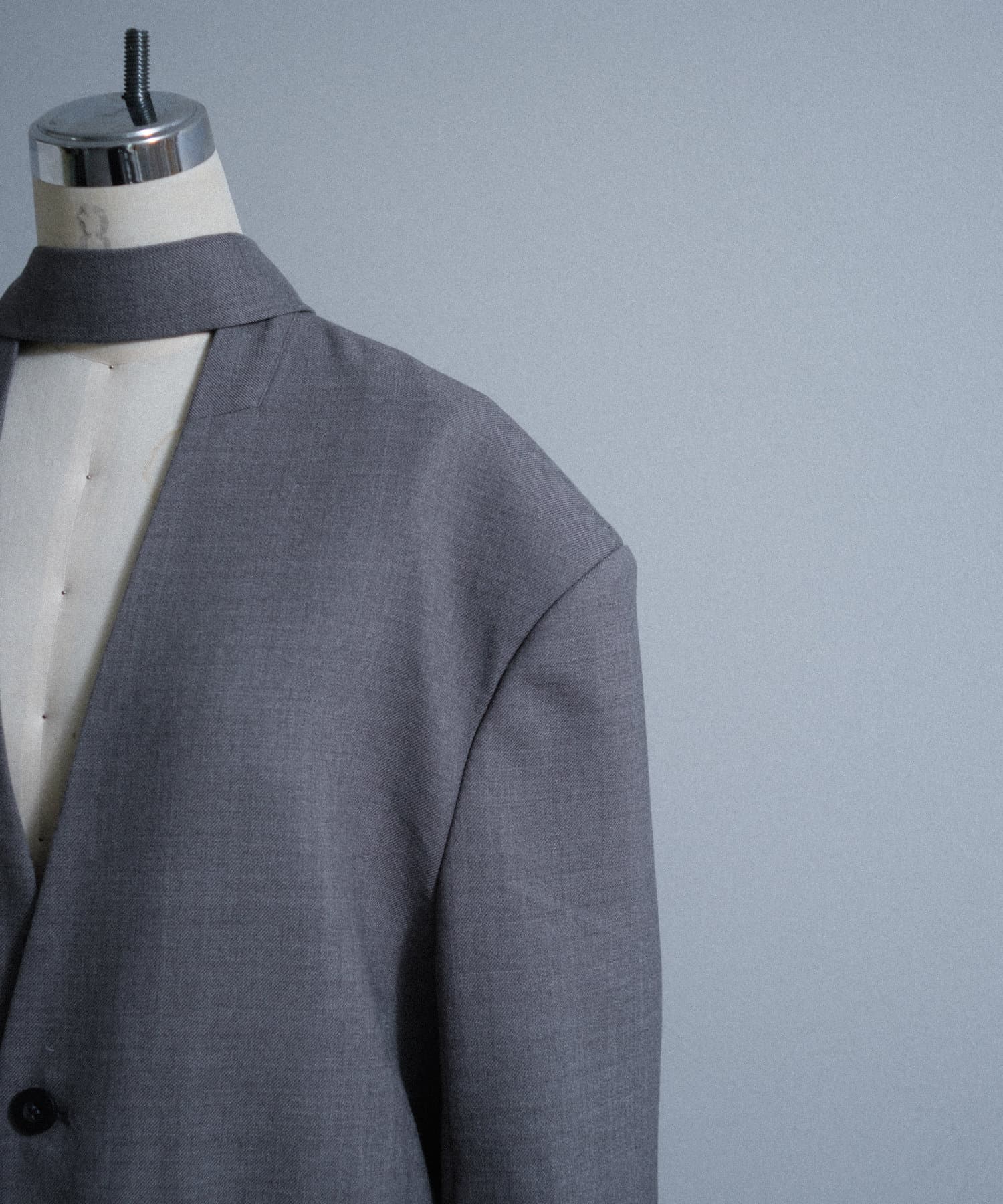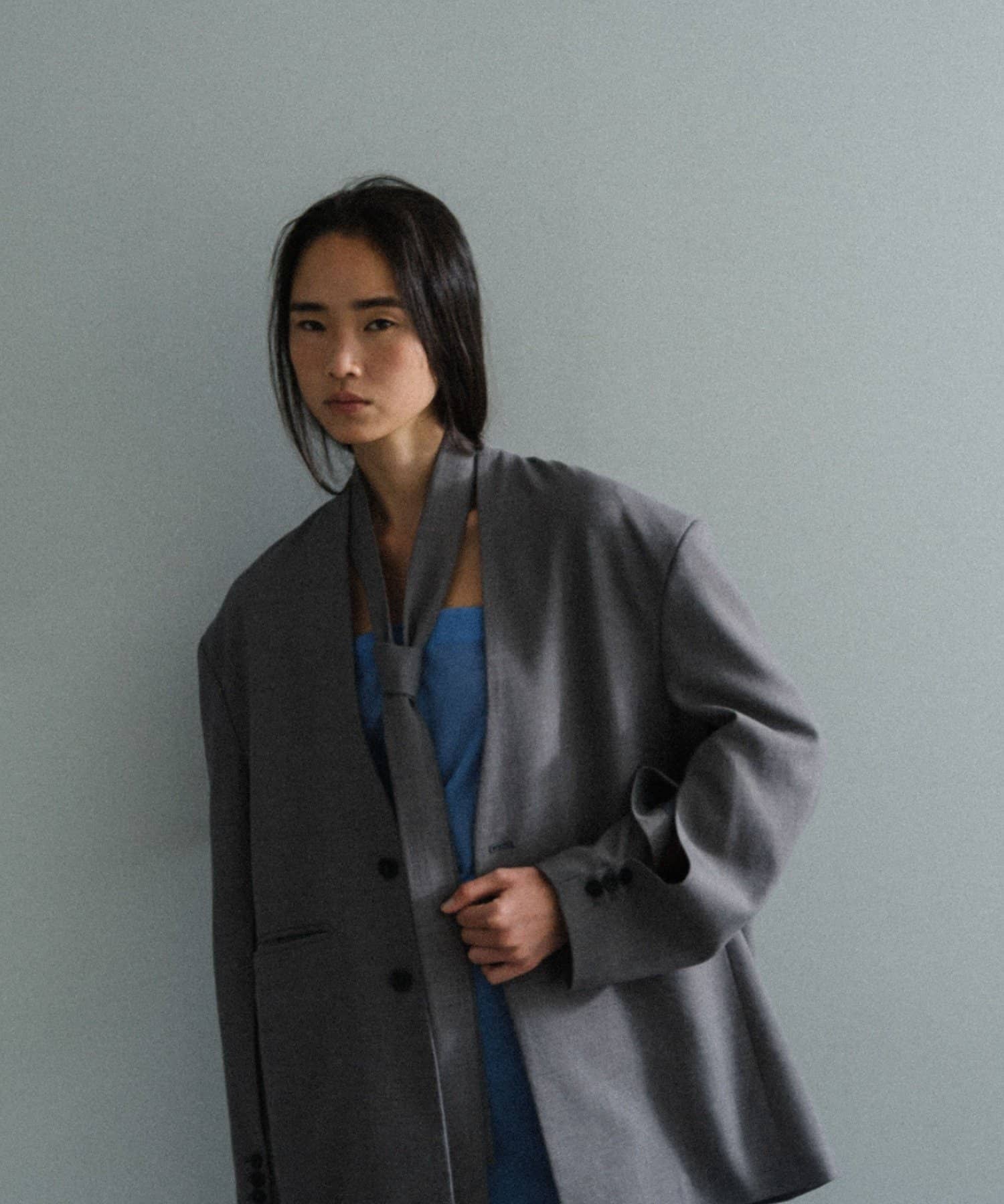 ぶかっと肩を落としたようなオーバーサイズのシルエットが気分なダッドジャケット。前シーズンから引き続き、襟なしのビッグジャケットが気分です。新しく、今シーズンのシーズナルカラーである淡いライトグレーを作りました。