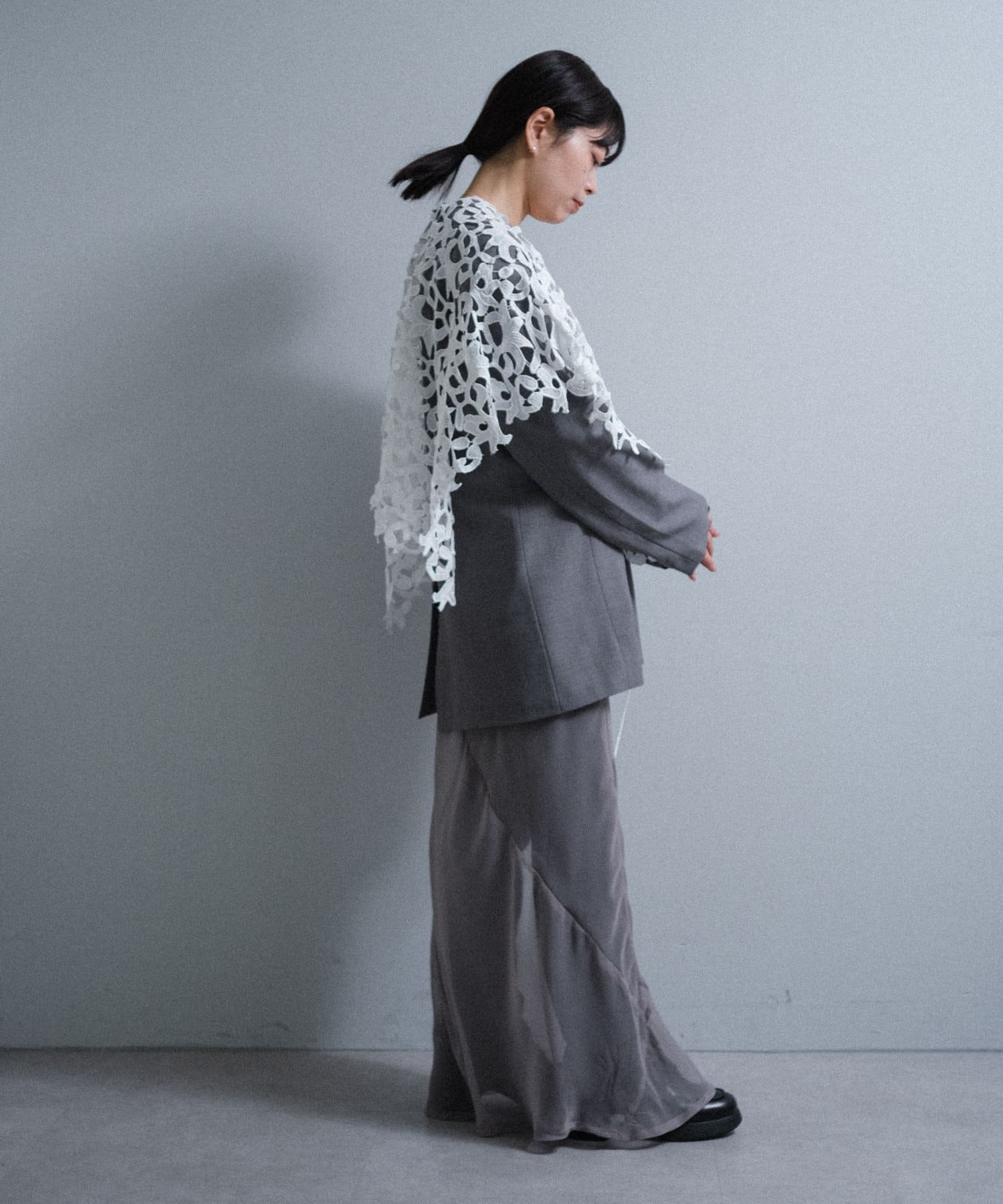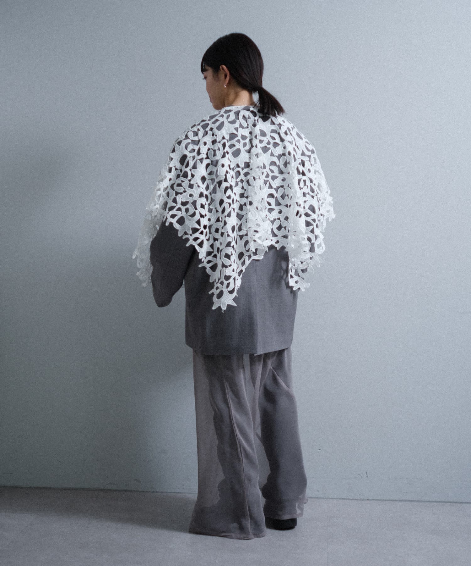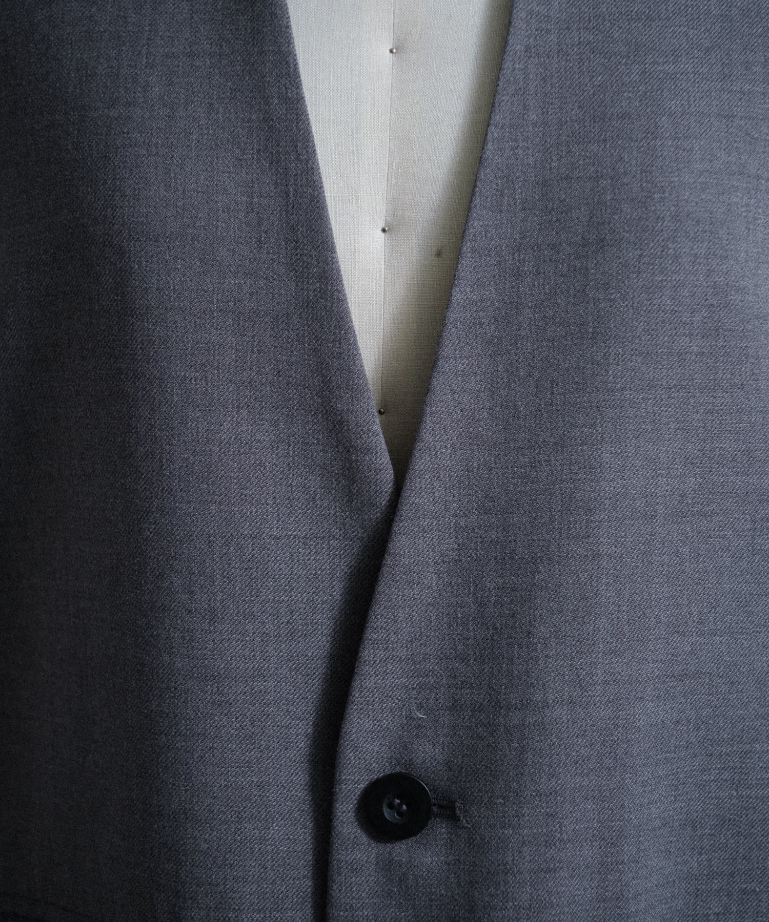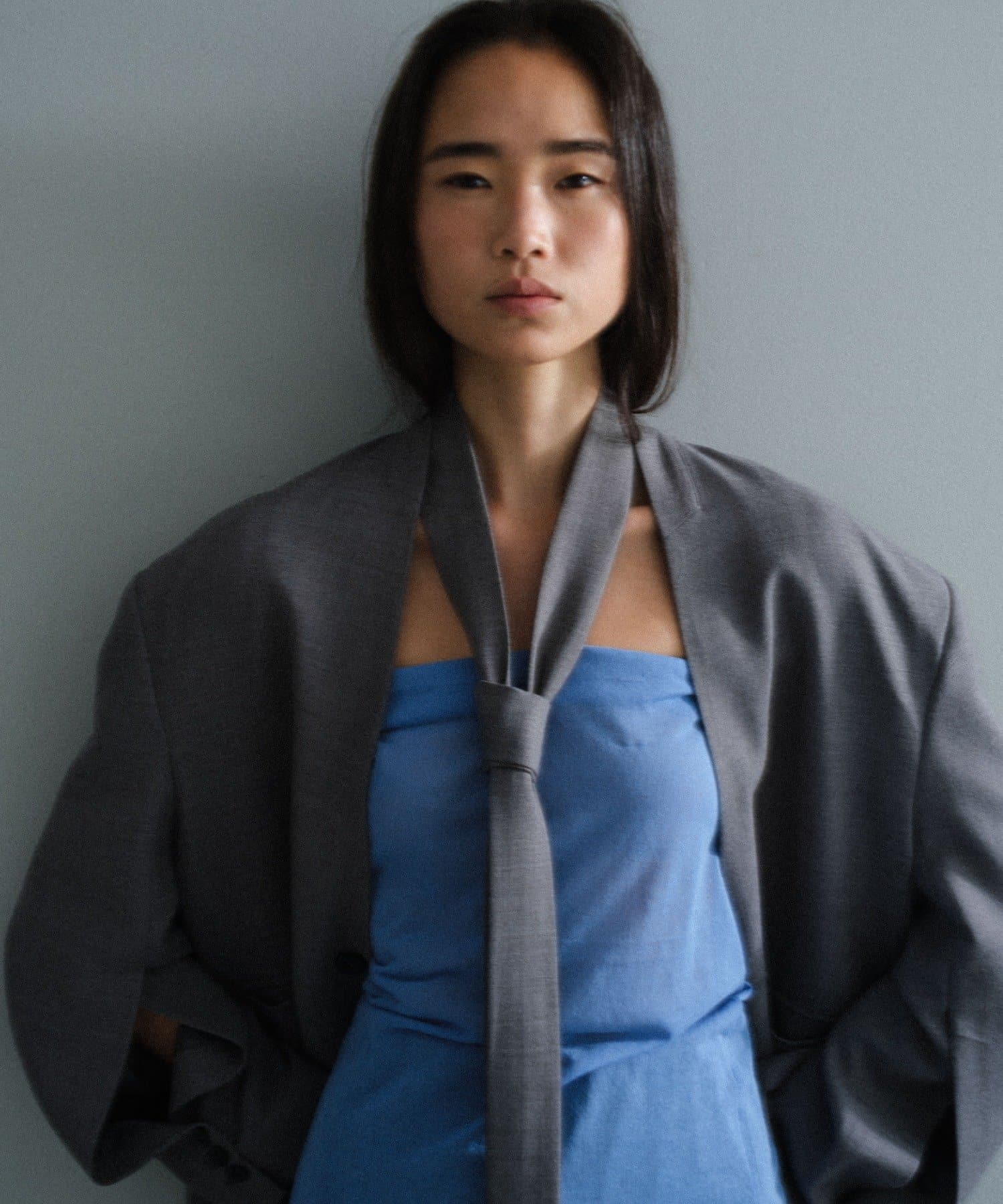 ぶかっと肩を落としたようなオーバーサイズのシルエットが気分なダッドジャケット。前シーズンから引き続き、襟なしのビッグジャケットが気分です。新しく、今シーズンのシーズナルカラーである淡いライトグレーを作りました。