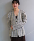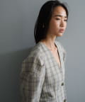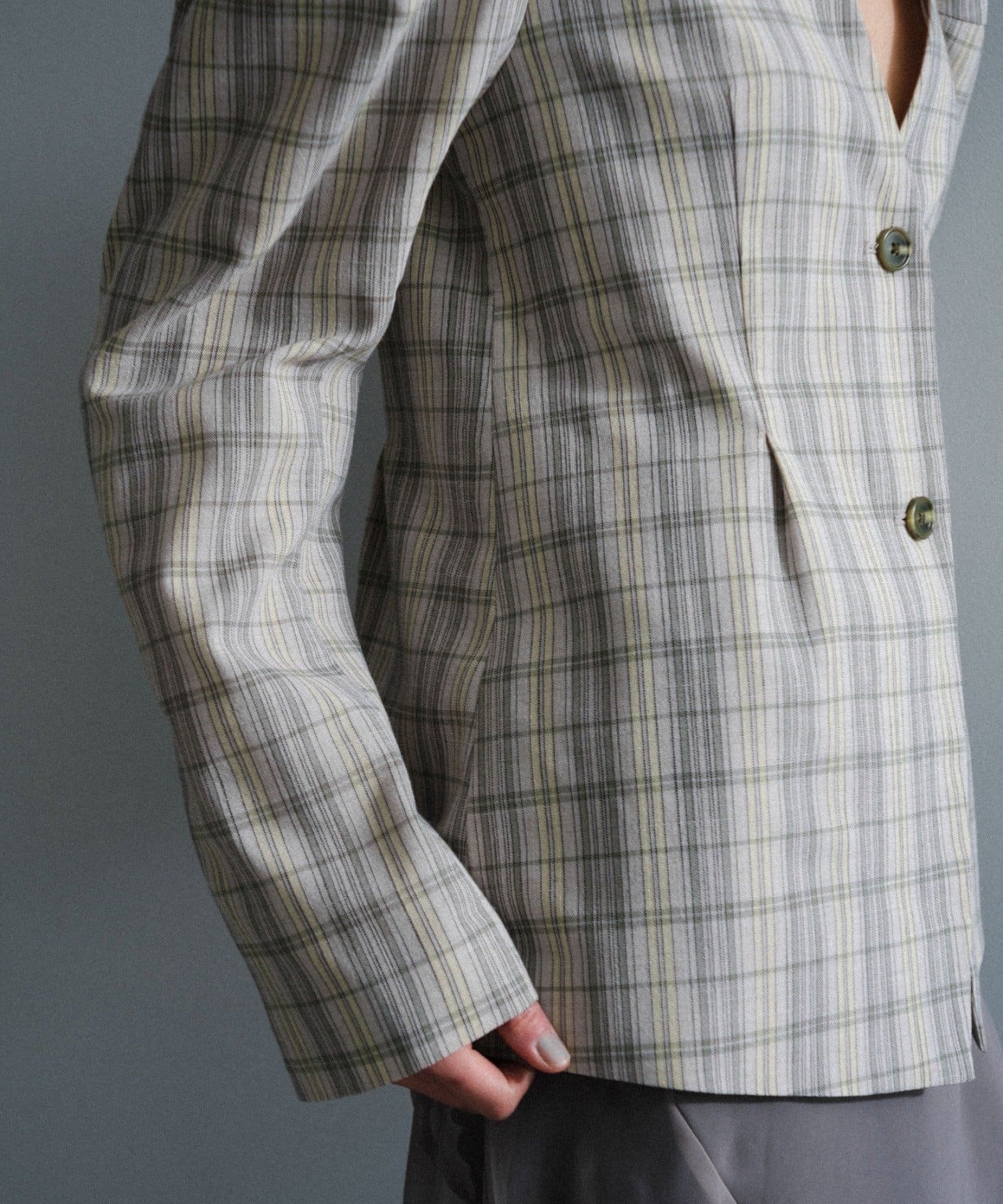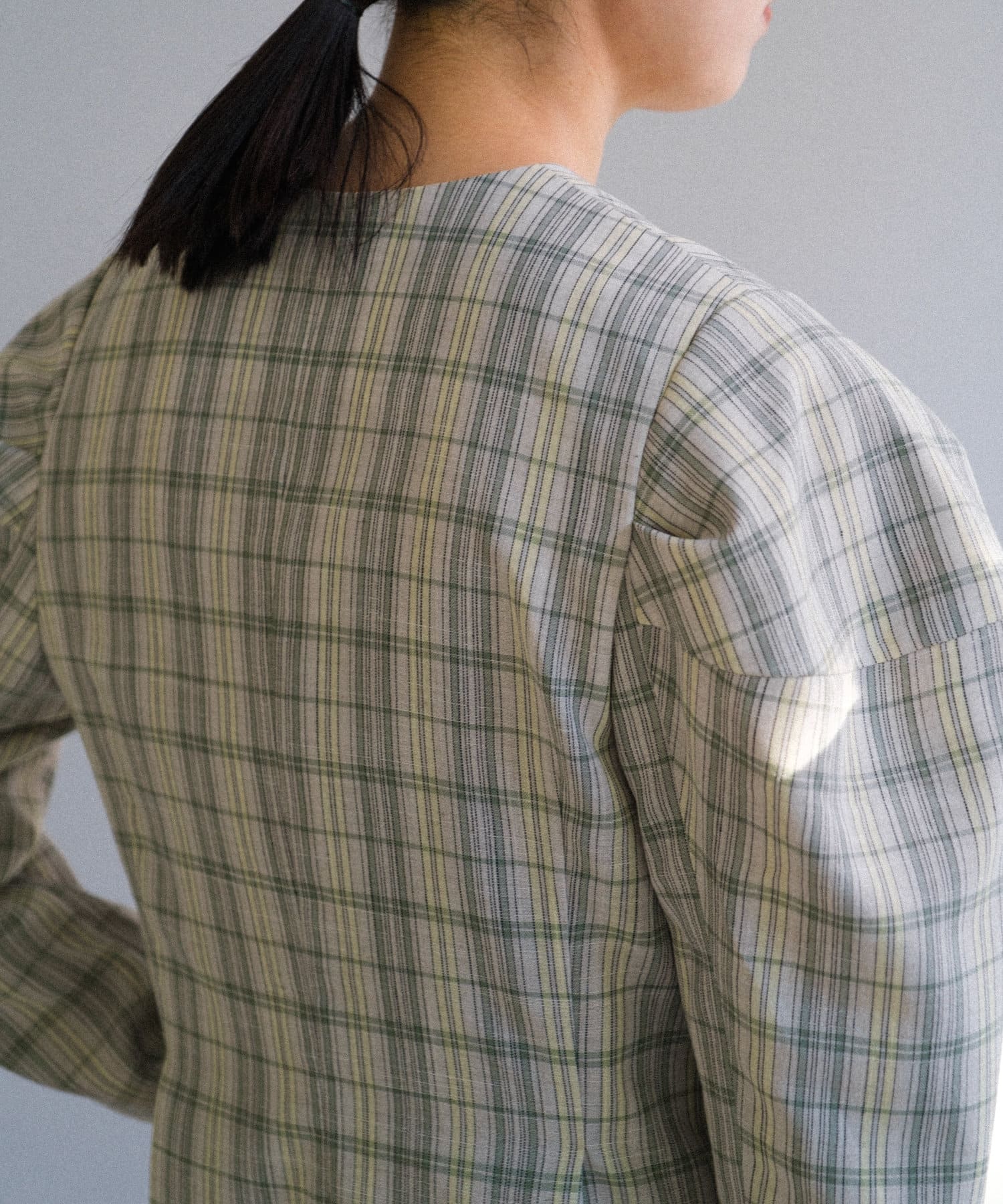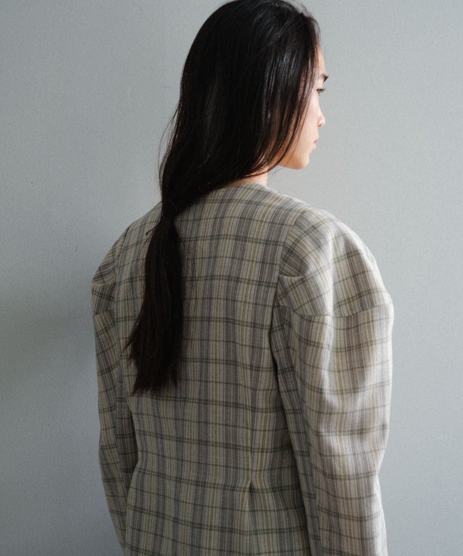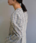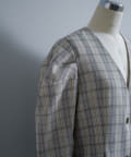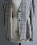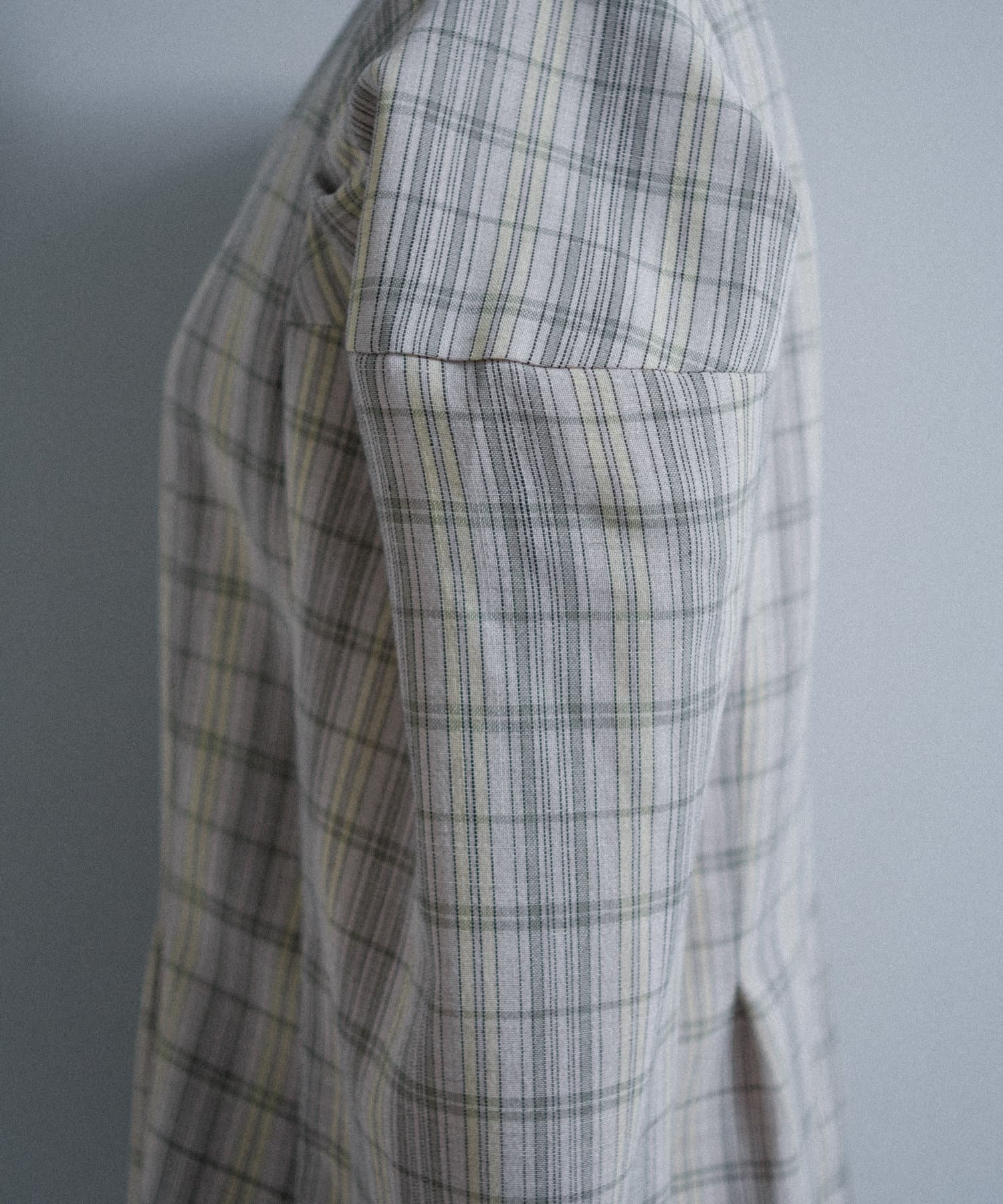 一目で春らしい淡いグレーベースにイエローのチェックジャガード織のシャツ生地に、ライトな裏地をつけてジャケットに仕立てています。