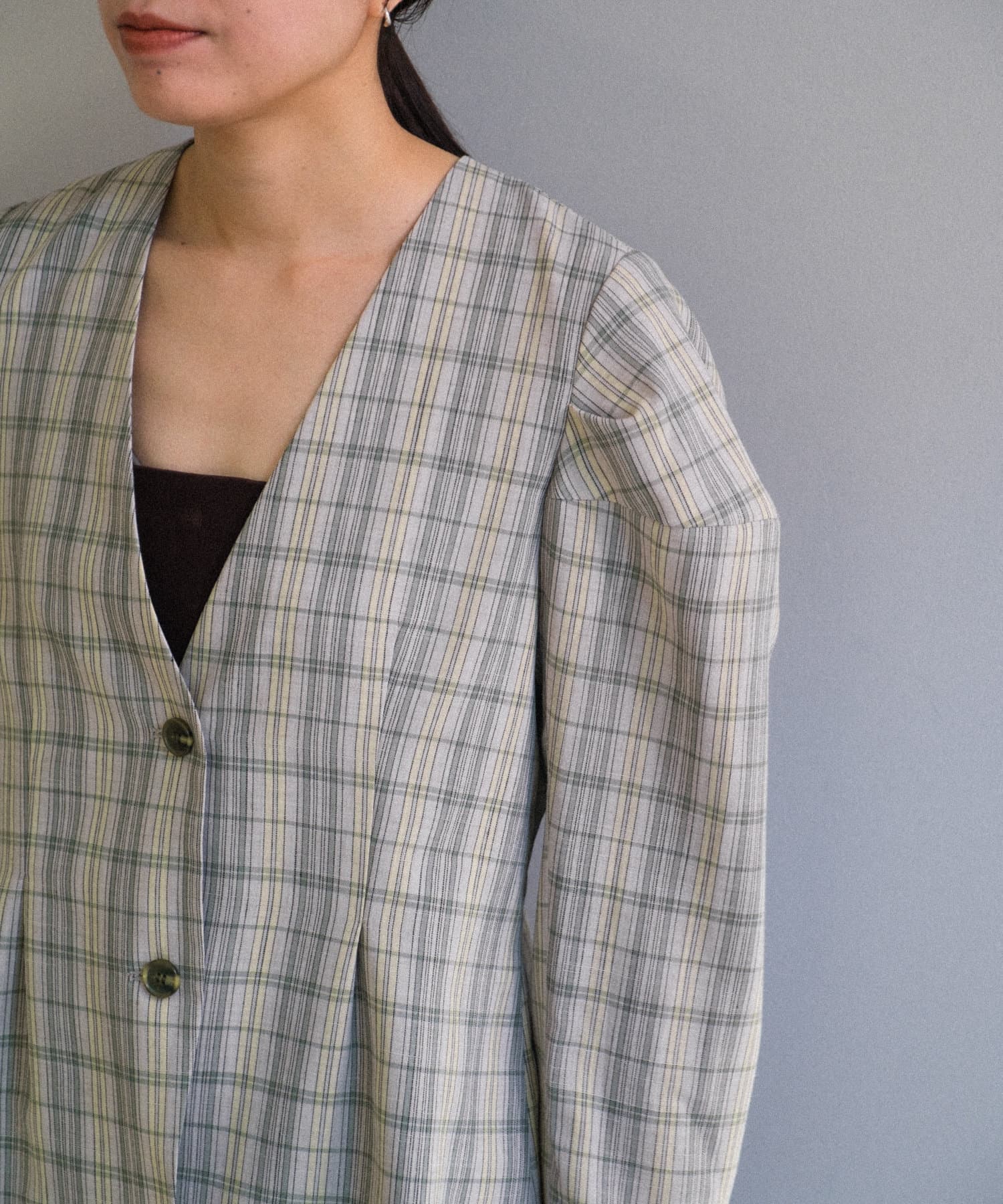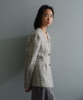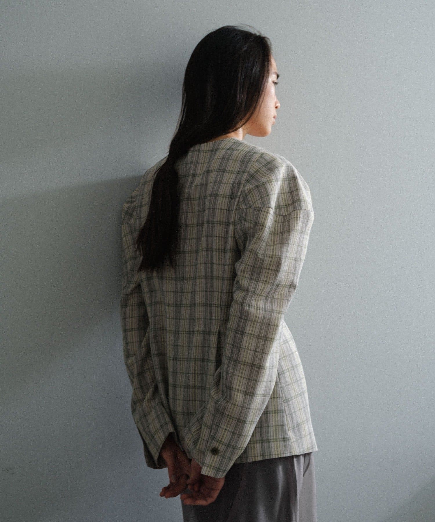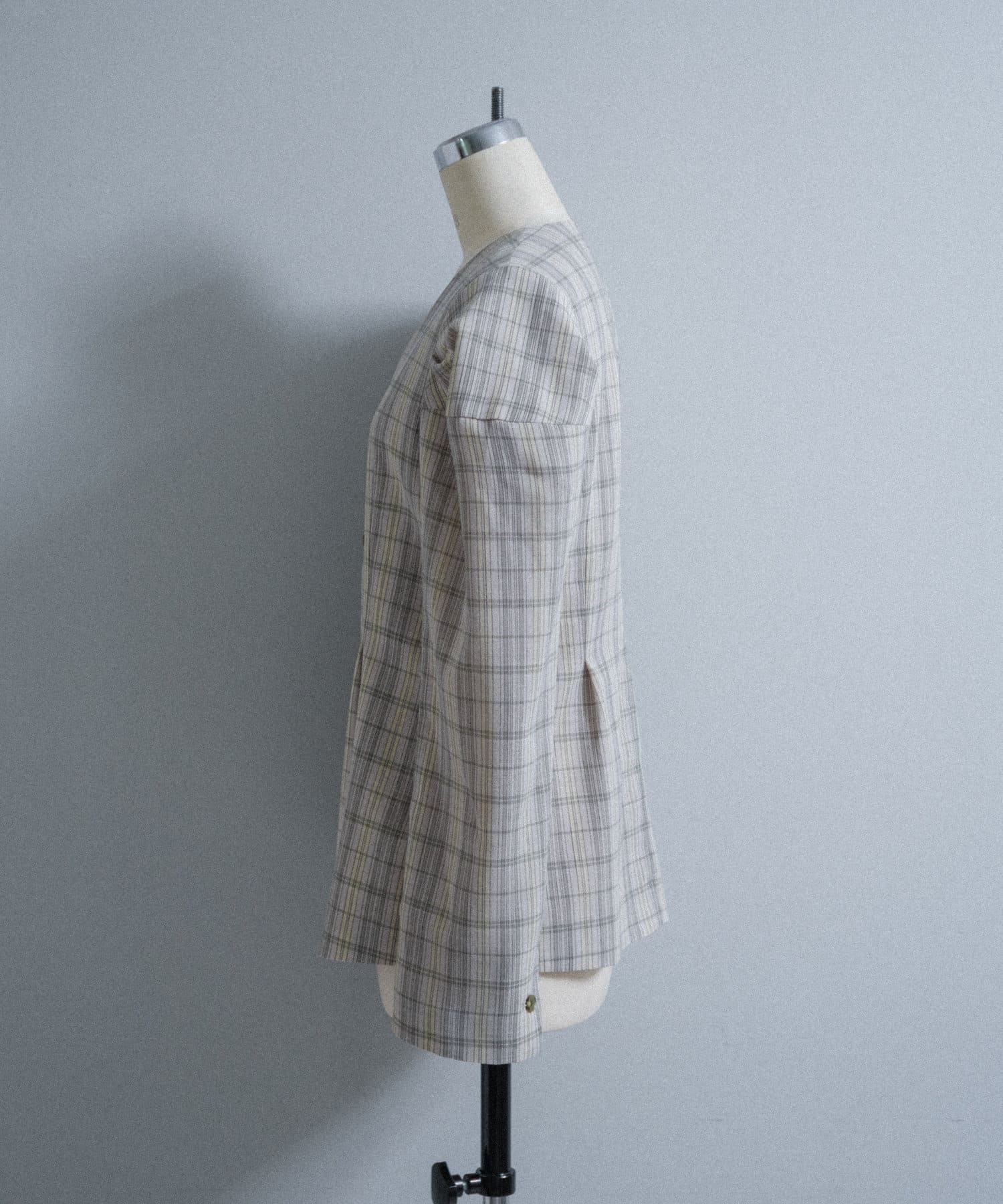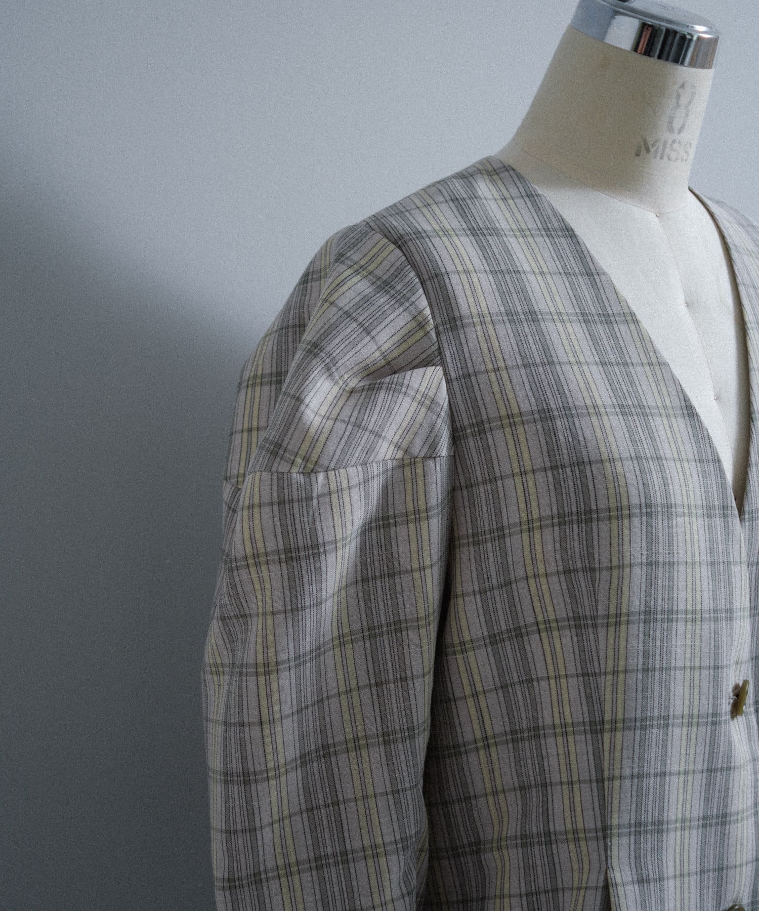 一目で春らしい淡いグレーベースにイエローのチェックジャガード織のシャツ生地に、ライトな裏地をつけてジャケットに仕立てています。