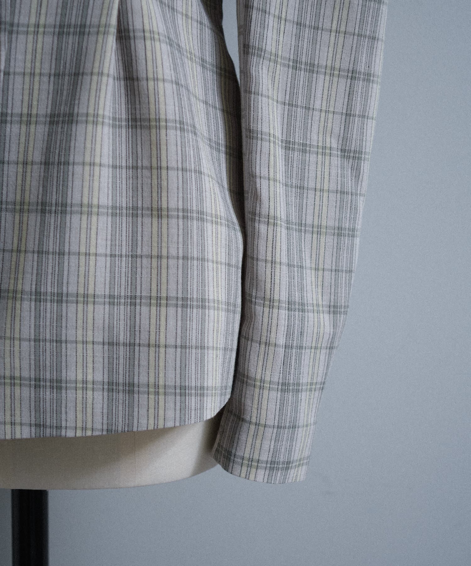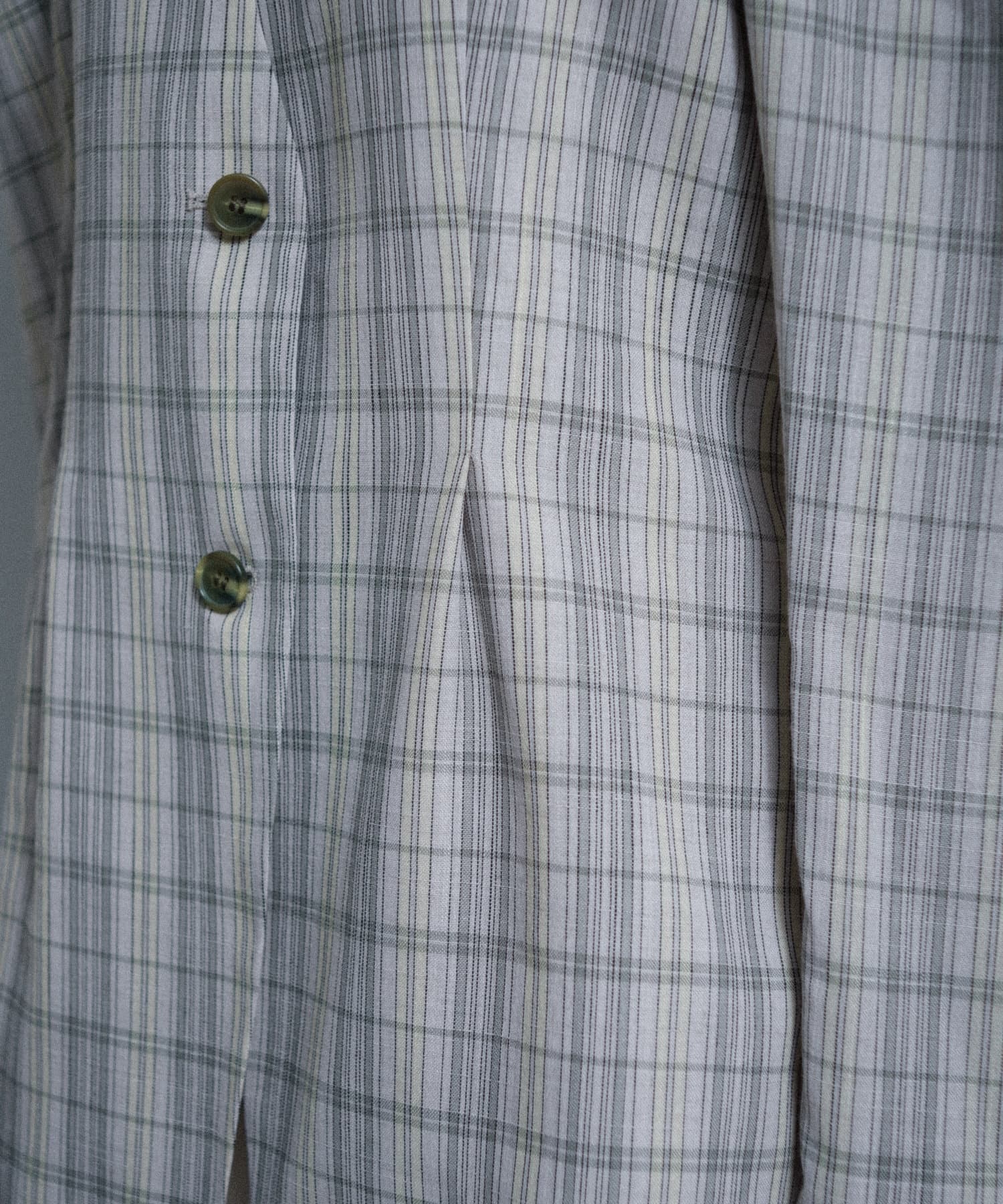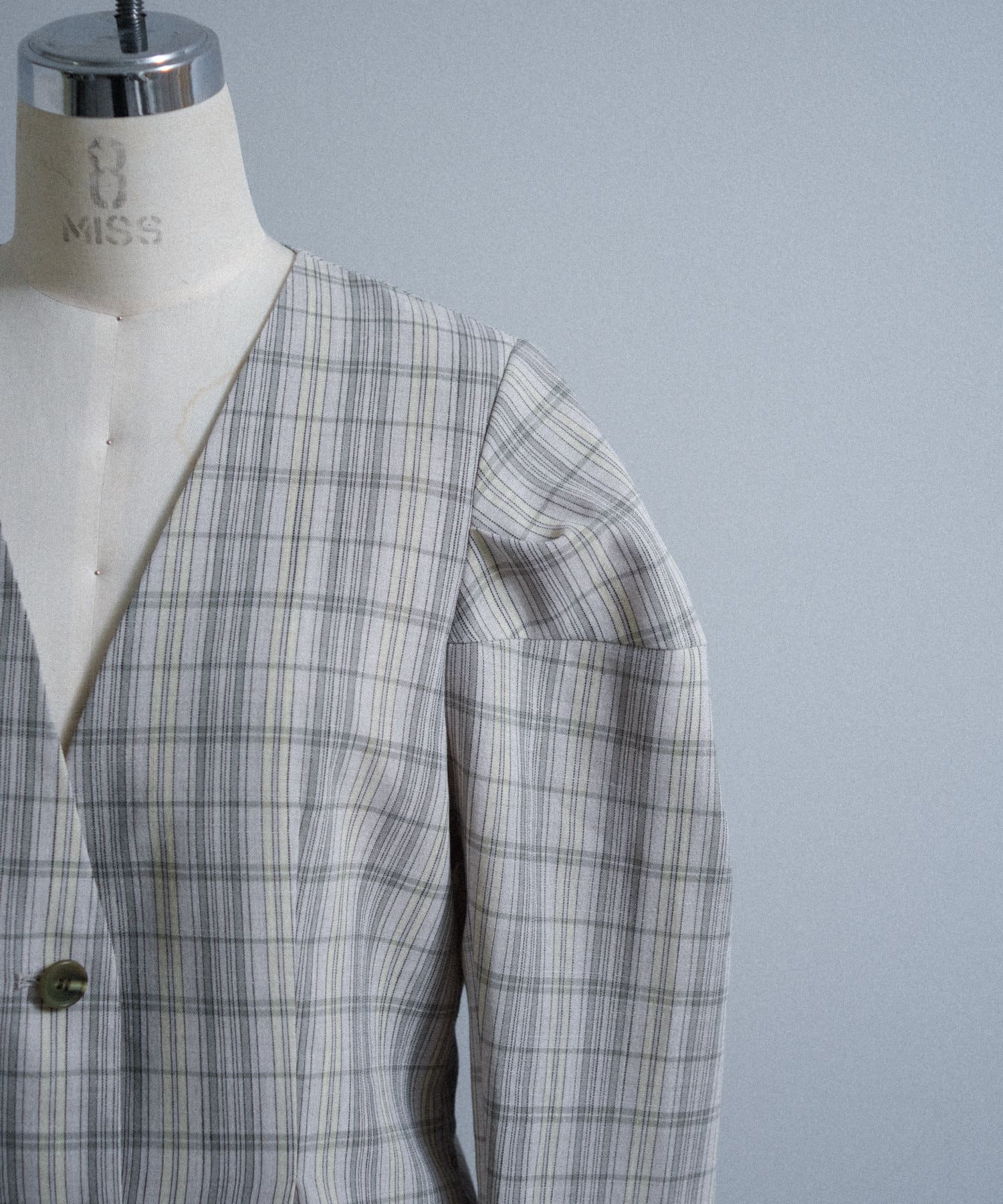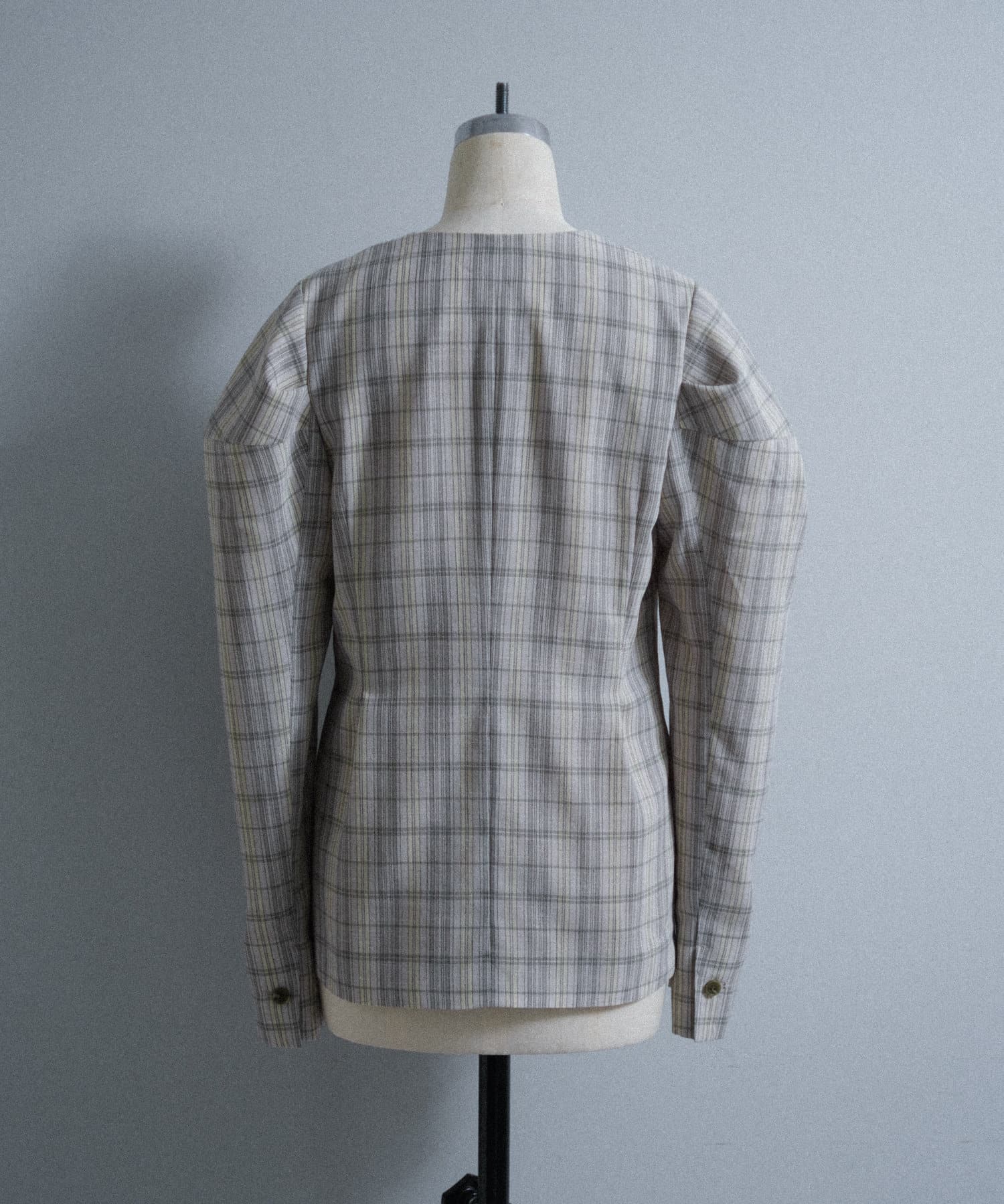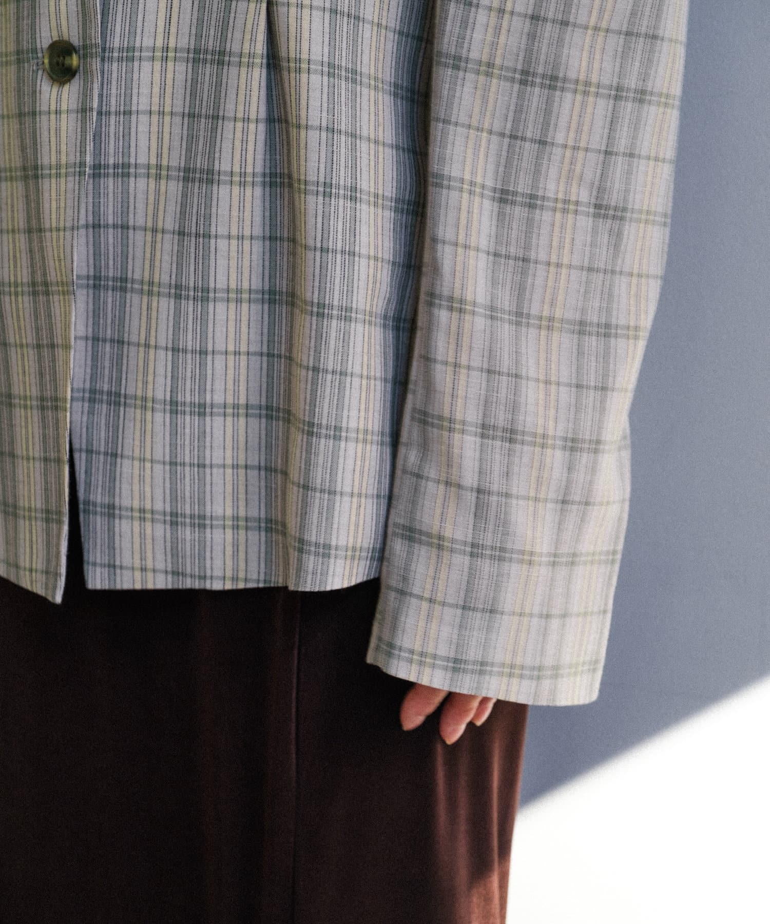 一目で春らしい淡いグレーベースにイエローのチェックジャガード織のシャツ生地に、ライトな裏地をつけてジャケットに仕立てています。