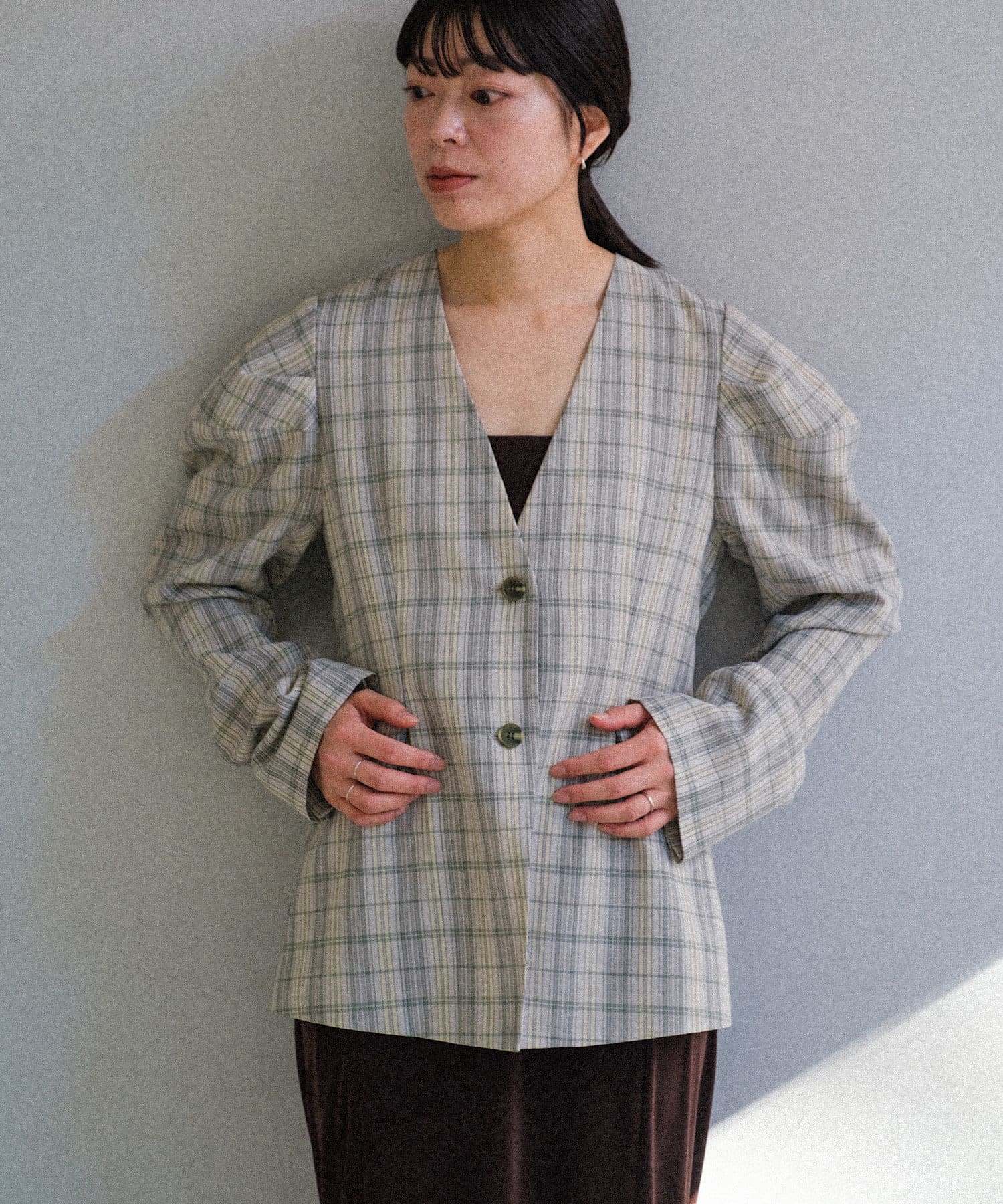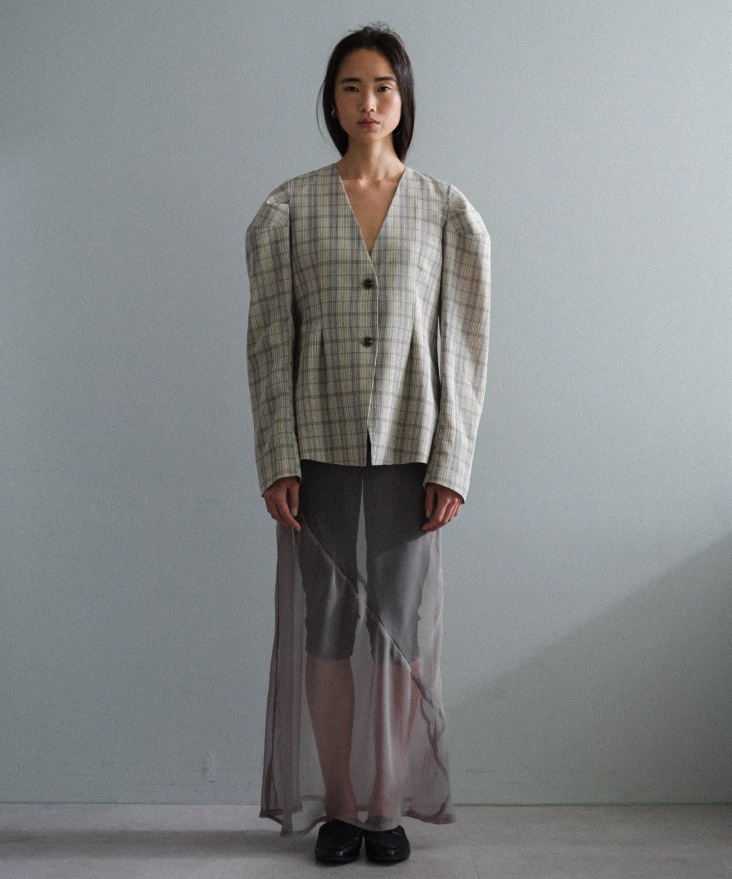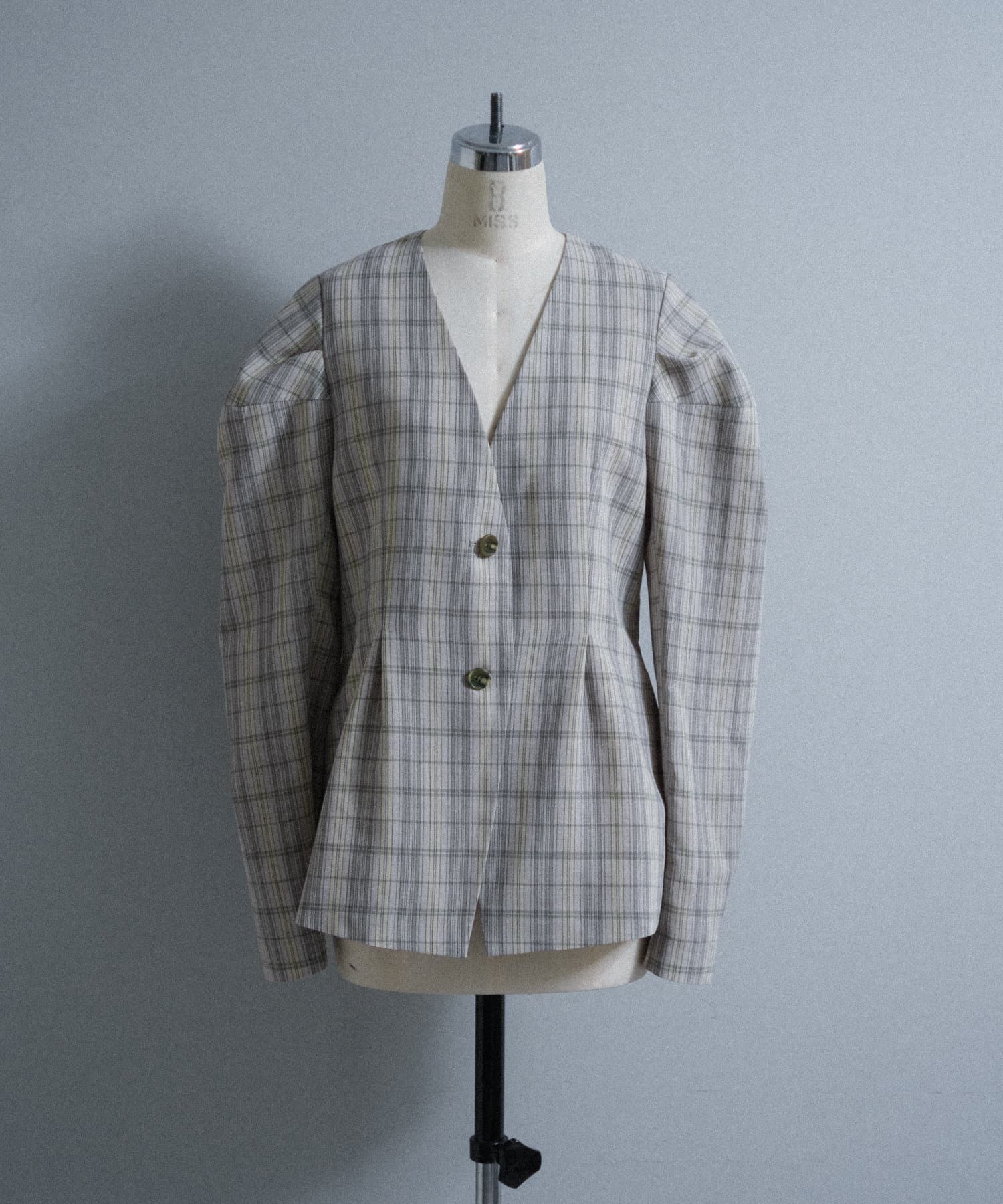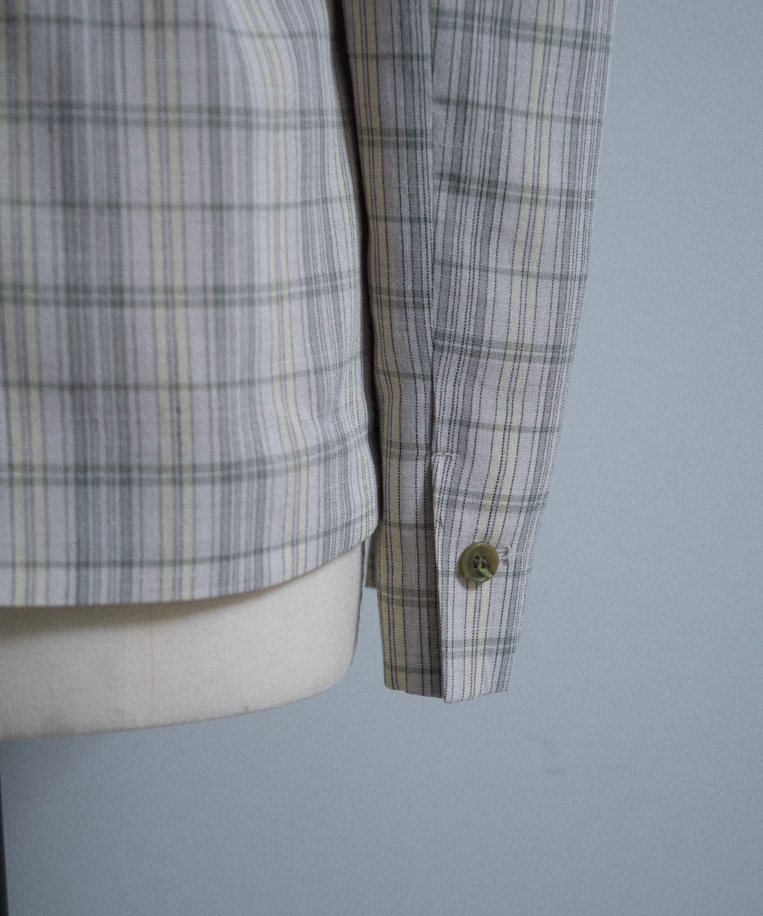 一目で春らしい淡いグレーベースにイエローのチェックジャガード織のシャツ生地に、ライトな裏地をつけてジャケットに仕立てています。