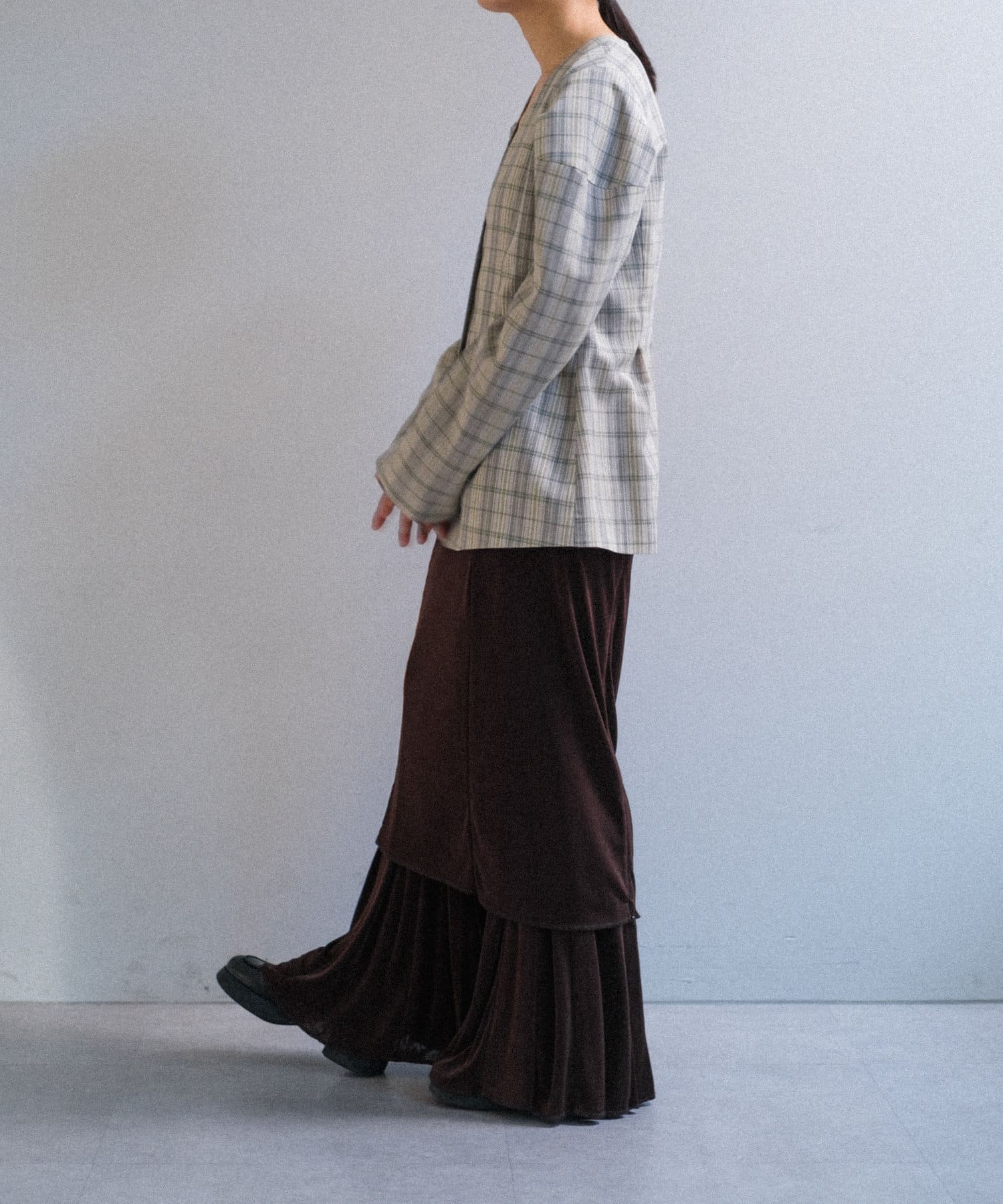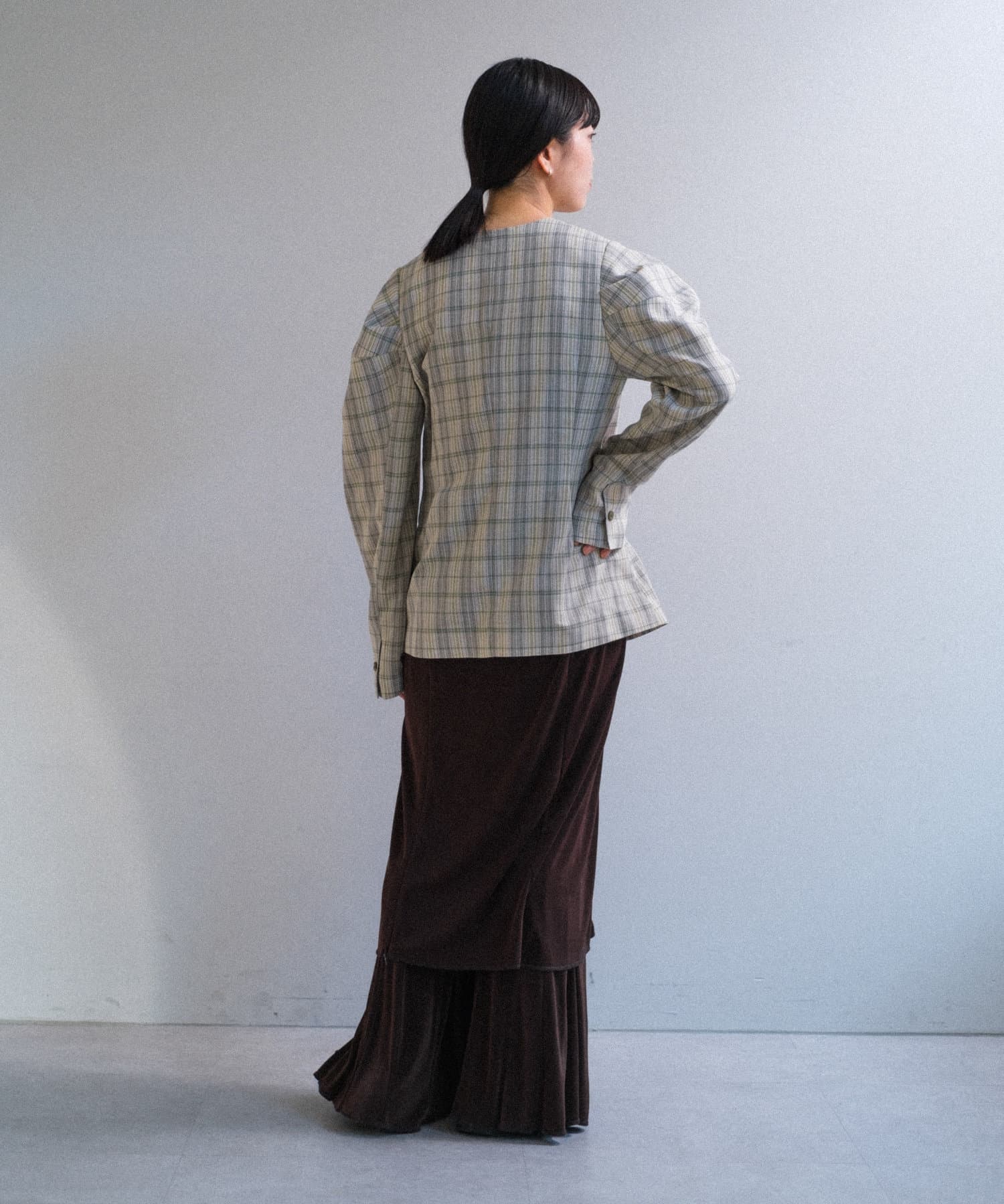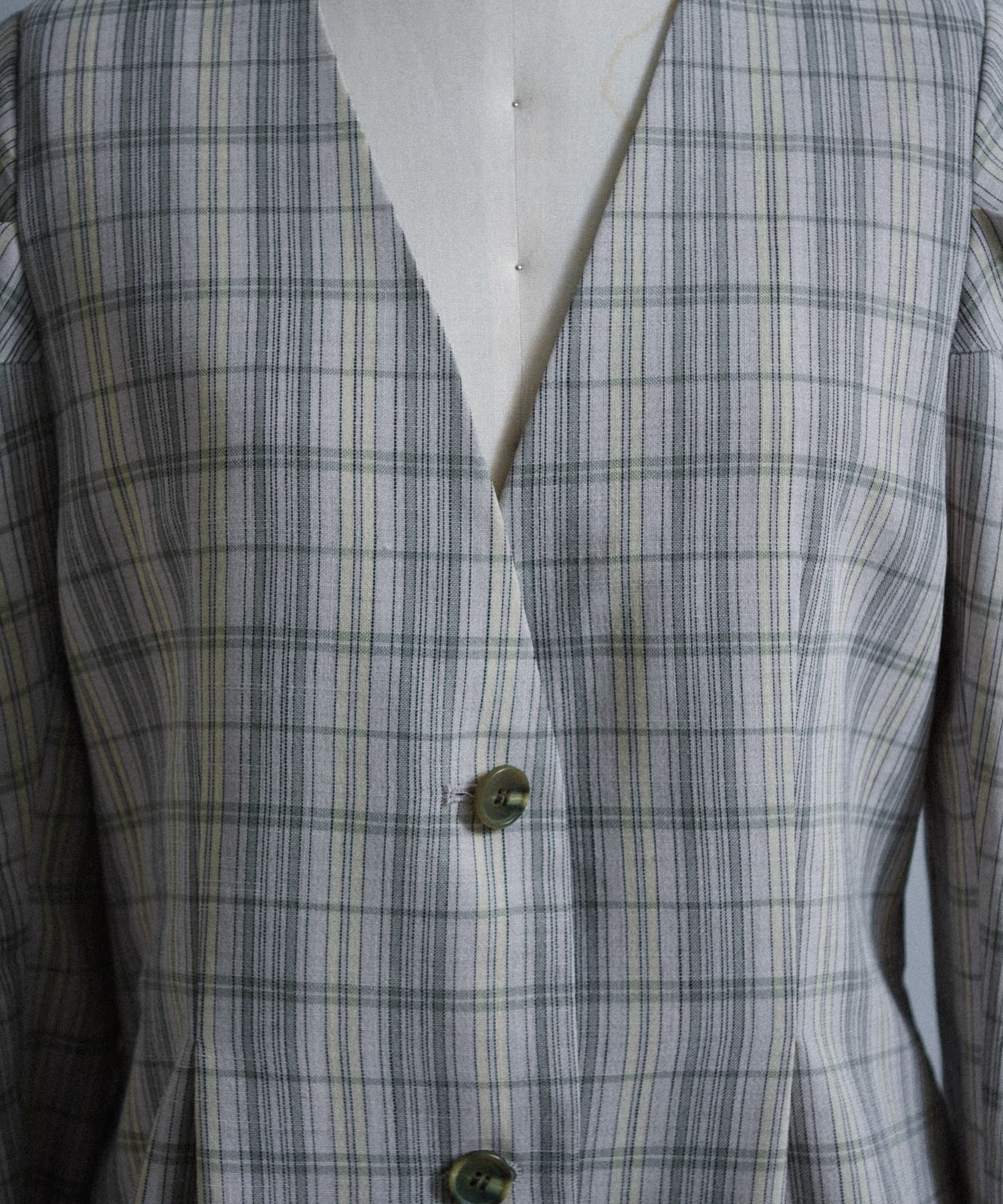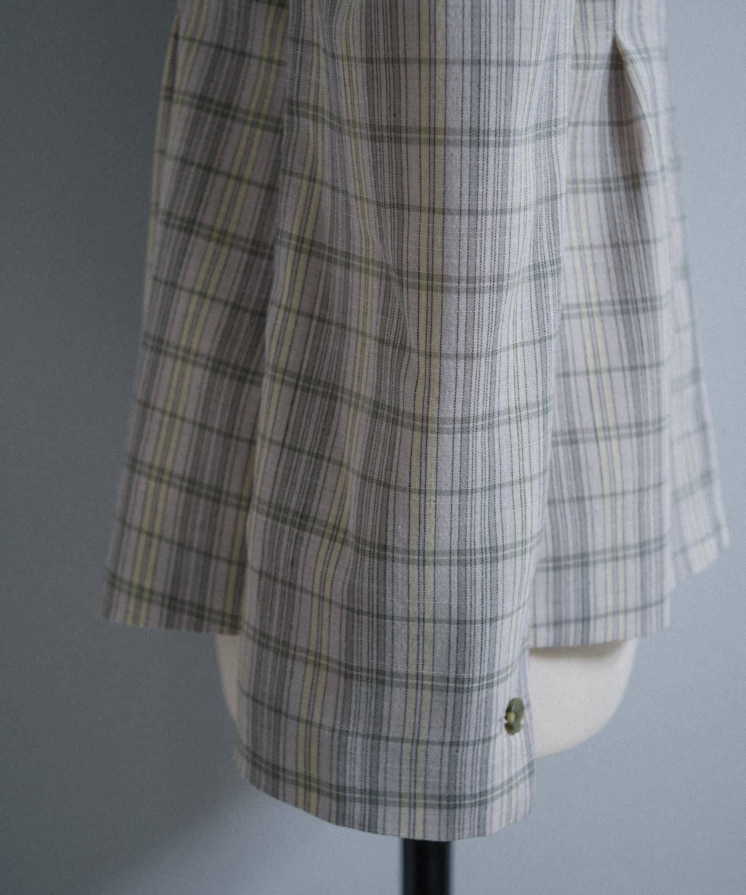 一目で春らしい淡いグレーベースにイエローのチェックジャガード織のシャツ生地に、ライトな裏地をつけてジャケットに仕立てています。