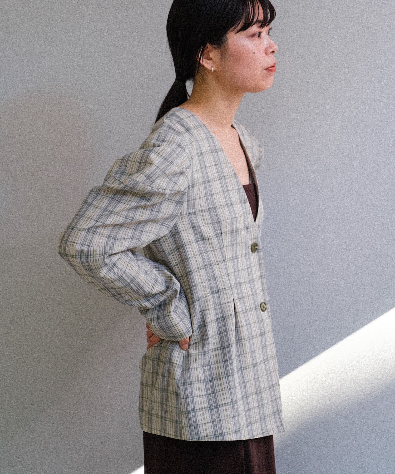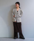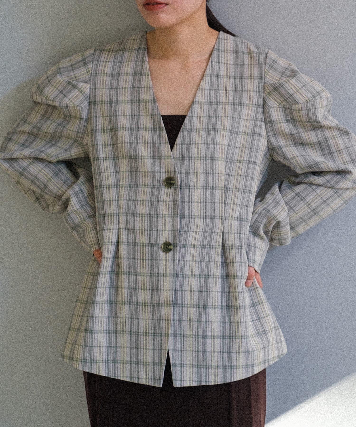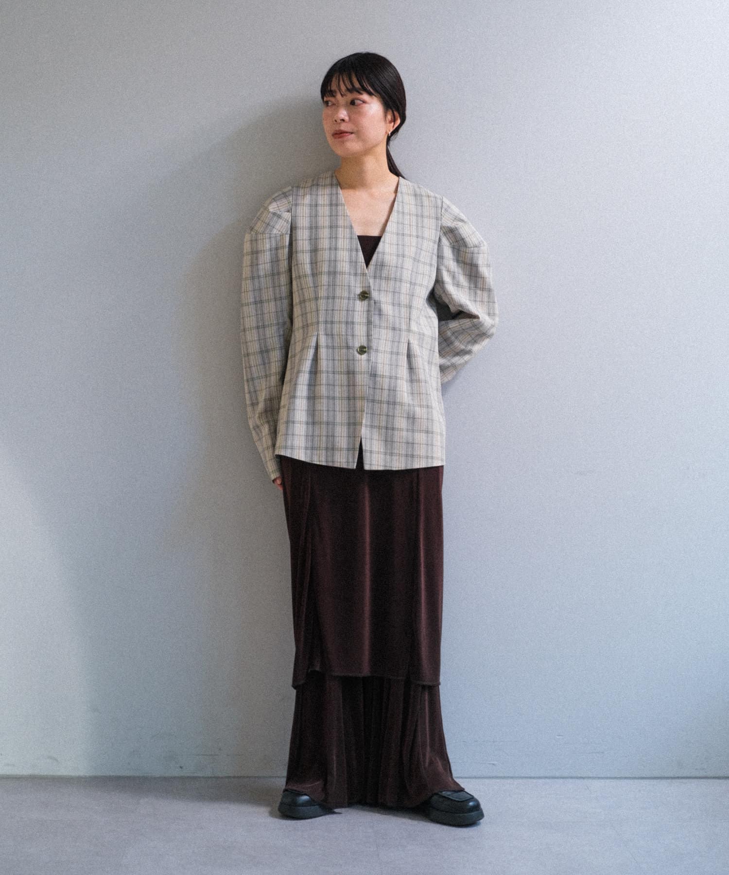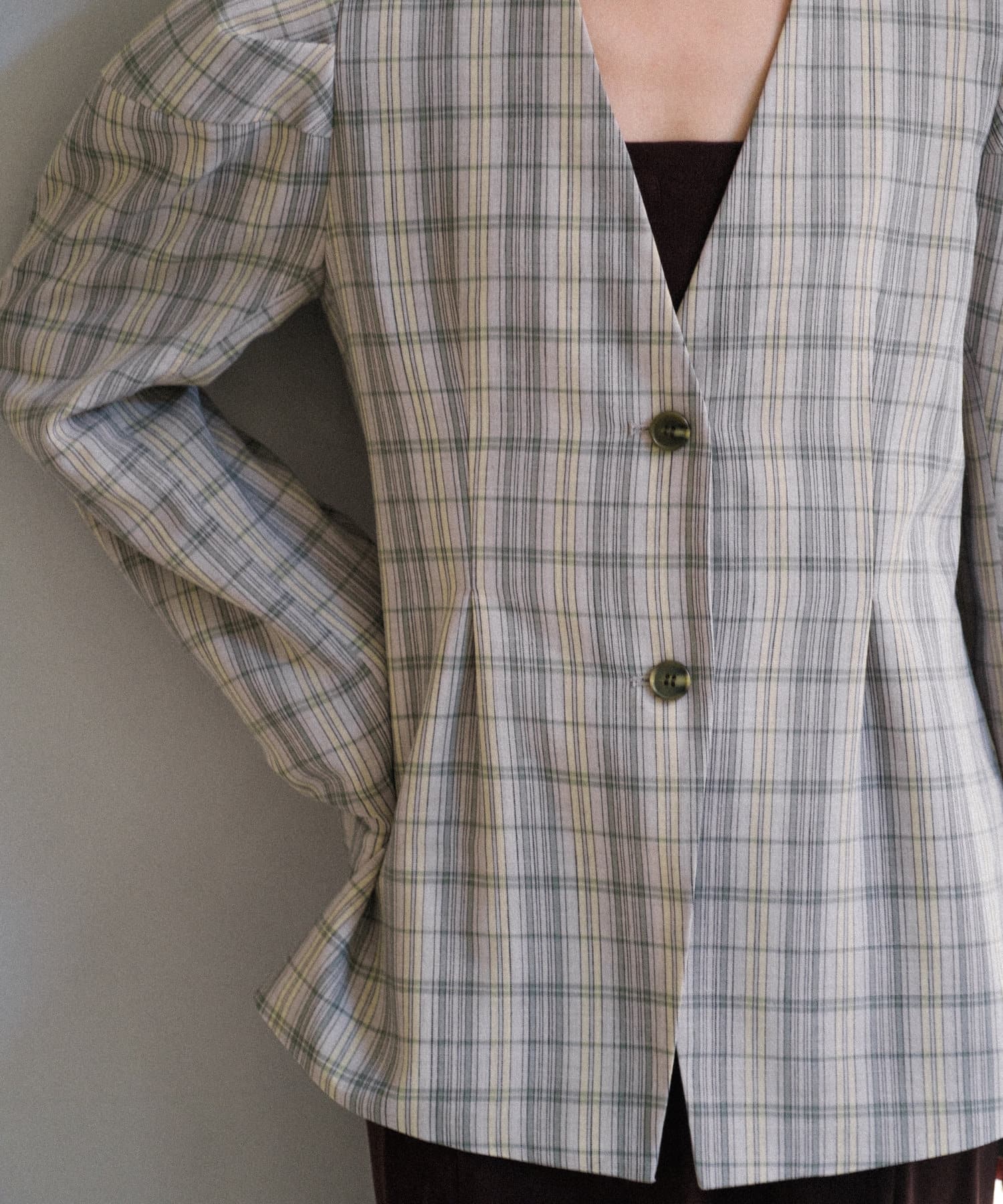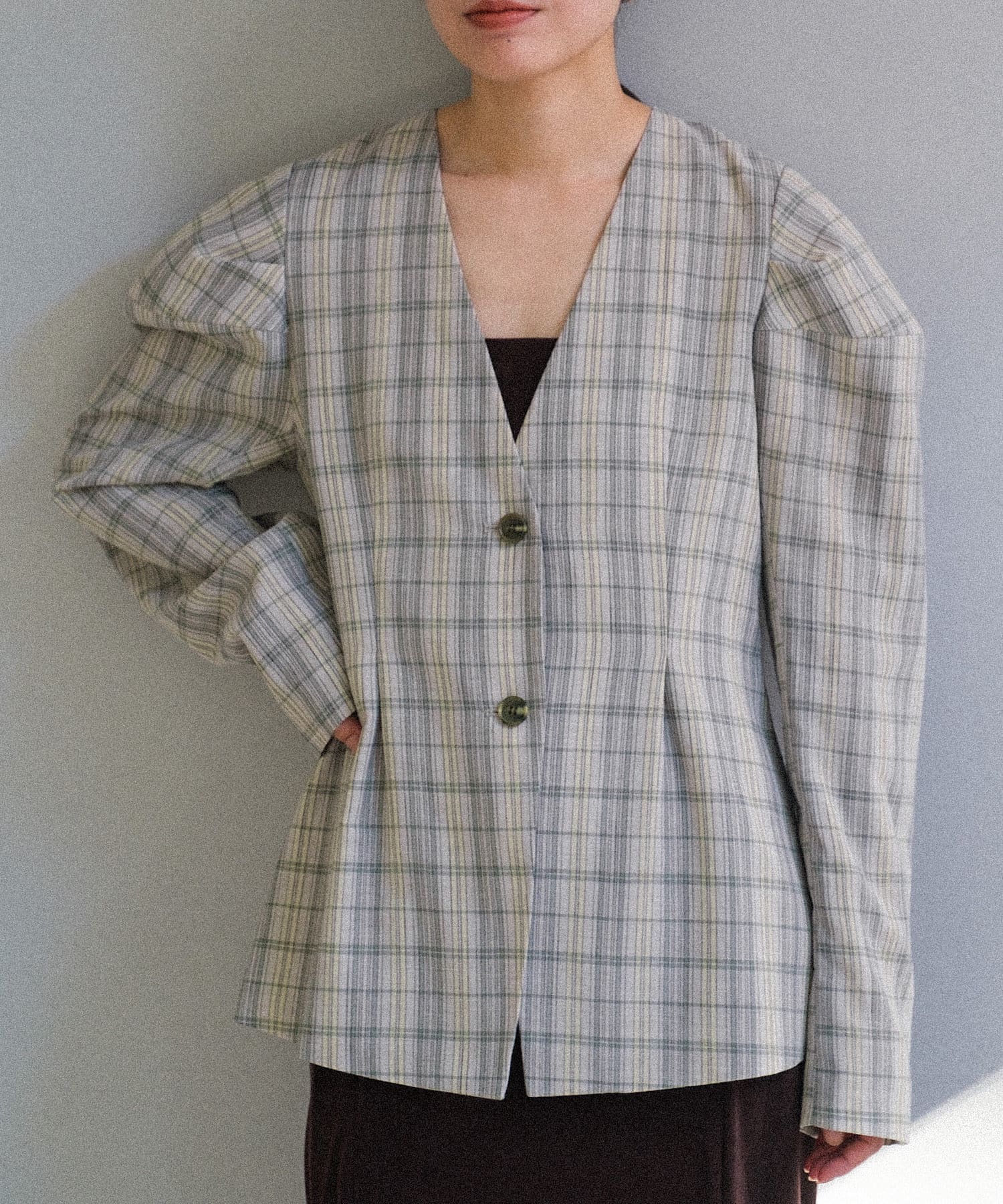 首元はノーカラーで深めのVあきデザイン。首が長く綺麗にすっきりと見せられます。ウエストにはタックを入れており、今年気分なペプラムシルエットに。視覚効果で脚が真っ直ぐに見えることと、肩のボリュームとのギャップでウエストが細く見えます。上半身のスタイルアップが叶う、嬉しい一着。肩幅が広い方にこそ試していただきたいデザインです。