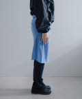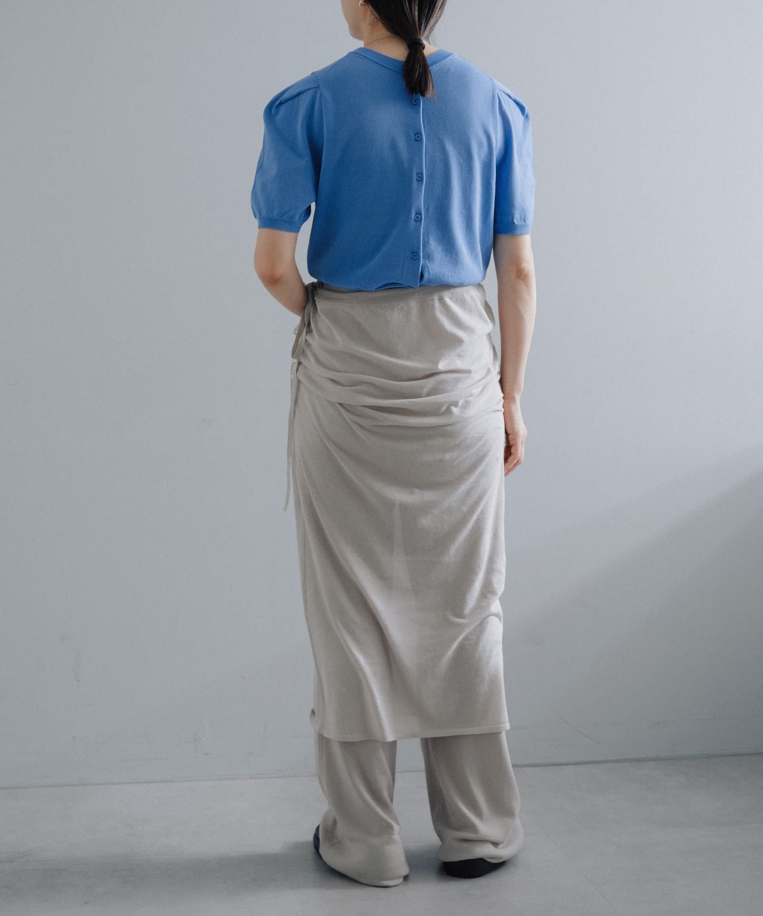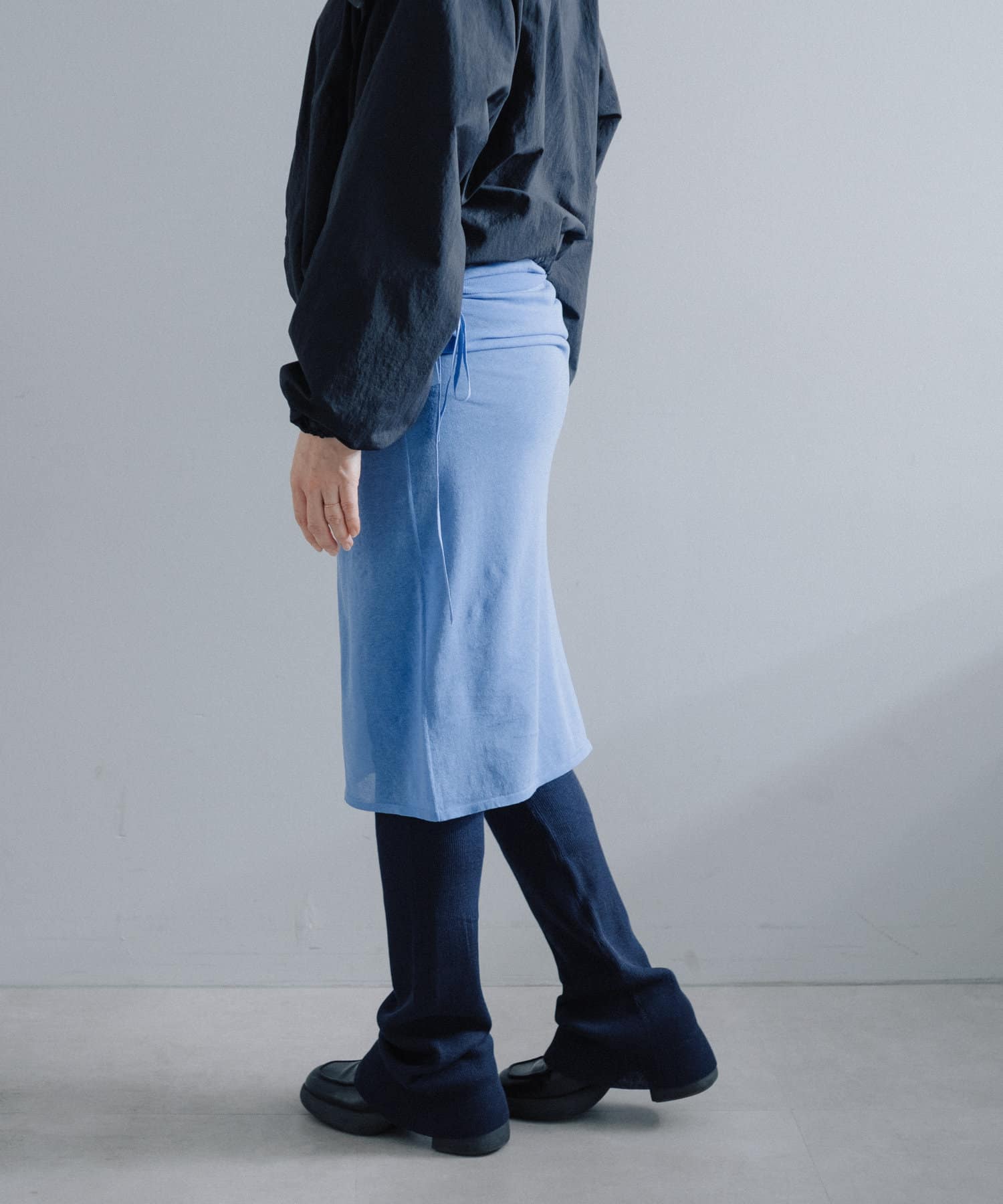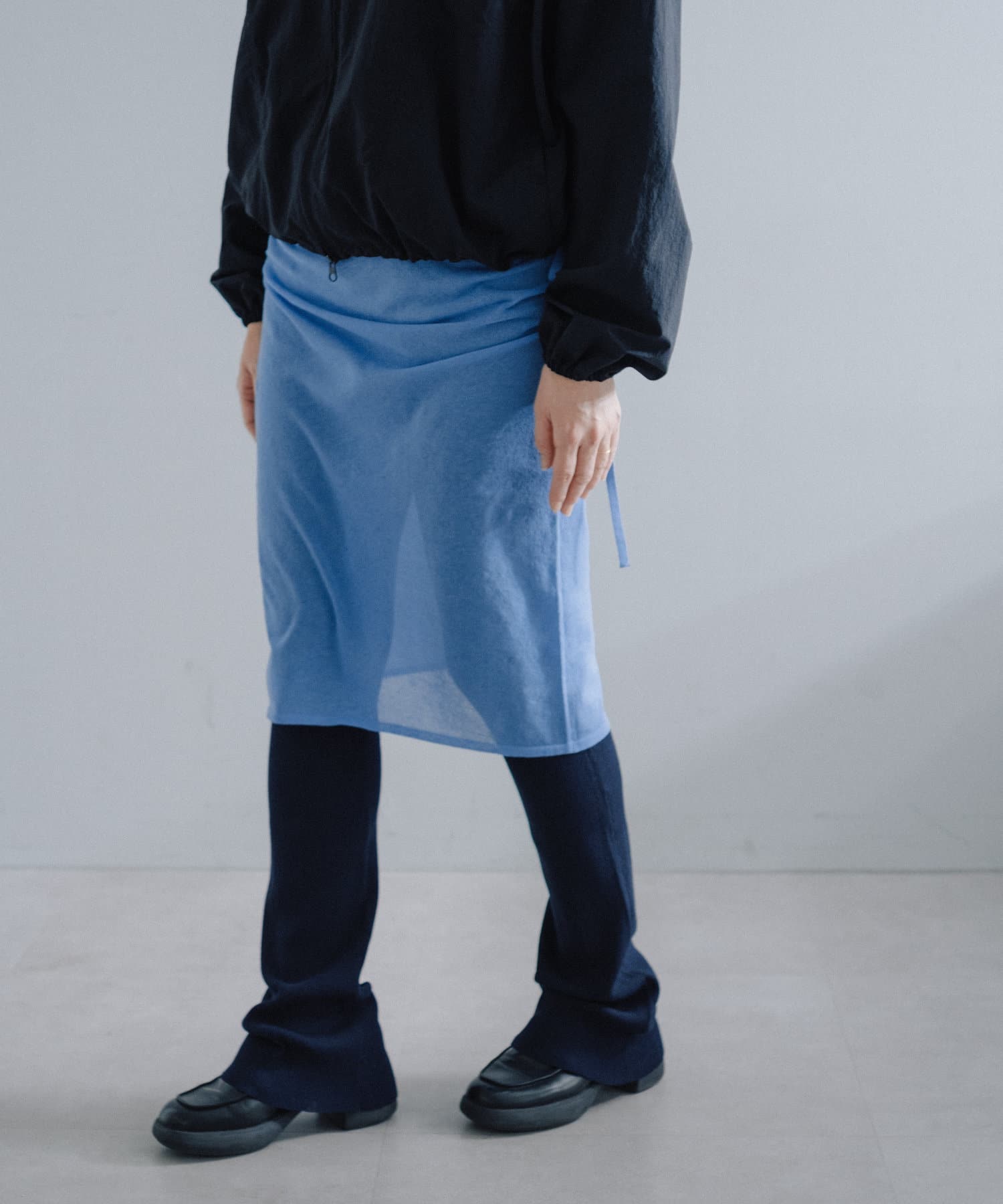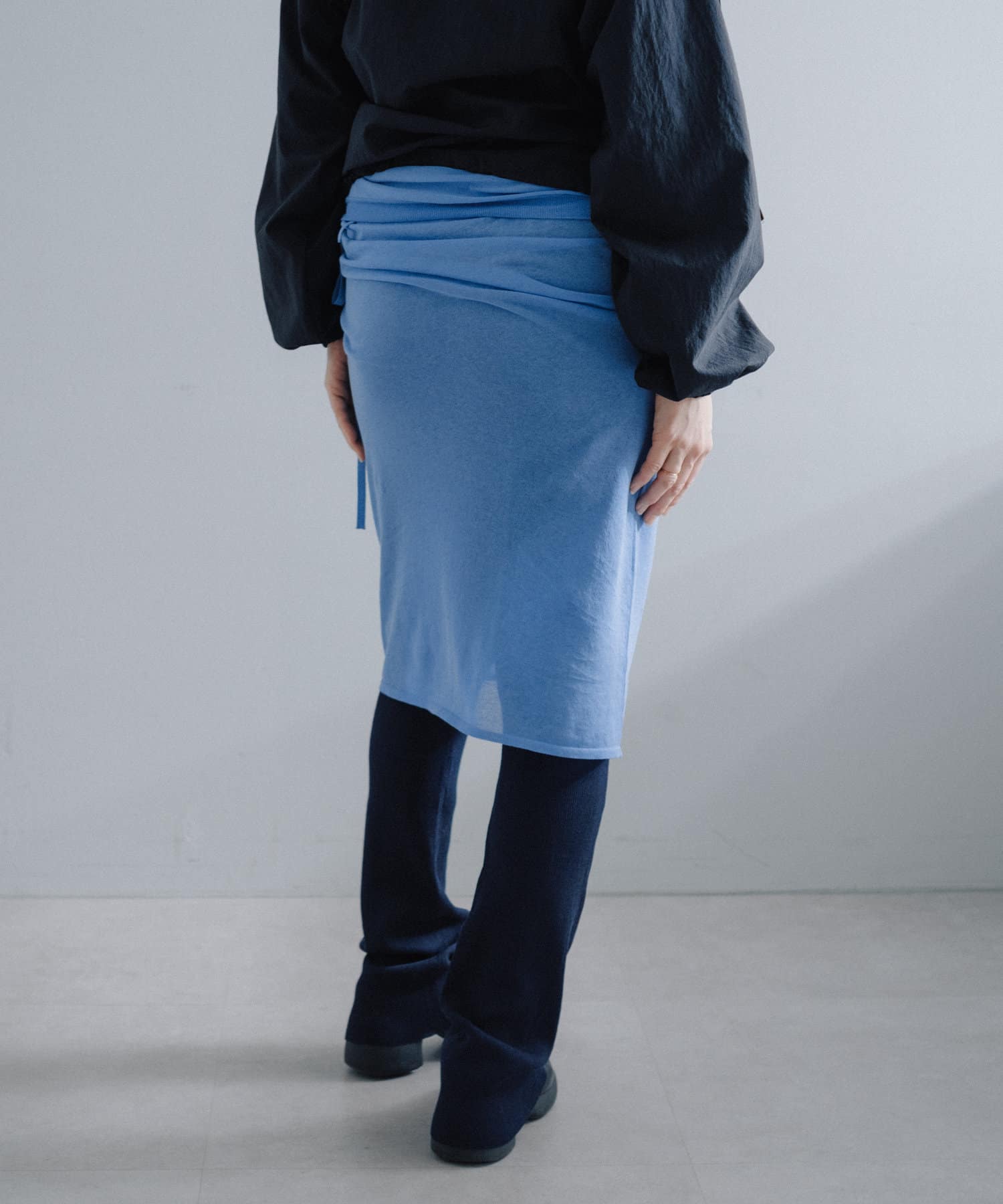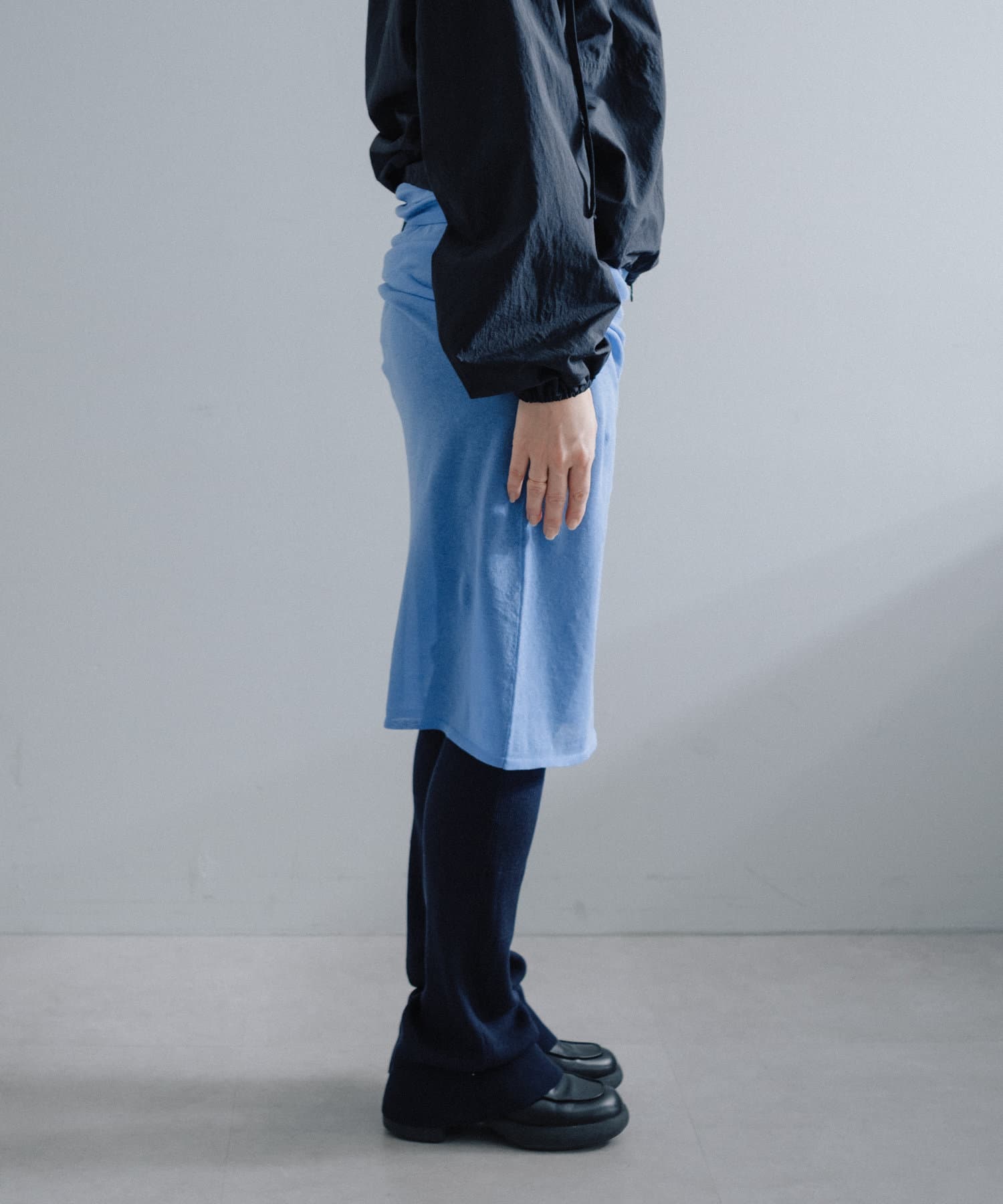 4ピースニットシリーズの中で1番透け感があるスカート。レギンスやリブパンツと重ねてセットアップ着用を想定して、裏地無しで作りました。