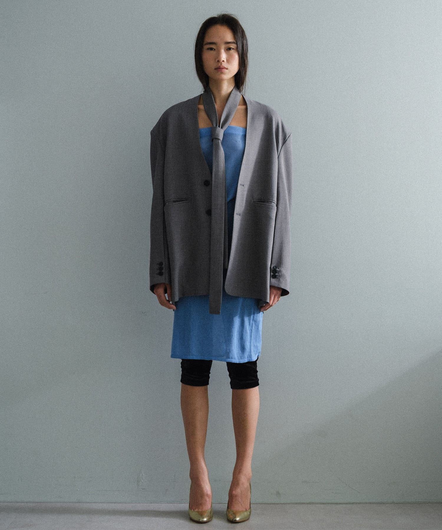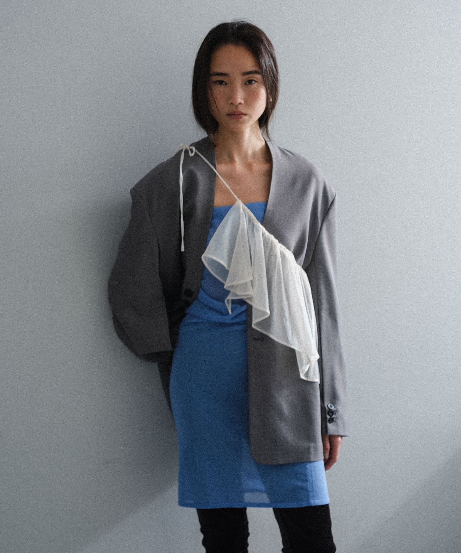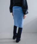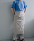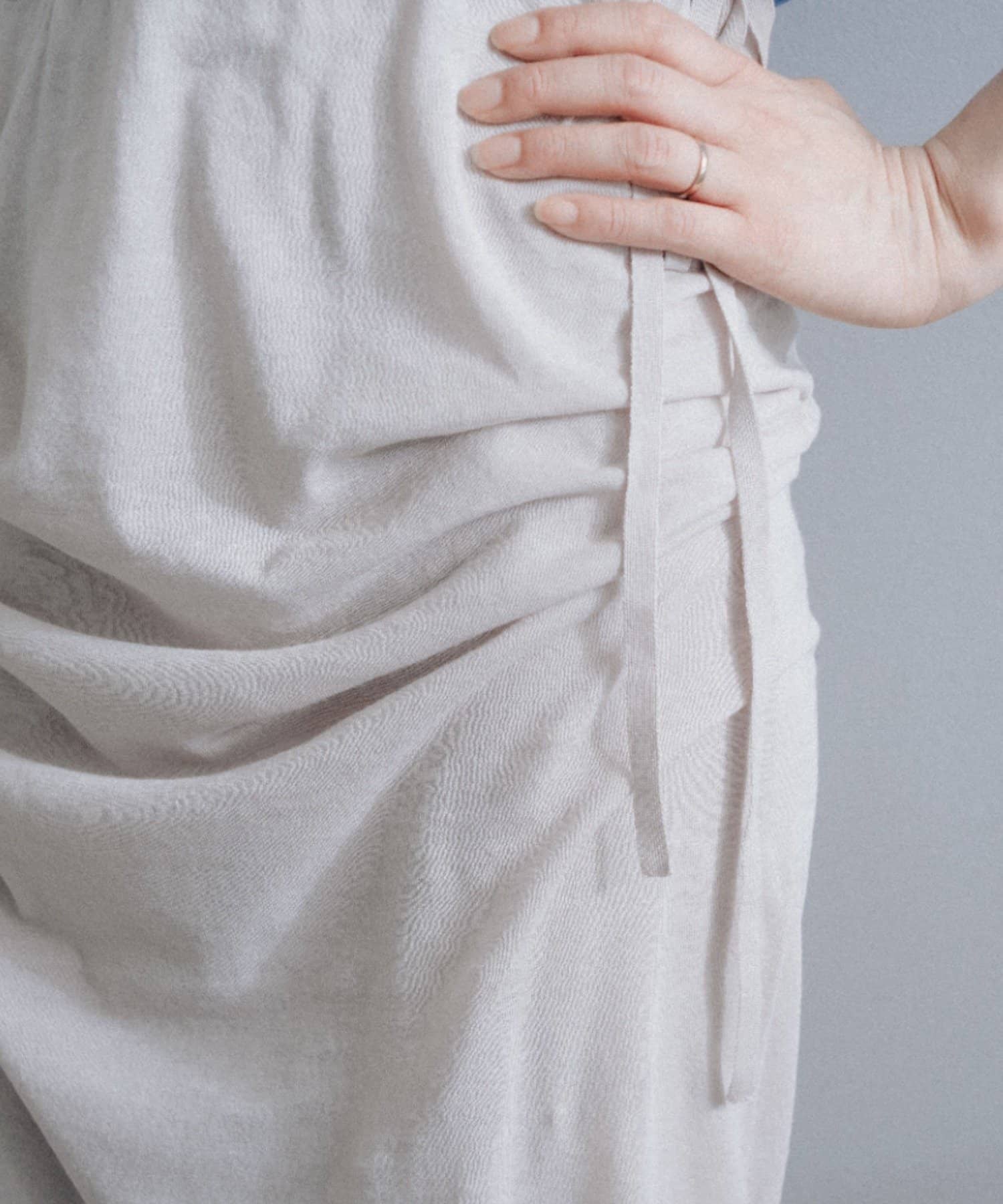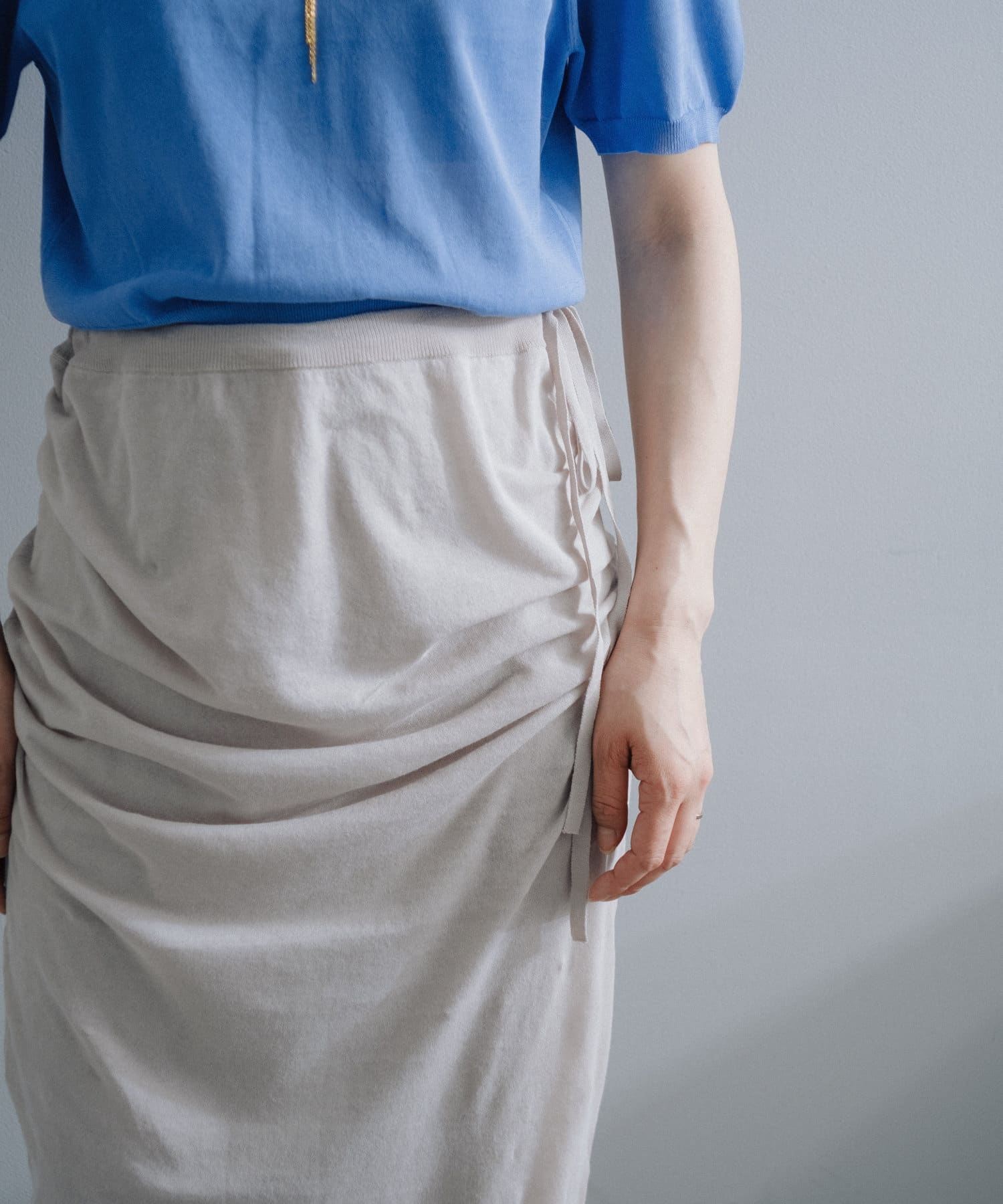 ウエストは左脇の紐で絞って調整が可能。スカートとして履くほか、胸上まで持ち上げてベアトップ膝丈のチュニックワンピースとしても着用できます。また、フィット感を活かしてくしゅくしゅとスカートを弛ませて、丈を短く調整して履くのも裏ワザとしておすすめです。ボディラインが出すぎるのが気になる方や、スカート丈をお好みに調整したい時に便利です。
