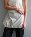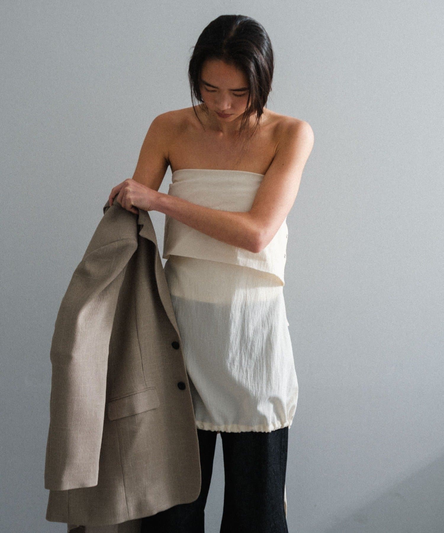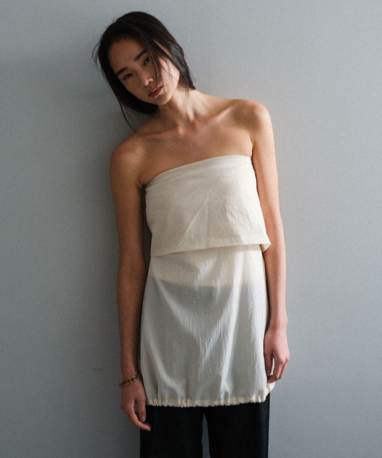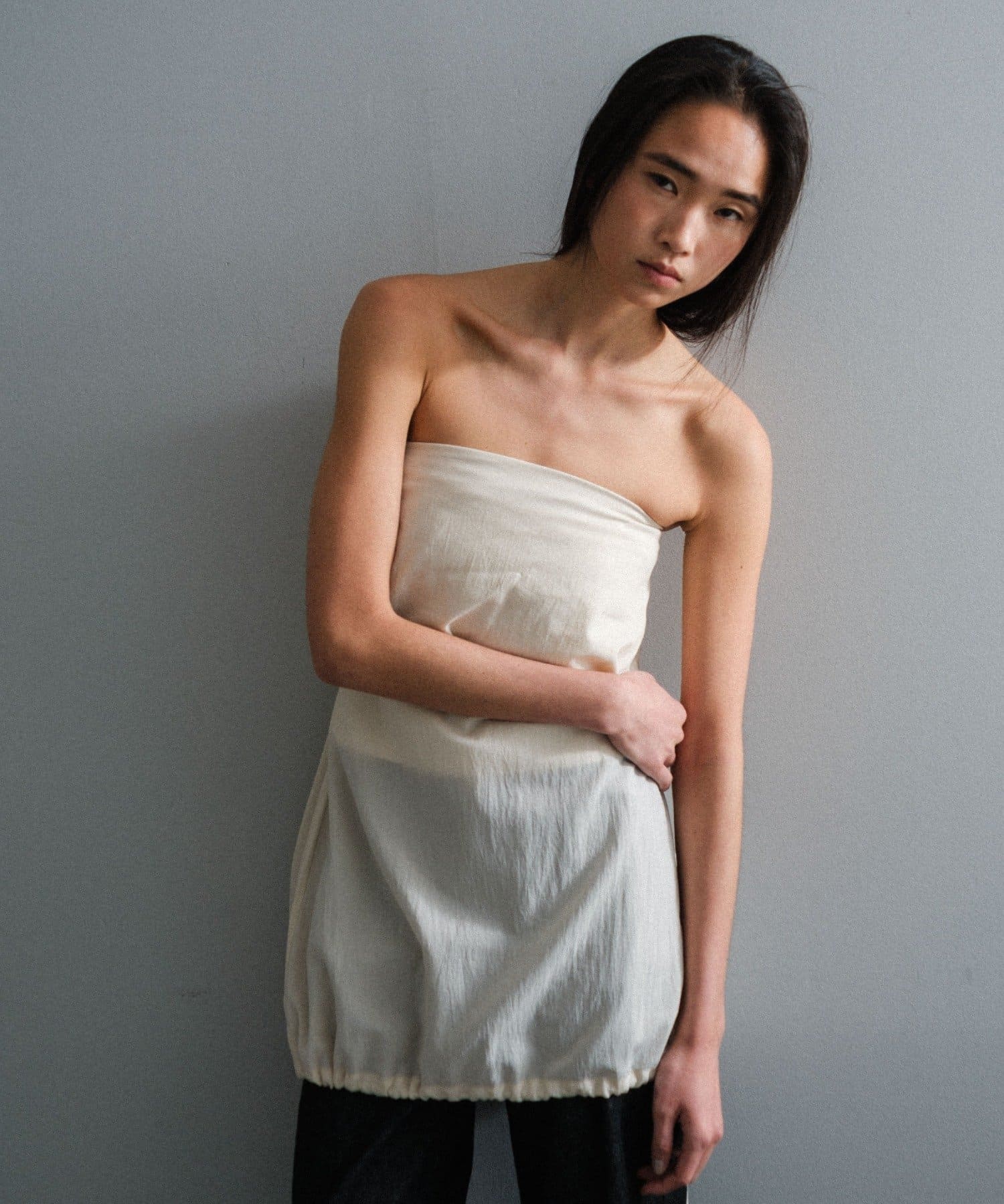 ベアトップで着るときは、袖部分を背中側で結んで着るというやや裏ワザな着用になりますが、可愛いです。その際は、裾に通った紐でギャザーを寄せてバルーンシルエットにするのがおすすめです。