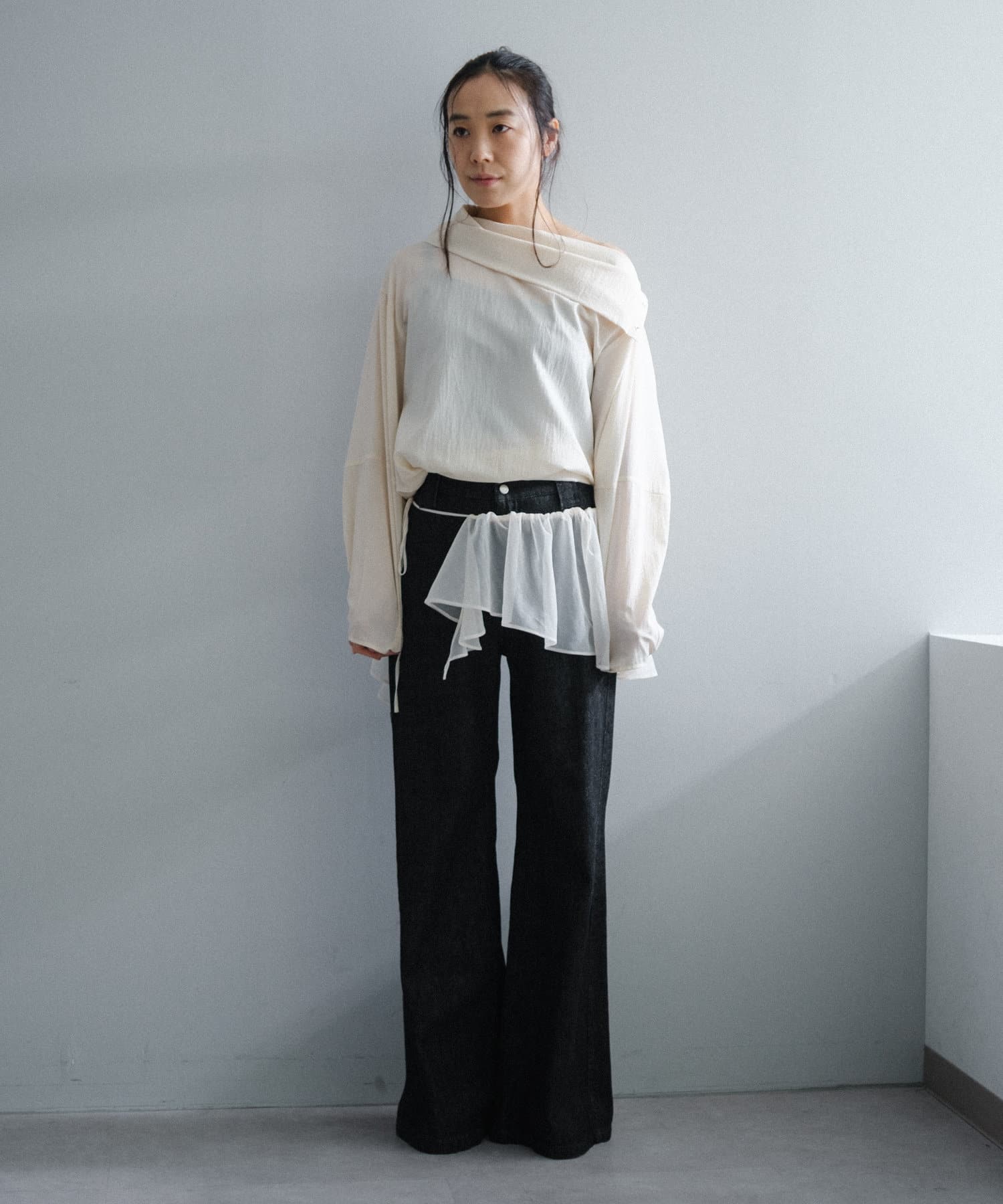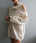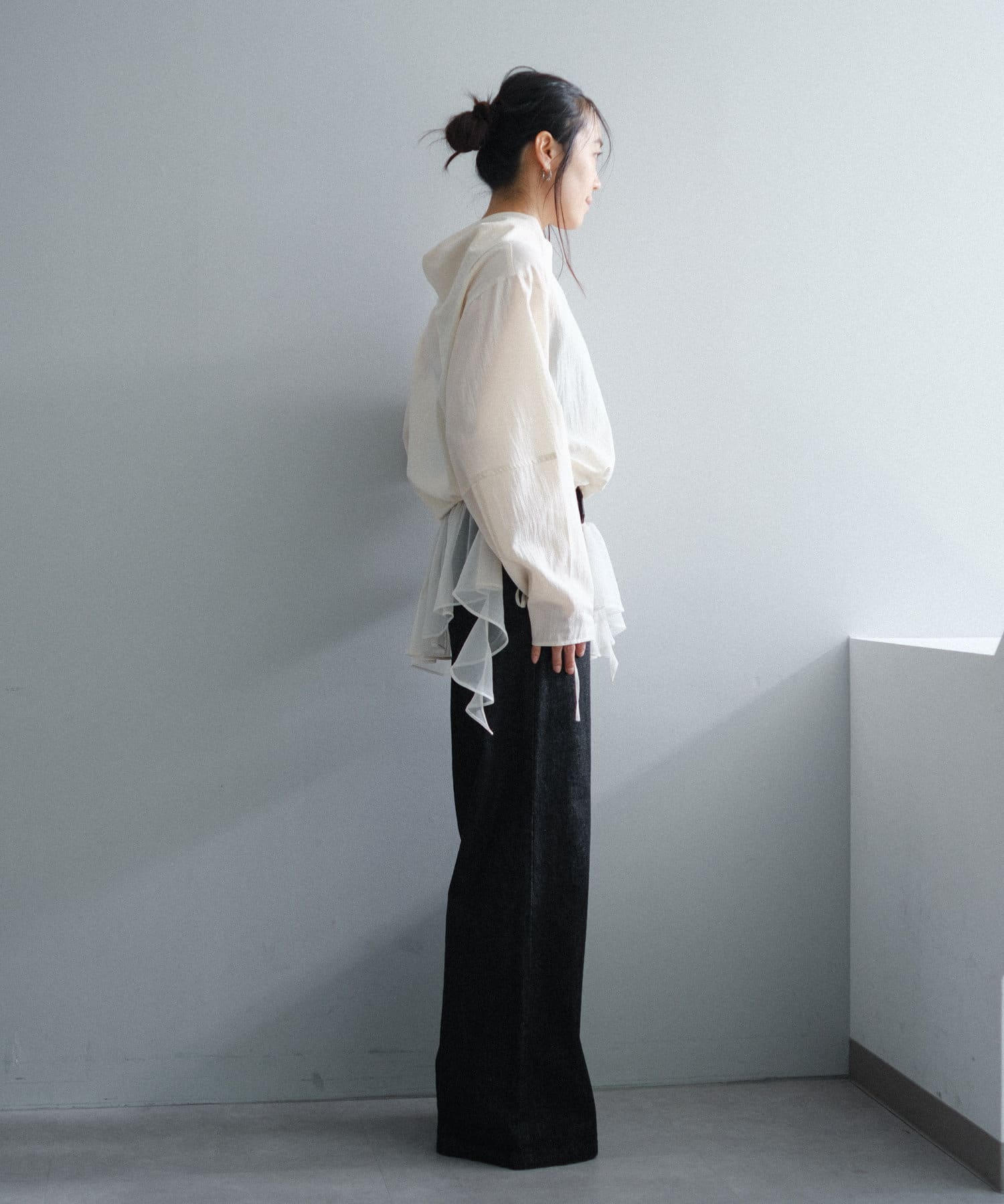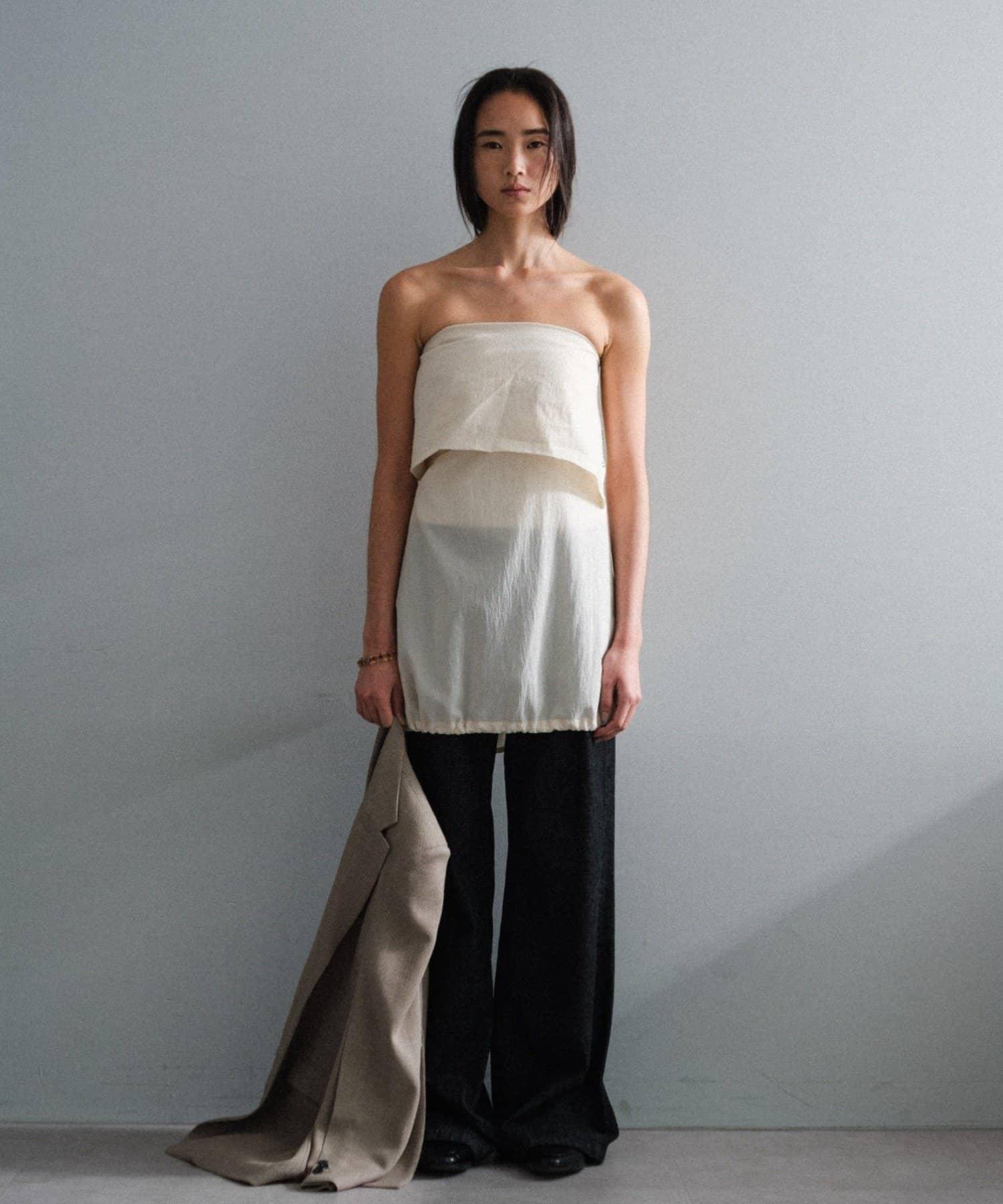 ベアトップで着るときは、袖部分を背中側で結んで着るというやや裏ワザな着用になりますが、可愛いです。その際は、裾に通った紐でギャザーを寄せてバルーンシルエットにするのがおすすめです。