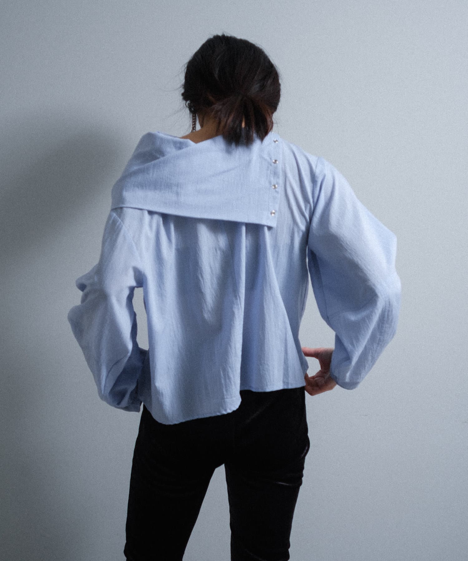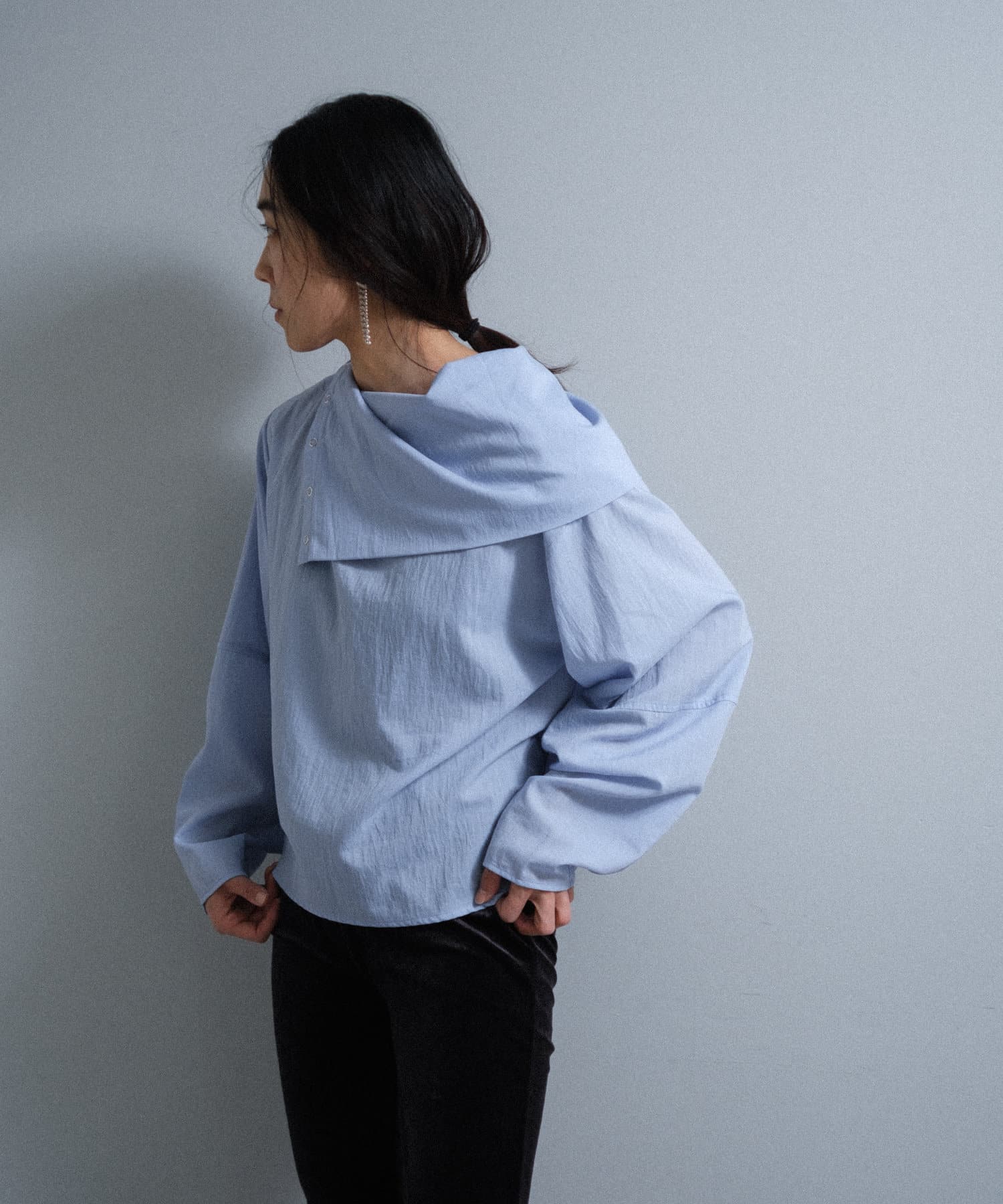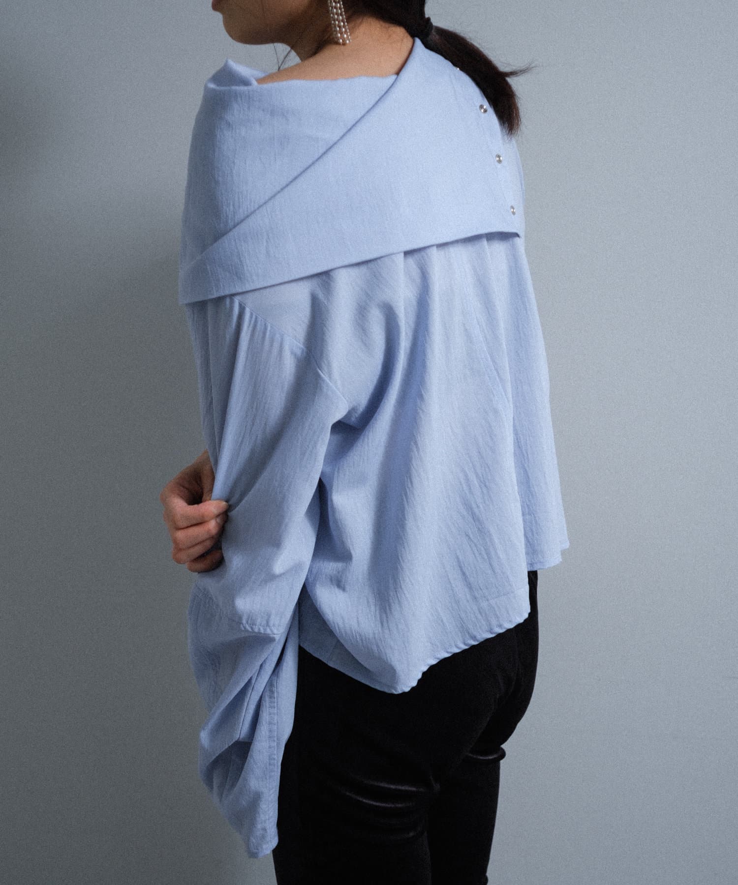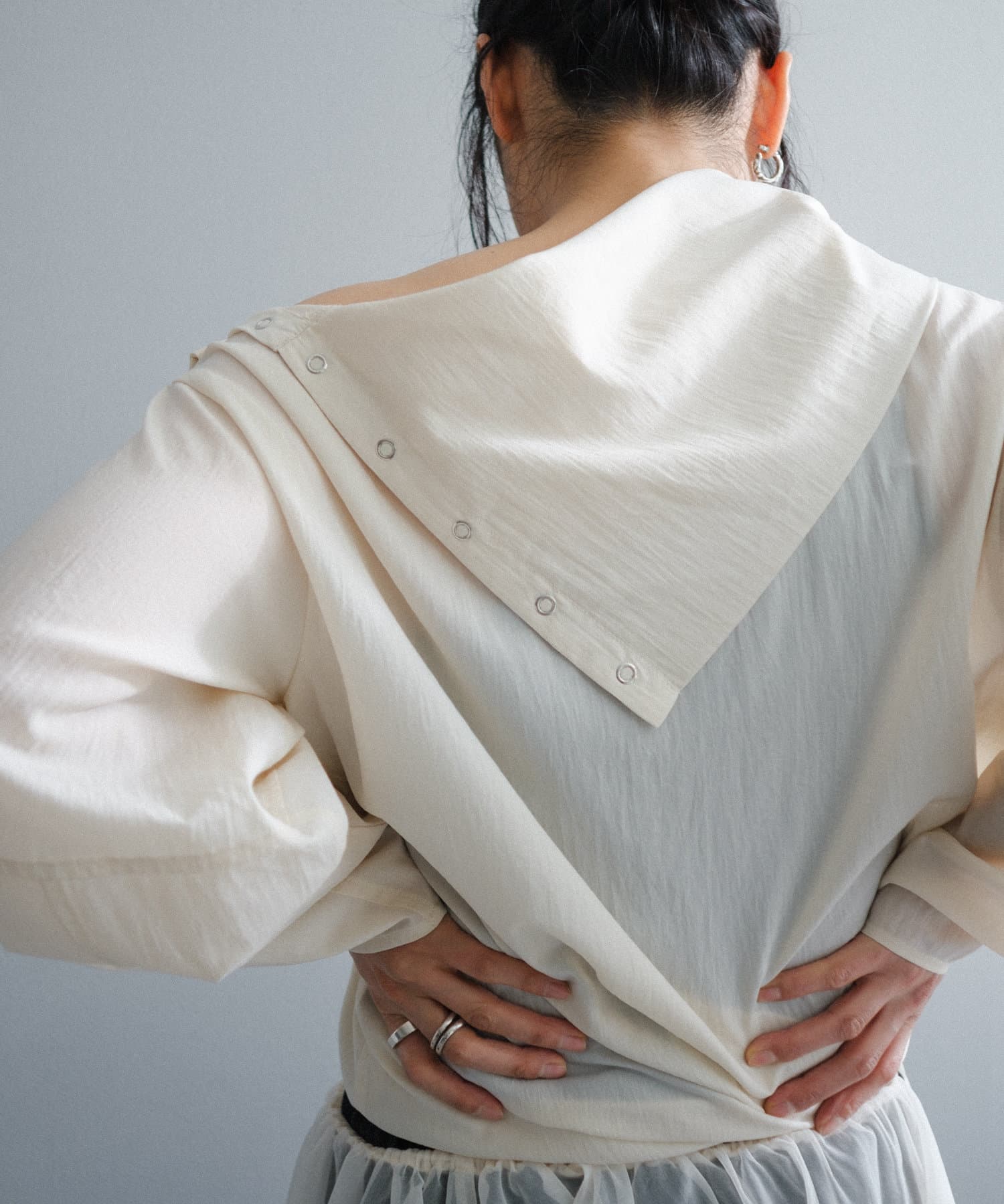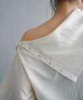 目を引く特徴的な大きな襟は、首脇に沿うようについたボタンをすべて留めると、首元にくしゅくしゅと生地が溜まってまるでフードがついたようなデザインに。肘まで開くスナップボタンを肩まで開けると、ワンショルダーデザインになり、お好みの開き具合に調整ができます。スカーフ型の変形襟は、ボタンの留め方次第で襟幅もアレンジ可能。(やってみないとちょっとわかりにくい)
