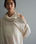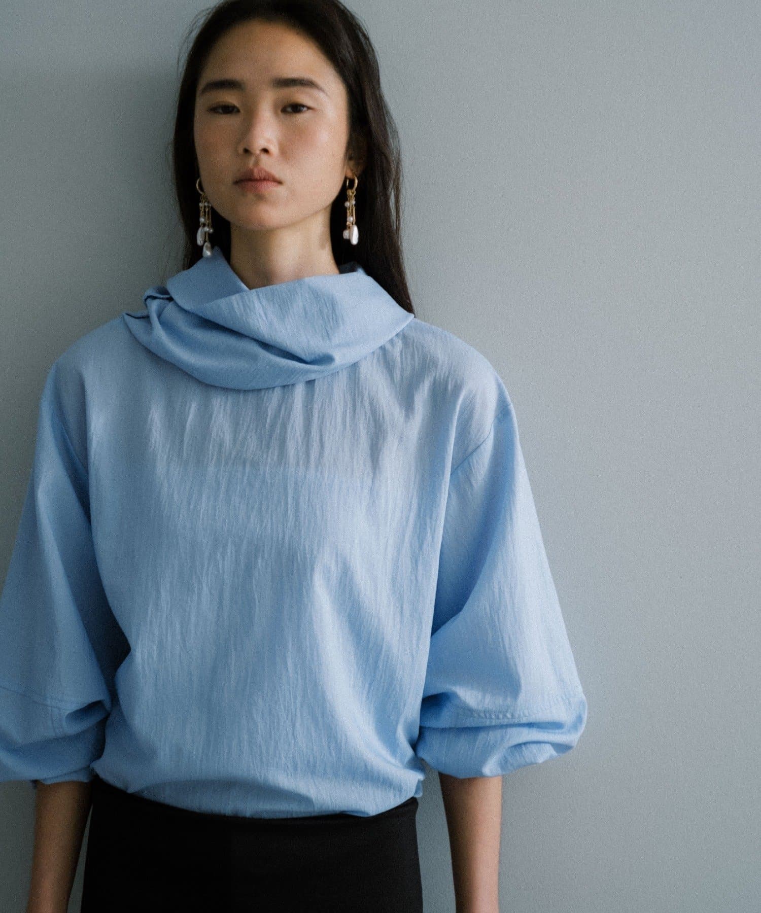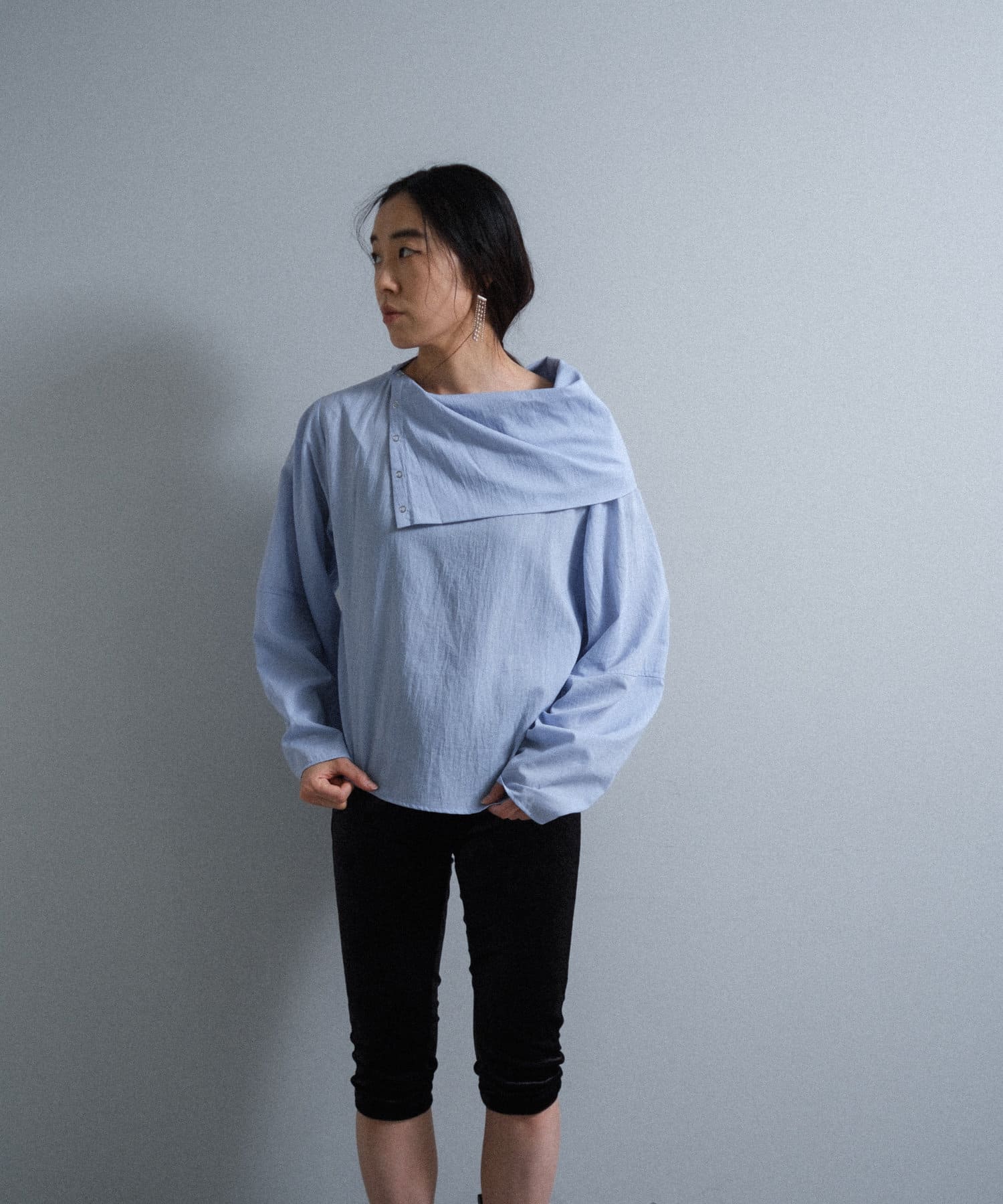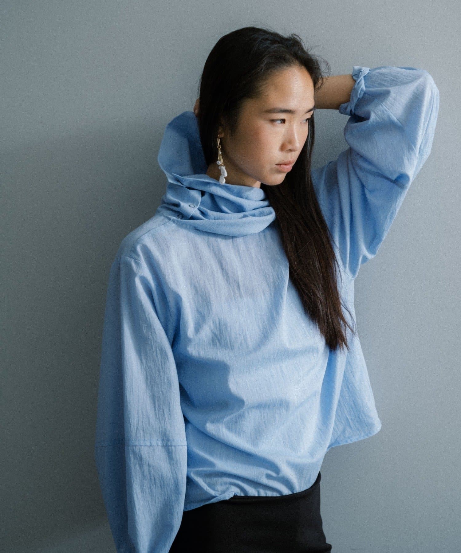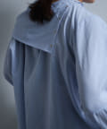 目を引く特徴的な大きな襟は、首脇に沿うようについたボタンをすべて留めると、首元にくしゅくしゅと生地が溜まってまるでフードがついたようなデザインに。肘まで開くスナップボタンを肩まで開けると、ワンショルダーデザインになり、お好みの開き具合に調整ができます。スカーフ型の変形襟は、ボタンの留め方次第で襟幅もアレンジ可能。(やってみないとちょっとわかりにくい)