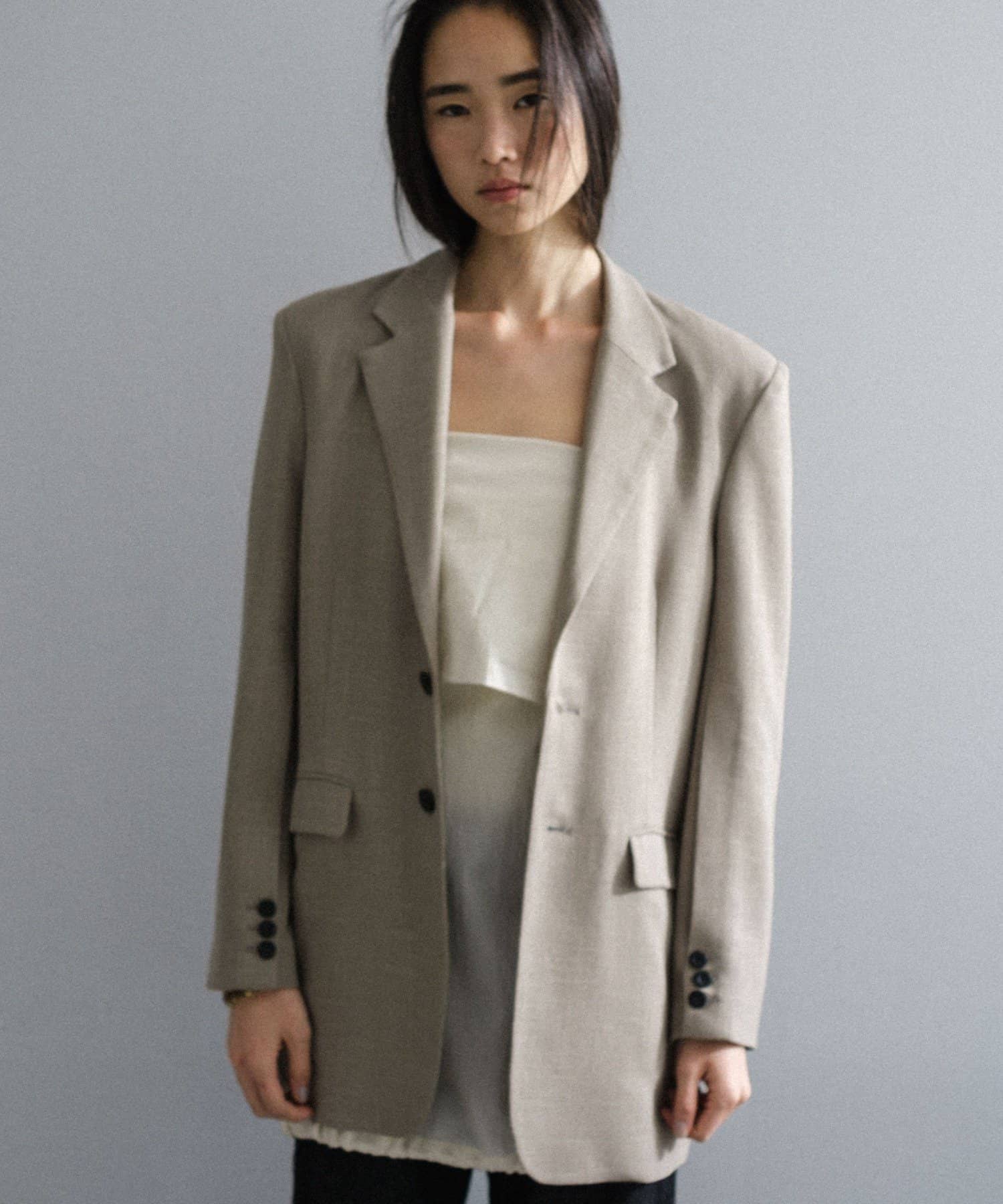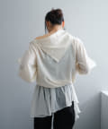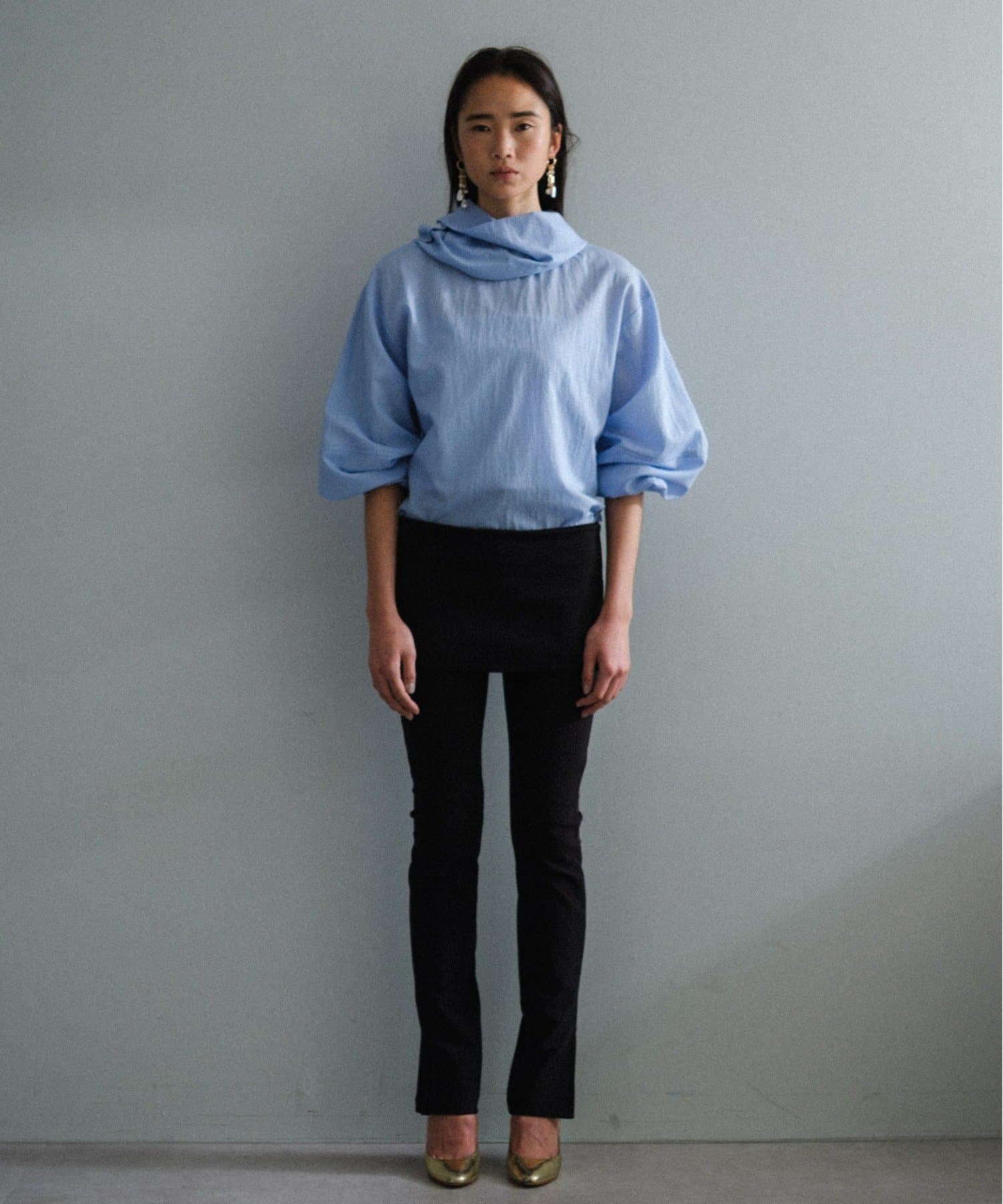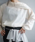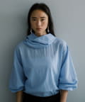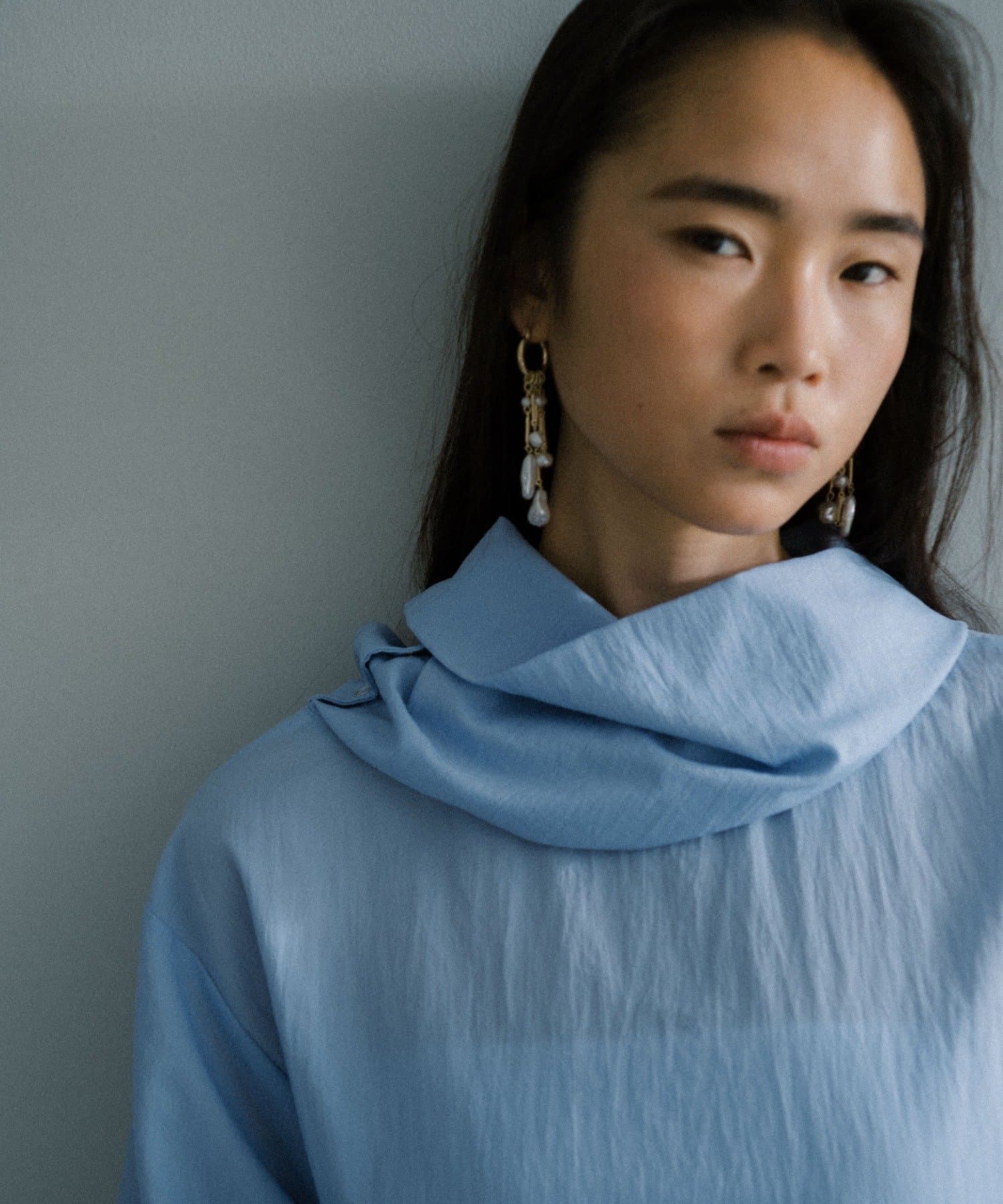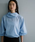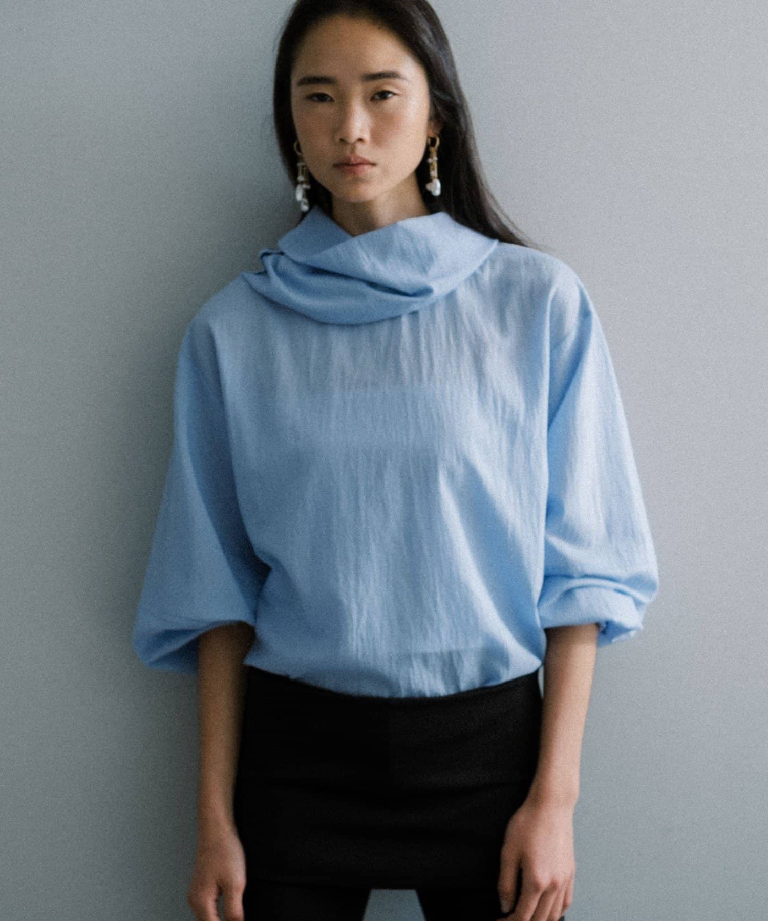 目を引く特徴的な大きな襟は、首脇に沿うようについたボタンをすべて留めると、首元にくしゅくしゅと生地が溜まってまるでフードがついたようなデザインに。肘まで開くスナップボタンを肩まで開けると、ワンショルダーデザインになり、お好みの開き具合に調整ができます。スカーフ型の変形襟は、ボタンの留め方次第で襟幅もアレンジ可能。(やってみないとちょっとわかりにくい)