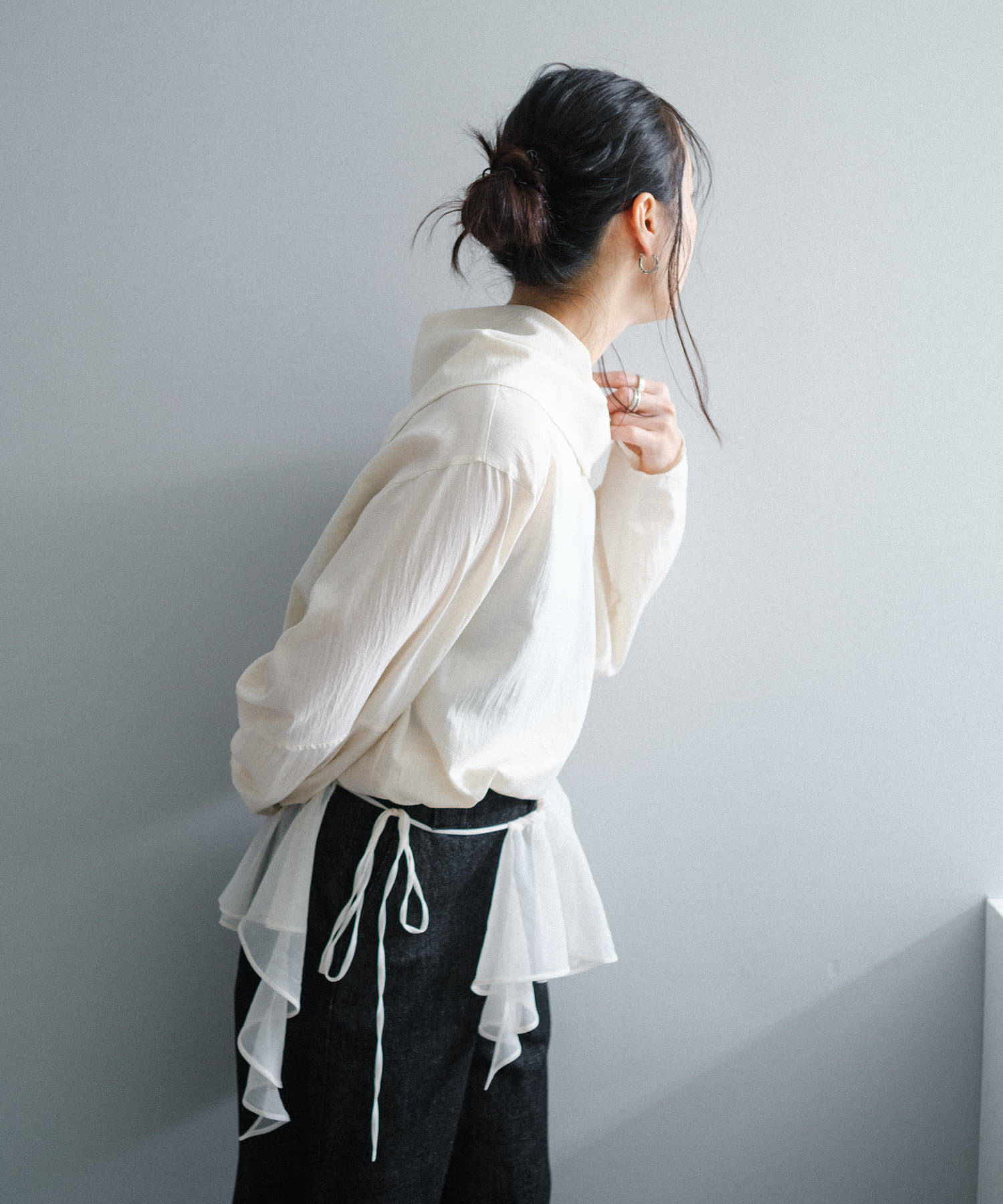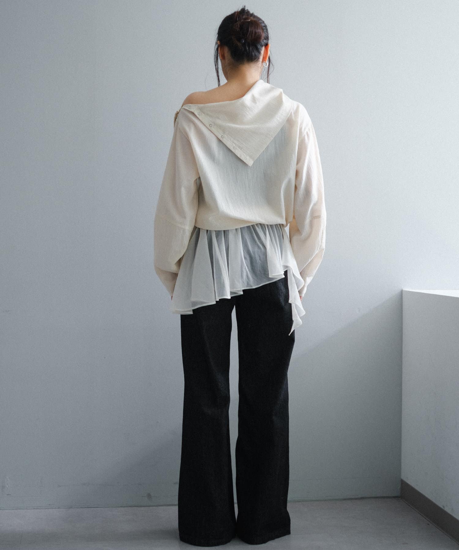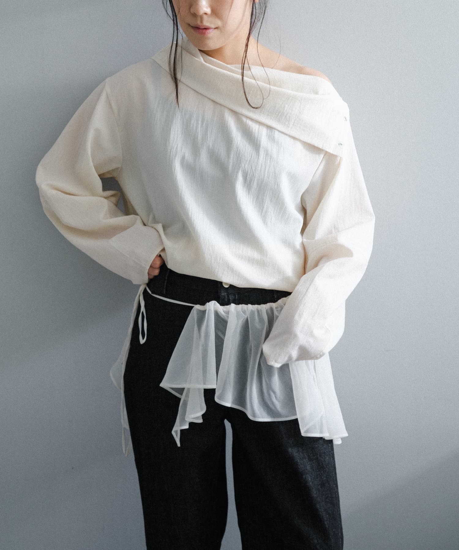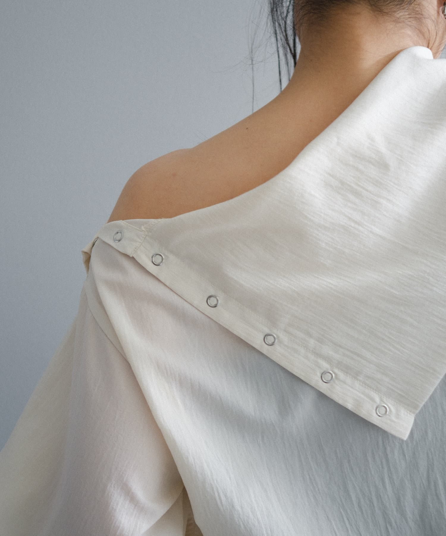 ワンショルダー、オフショルダー、ベアトップ、フーディーライク。ボタンアレンジで変幻自在に形が変わる、Pasteripらしいユニークなシャツチュニック。こんなの欲しかった、が叶うファッションが楽しくなる一着です。