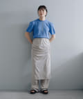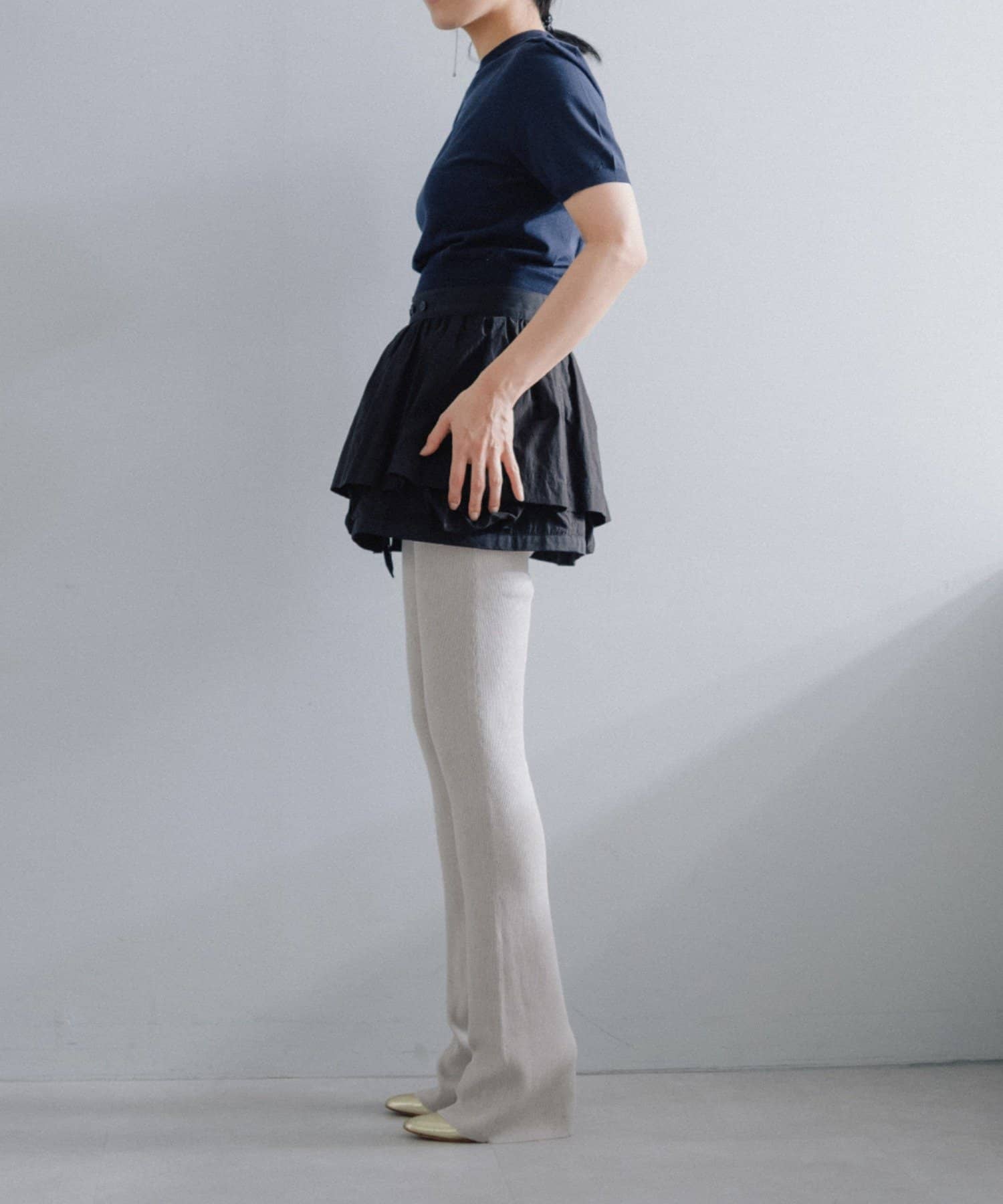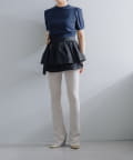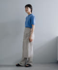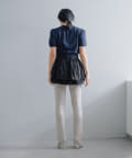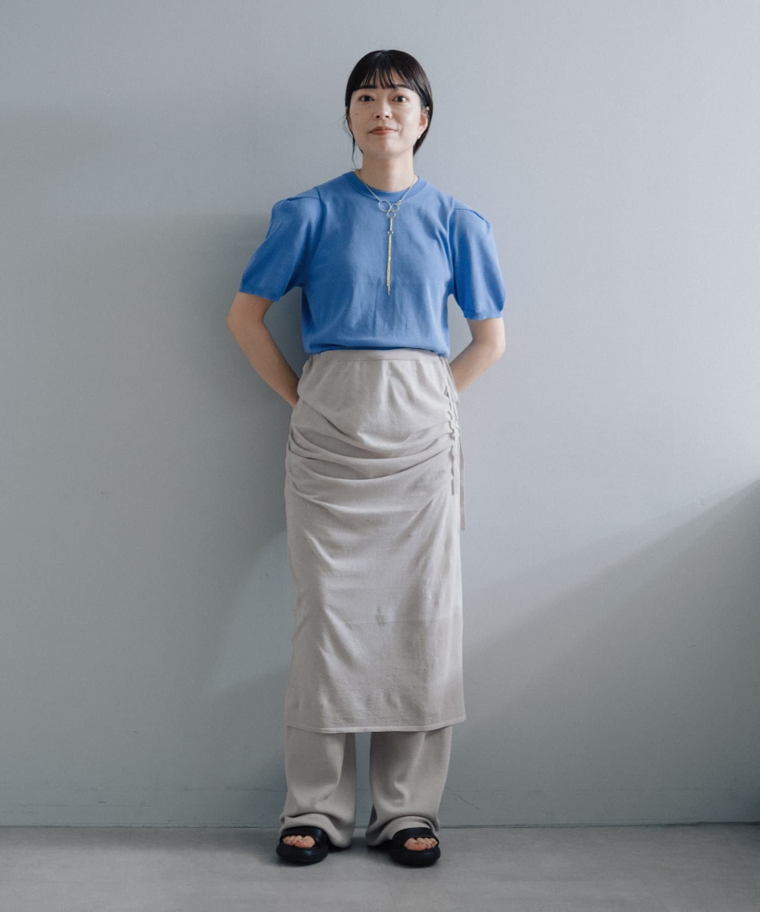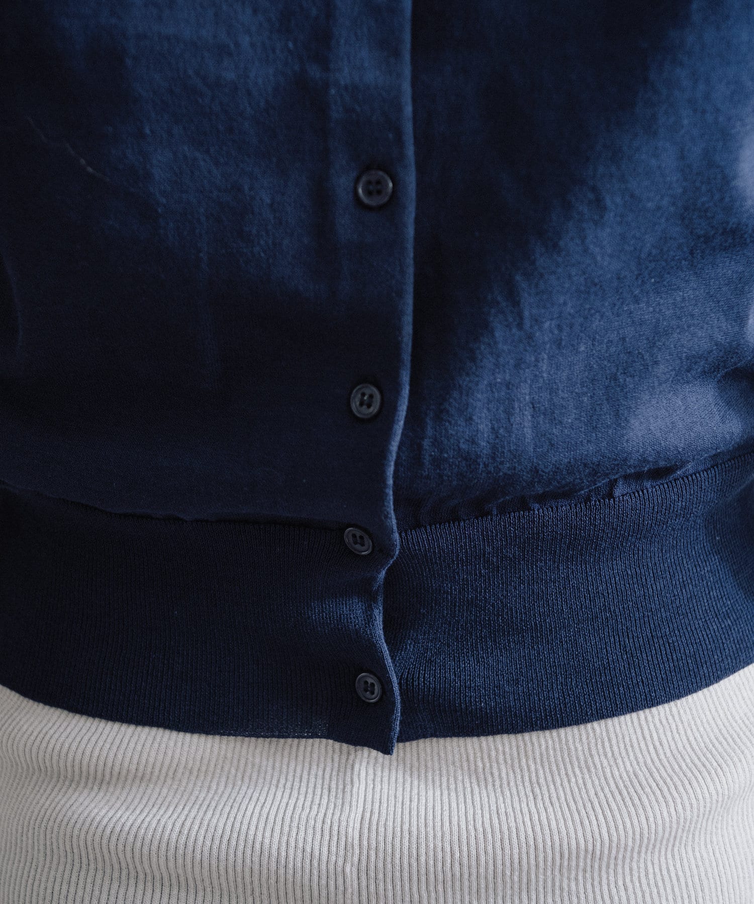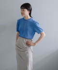 共糸のSmoothly knitシリーズとのセットアップはもちろん、1枚できちんと感の出るデザインなので、スラックスパンツ等とあわせてオフィスルックとしても活躍しそうです。薄手の編地を活かして、秋はシャツやシアーインナーなどとのレイヤードスタイルもおすすめです。
