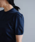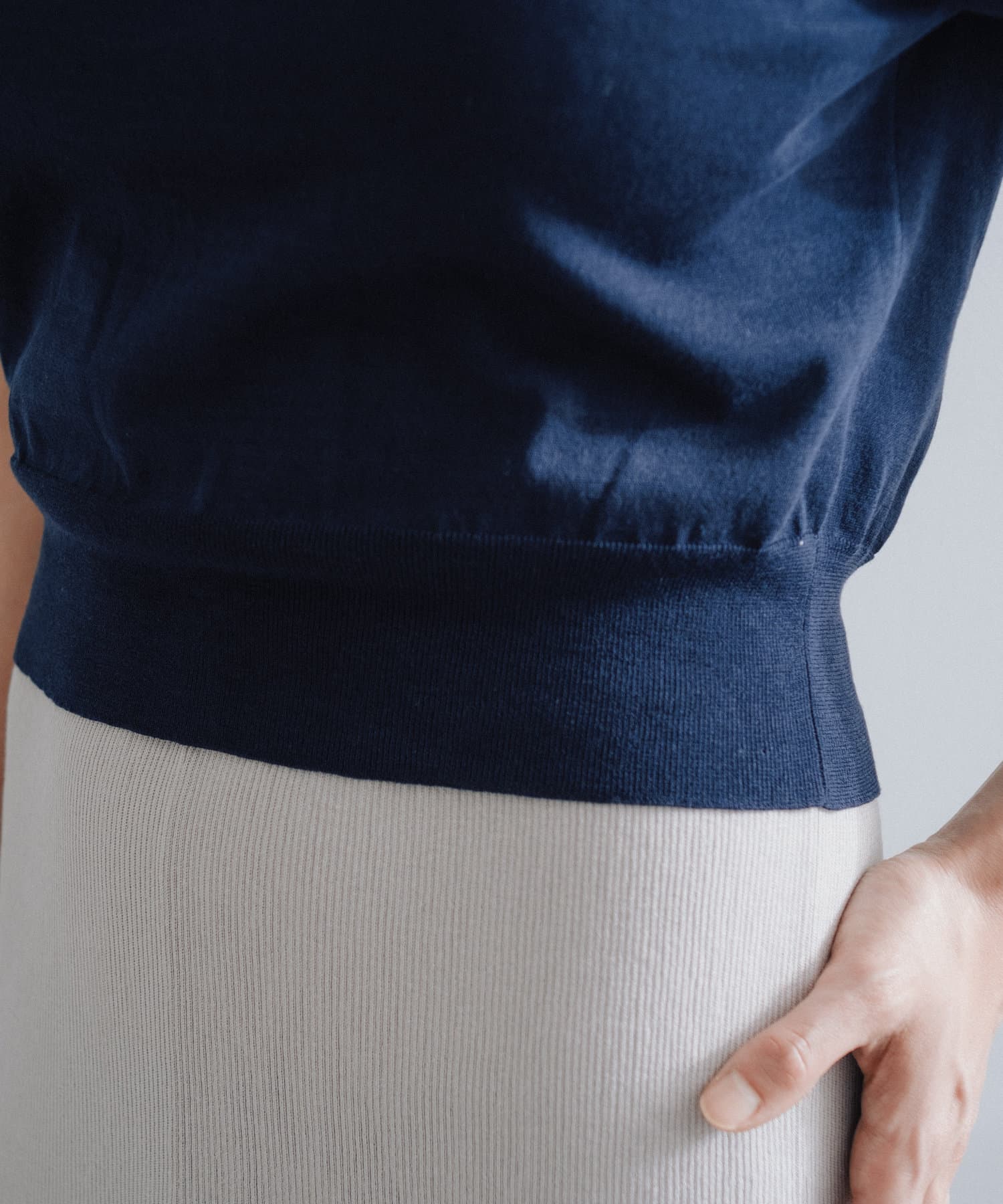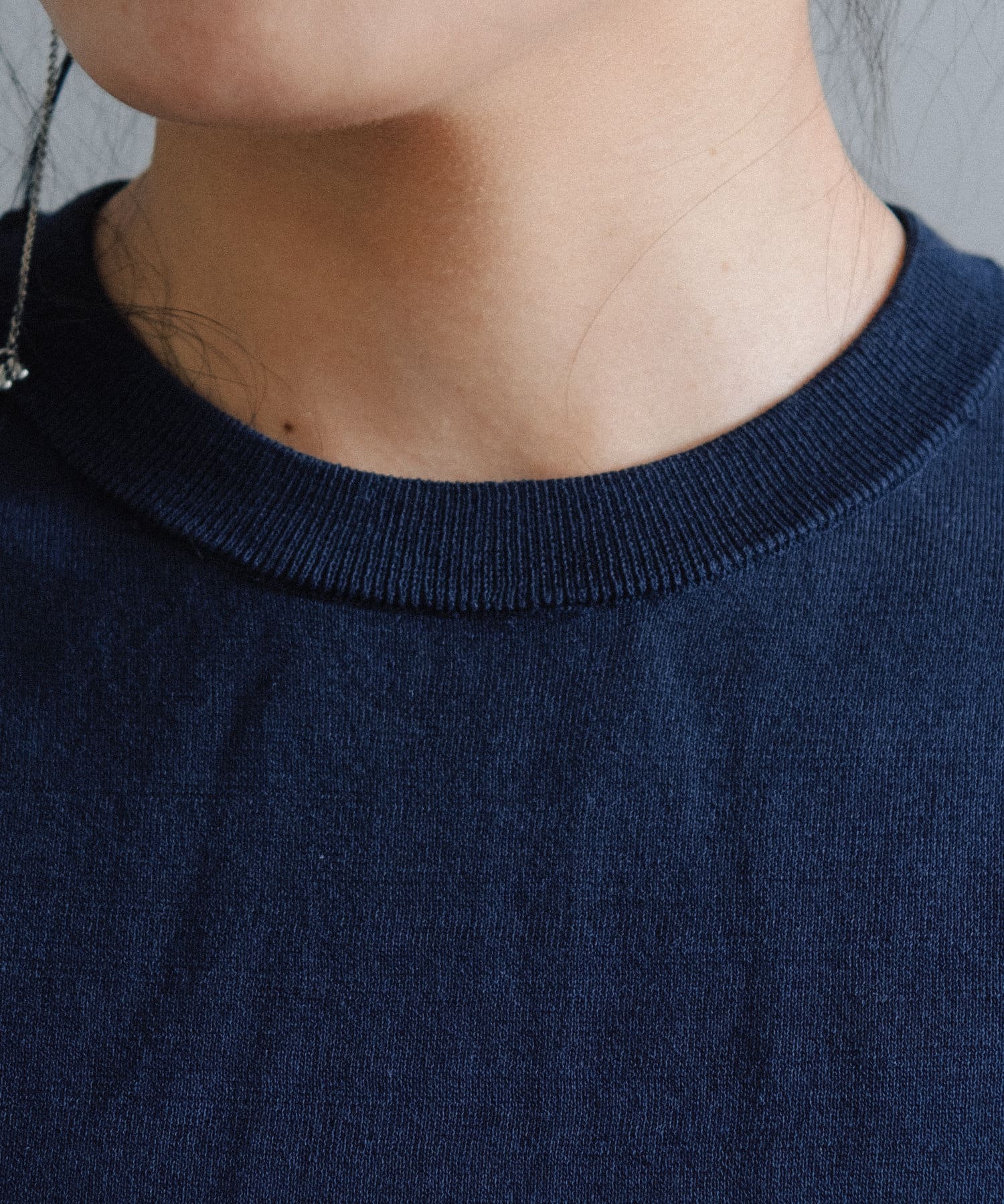 夏はついついTシャツばかりになりがちですが、カットソーよりもカジュアルになりすぎず、楽なのに綺麗に着られるハイゲージニットを提案します。毛羽立ちが少ない細番手の糸を高密度に編み上げることで、薄手で軽く、肌離れも良い夏にぴったりの編地に仕上がりました。