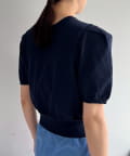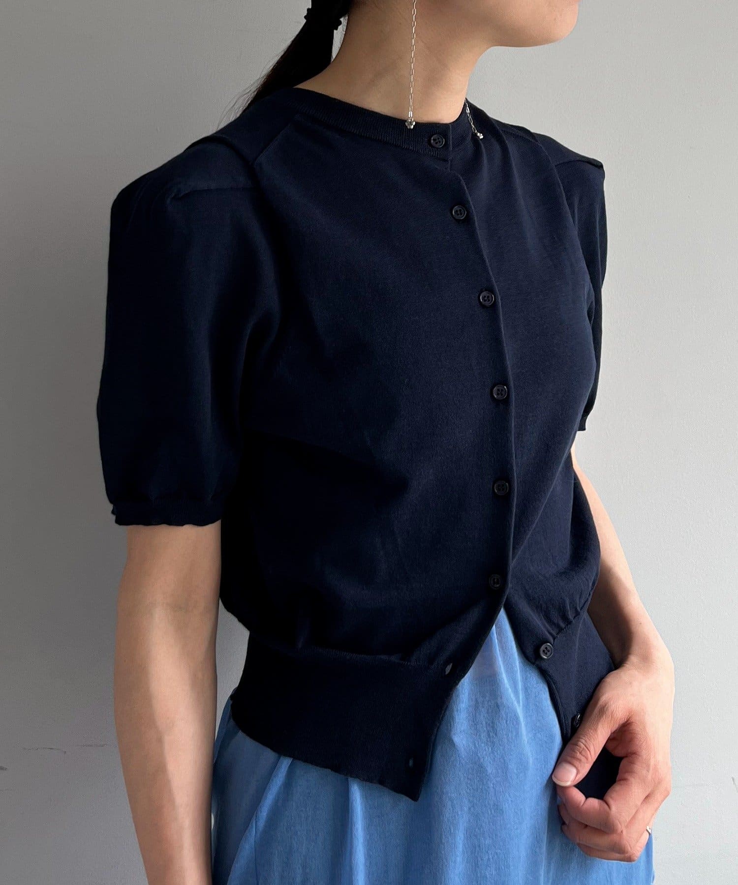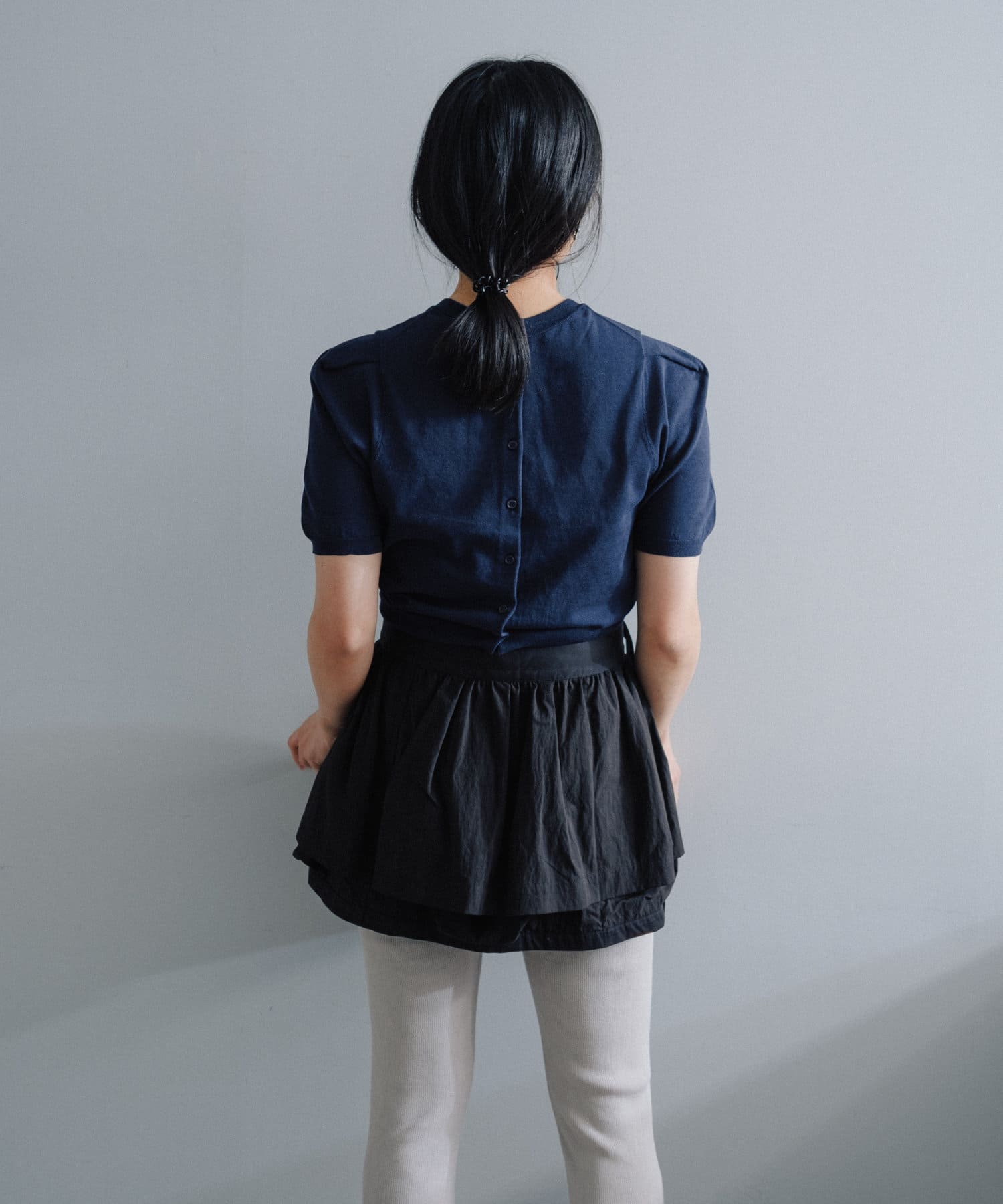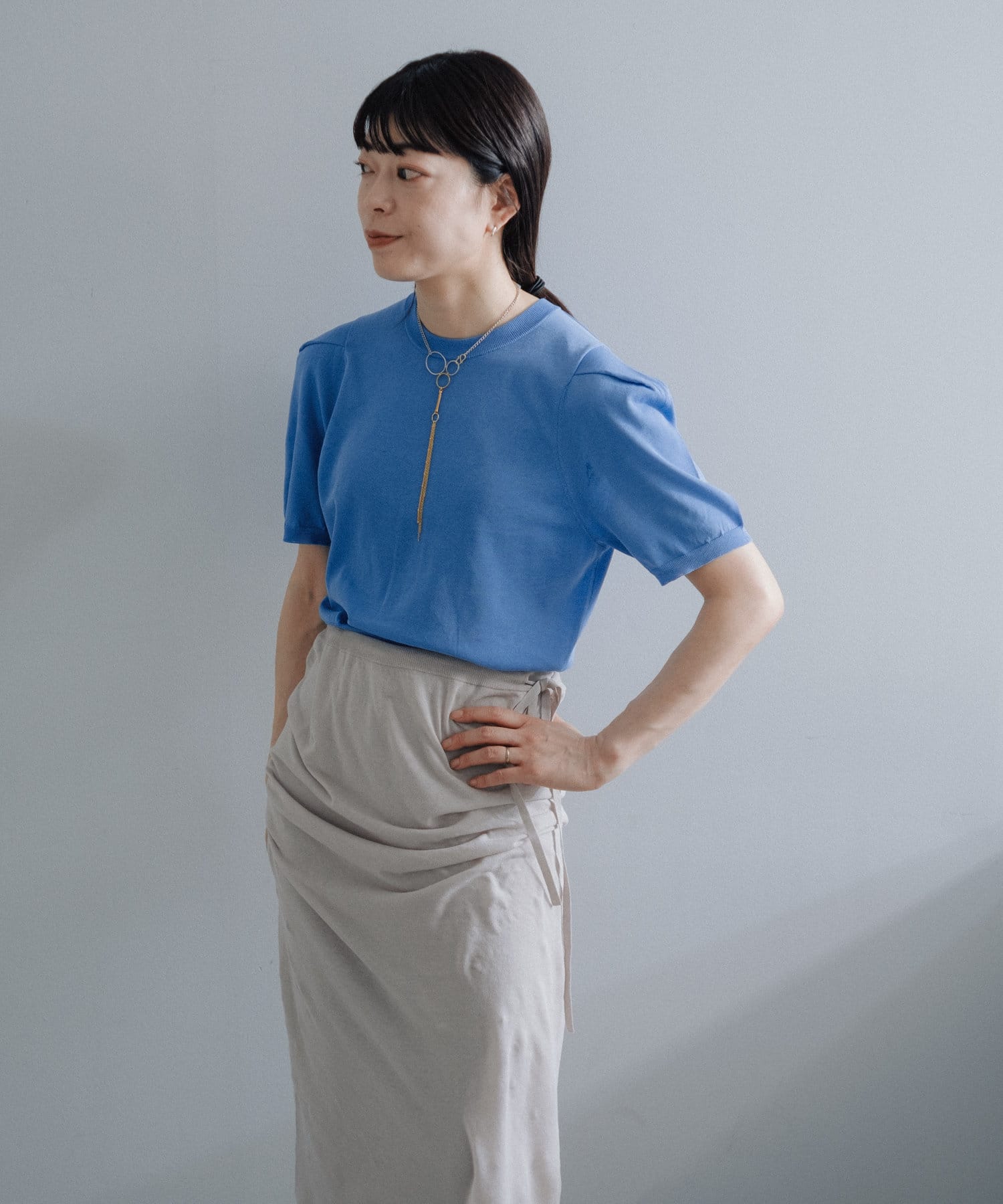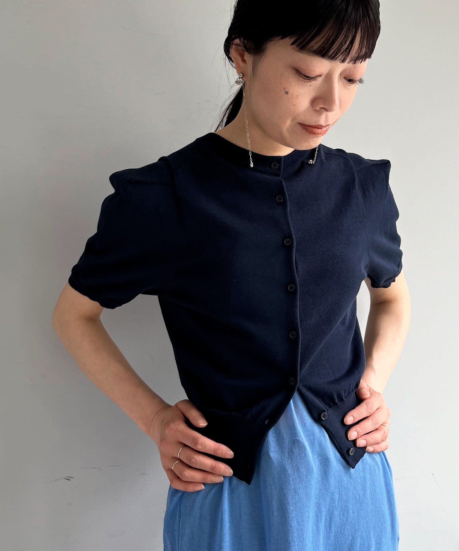 肩のシルエットを美しく見せてくれるパフデザインのTシャツは、背中がボタン開きデザインの2WAY仕様。半袖のカーディガンとしても着回しを楽しめる優れものです。さらりとした手触りで肌離れも良く、程よく透け感もあるので、ニットながら夏にも気持ちよく着ていただけます。