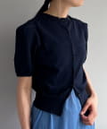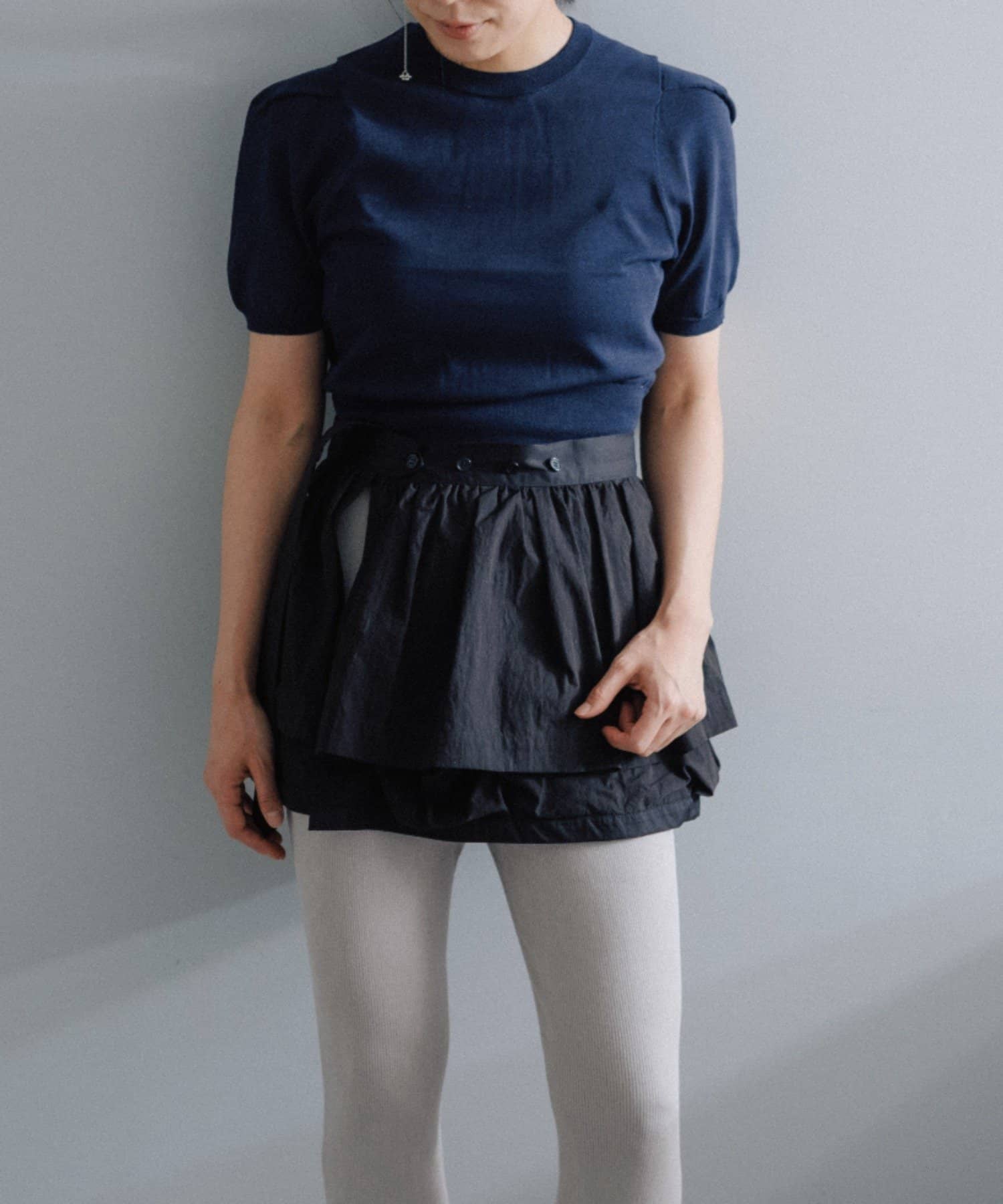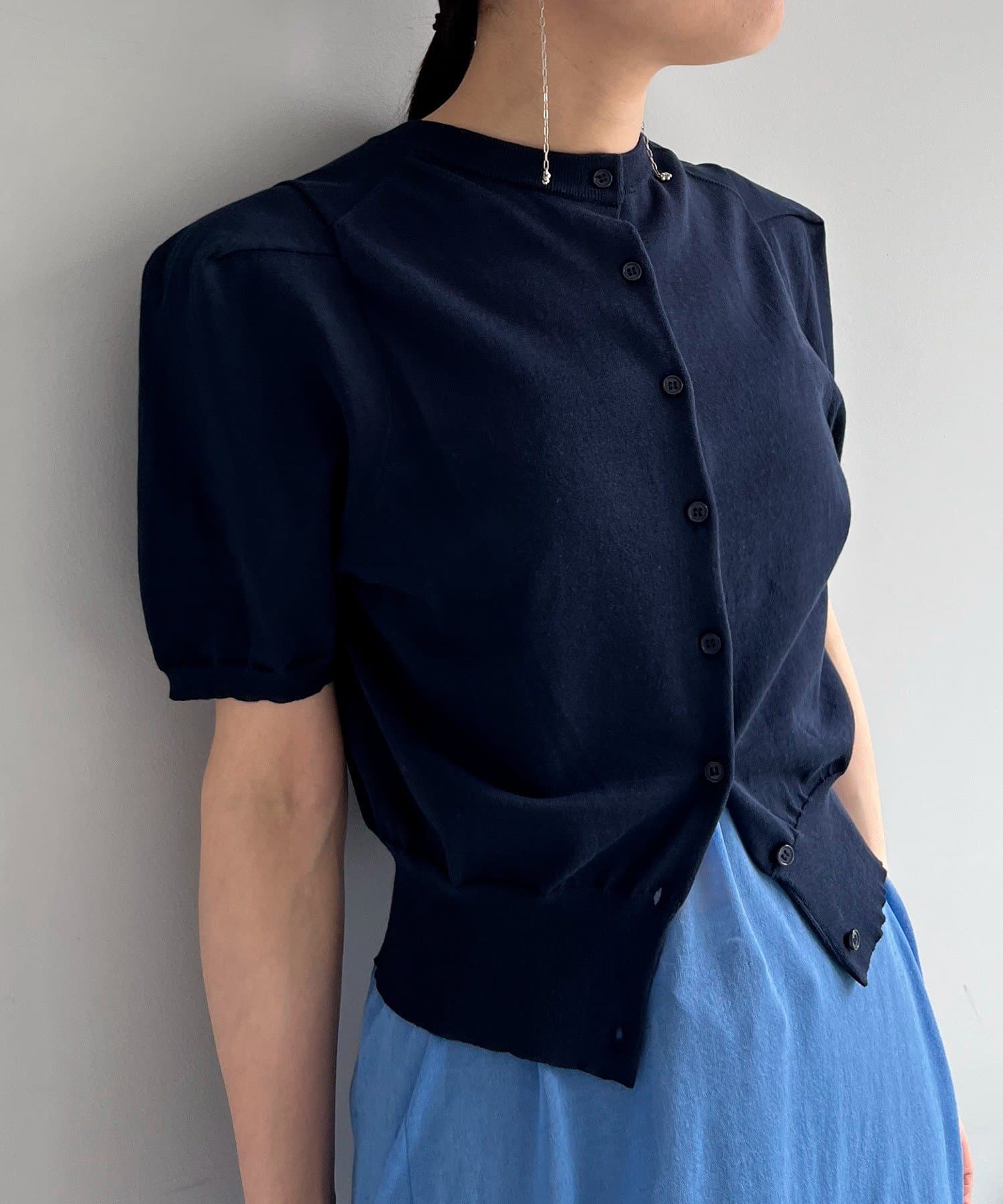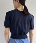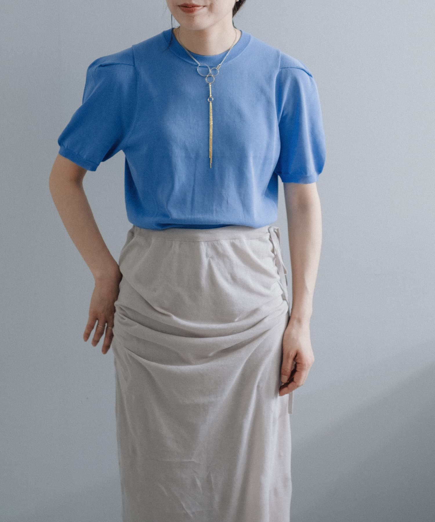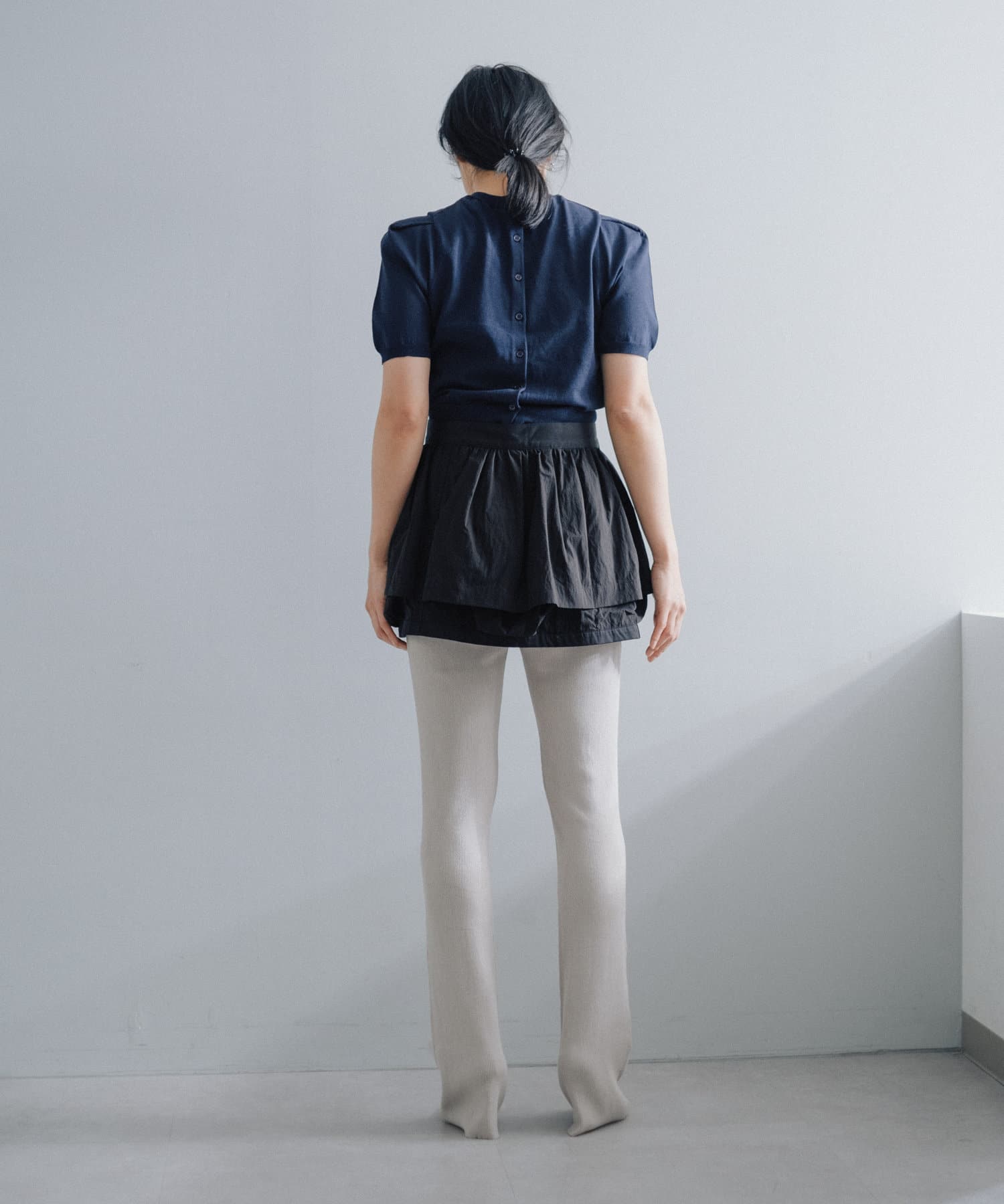 肩のシルエットを美しく見せてくれるパフデザインのTシャツは、背中がボタン開きデザインの2WAY仕様。半袖のカーディガンとしても着回しを楽しめる優れものです。さらりとした手触りで肌離れも良く、程よく透け感もあるので、ニットながら夏にも気持ちよく着ていただけます。