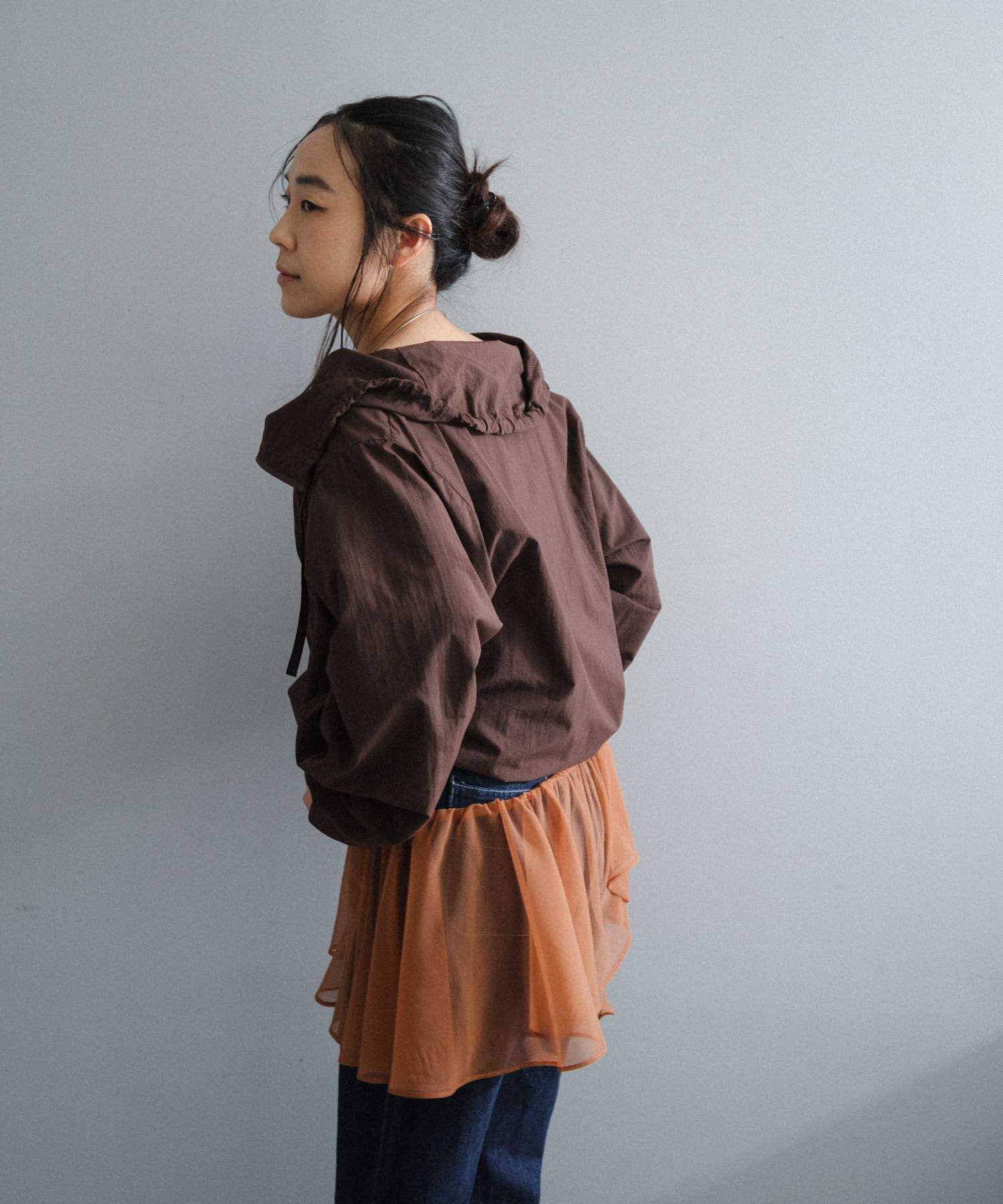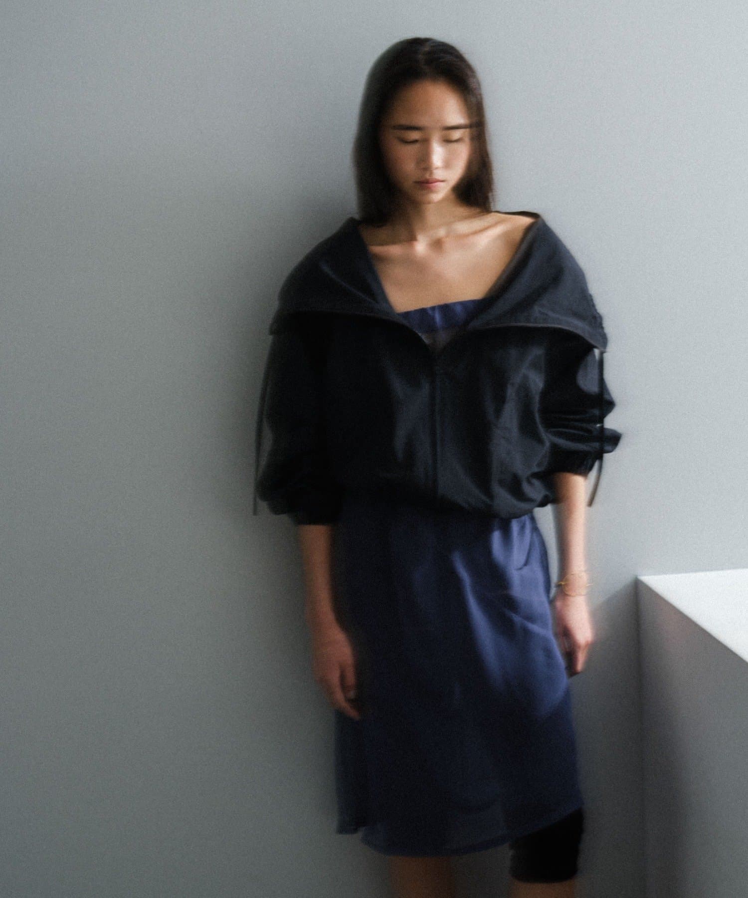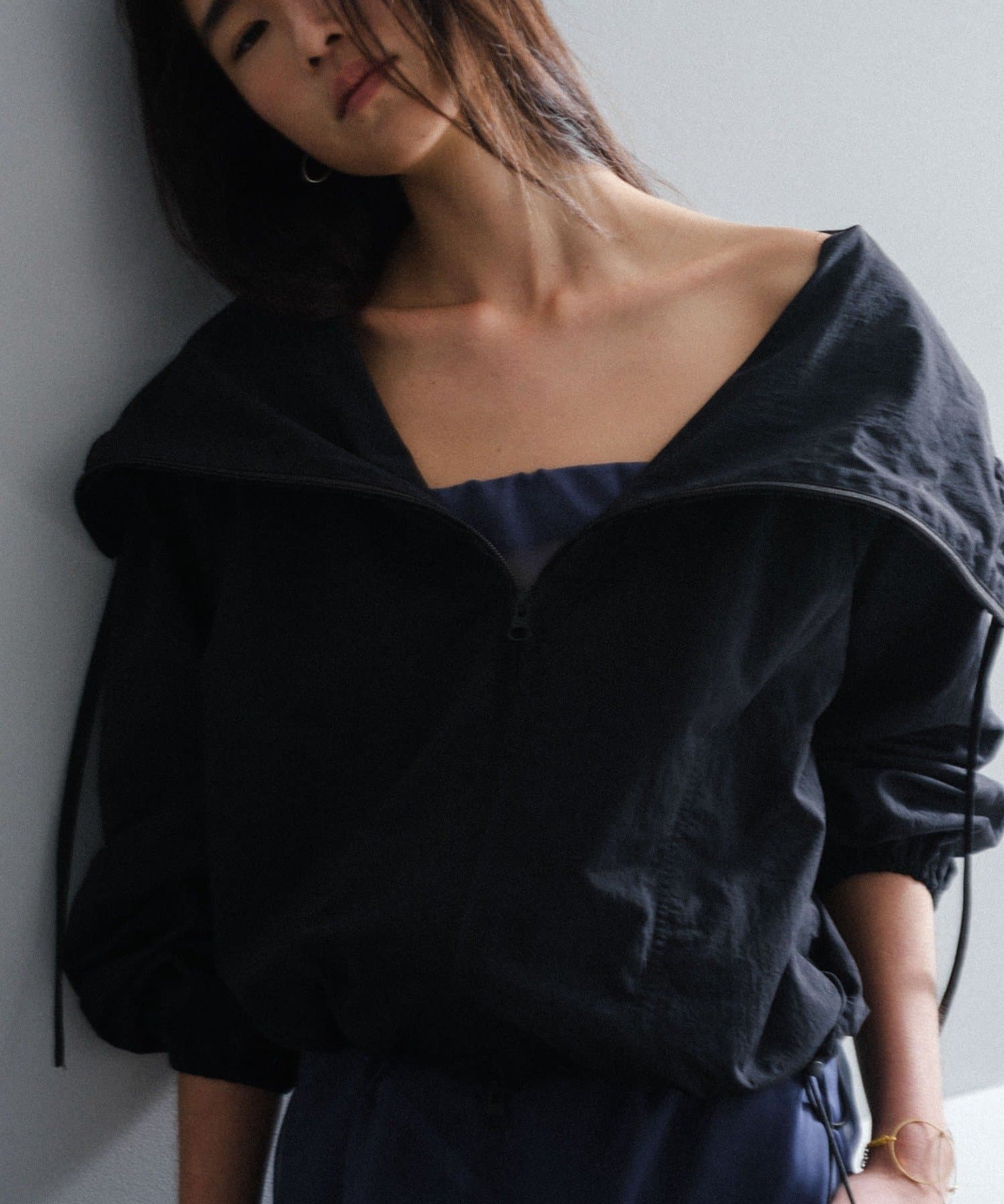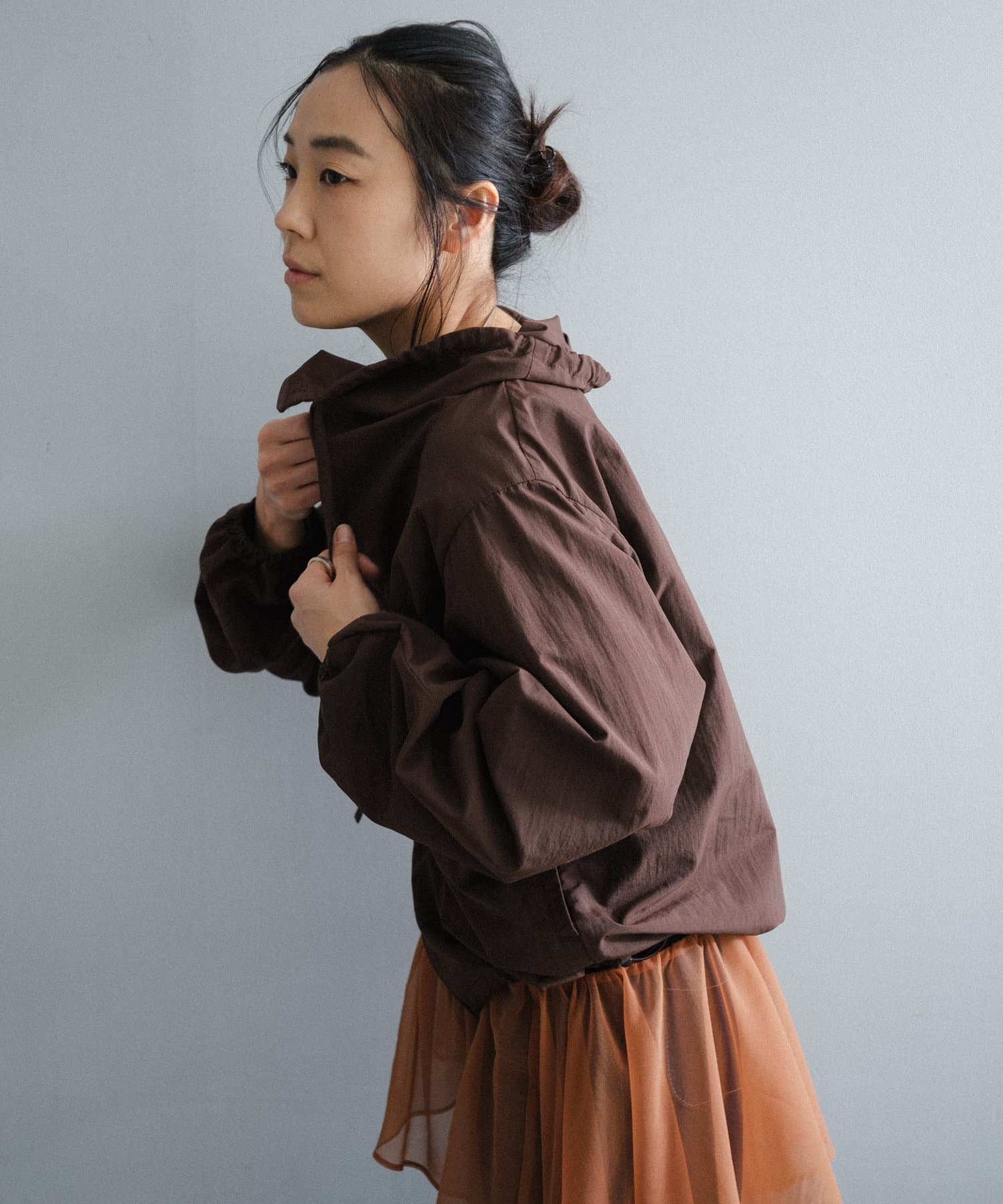 生地は、リサイクル素材特有のナチュラルでドライタッチな風合いの平織り生地で(ピカピカしてない)ナイロンパーカーながら、スポーティになり過ぎないのが嬉しいポイント。日常使いにもバランスよく取り入れていただきやすい一着です。