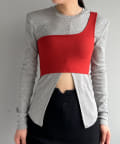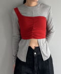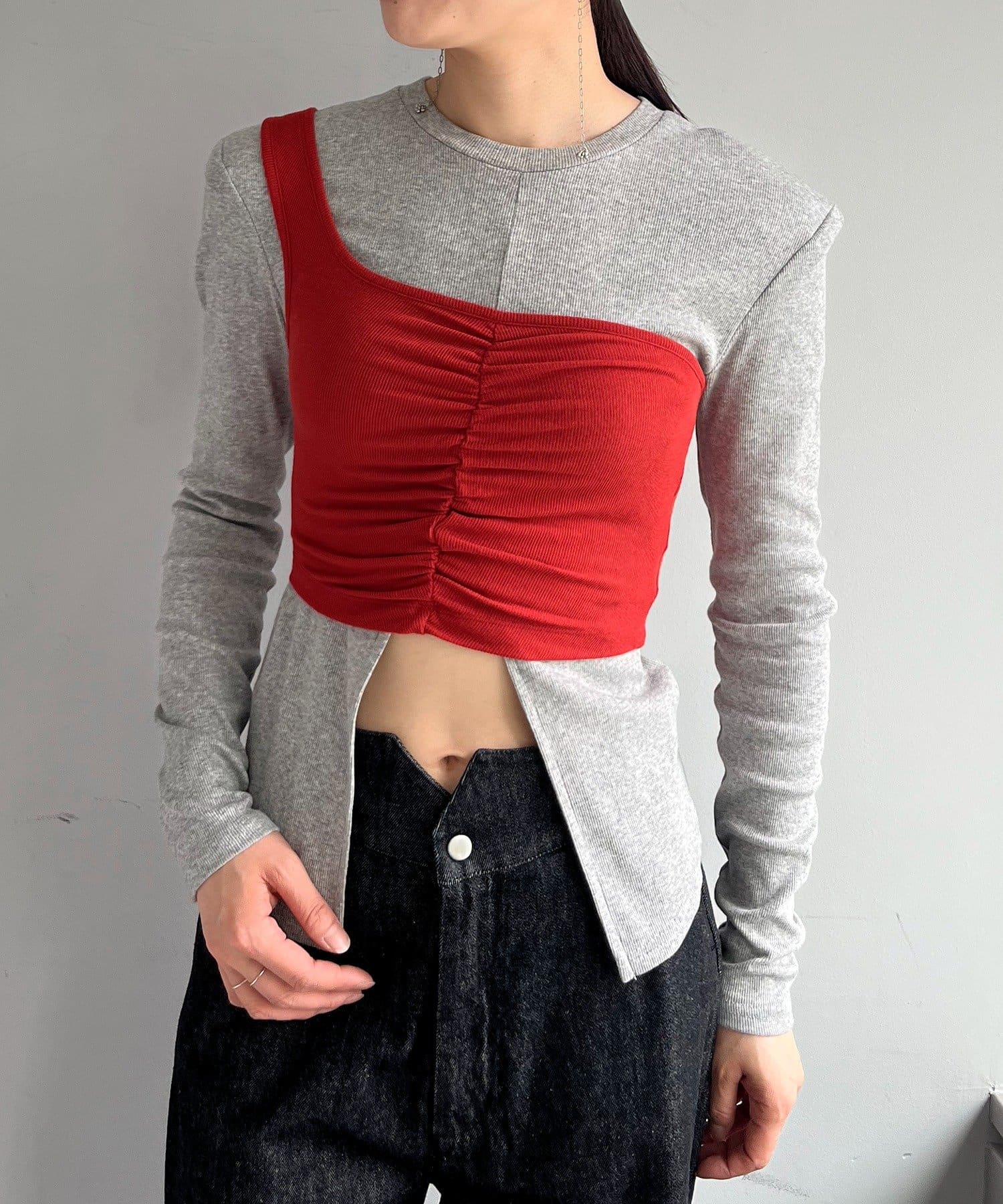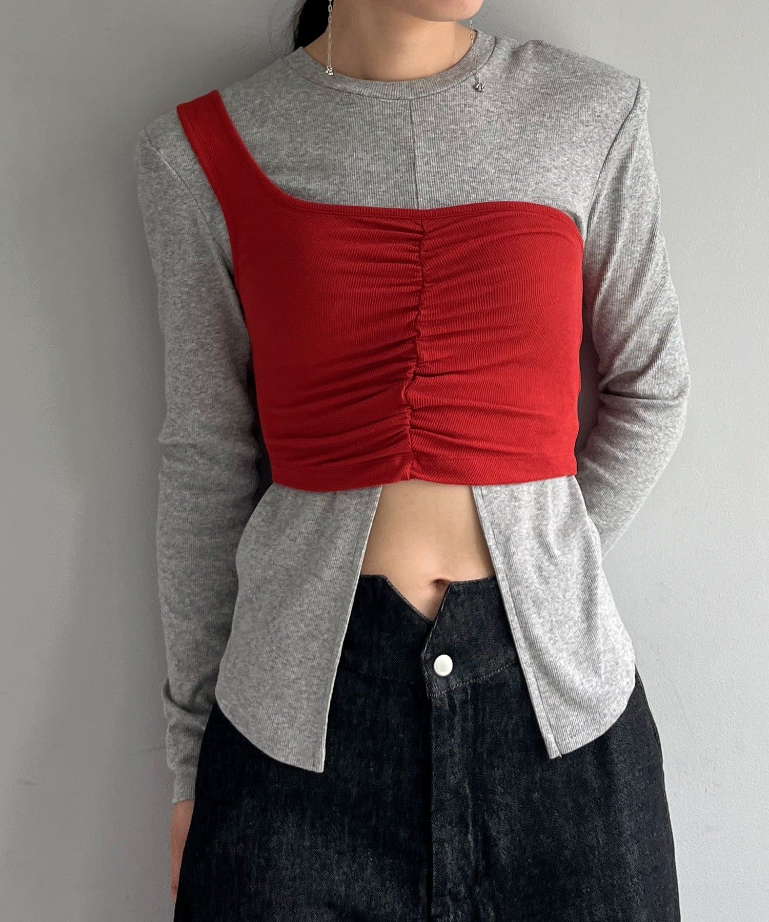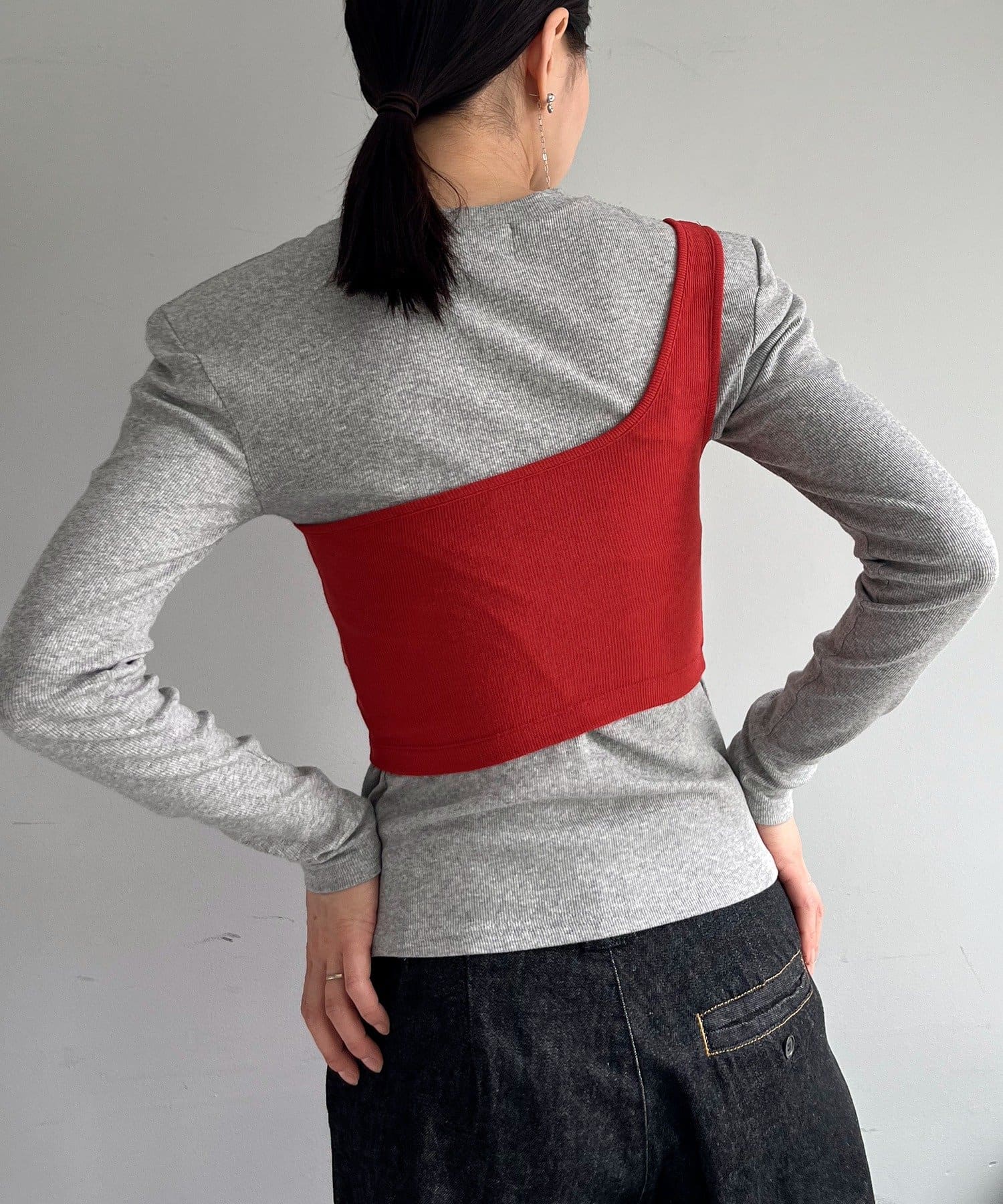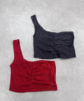 今年の夏は、Tシャツの上にオーバータンクやブラトップを重ねて着用するレイヤリングスタイルを提案します。やや透け感のあるリブ組織のカットソー生地で仕立てた、ワンショルダー型のビスチェ。中心部分にシャーリングを入れており、くしゅくしゅと胸元にギャザーが寄った立体感のあるデザインです。