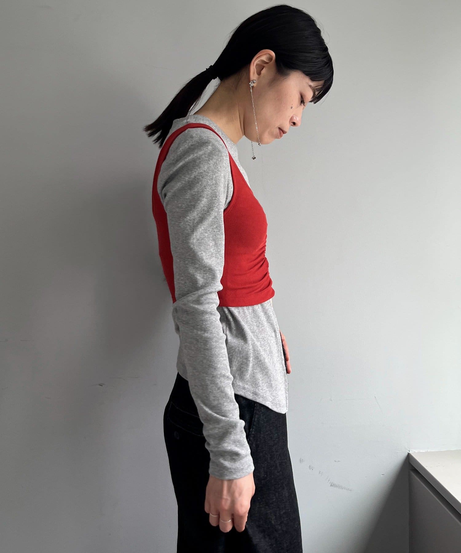 Tシャツはもちろん、シャツの上にビスチェのように重ねると、メリハリのあるシルエットを作れて素敵です。シャーリングの入っている面とフラットな背面、両面使いが可能です。