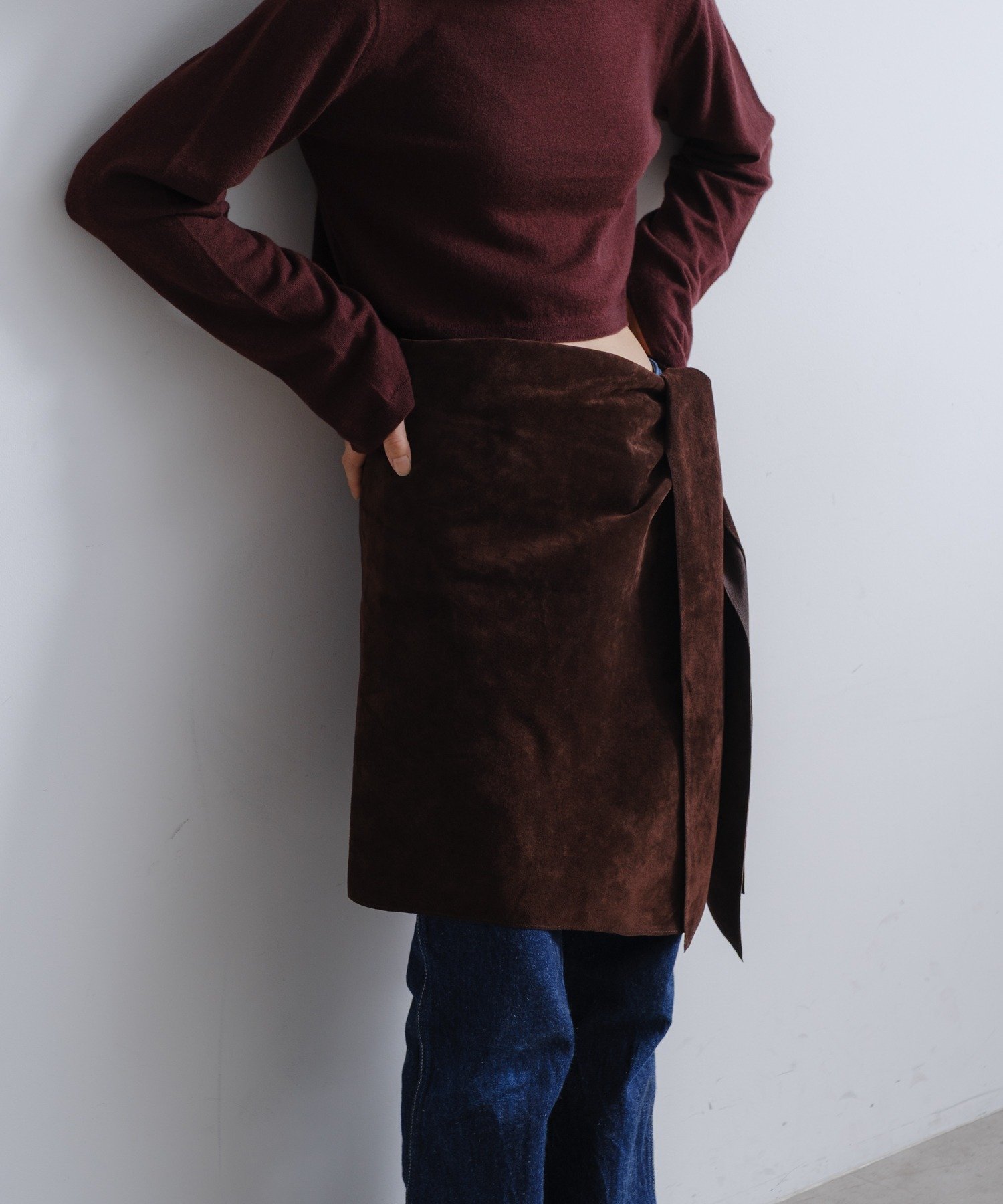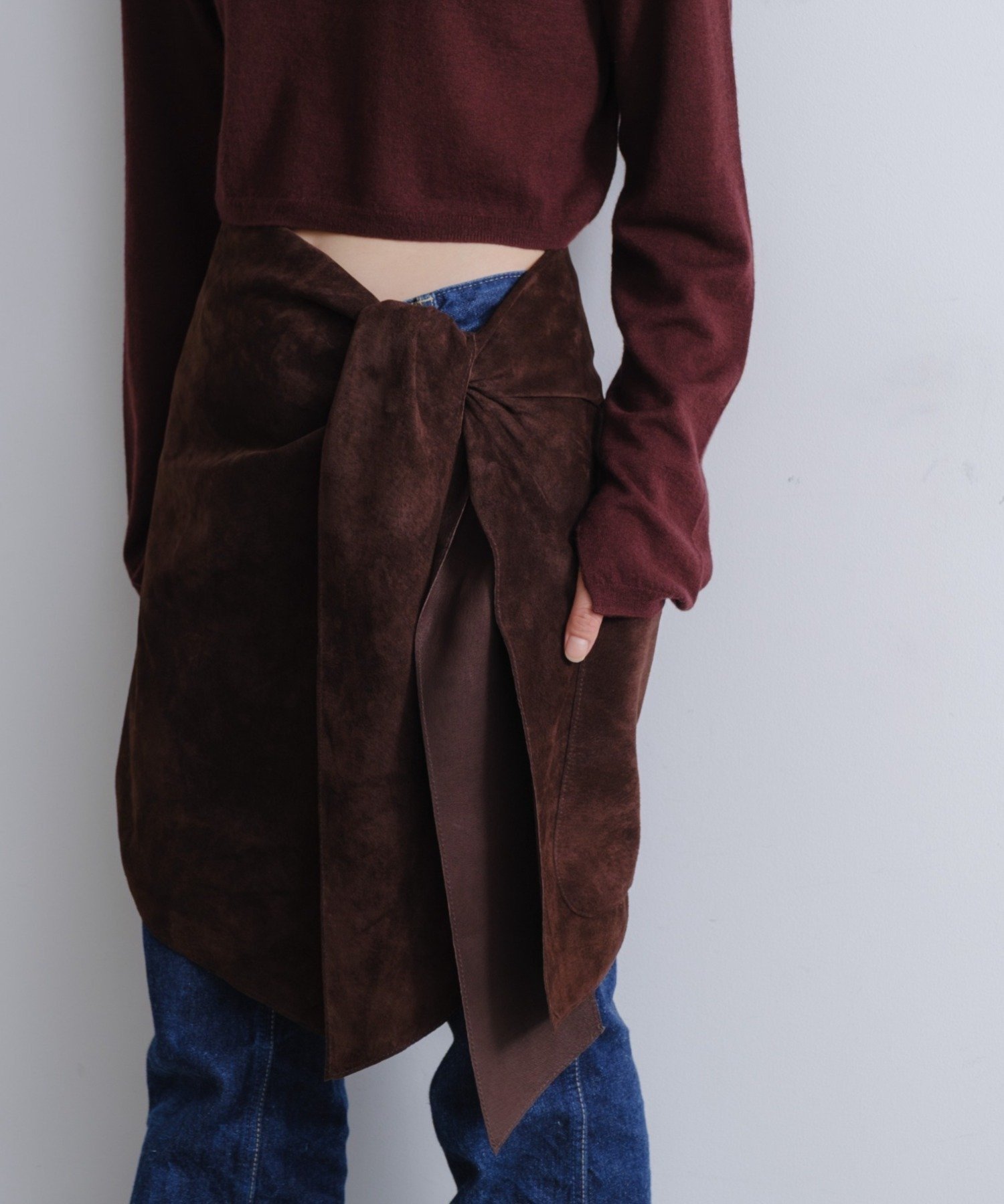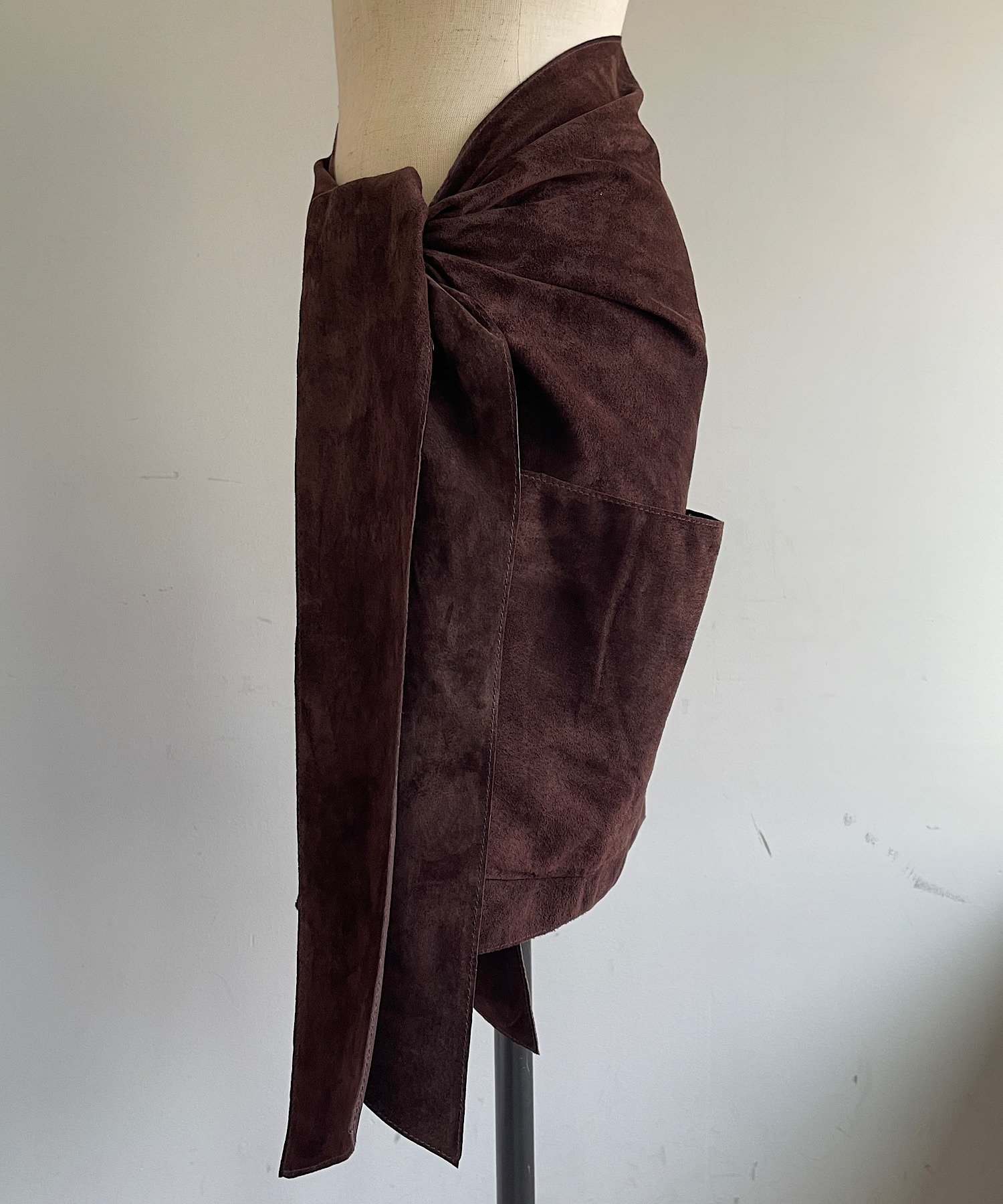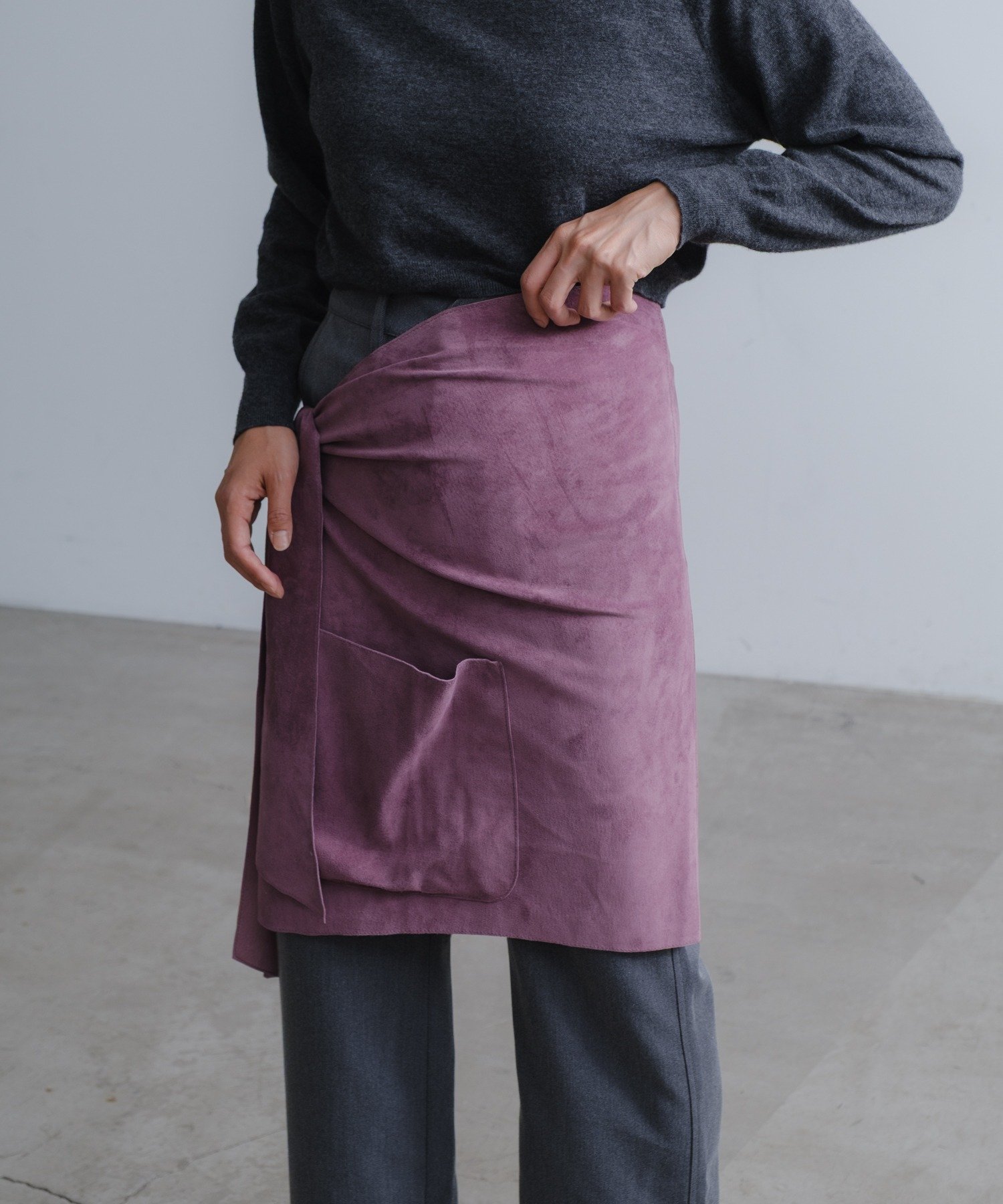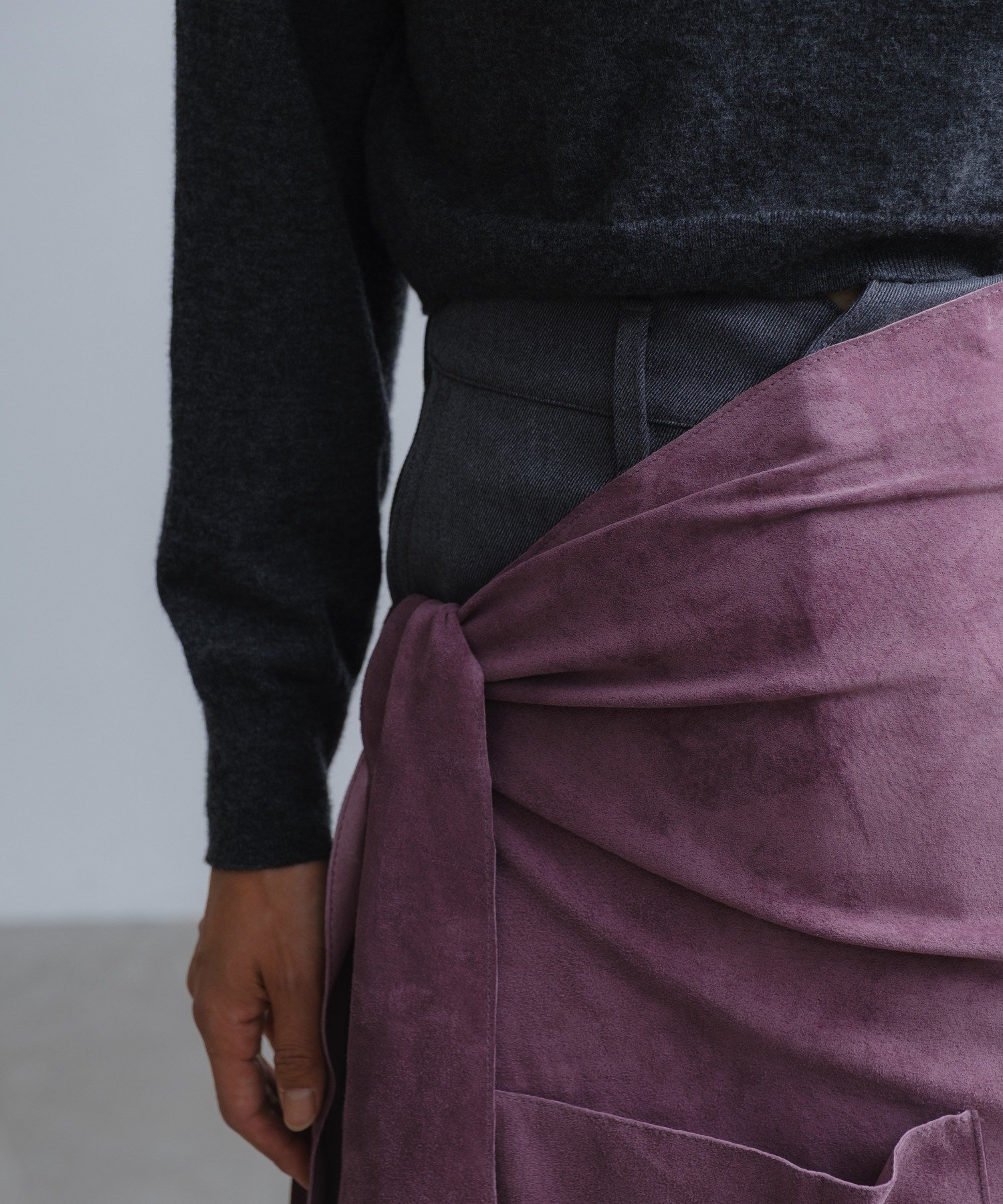 巻くだけで秋の気分をプラスできる、リアルスウェードのラップスカートが出来ました。ミドル丈のスカートに、太幅のリボンを付けたようなユニークなデザイン。緩く間口が垂れたドレープポケットを付けており、スウェードシャツを腰に巻いているようなイメージで着用いただけます。