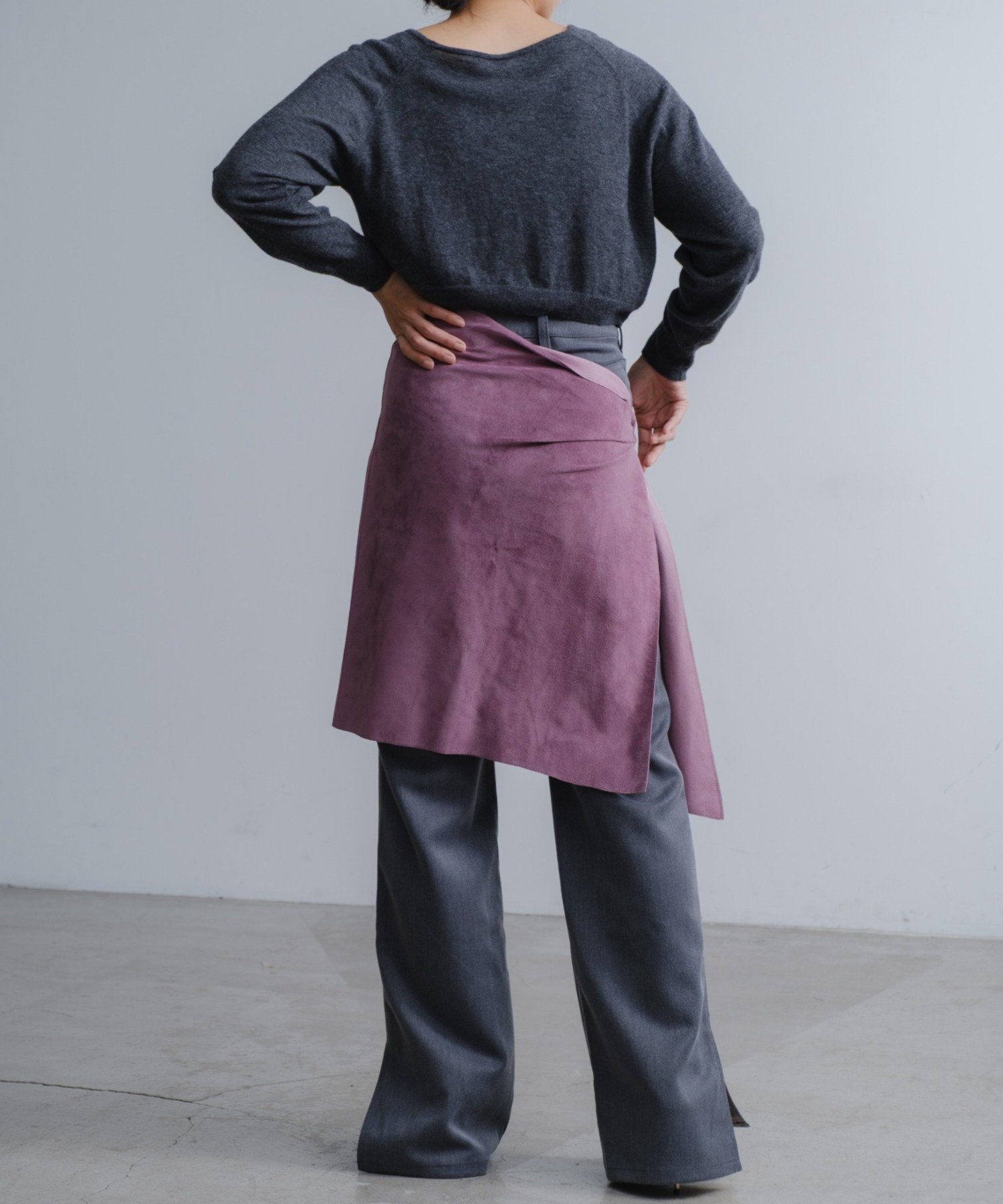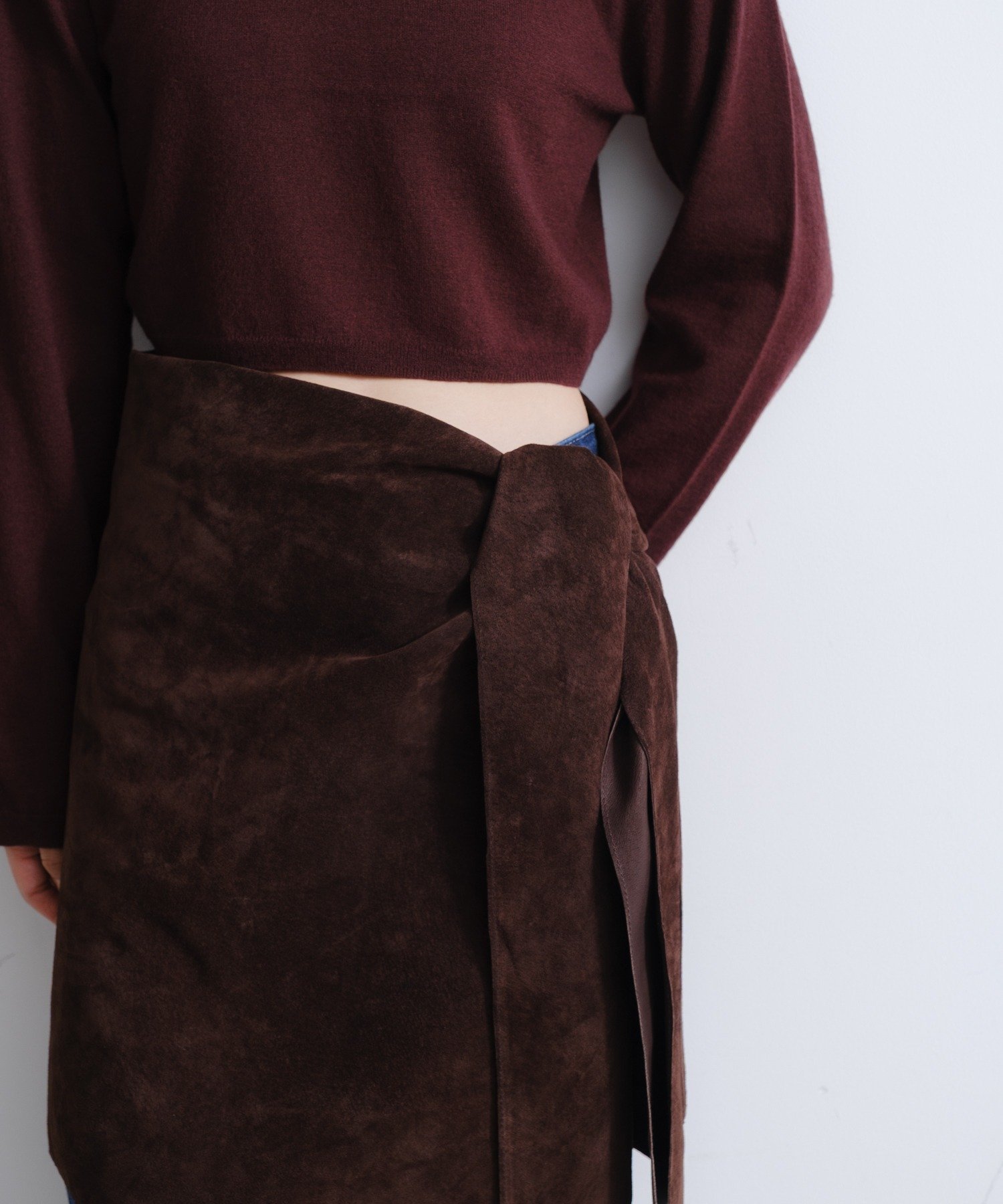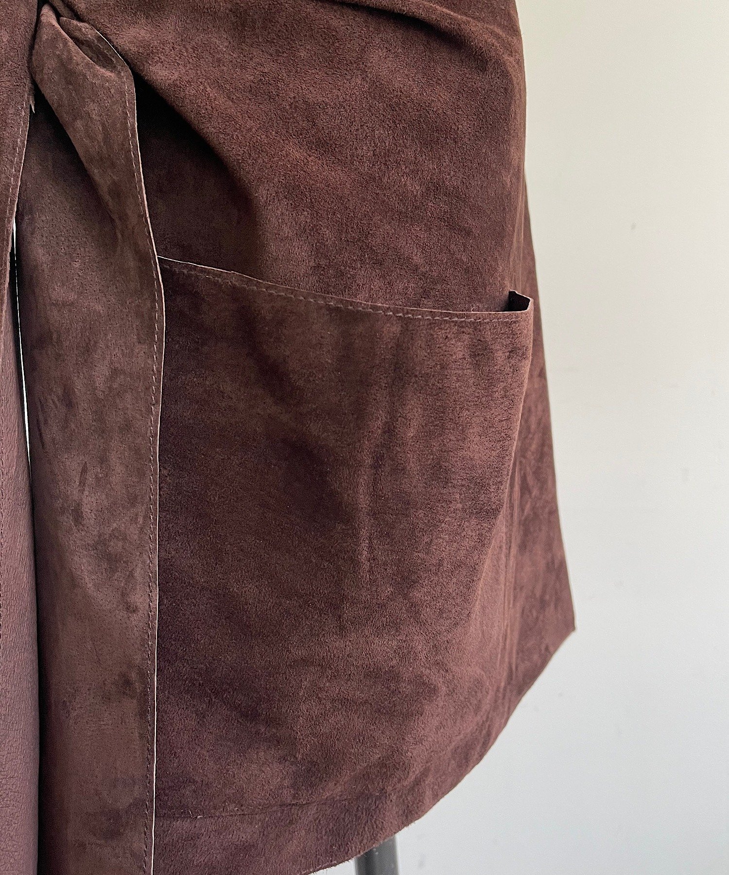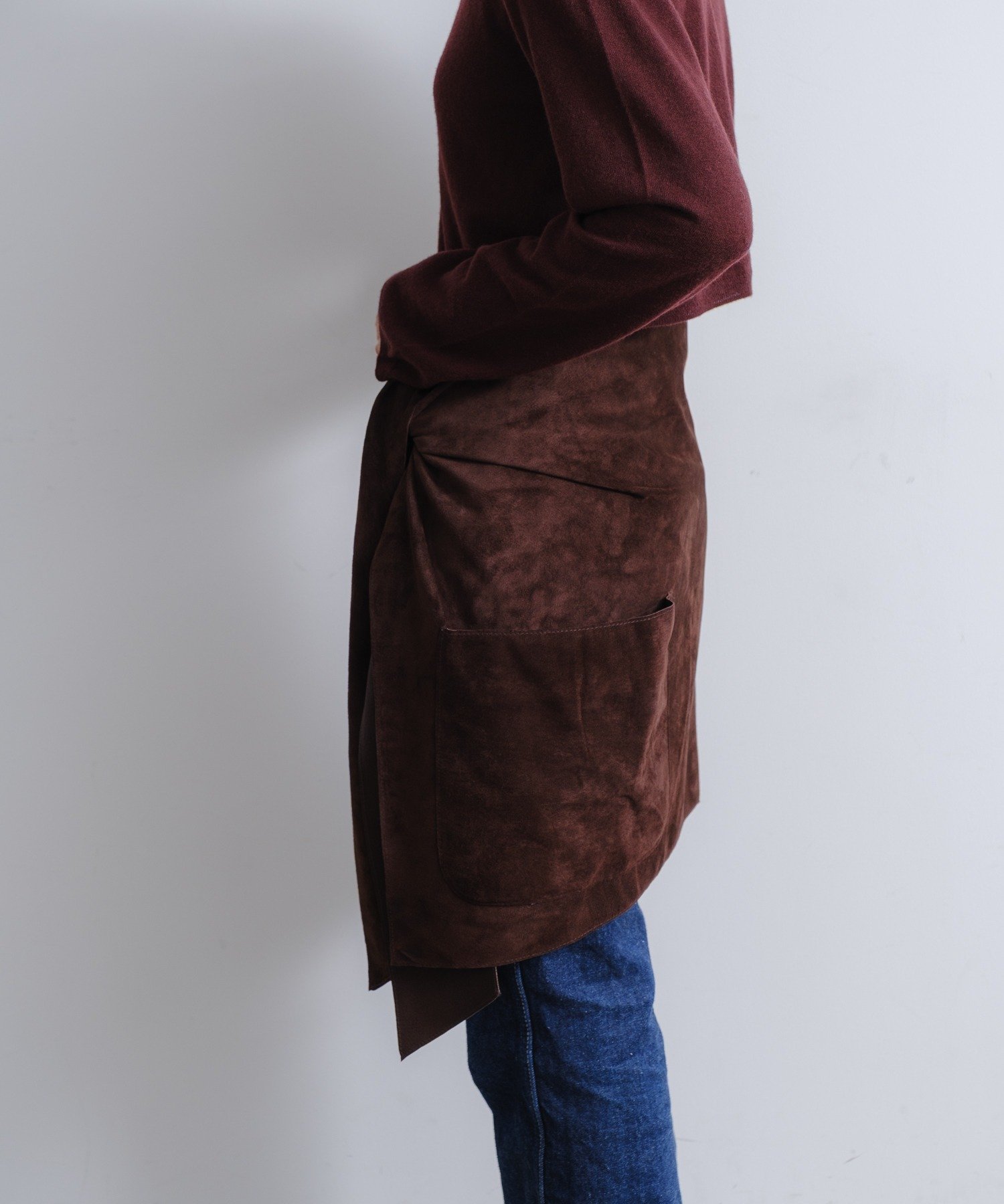 巻くだけで秋の気分をプラスできる、リアルスウェードのラップスカートが出来ました。ミドル丈のスカートに、太幅のリボンを付けたようなユニークなデザイン。緩く間口が垂れたドレープポケットを付けており、スウェードシャツを腰に巻いているようなイメージで着用いただけます。