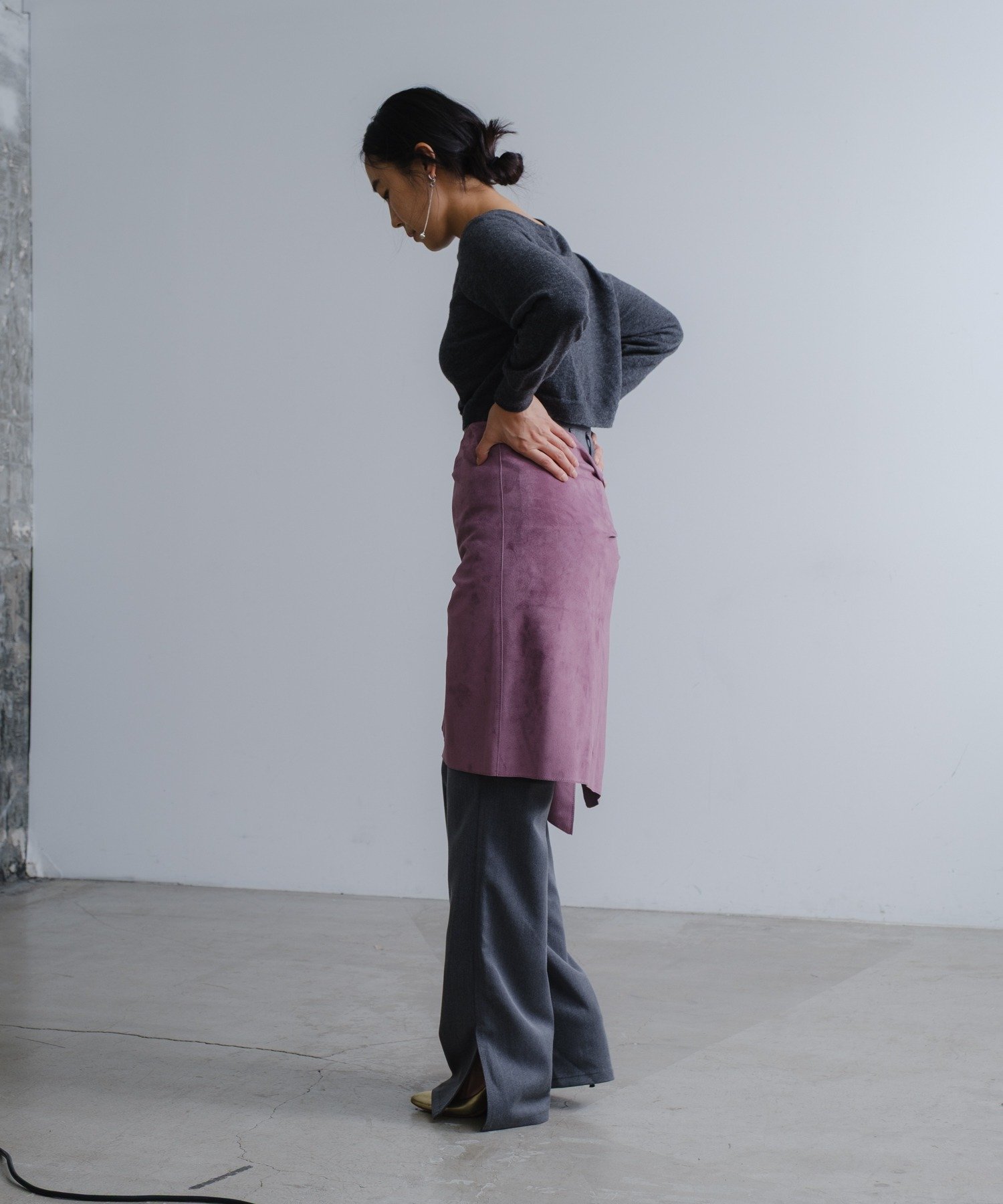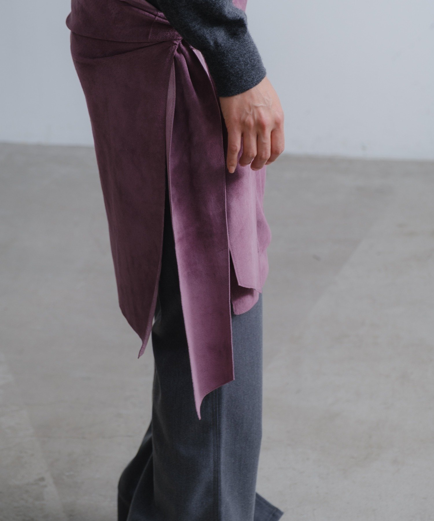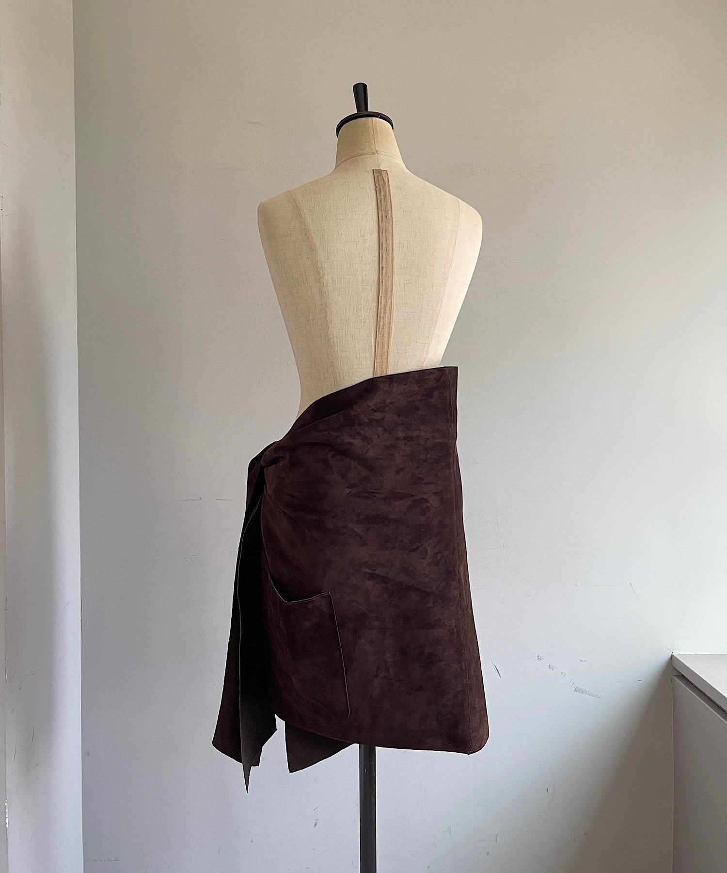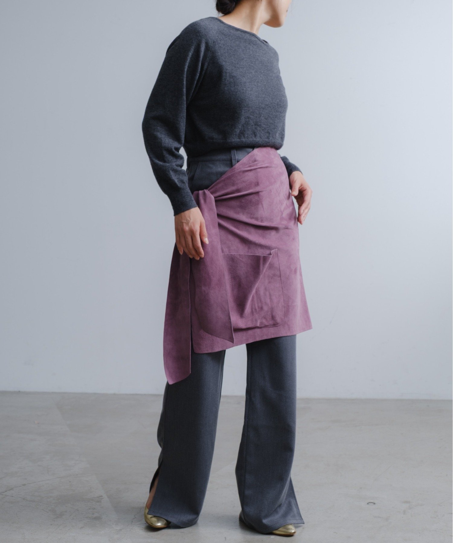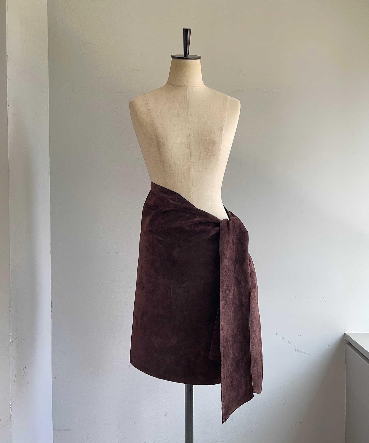 巻くだけで秋の気分をプラスできる、リアルスウェードのラップスカートが出来ました。ミドル丈のスカートに、太幅のリボンを付けたようなユニークなデザイン。緩く間口が垂れたドレープポケットを付けており、スウェードシャツを腰に巻いているようなイメージで着用いただけます。