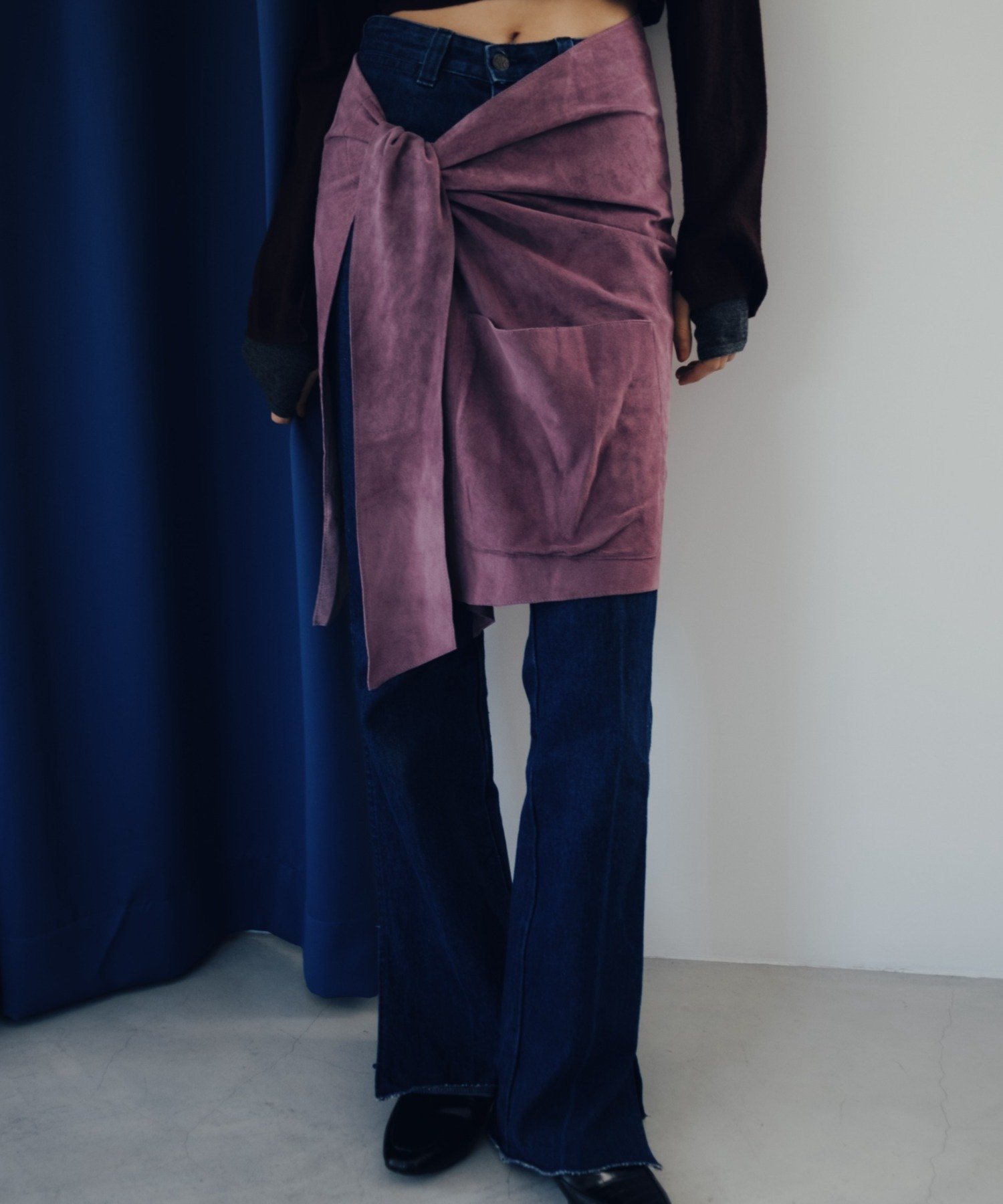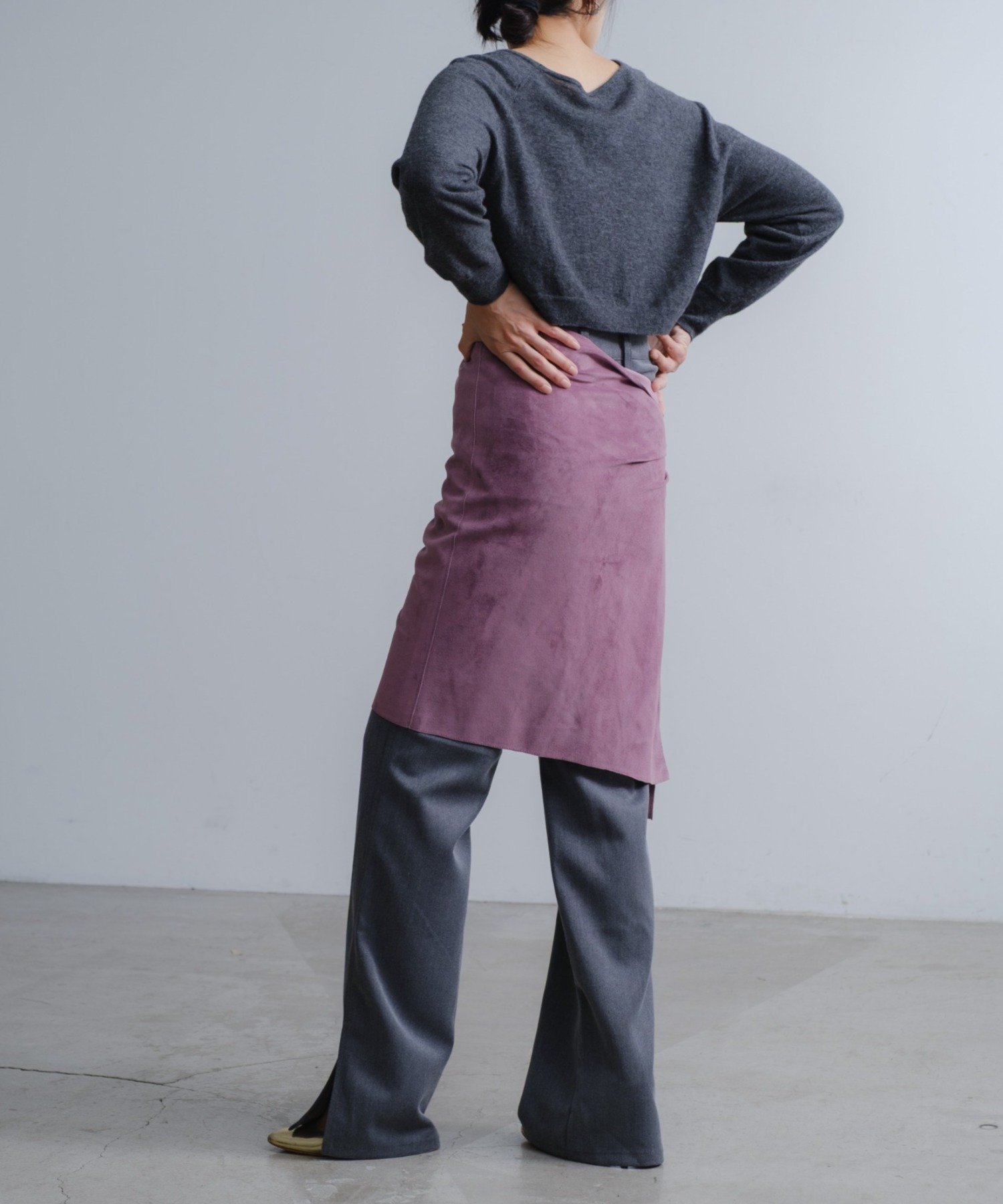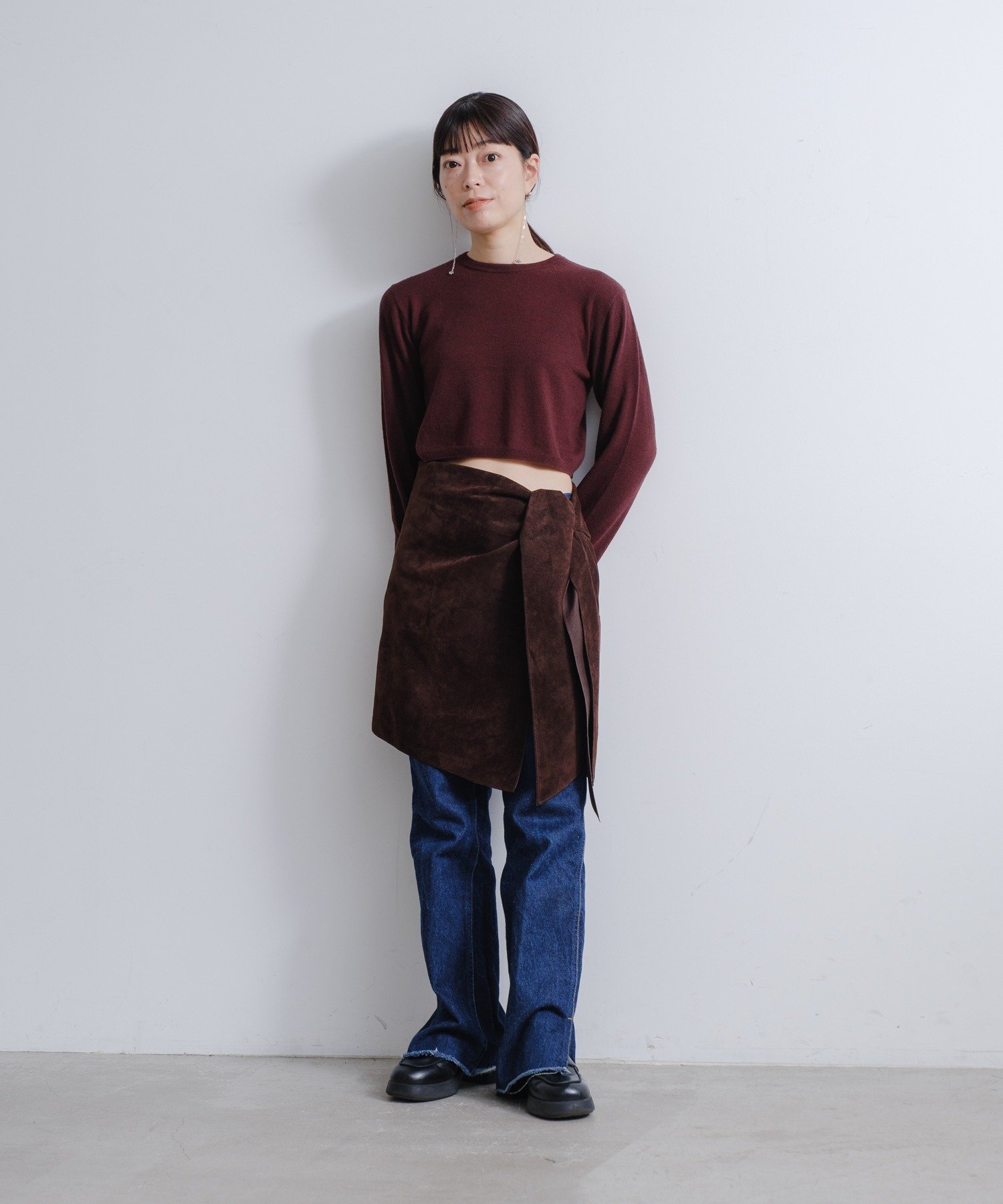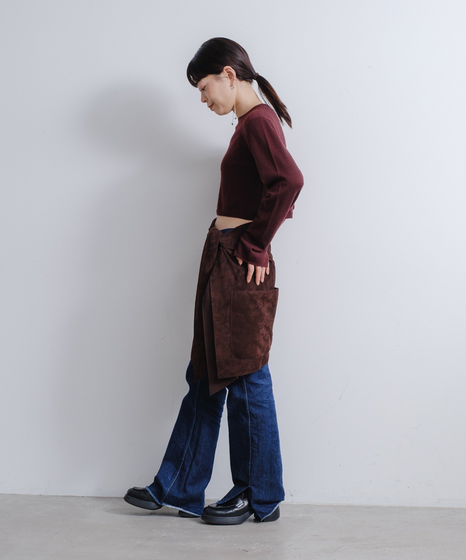巻くだけで秋の気分をプラスできる、リアルスウェードのラップスカートが出来ました。ミドル丈のスカートに、太幅のリボンを付けたようなユニークなデザイン。緩く間口が垂れたドレープポケットを付けており、スウェードシャツを腰に巻いているようなイメージで着用いただけます。