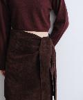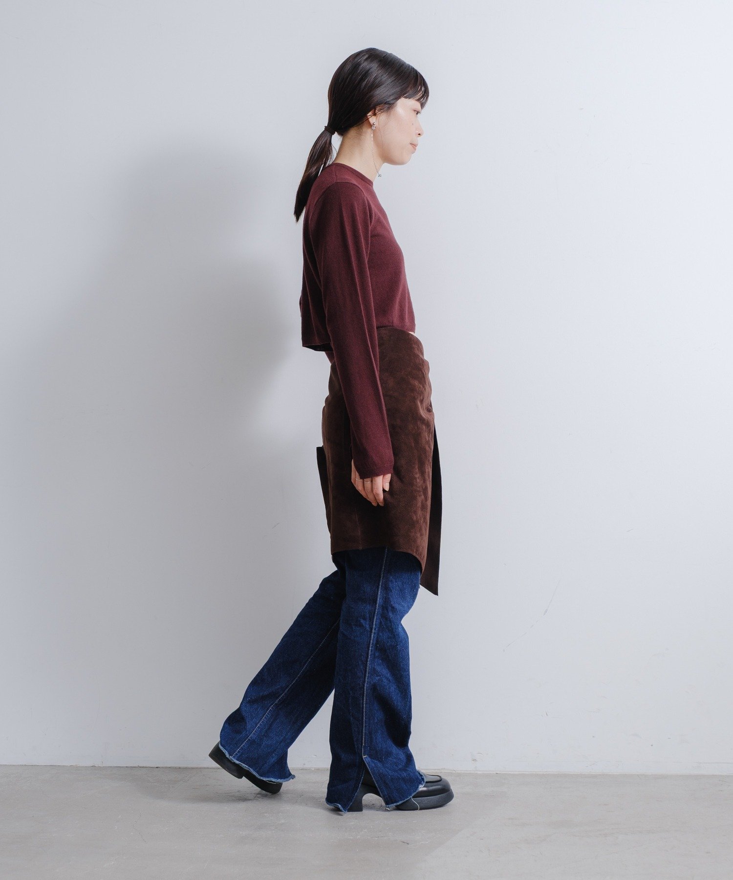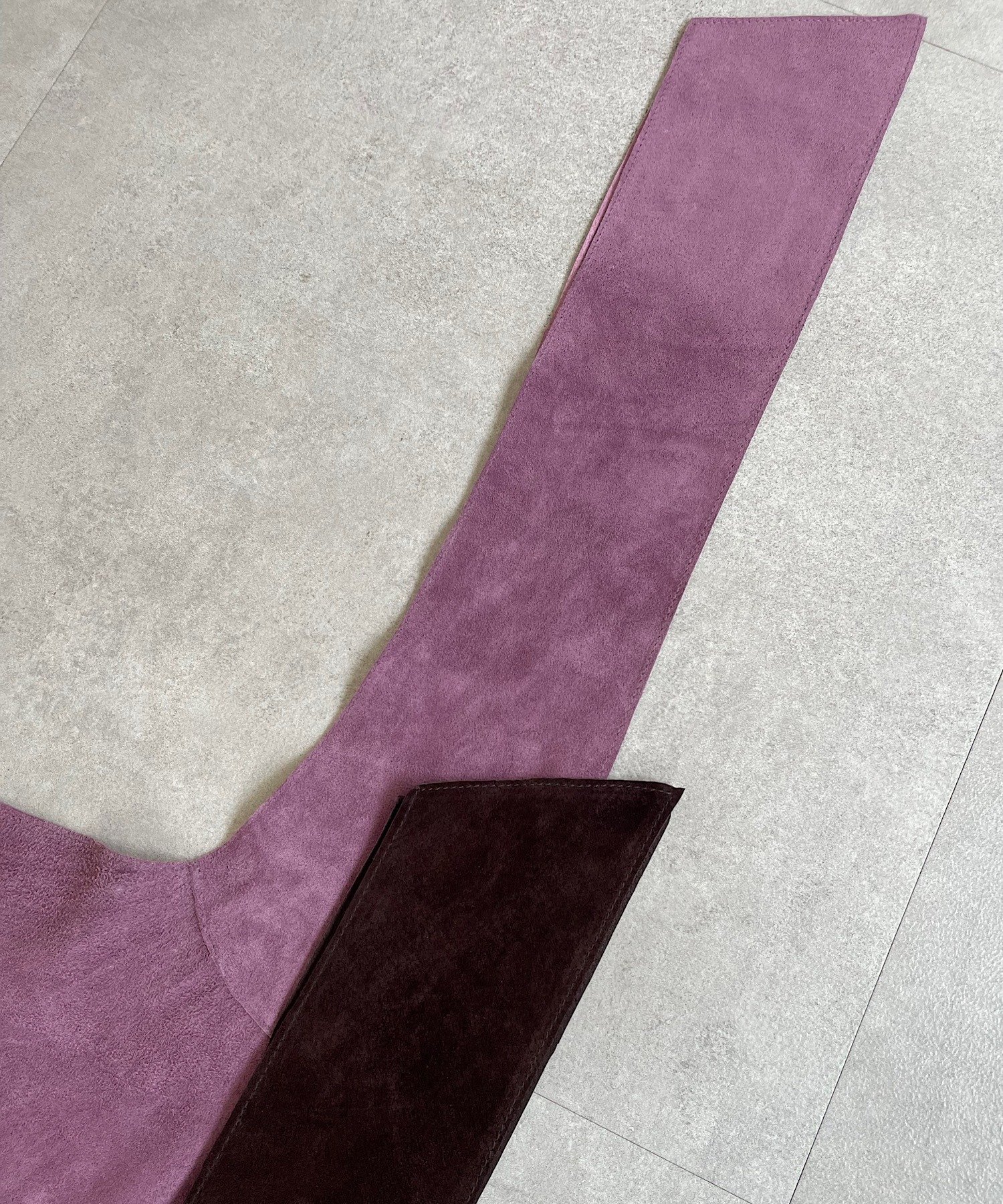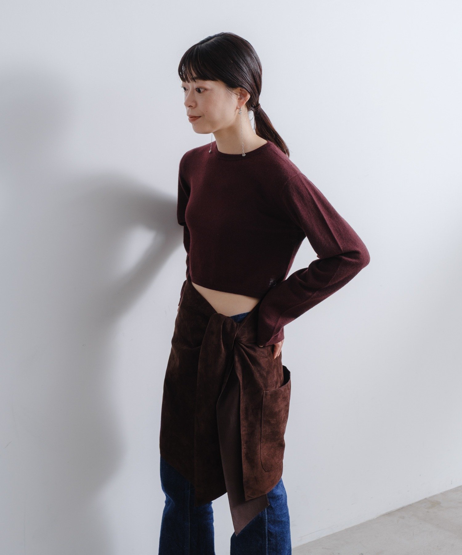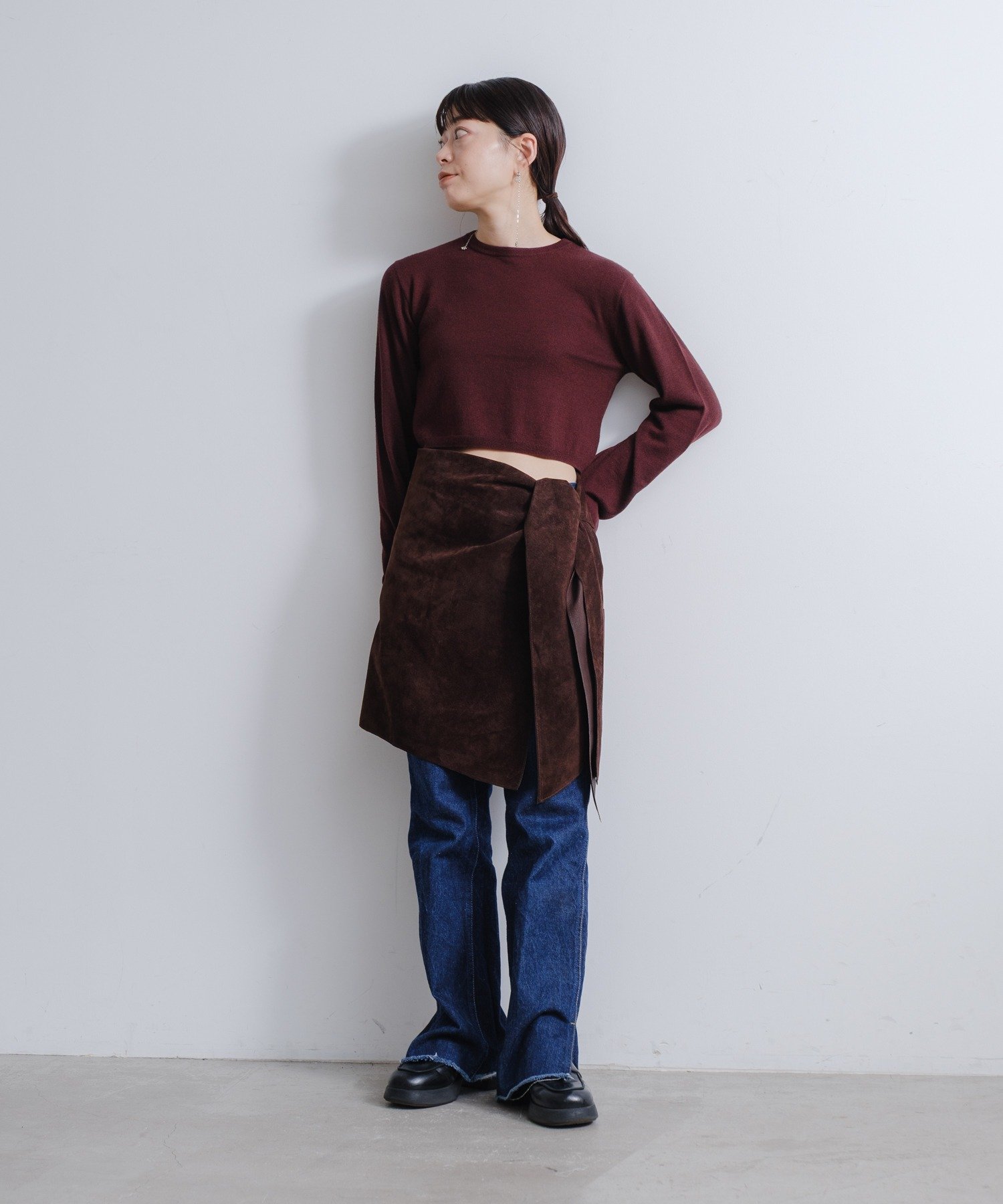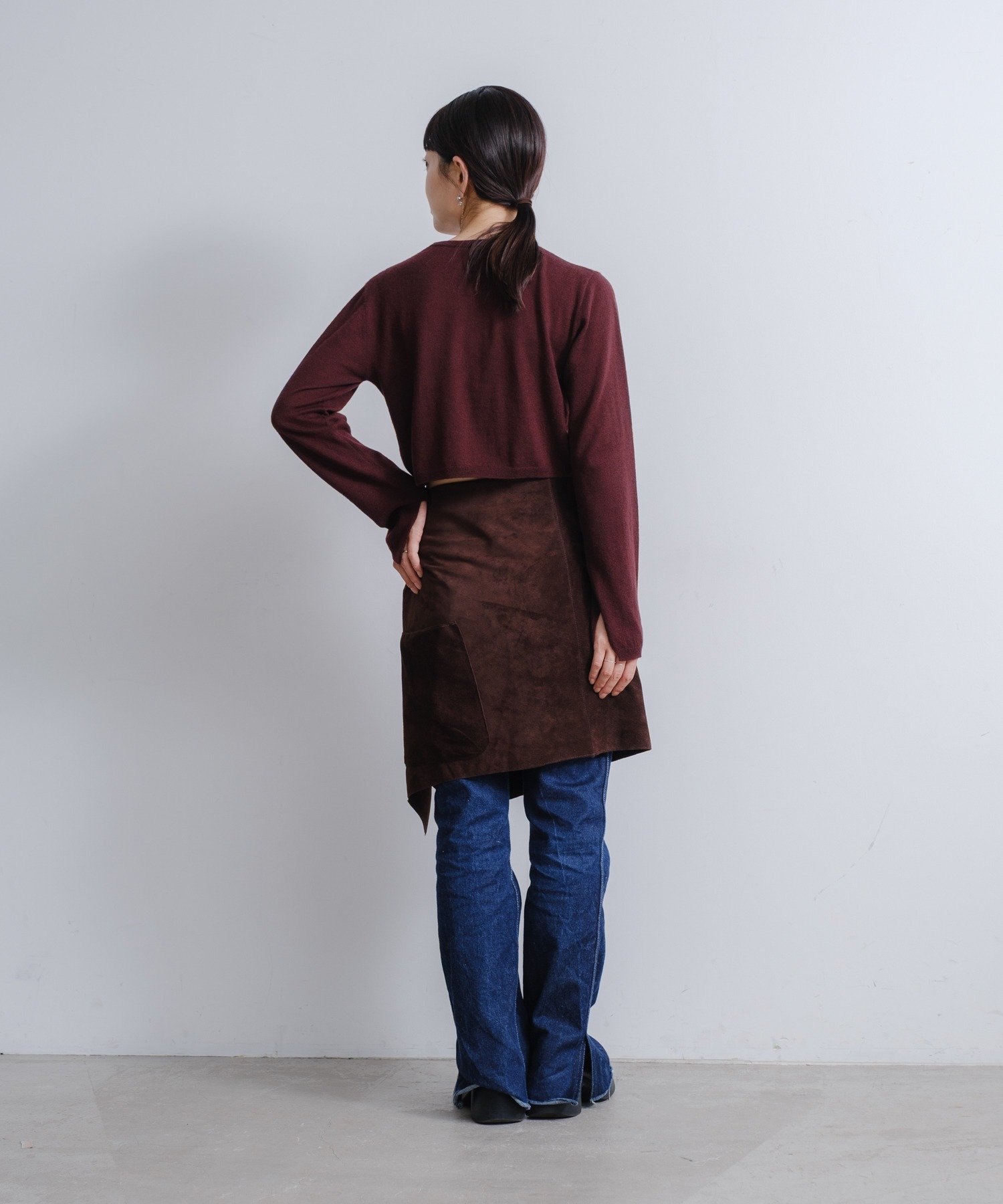 巻くだけで秋の気分をプラスできる、リアルスウェードのラップスカートが出来ました。ミドル丈のスカートに、太幅のリボンを付けたようなユニークなデザイン。緩く間口が垂れたドレープポケットを付けており、スウェードシャツを腰に巻いているようなイメージで着用いただけます。