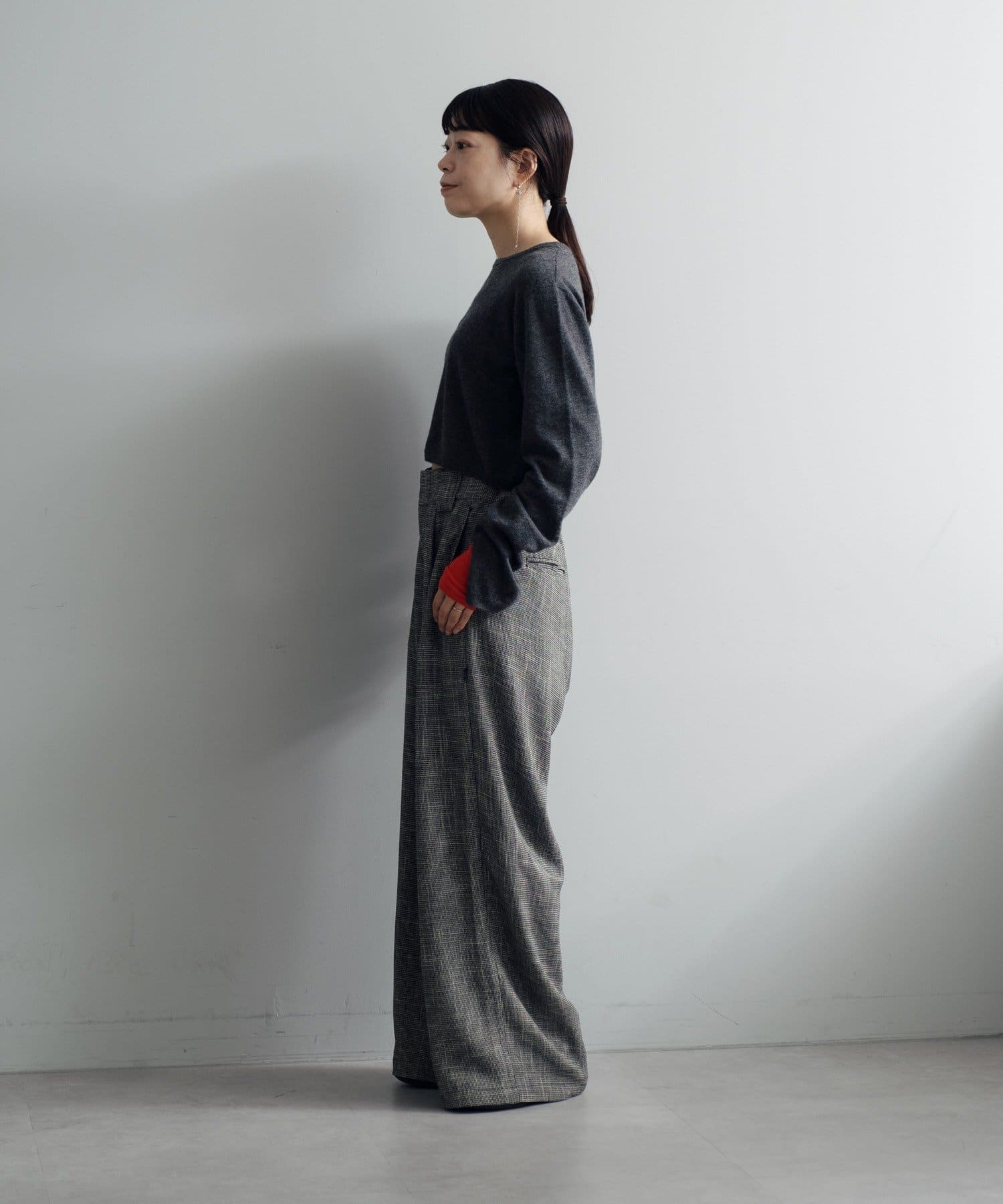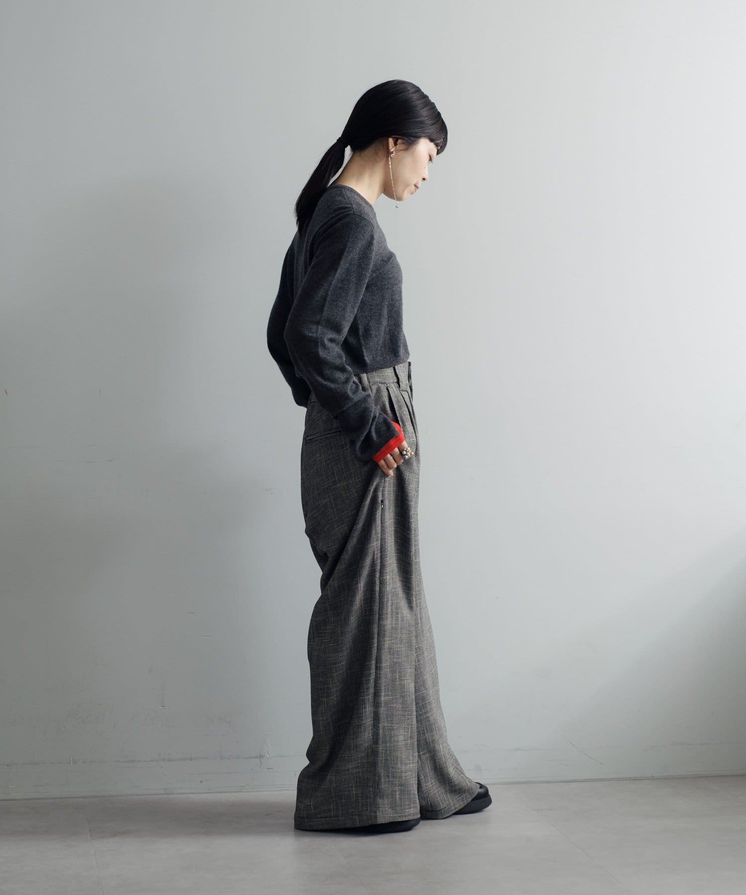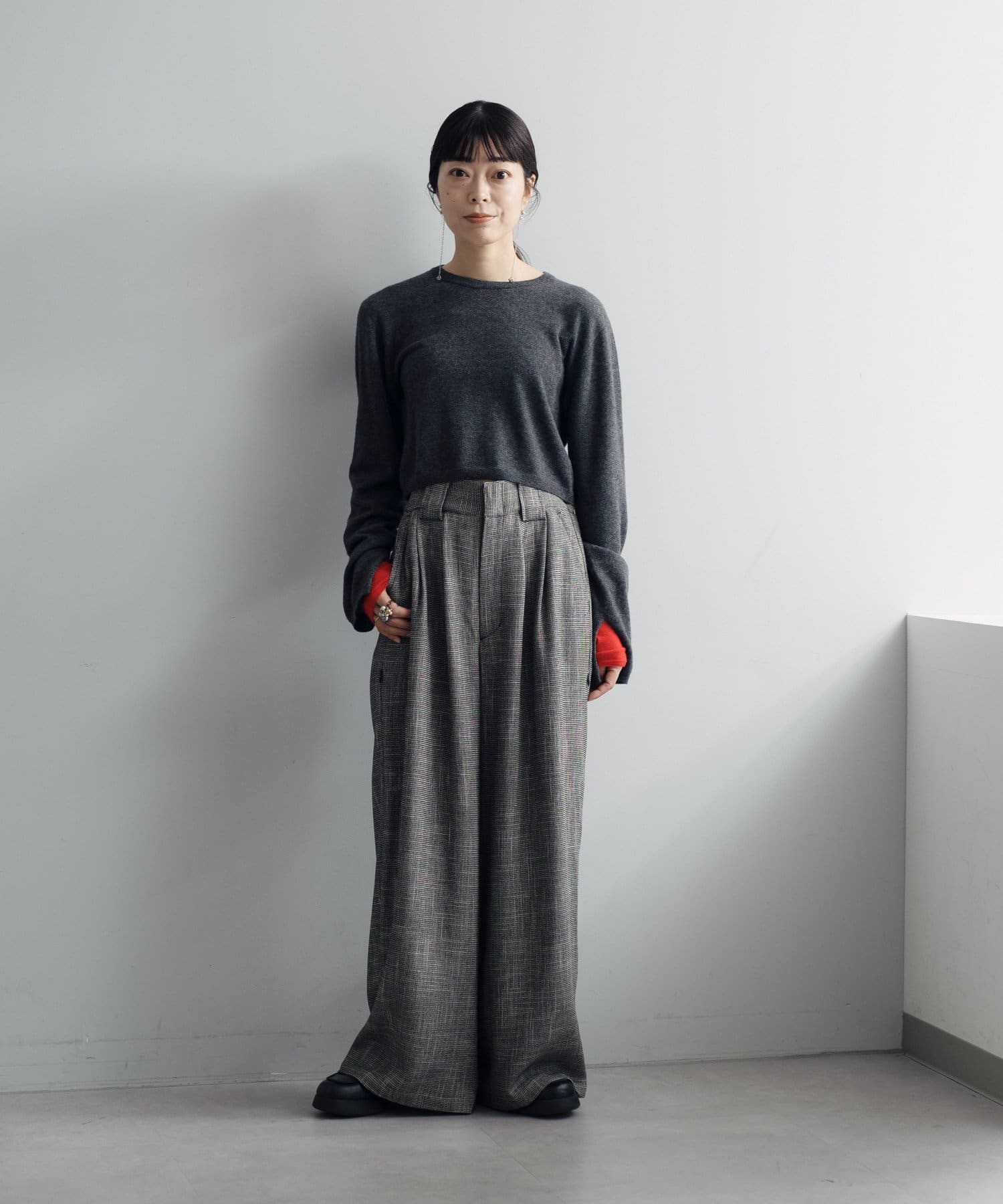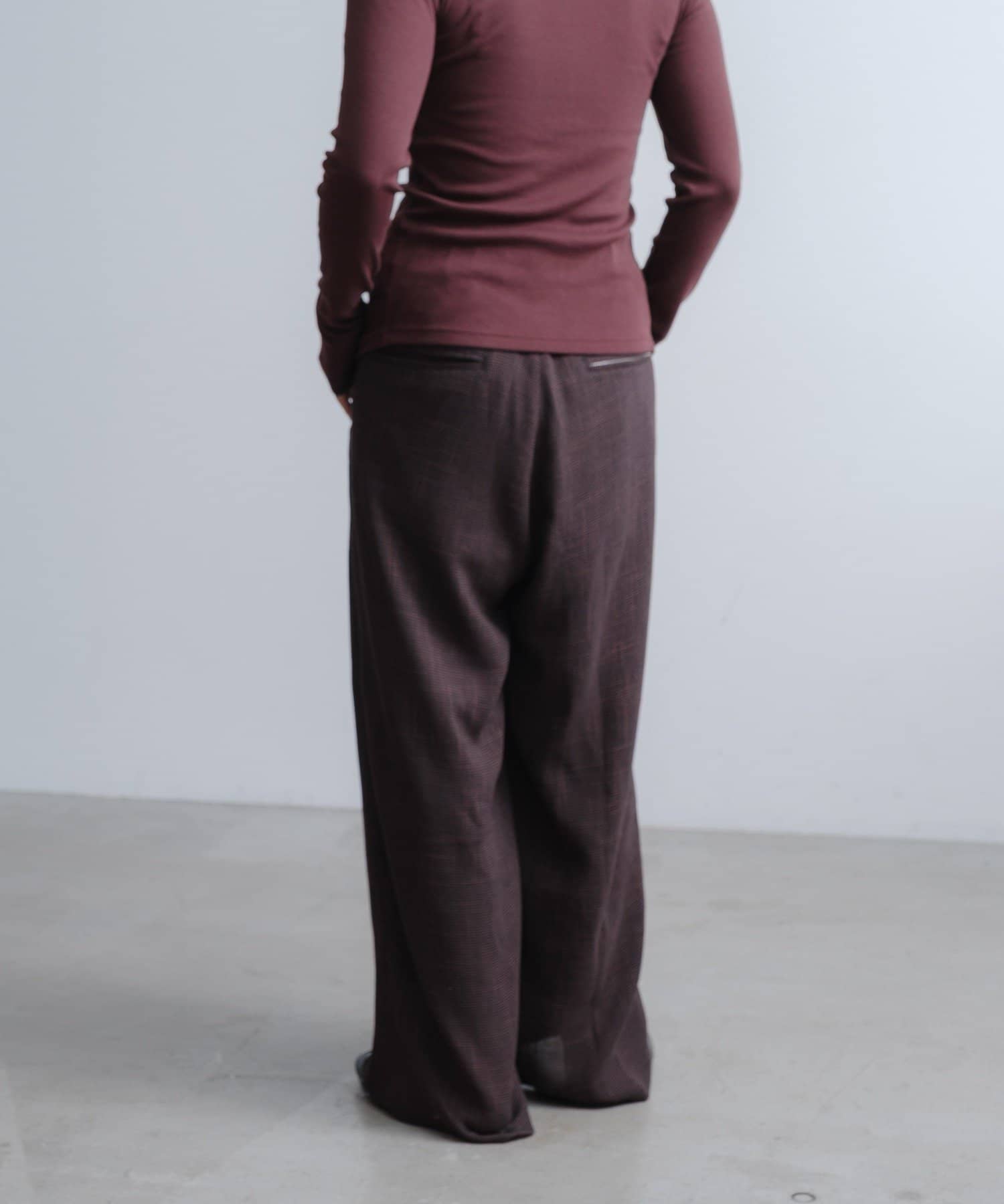使用したのは特殊加工を施したスラブ糸を使用した、カラミ織りの美しいジャガード生地。その軽やかさと落ち感を活かして、Pasteripで人気のワイドシルエット型のパンツに仕立てました。しっかりと太さのあるシルエットながら、野暮ったくなく上品な印象で着られるのはこの生地ならでは。