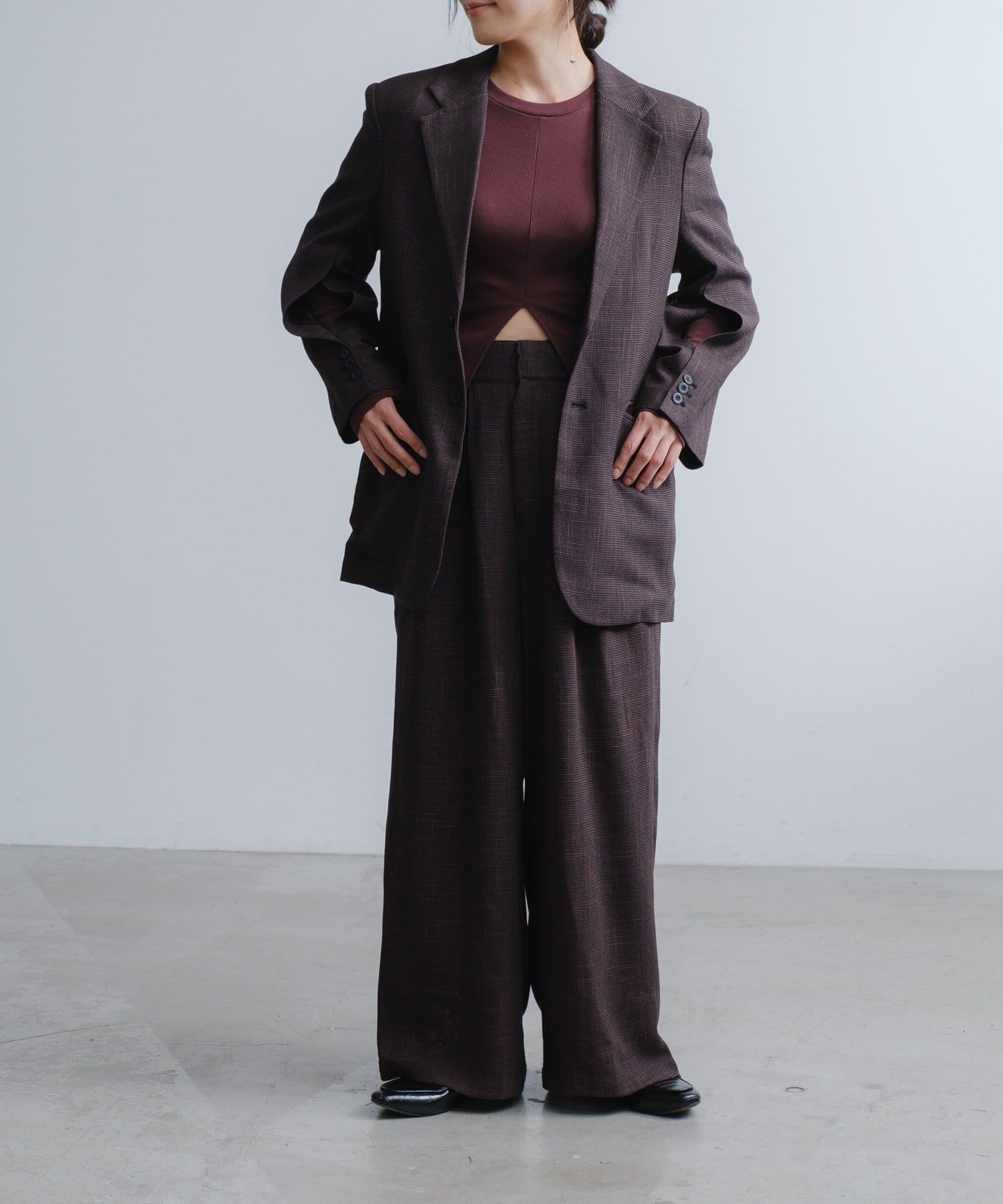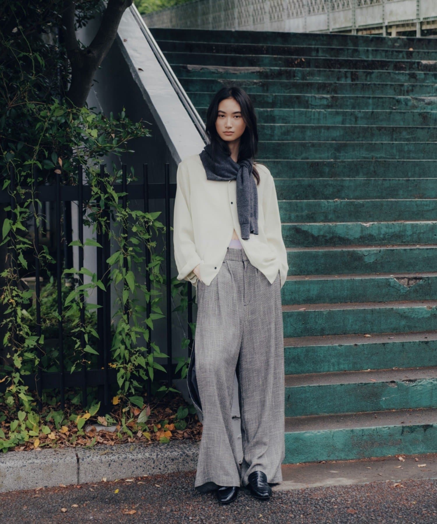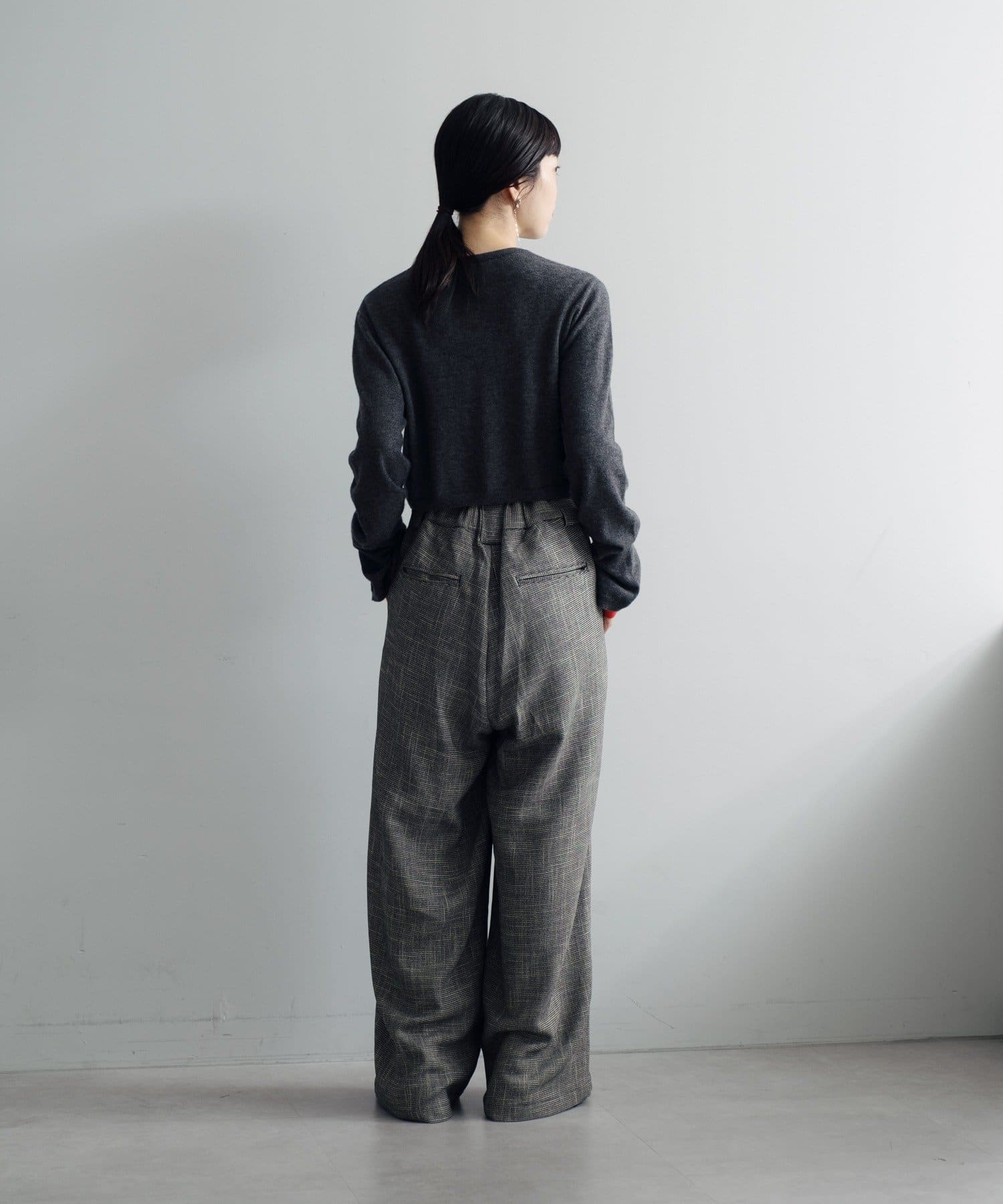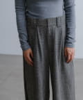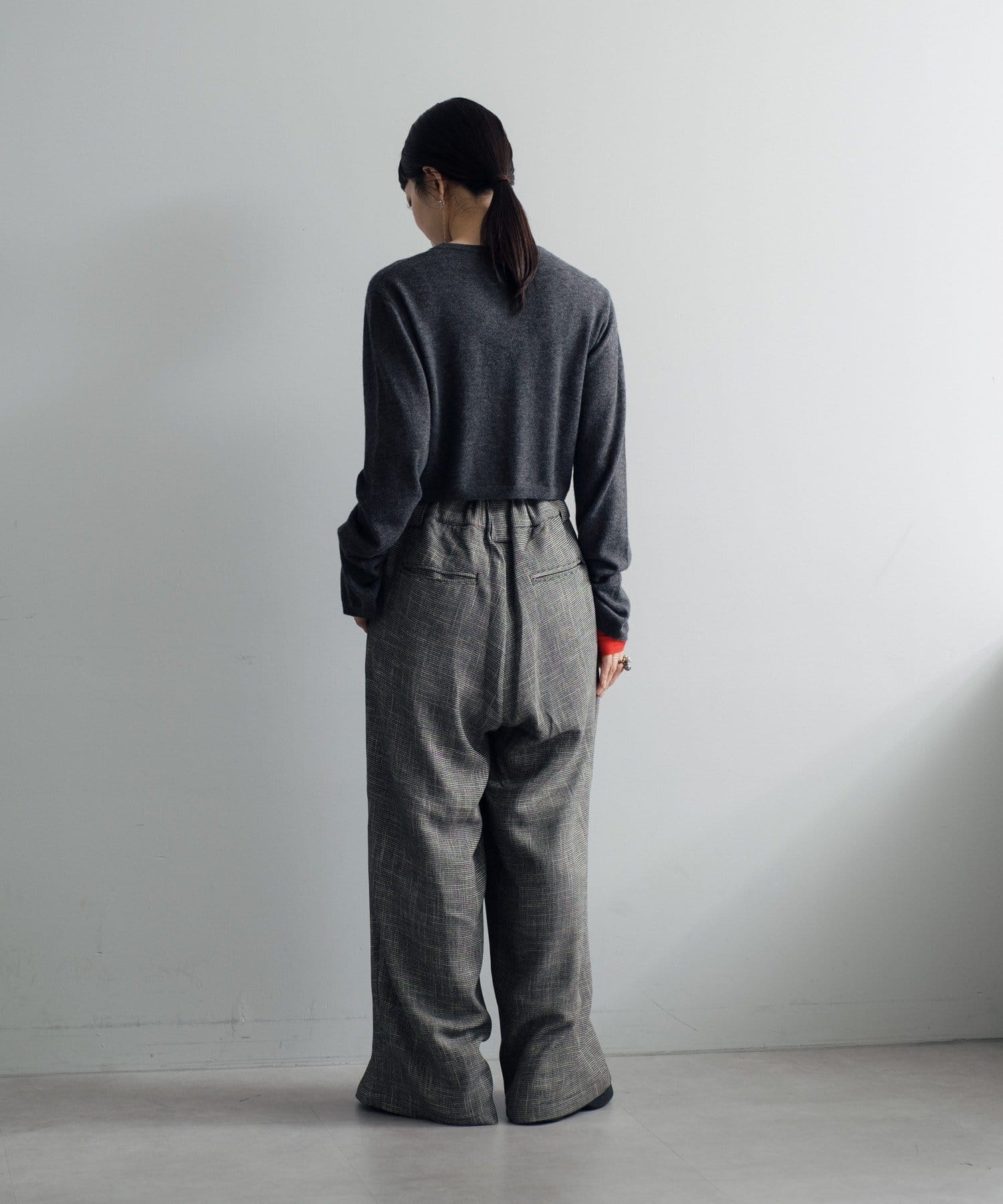 使用したのは特殊加工を施したスラブ糸を使用した、カラミ織りの美しいジャガード生地。その軽やかさと落ち感を活かして、Pasteripで人気のワイドシルエット型のパンツに仕立てました。しっかりと太さのあるシルエットながら、野暮ったくなく上品な印象で着られるのはこの生地ならでは。