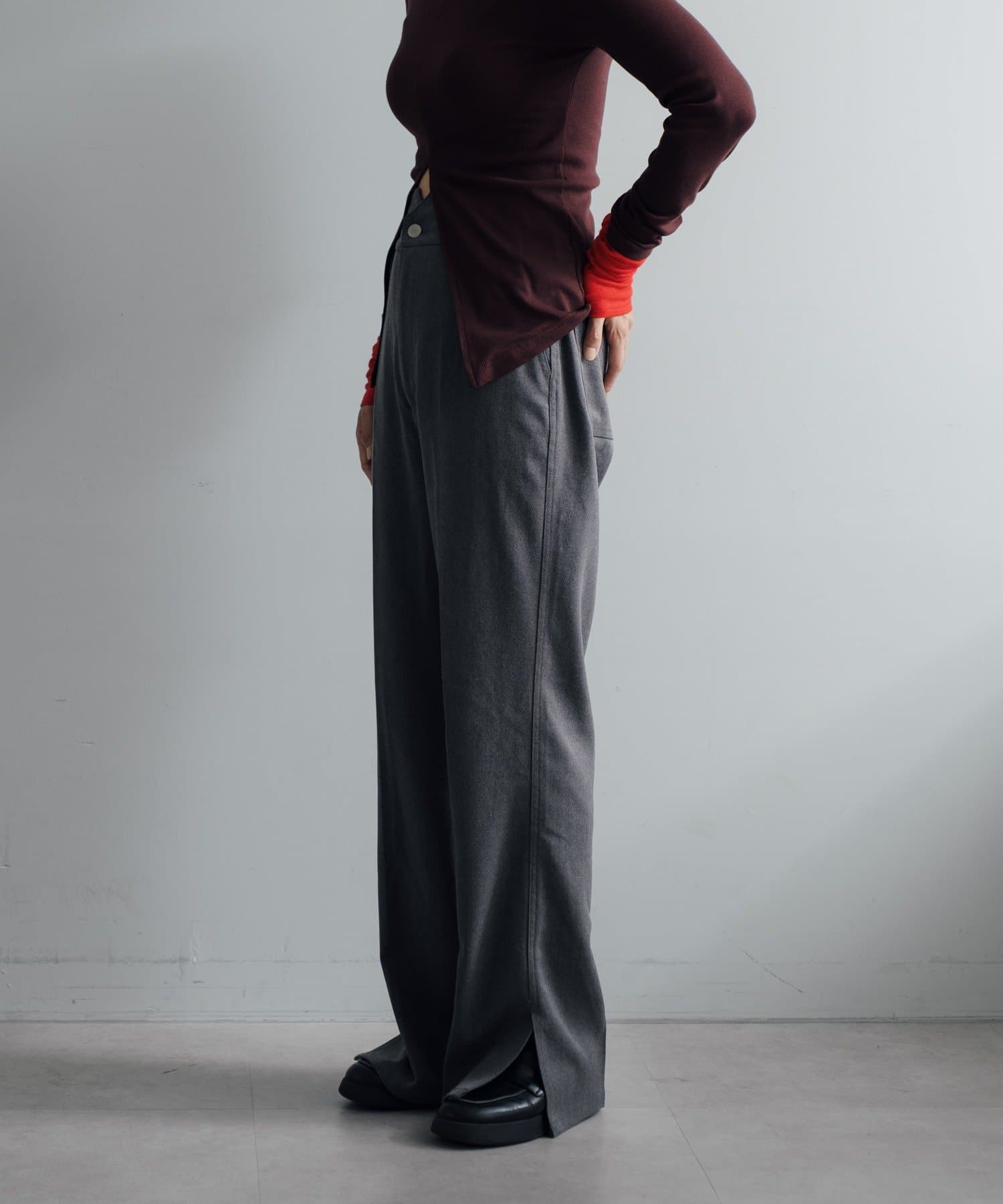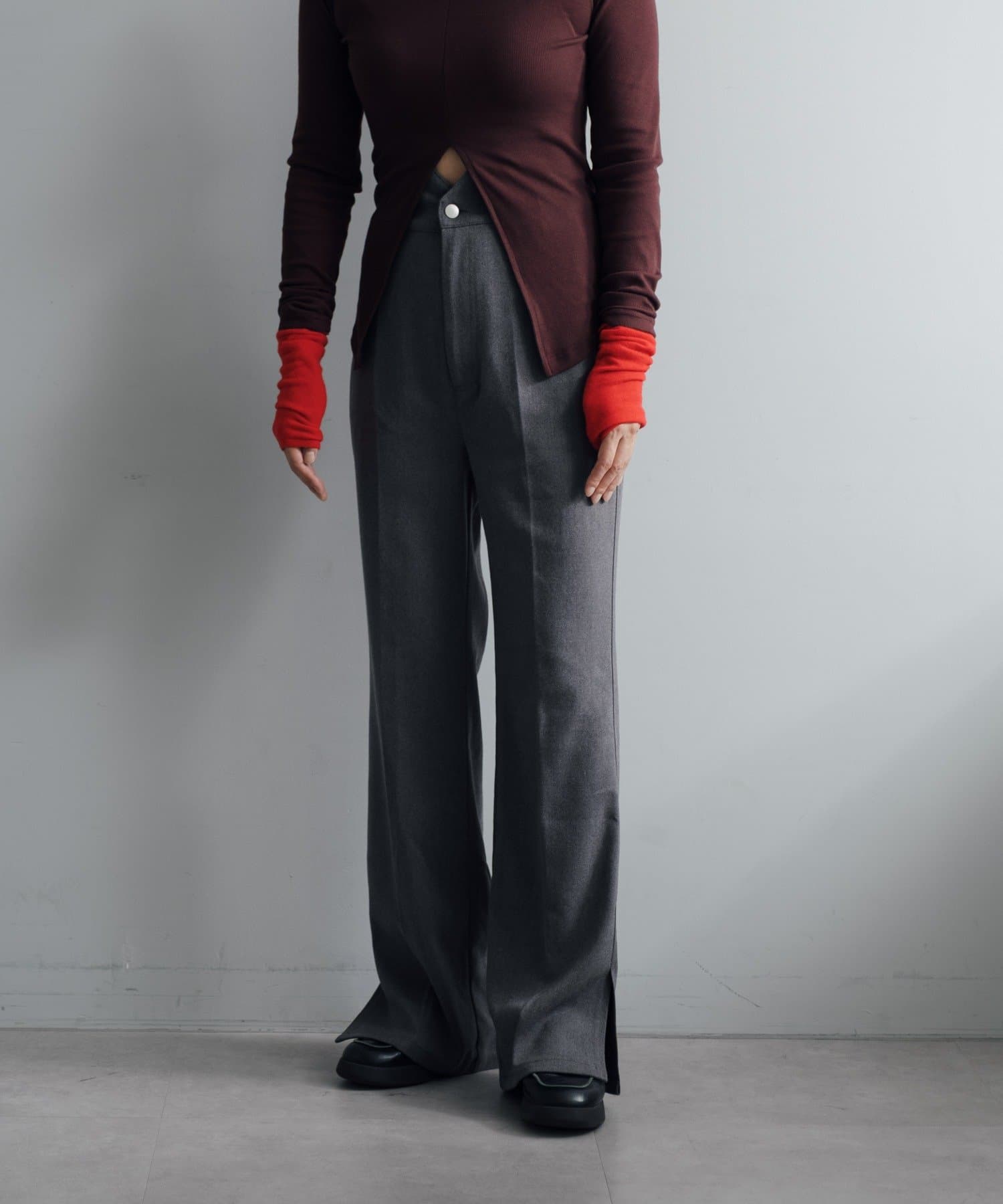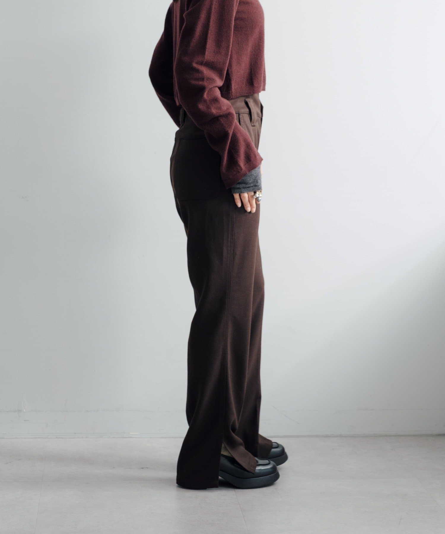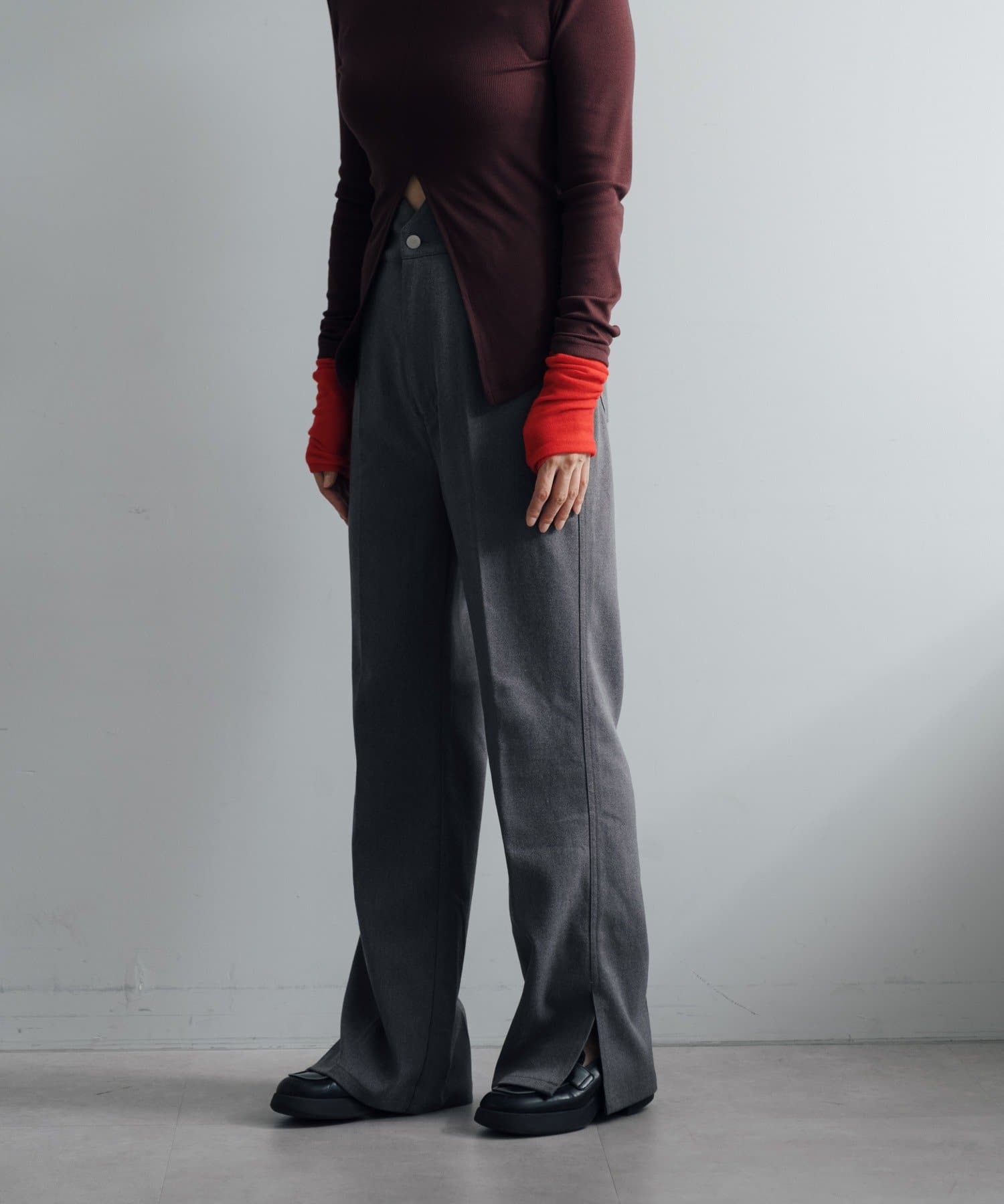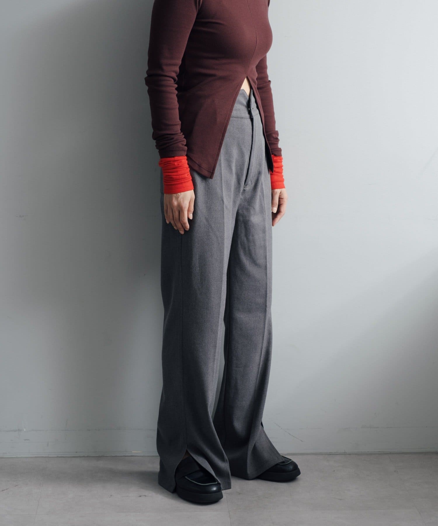 ウエストは安心感のあるハイウエストデザイン。Pasteripのパンツのアイコンとなるカーブベルトを付けているので、座っても苦しくなりにくいのが嬉しいポイントです。また、スラックスには紐が内蔵されており、自由にサイズを調整できます。裾にはスリットを入れていて、脚がすっきりと綺麗に見えます。