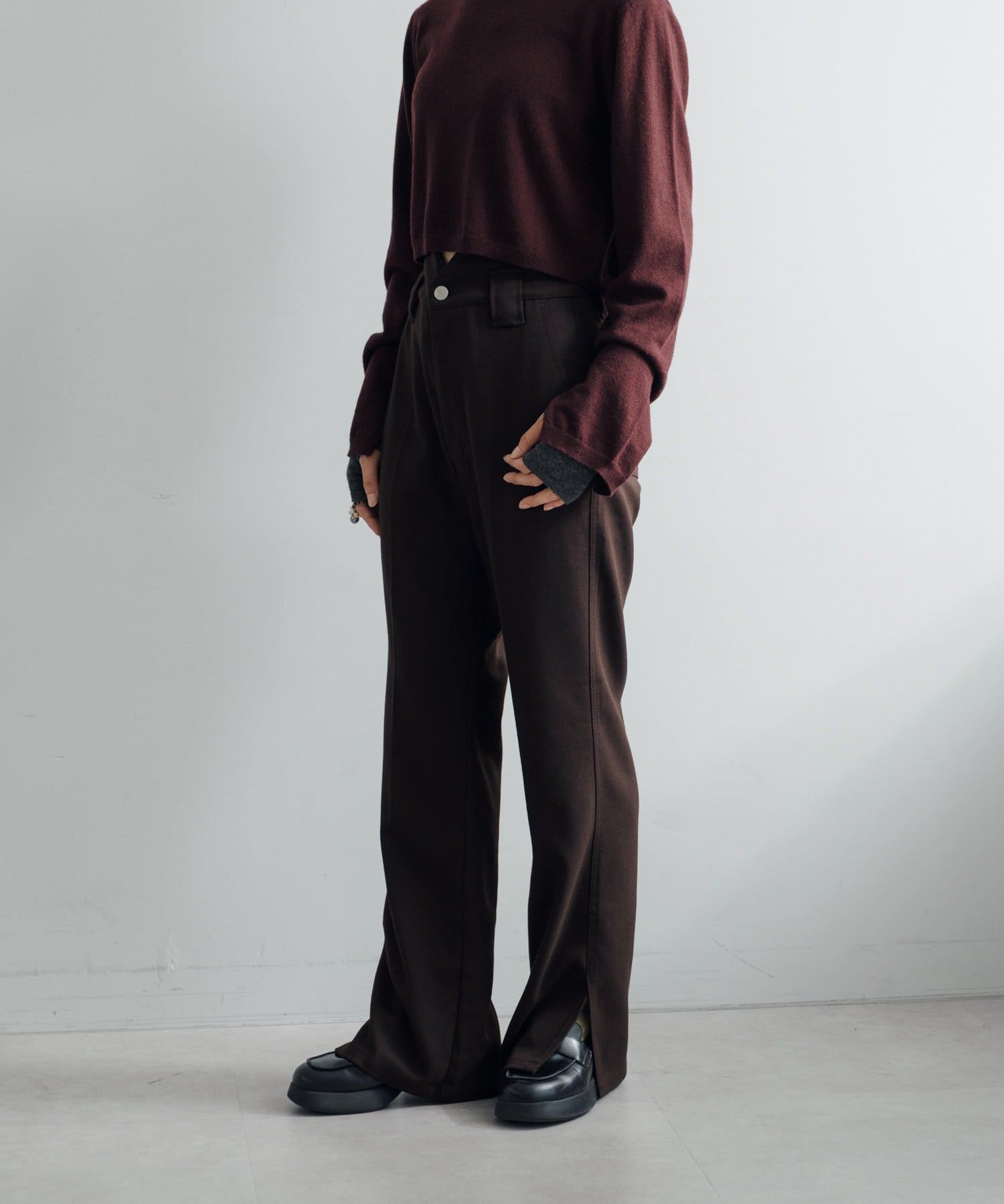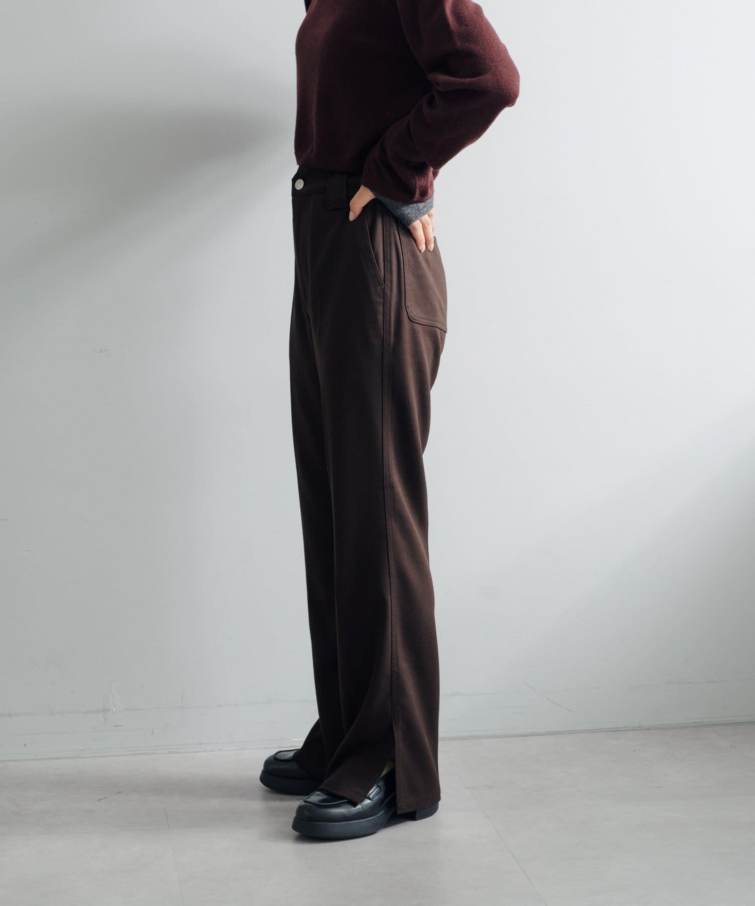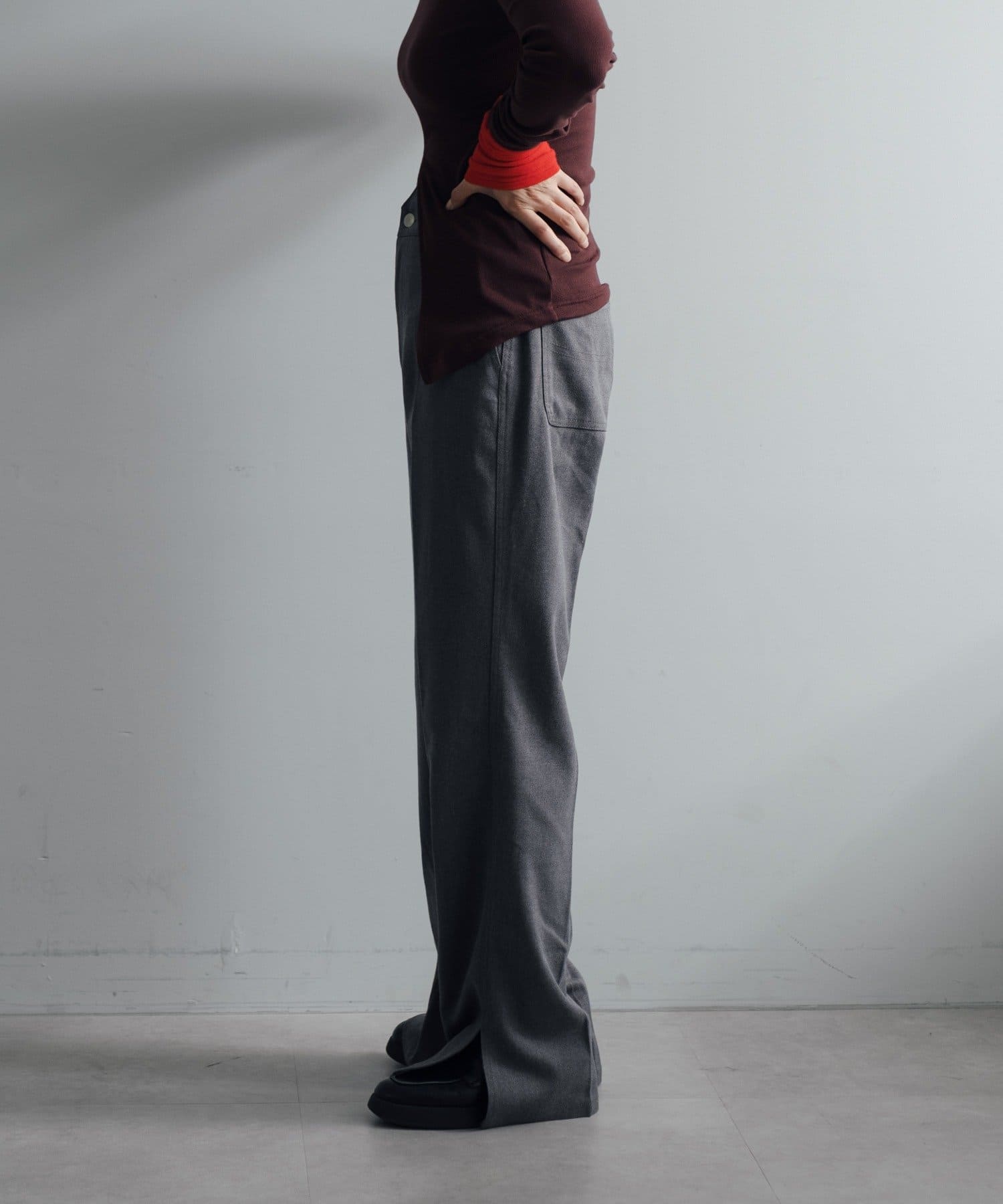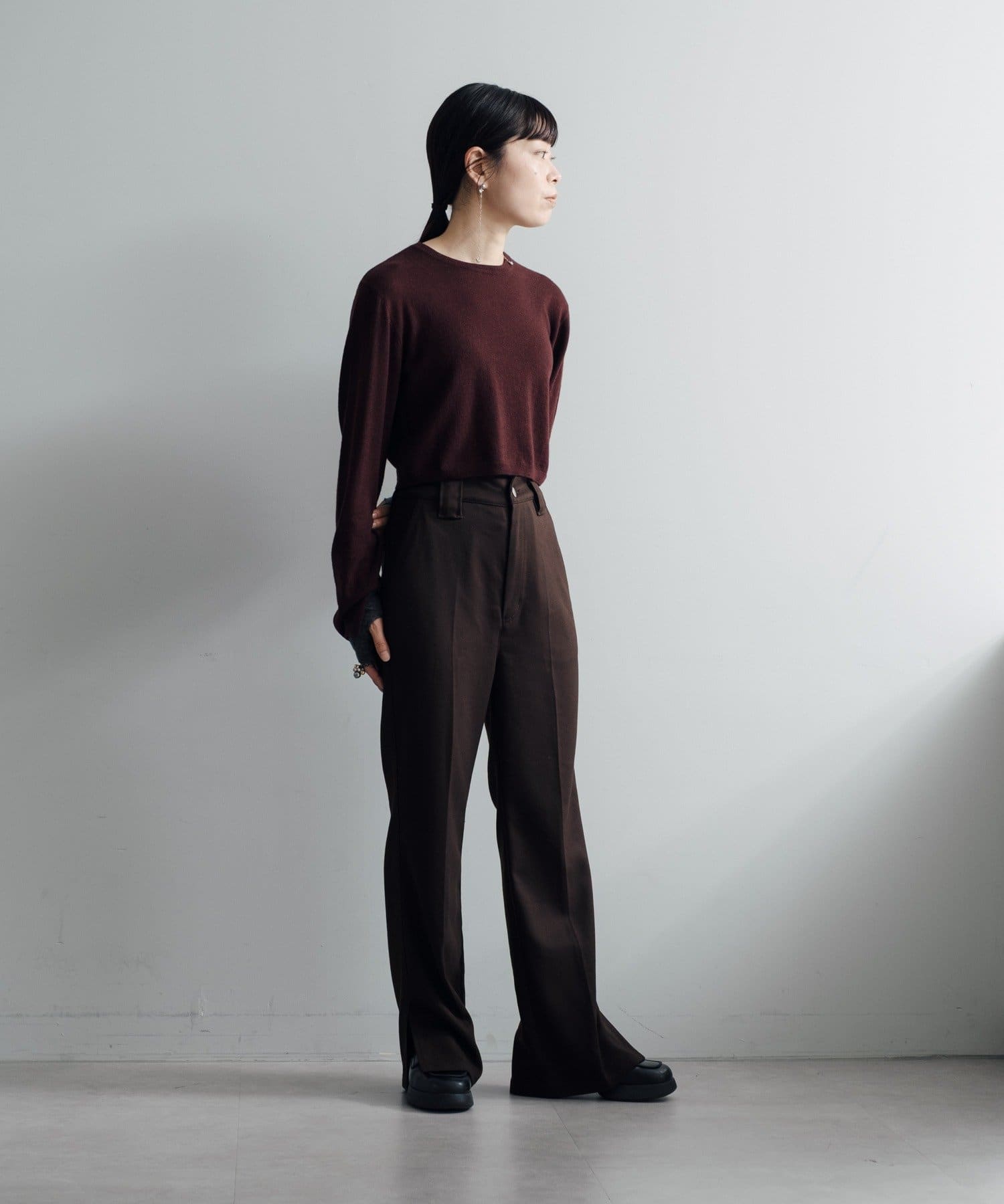 ウエストは安心感のあるハイウエストデザイン。Pasteripのパンツのアイコンとなるカーブベルトを付けているので、座っても苦しくなりにくいのが嬉しいポイントです。また、スラックスには紐が内蔵されており、自由にサイズを調整できます。裾にはスリットを入れていて、脚がすっきりと綺麗に見えます。