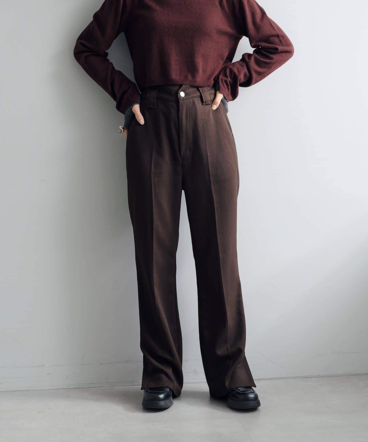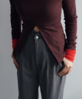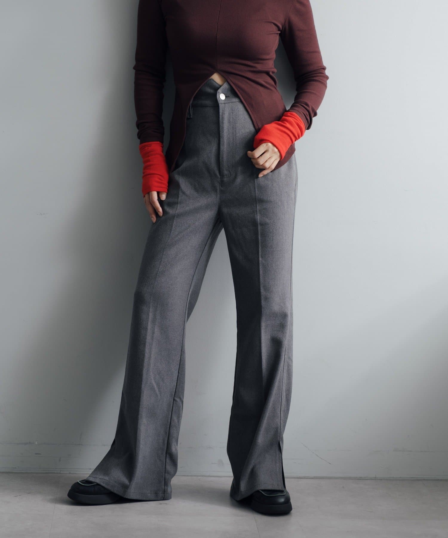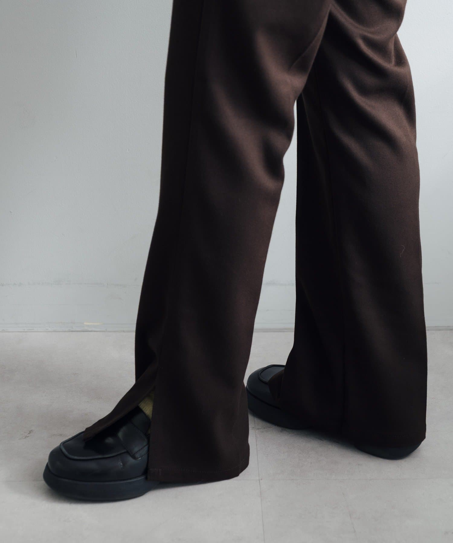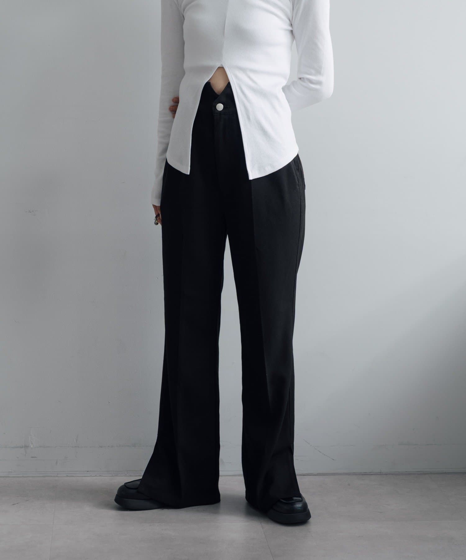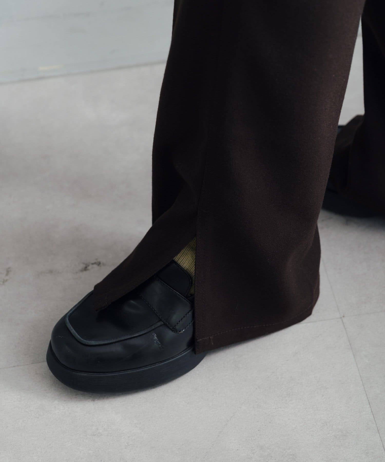 ウエストは安心感のあるハイウエストデザイン。Pasteripのパンツのアイコンとなるカーブベルトを付けているので、座っても苦しくなりにくいのが嬉しいポイントです。また、スラックスには紐が内蔵されており、自由にサイズを調整できます。裾にはスリットを入れていて、脚がすっきりと綺麗に見えます。
