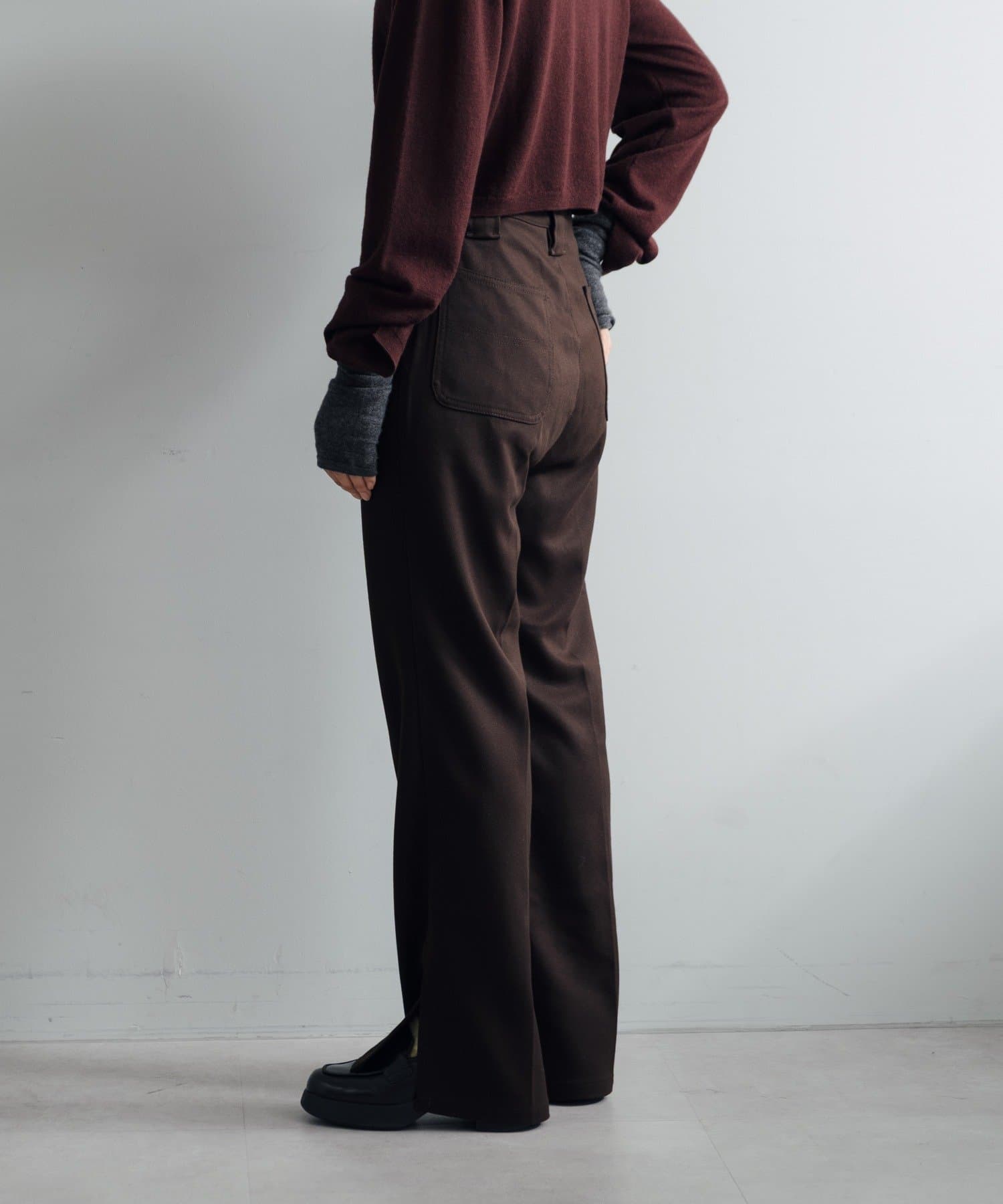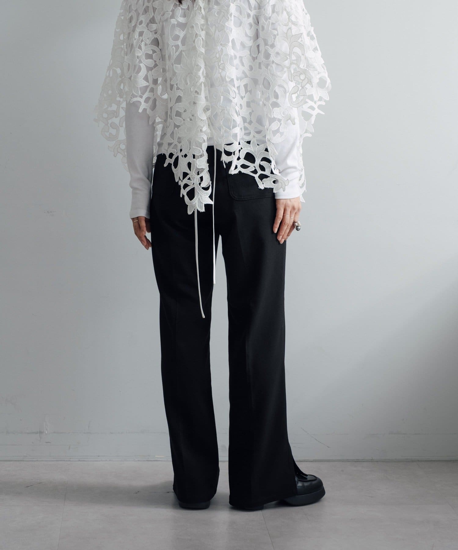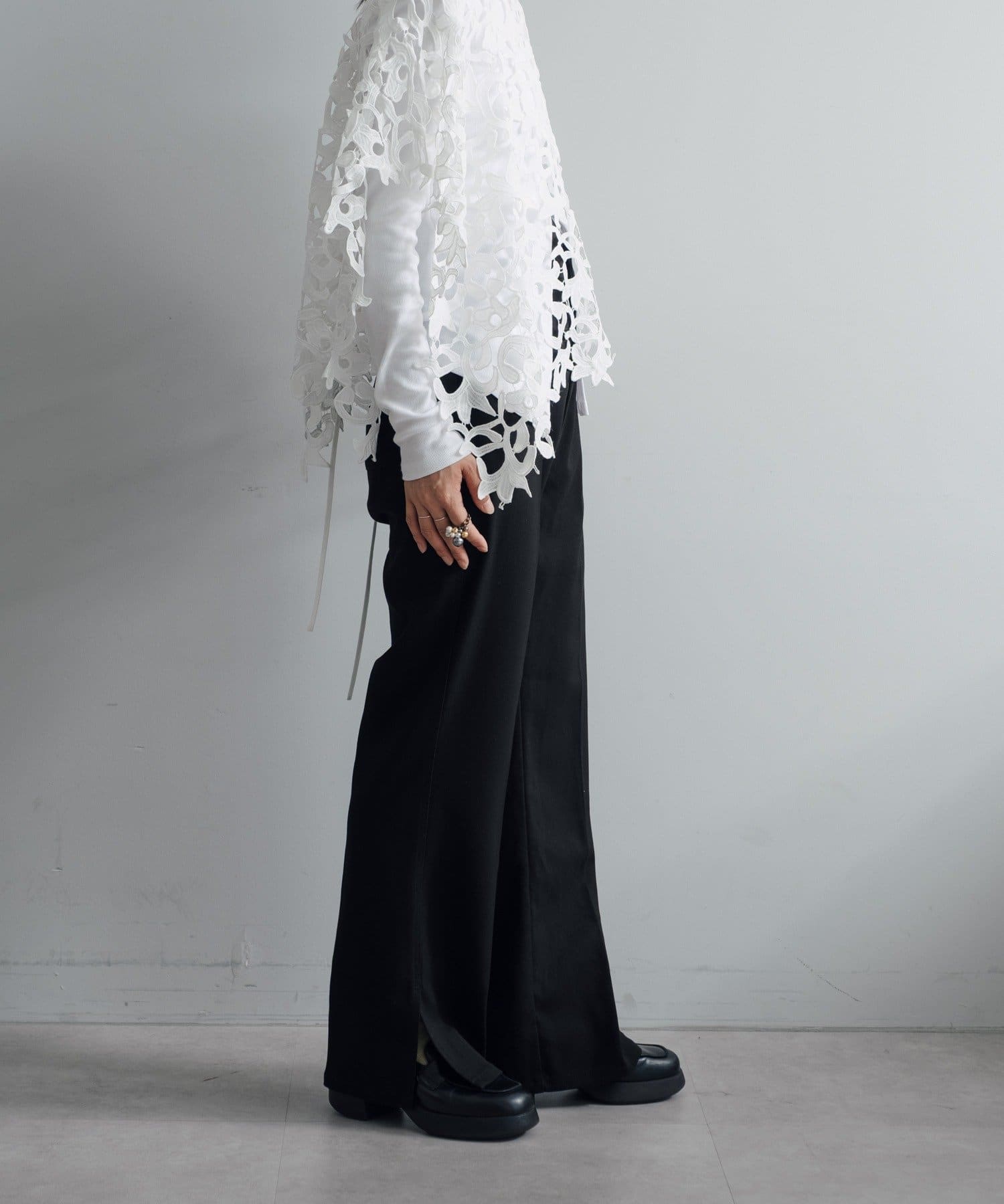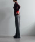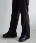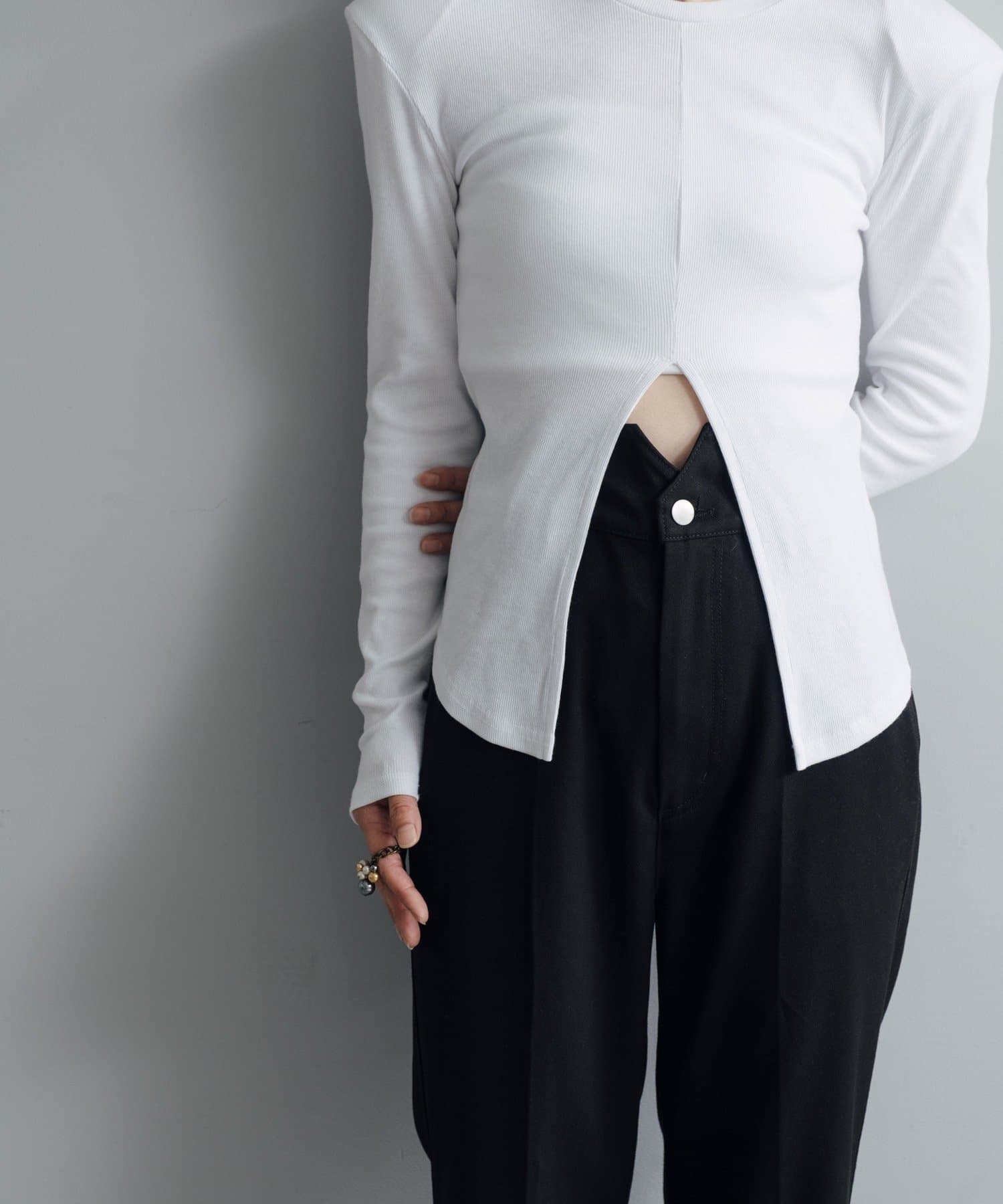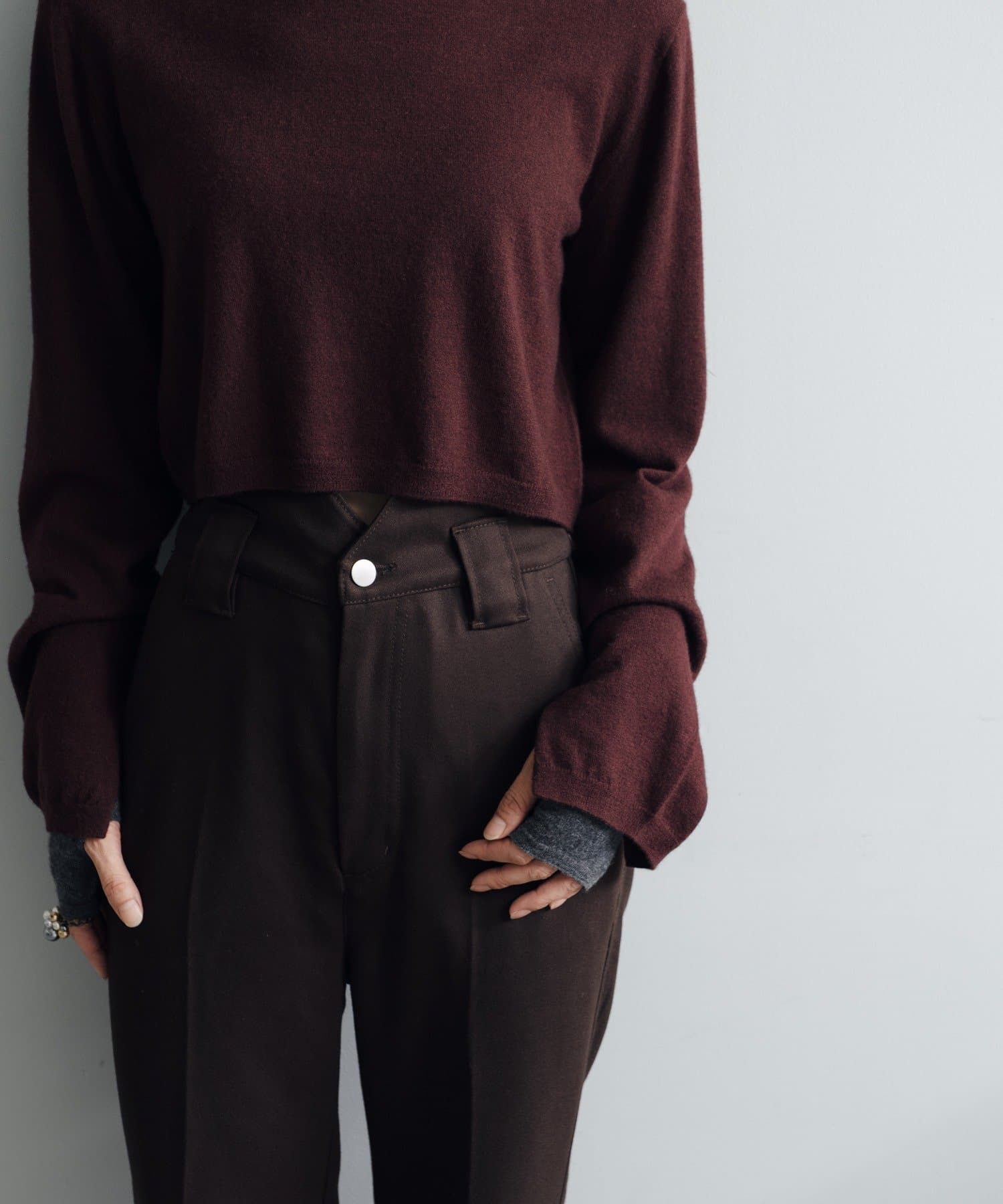 ウエストは安心感のあるハイウエストデザイン。Pasteripのパンツのアイコンとなるカーブベルトを付けているので、座っても苦しくなりにくいのが嬉しいポイントです。また、スラックスには紐が内蔵されており、自由にサイズを調整できます。裾にはスリットを入れていて、脚がすっきりと綺麗に見えます。
