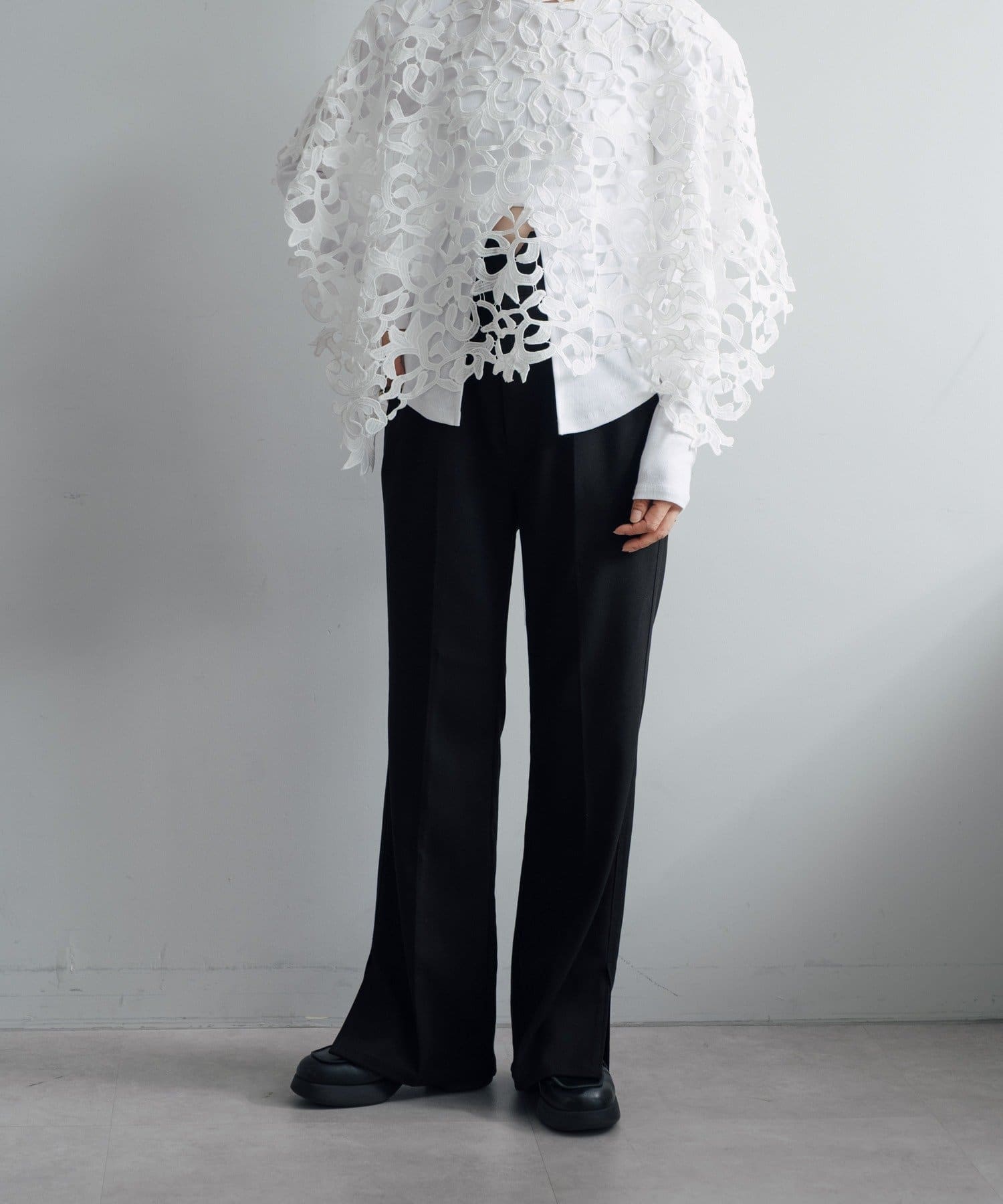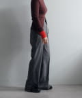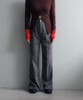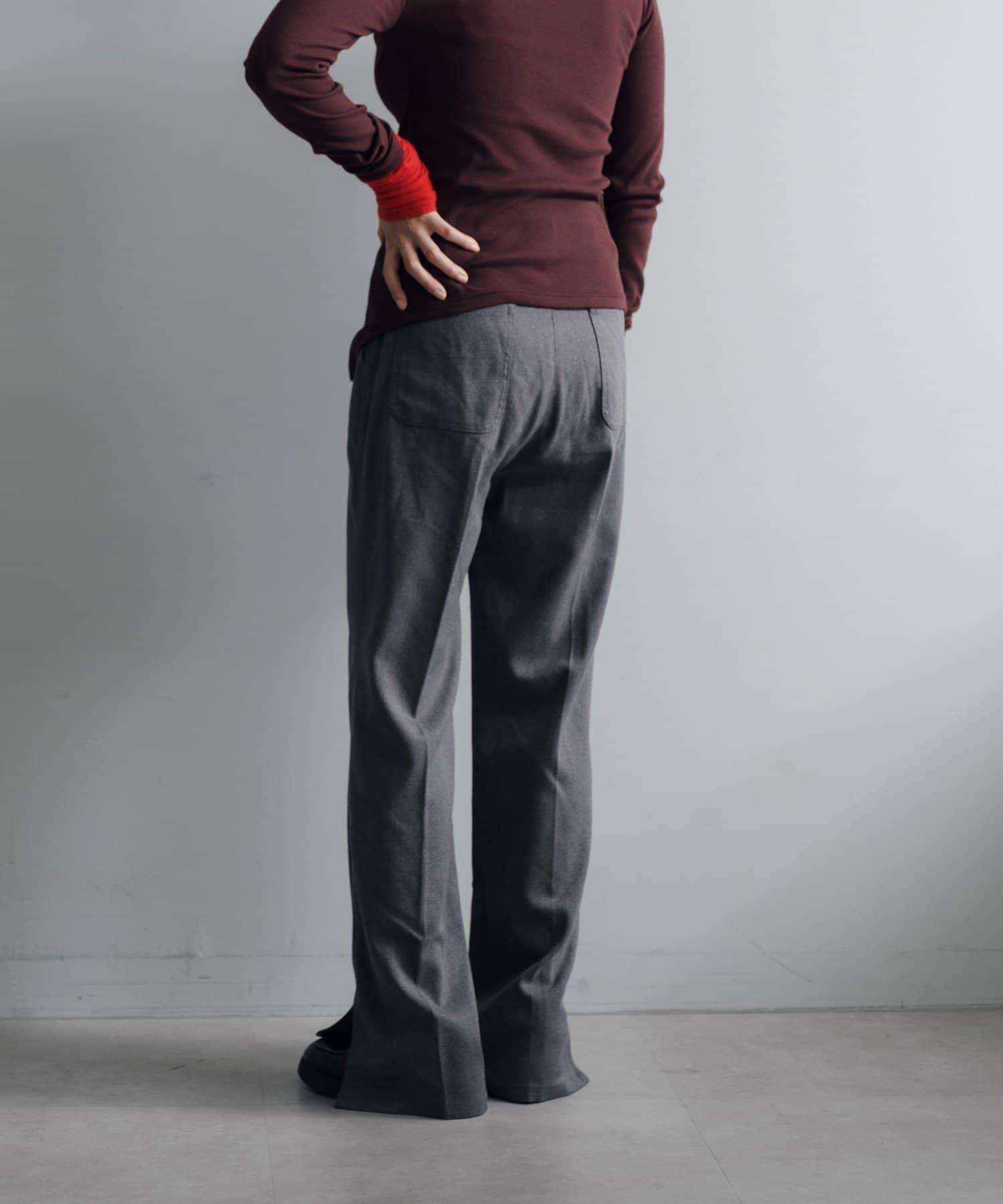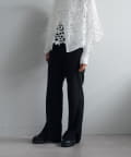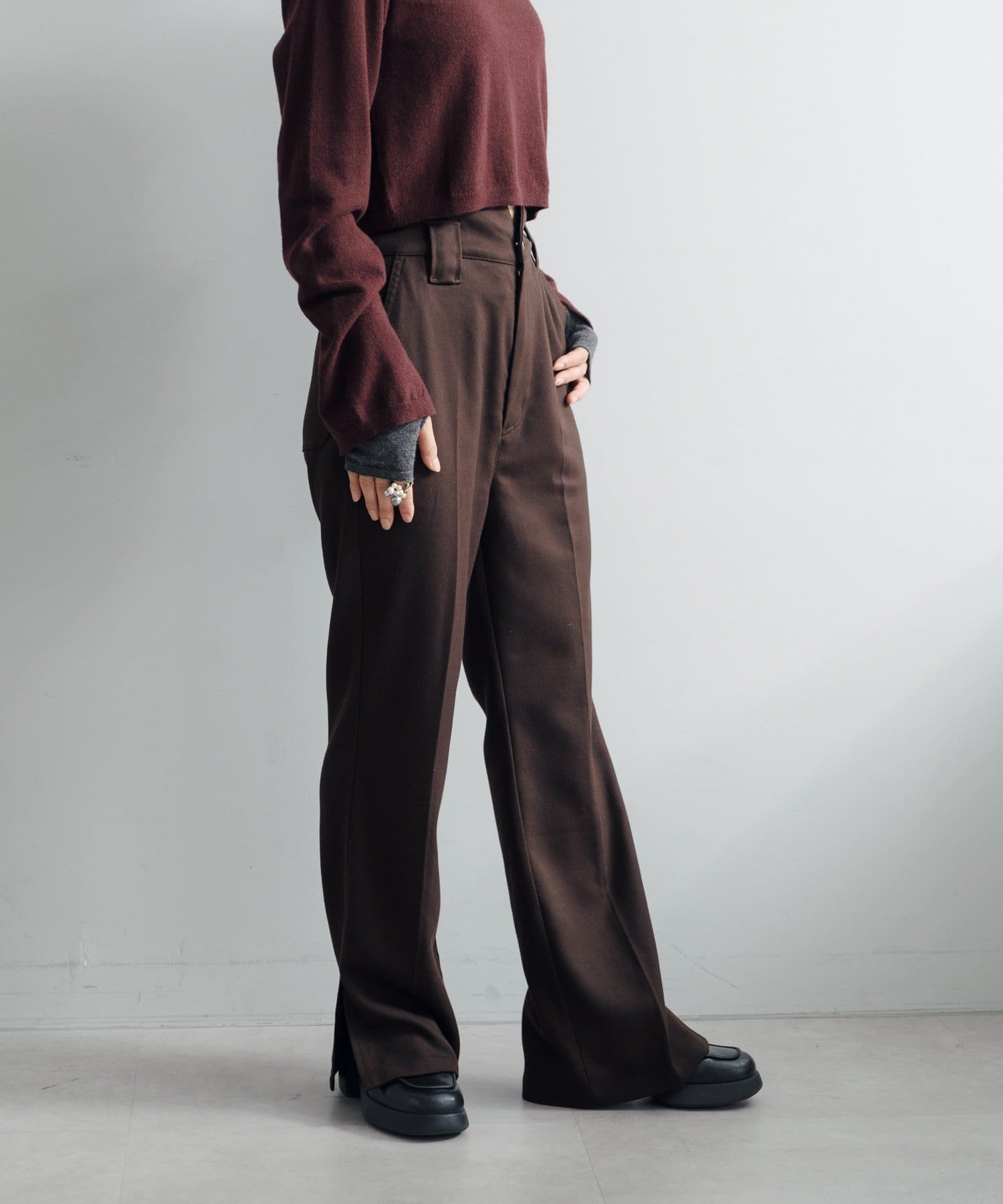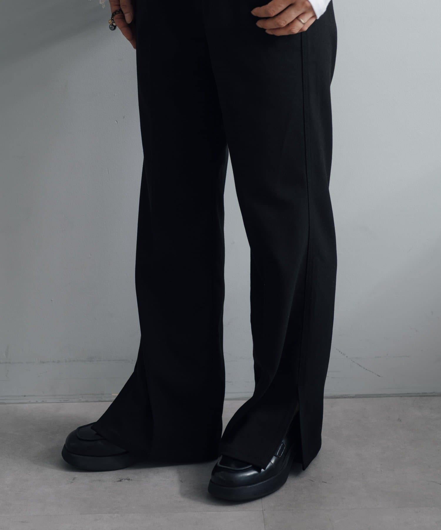 ウエストは安心感のあるハイウエストデザイン。Pasteripのパンツのアイコンとなるカーブベルトを付けているので、座っても苦しくなりにくいのが嬉しいポイントです。また、スラックスには紐が内蔵されており、自由にサイズを調整できます。裾にはスリットを入れていて、脚がすっきりと綺麗に見えます。