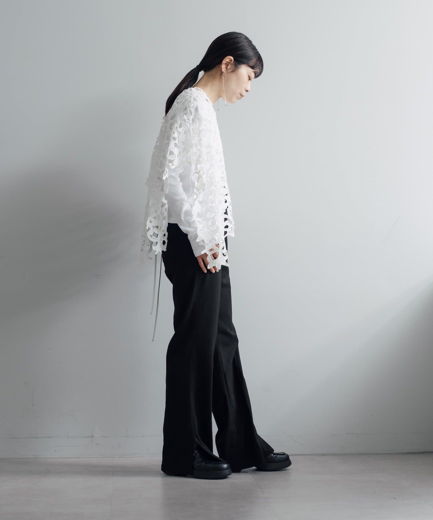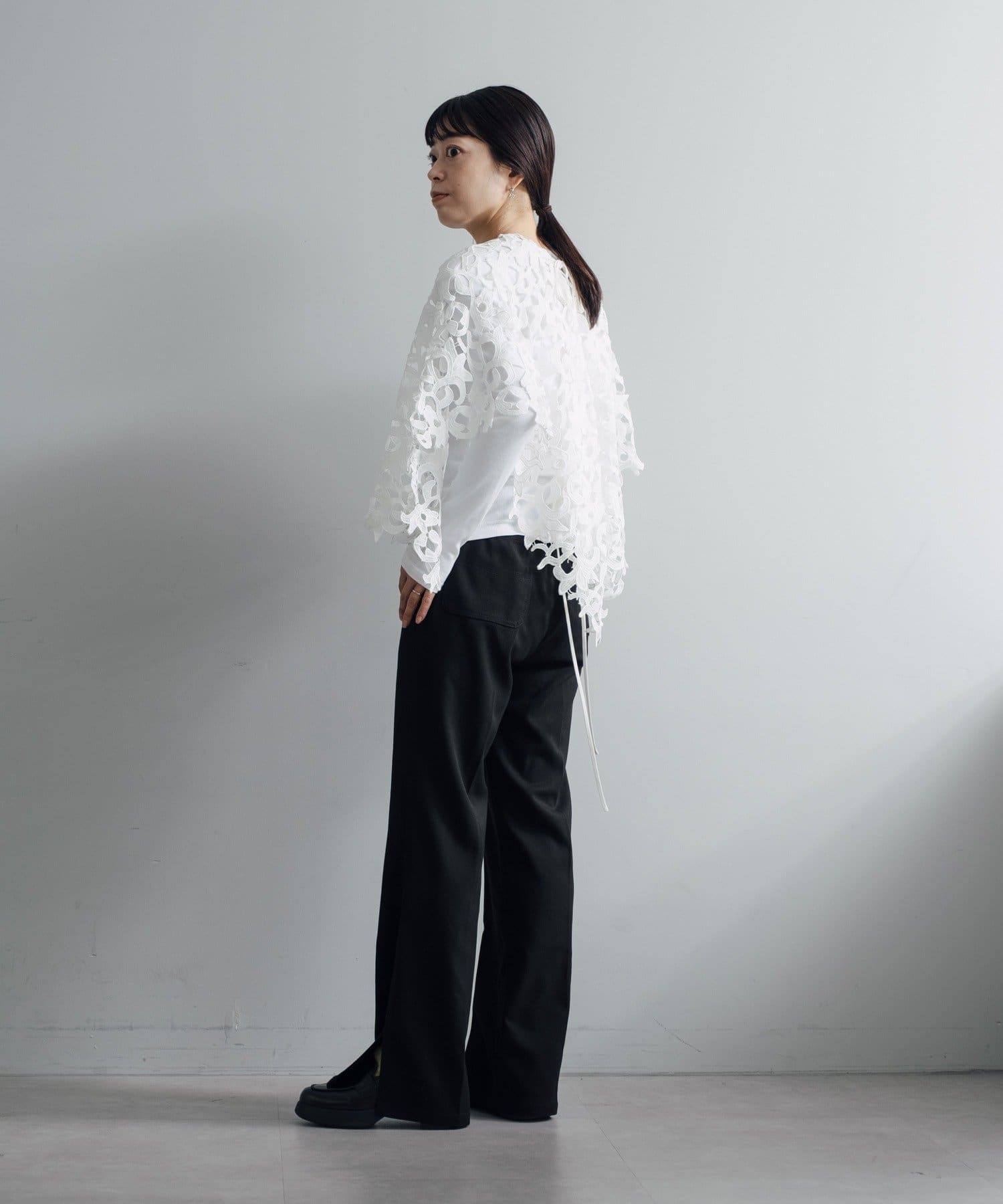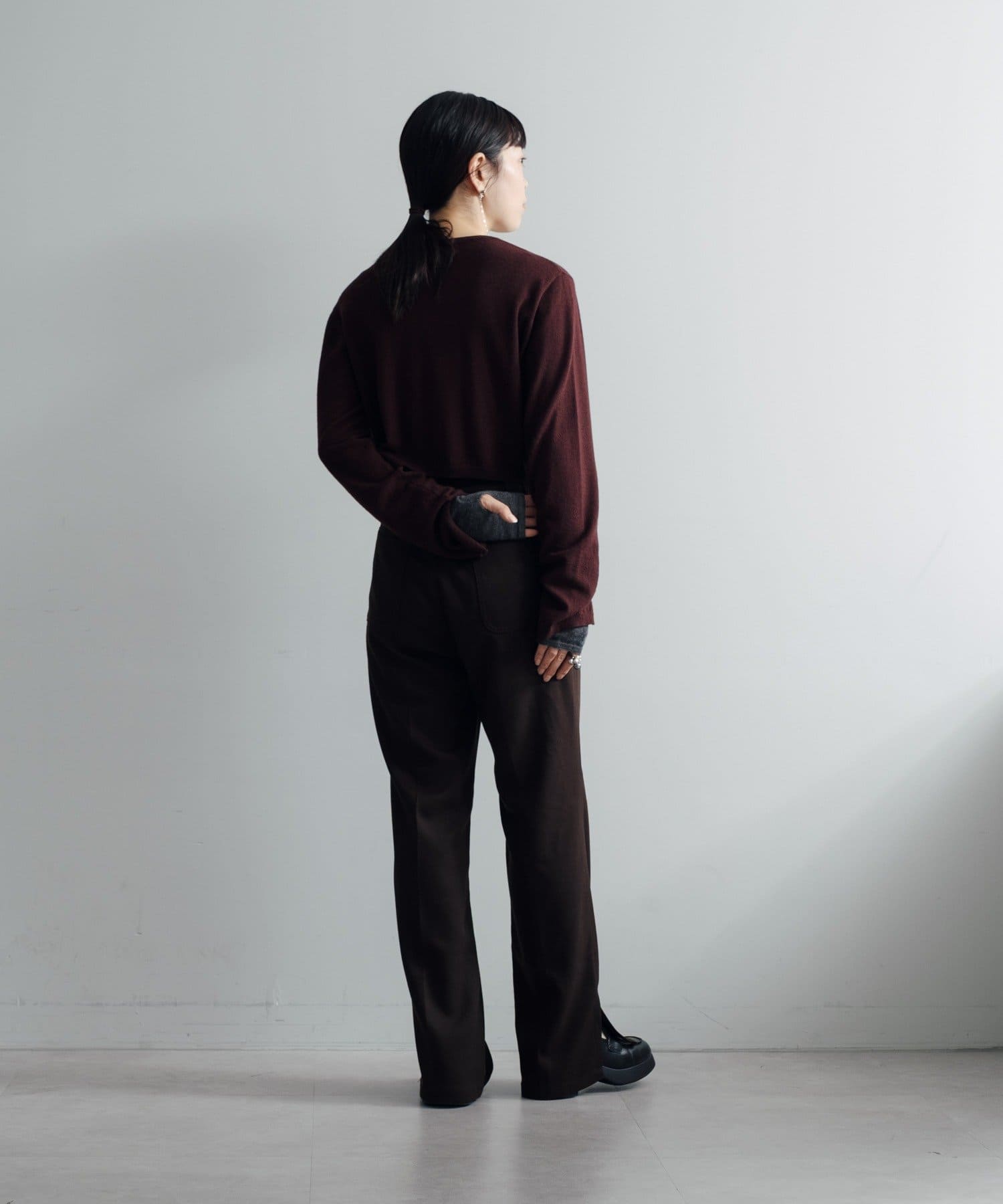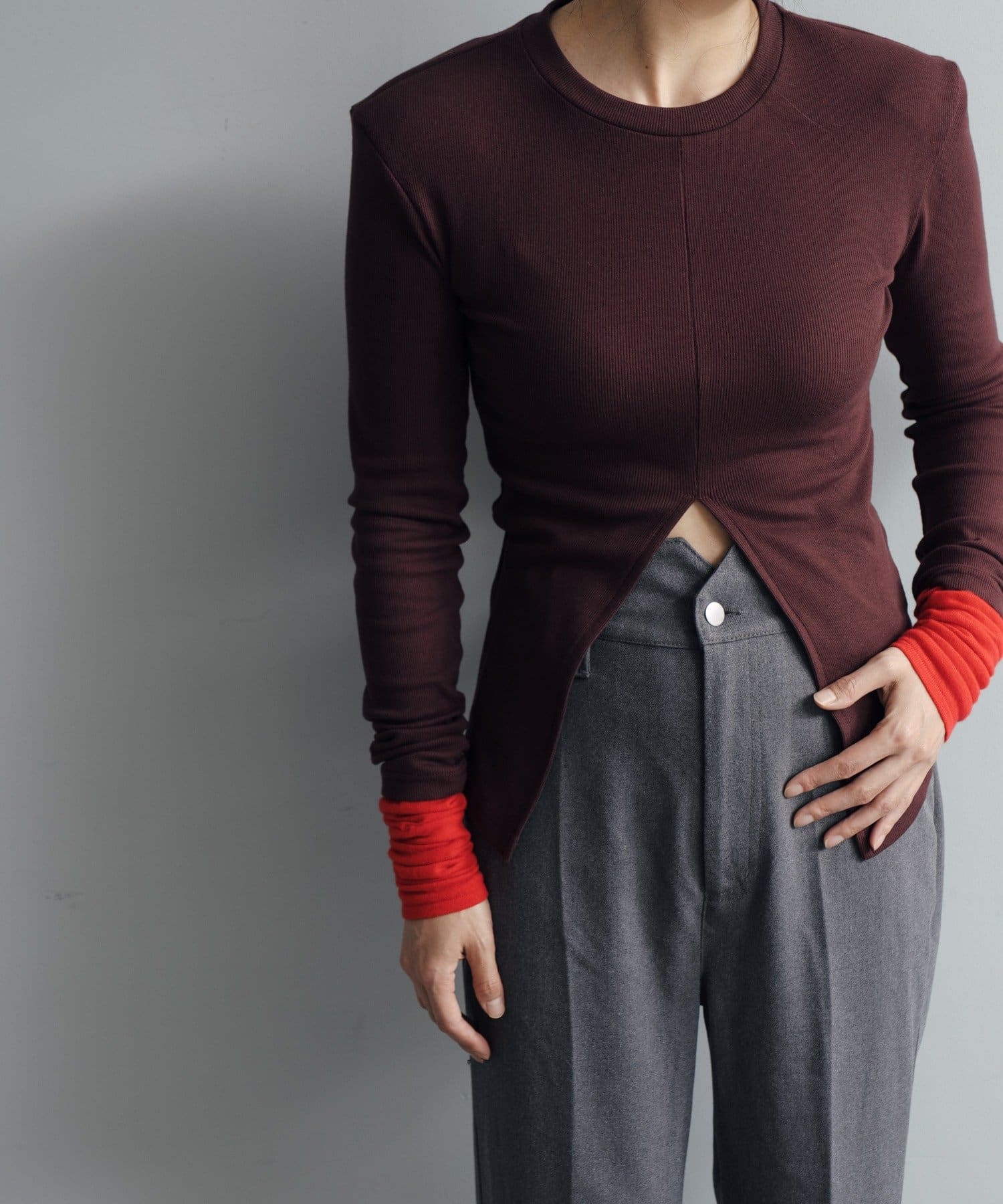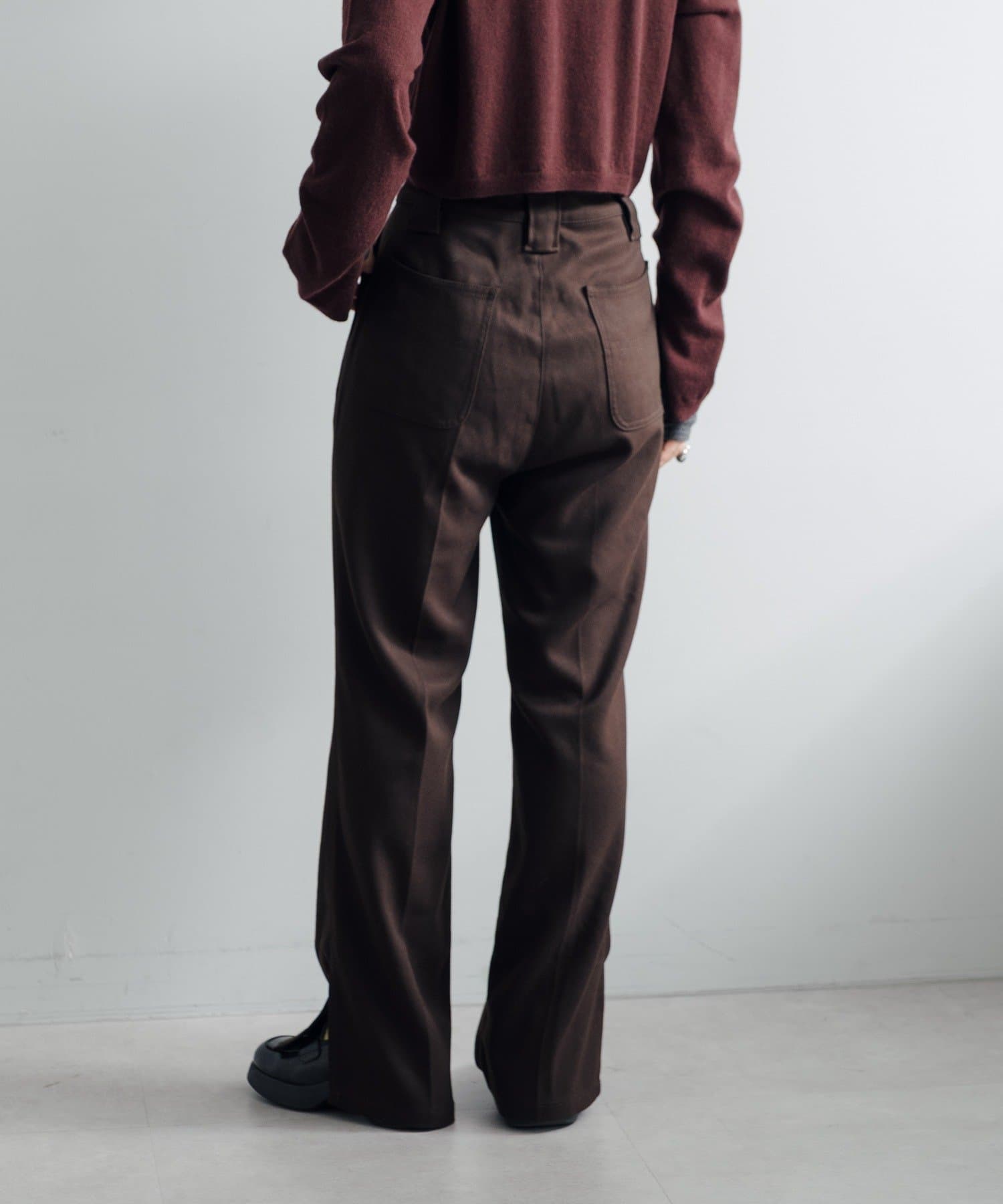 ウエストは安心感のあるハイウエストデザイン。Pasteripのパンツのアイコンとなるカーブベルトを付けているので、座っても苦しくなりにくいのが嬉しいポイントです。また、スラックスには紐が内蔵されており、自由にサイズを調整できます。裾にはスリットを入れていて、脚がすっきりと綺麗に見えます。