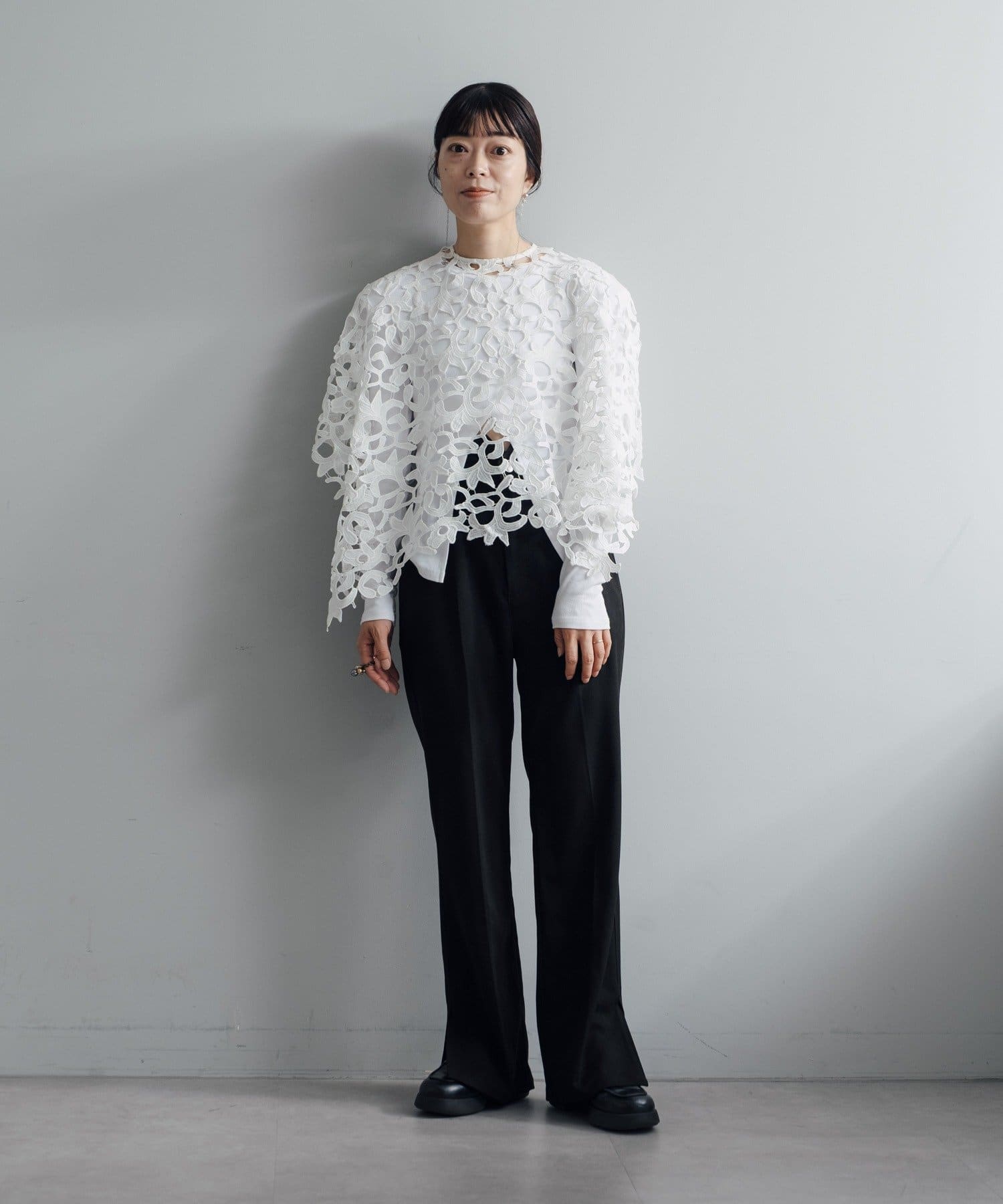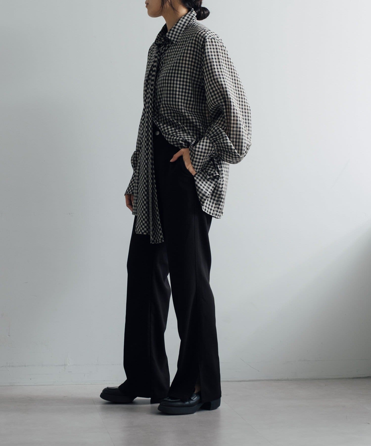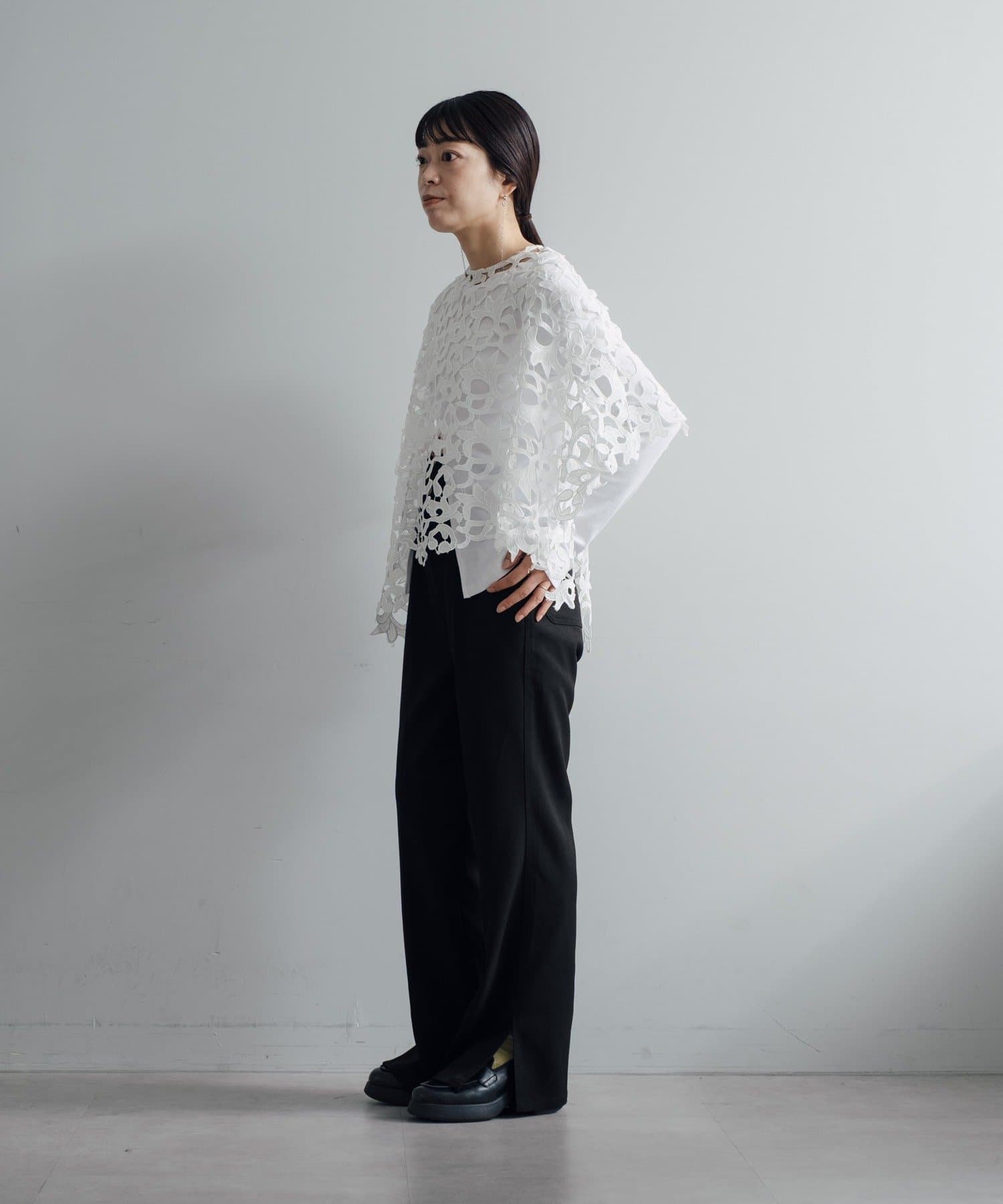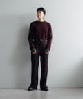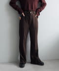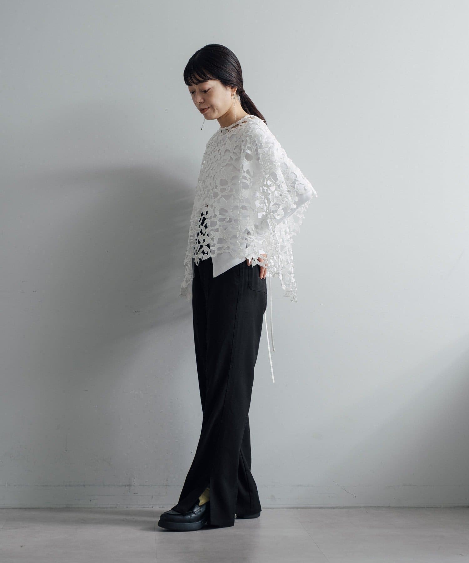 ウエストは安心感のあるハイウエストデザイン。Pasteripのパンツのアイコンとなるカーブベルトを付けているので、座っても苦しくなりにくいのが嬉しいポイントです。また、スラックスには紐が内蔵されており、自由にサイズを調整できます。裾にはスリットを入れていて、脚がすっきりと綺麗に見えます。