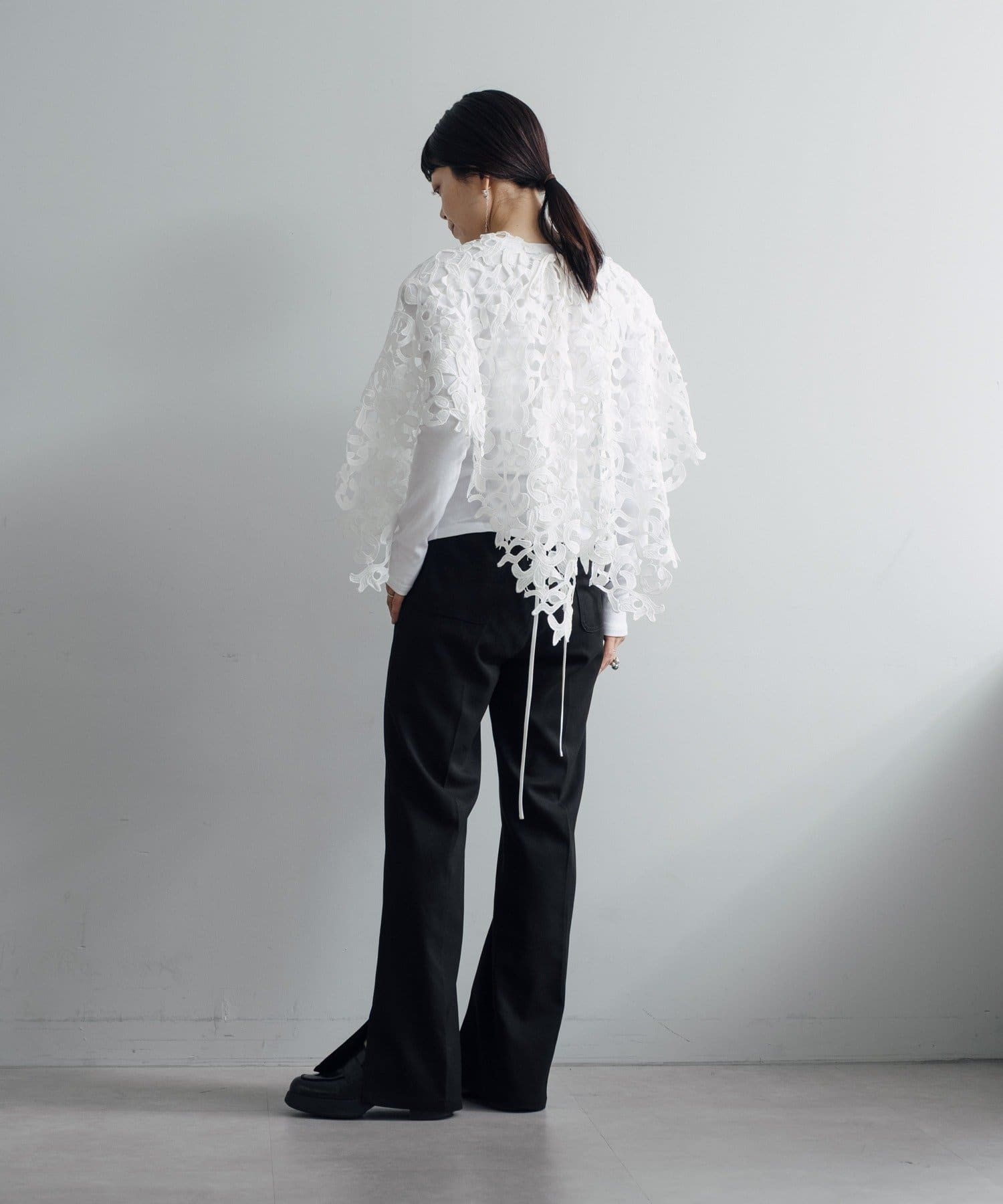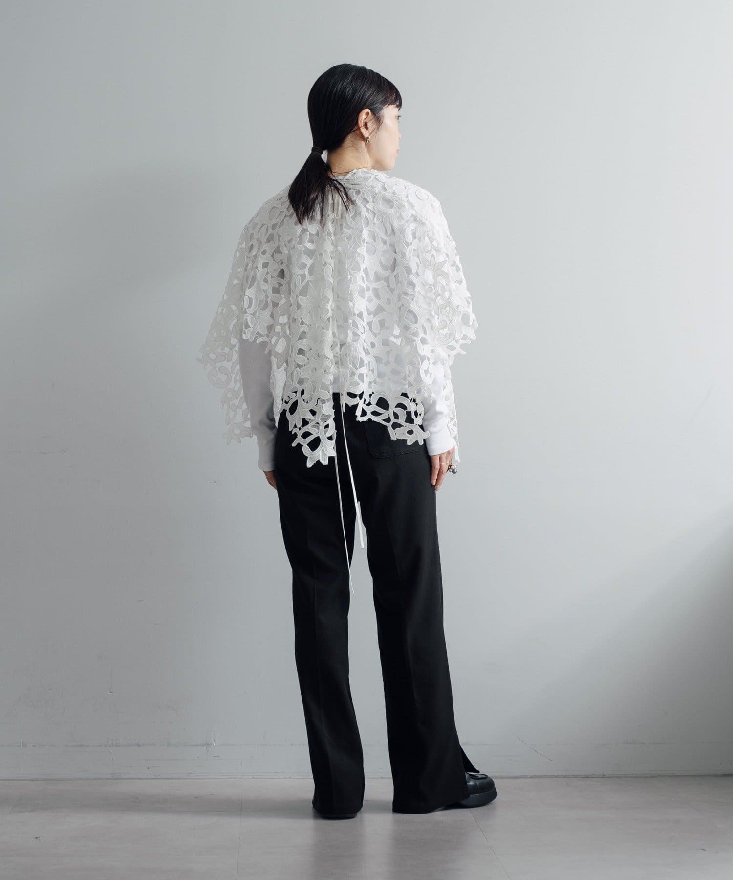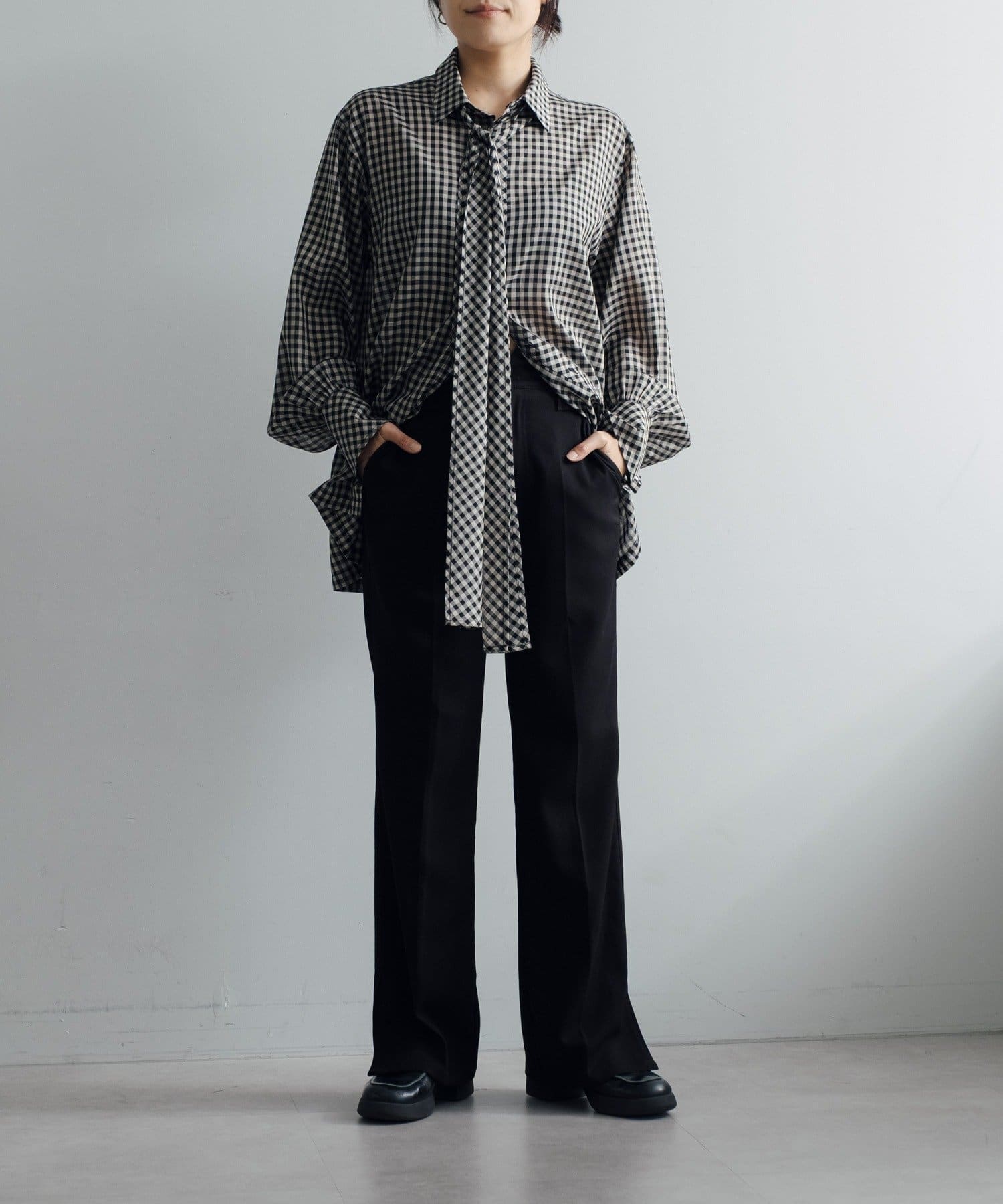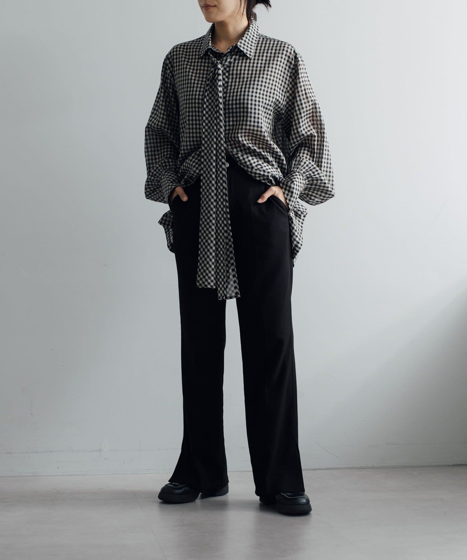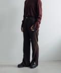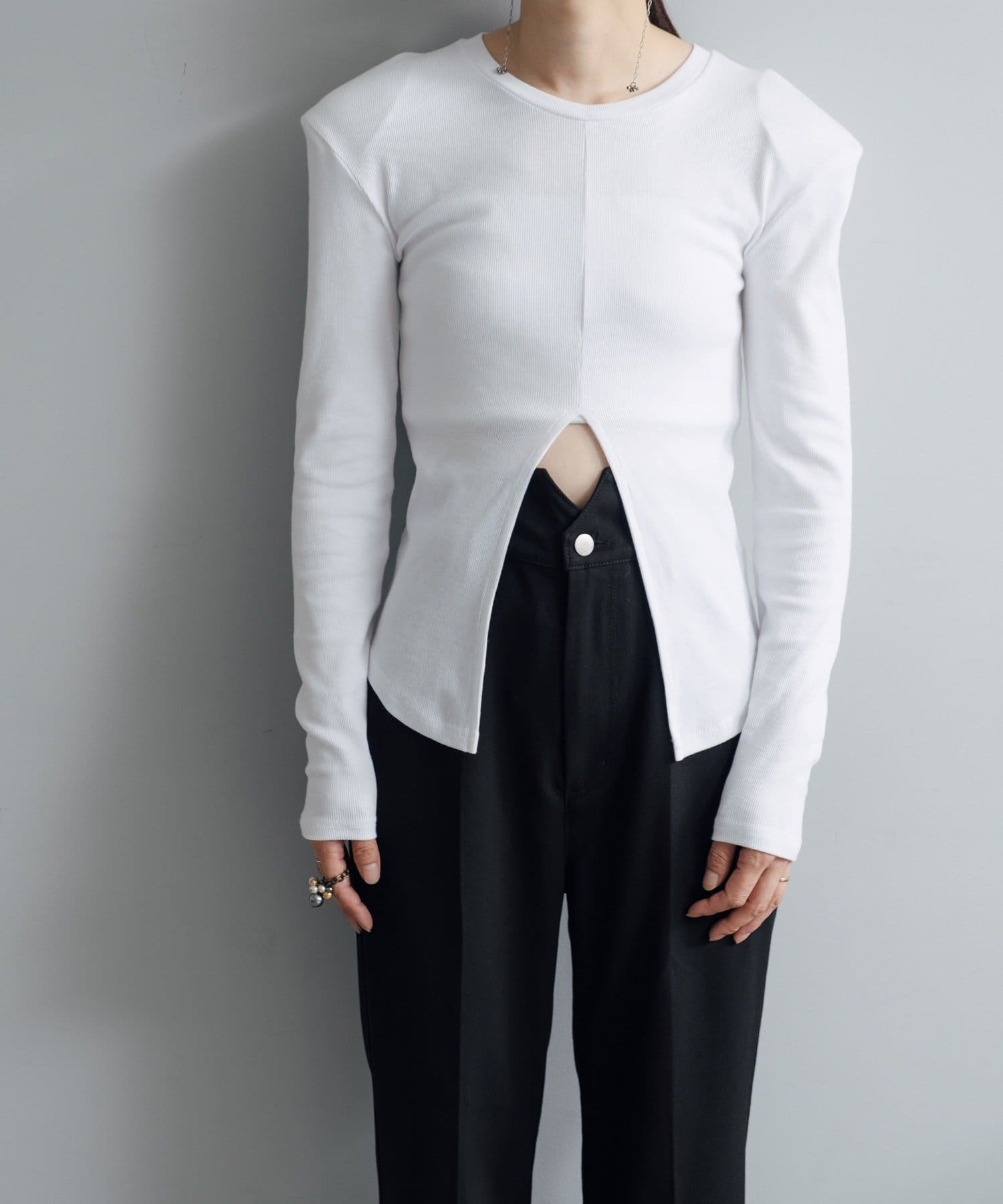 ウエストは安心感のあるハイウエストデザイン。Pasteripのパンツのアイコンとなるカーブベルトを付けているので、座っても苦しくなりにくいのが嬉しいポイントです。また、スラックスには紐が内蔵されており、自由にサイズを調整できます。裾にはスリットを入れていて、脚がすっきりと綺麗に見えます。