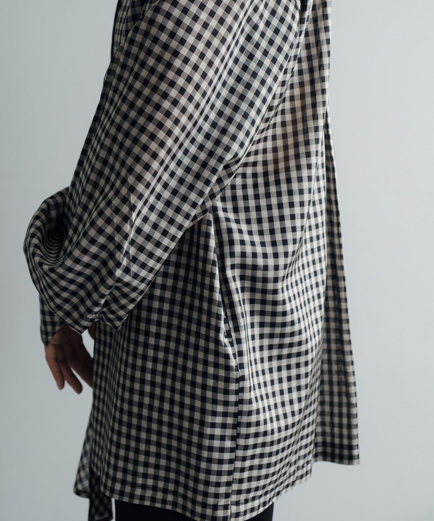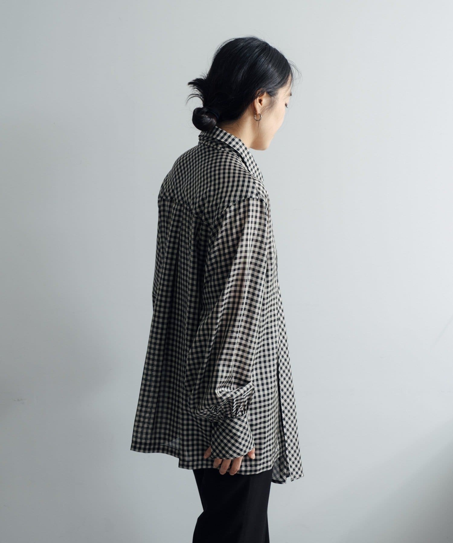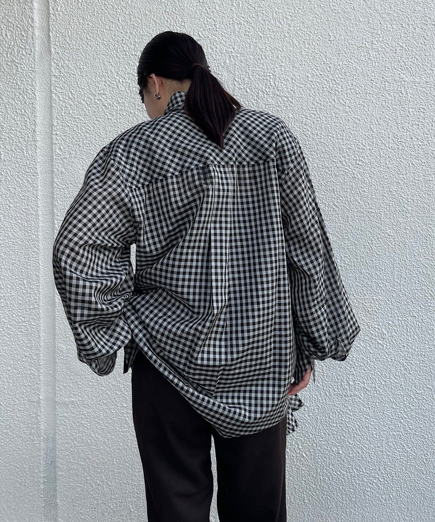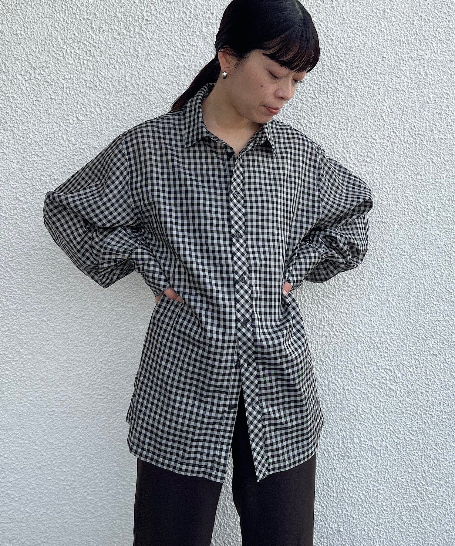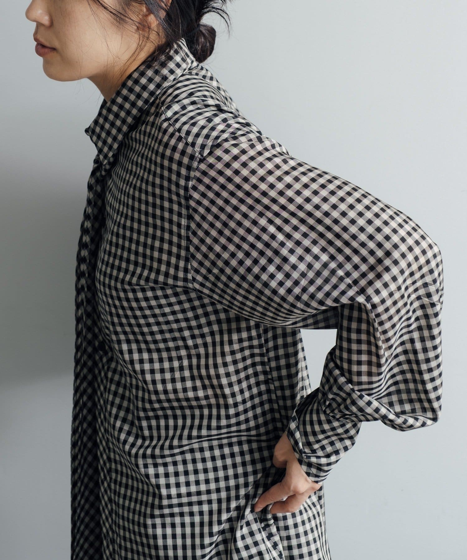 使用したのは、アセテート100%のギンガムチェックのシアー生地。素材の持つ特有のハリ感を活かして、美しいフォルムの贅沢なBIGシャツに仕立てました。腰がしっかりと隠れる長さ。袖口にはたっぷりとギャザーを寄せてボリューム感を出しています。