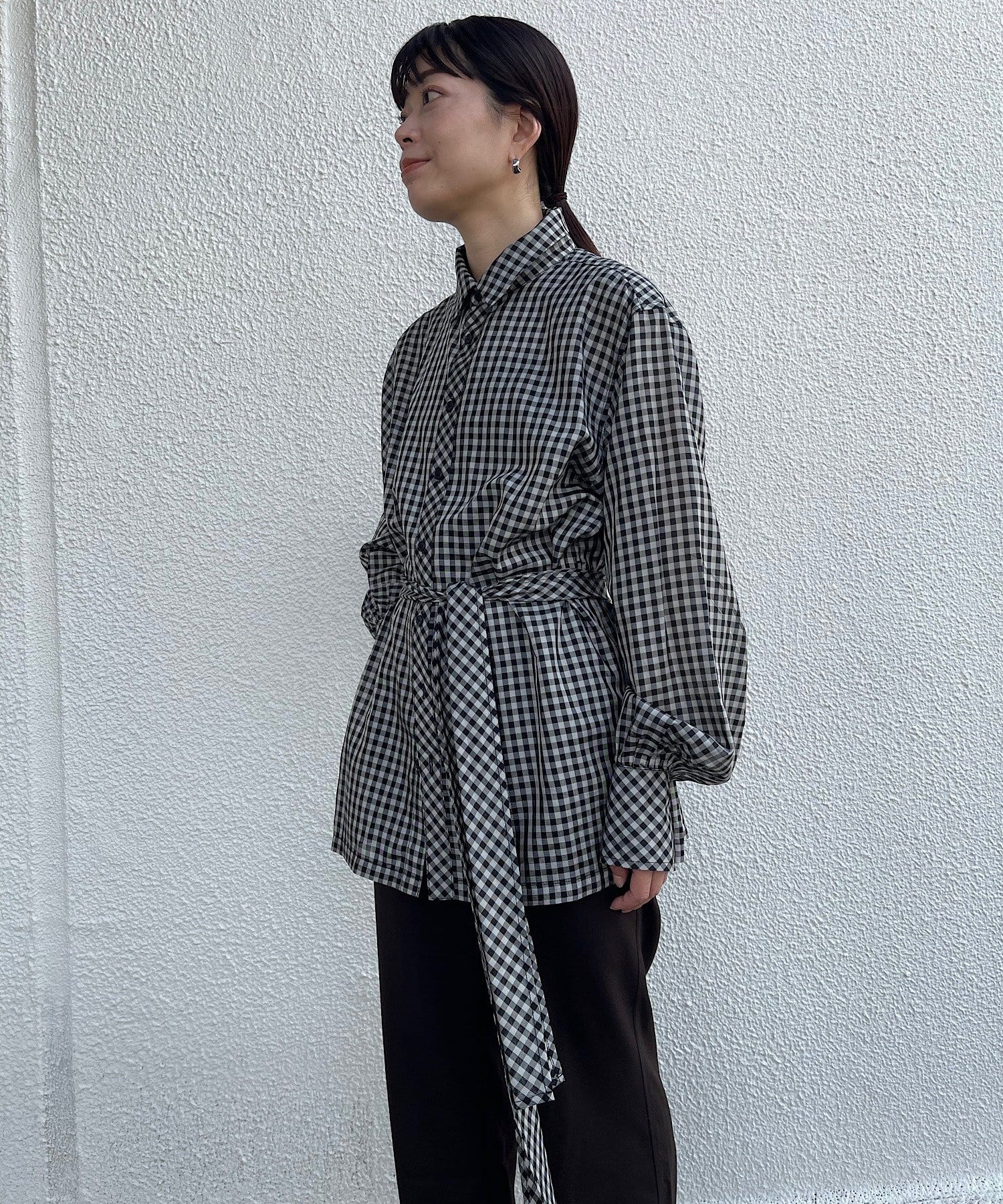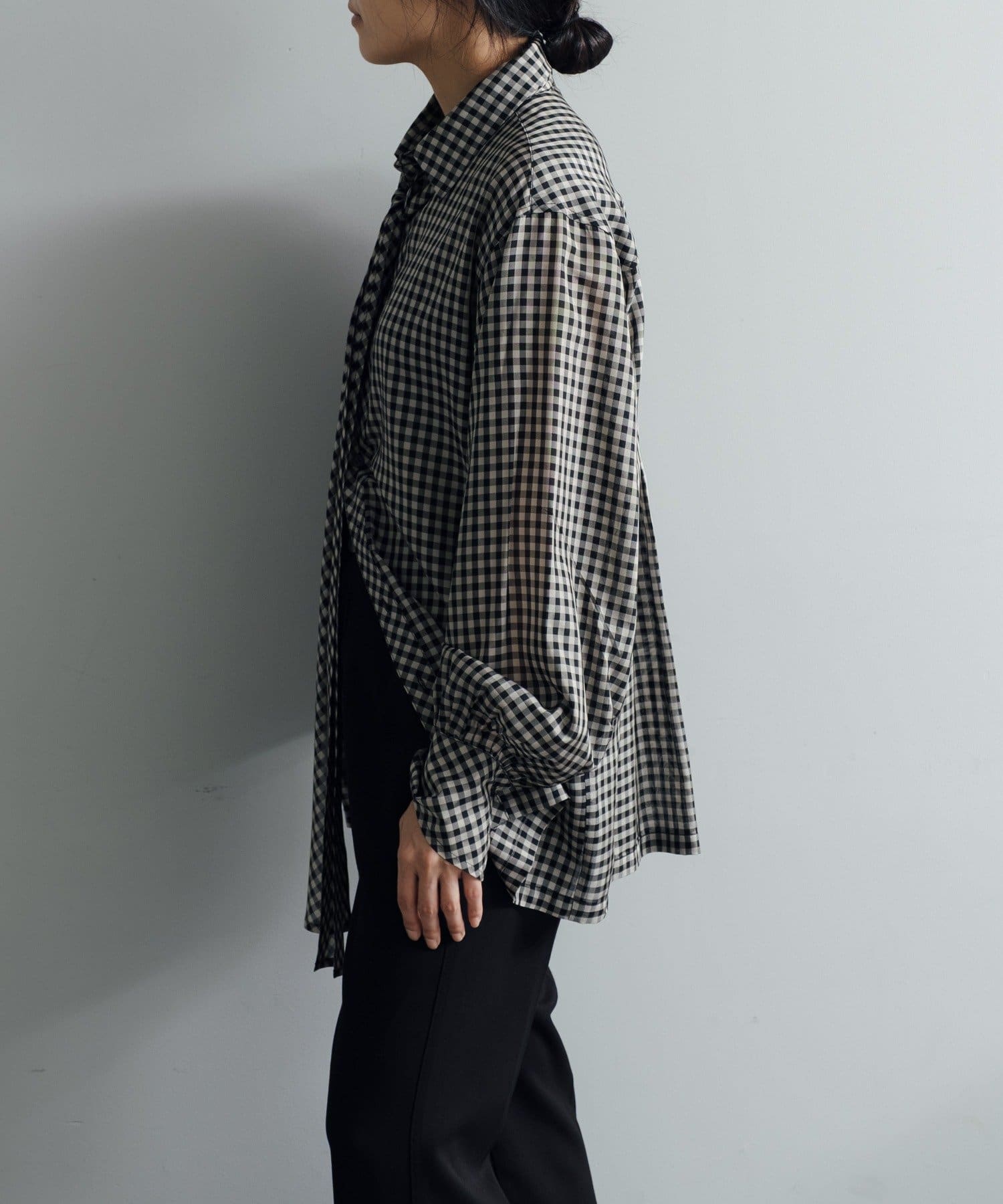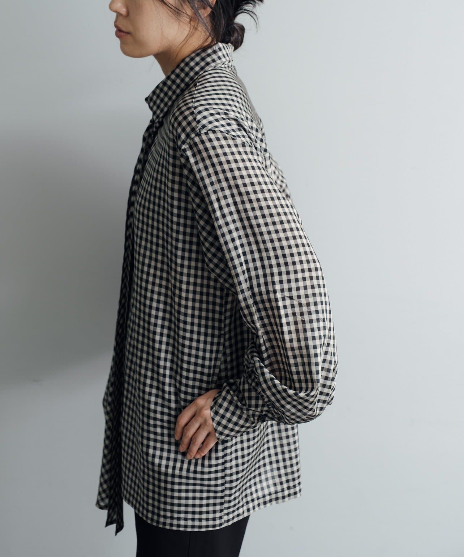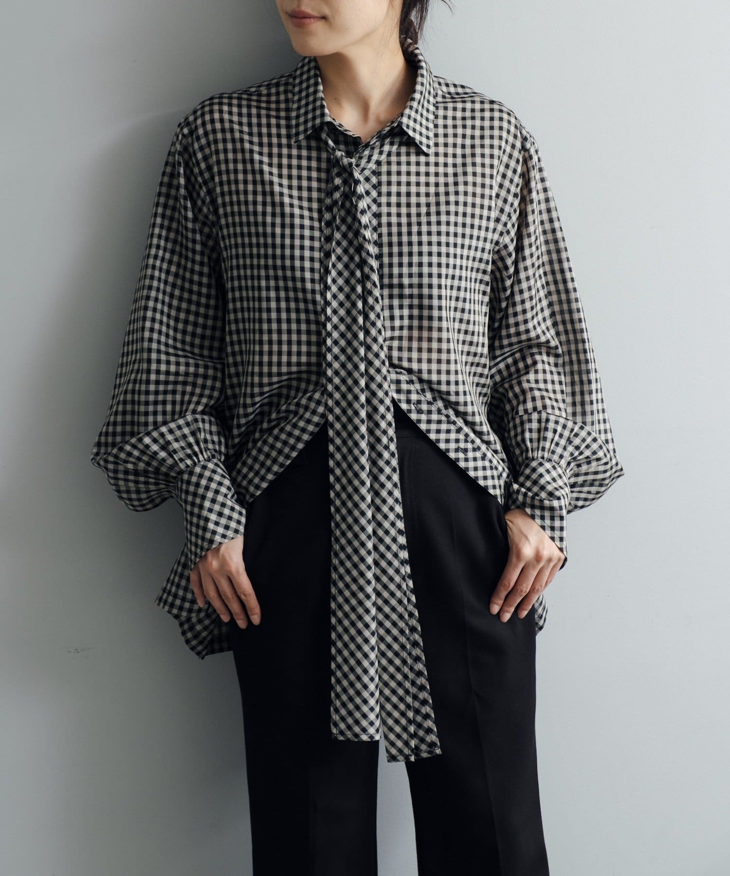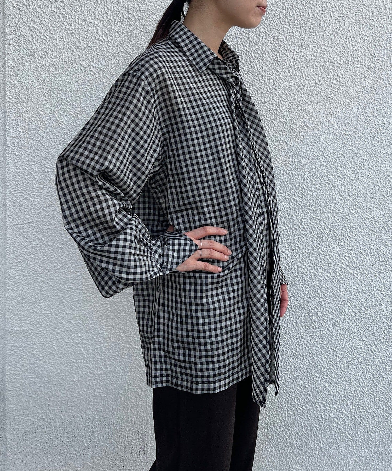 使用したのは、アセテート100%のギンガムチェックのシアー生地。素材の持つ特有のハリ感を活かして、美しいフォルムの贅沢なBIGシャツに仕立てました。腰がしっかりと隠れる長さ。袖口にはたっぷりとギャザーを寄せてボリューム感を出しています。