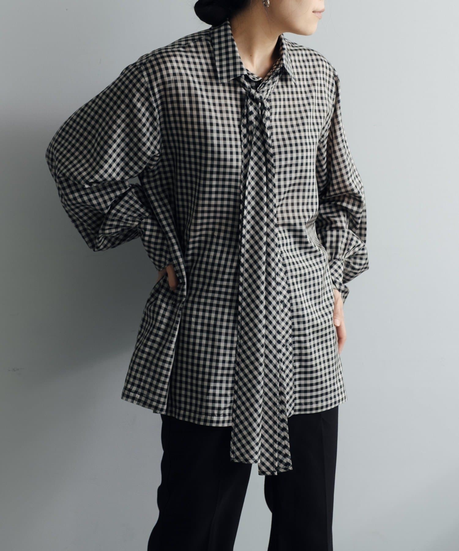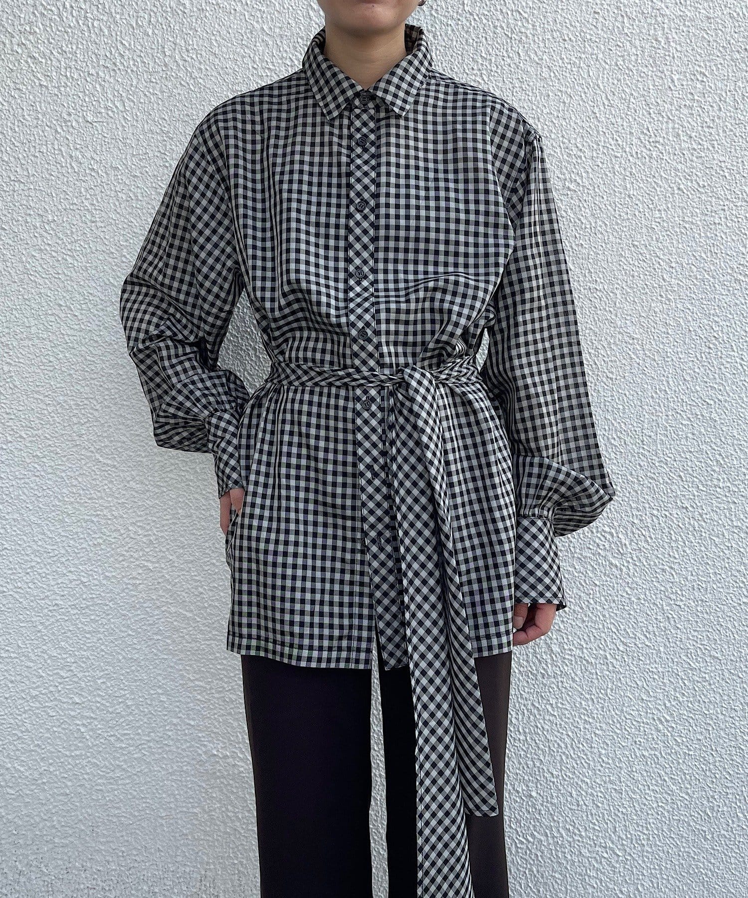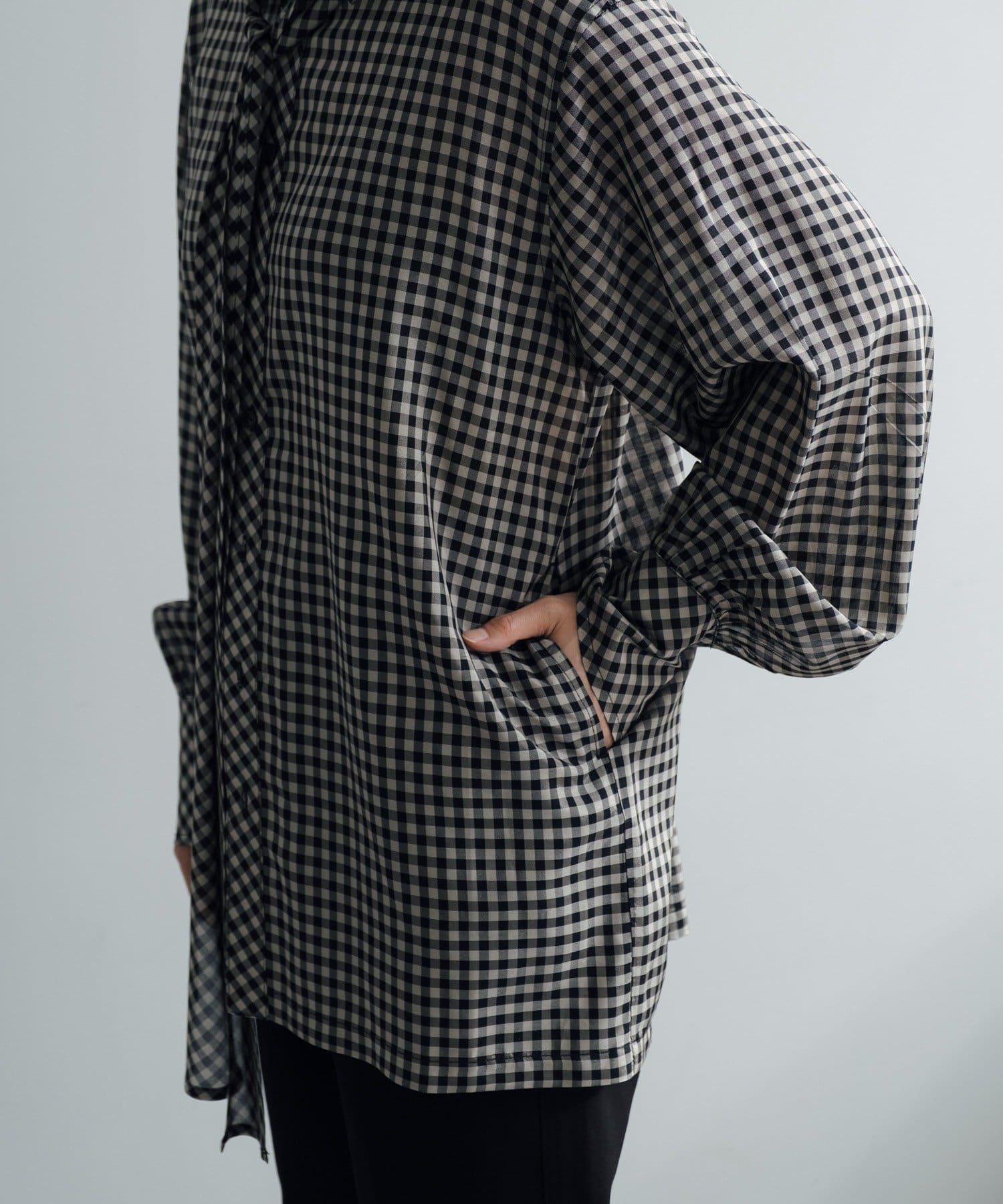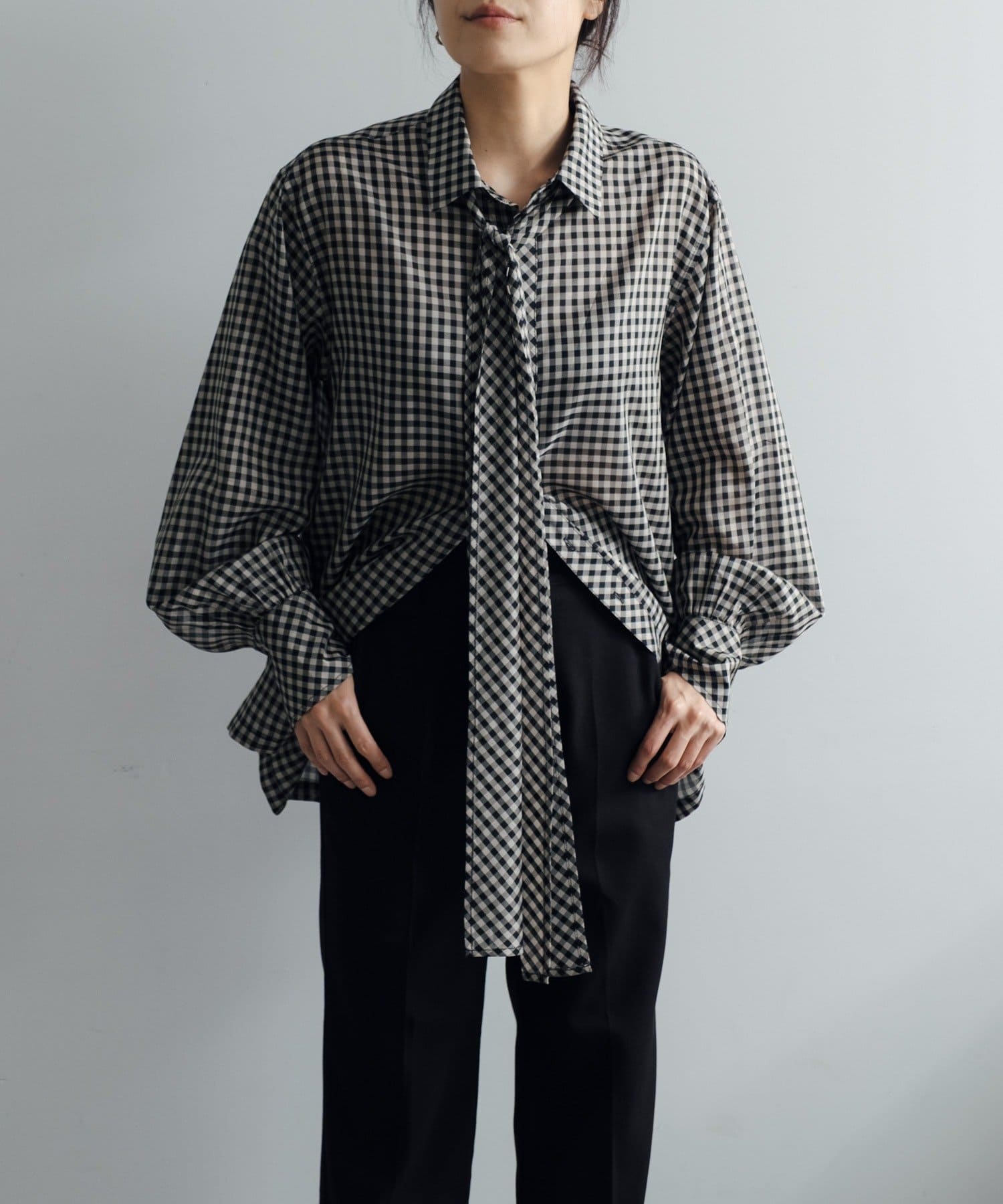 使用したのは、アセテート100%のギンガムチェックのシアー生地。素材の持つ特有のハリ感を活かして、美しいフォルムの贅沢なBIGシャツに仕立てました。腰がしっかりと隠れる長さ。袖口にはたっぷりとギャザーを寄せてボリューム感を出しています。