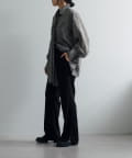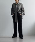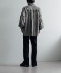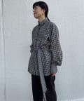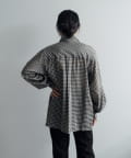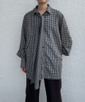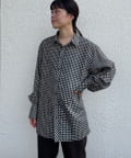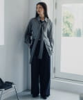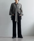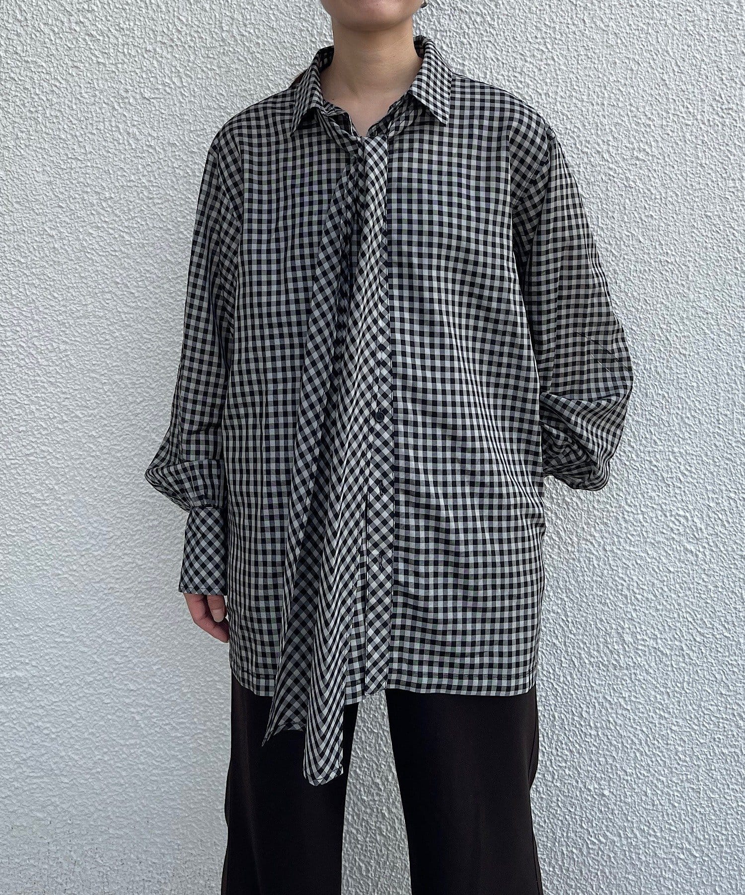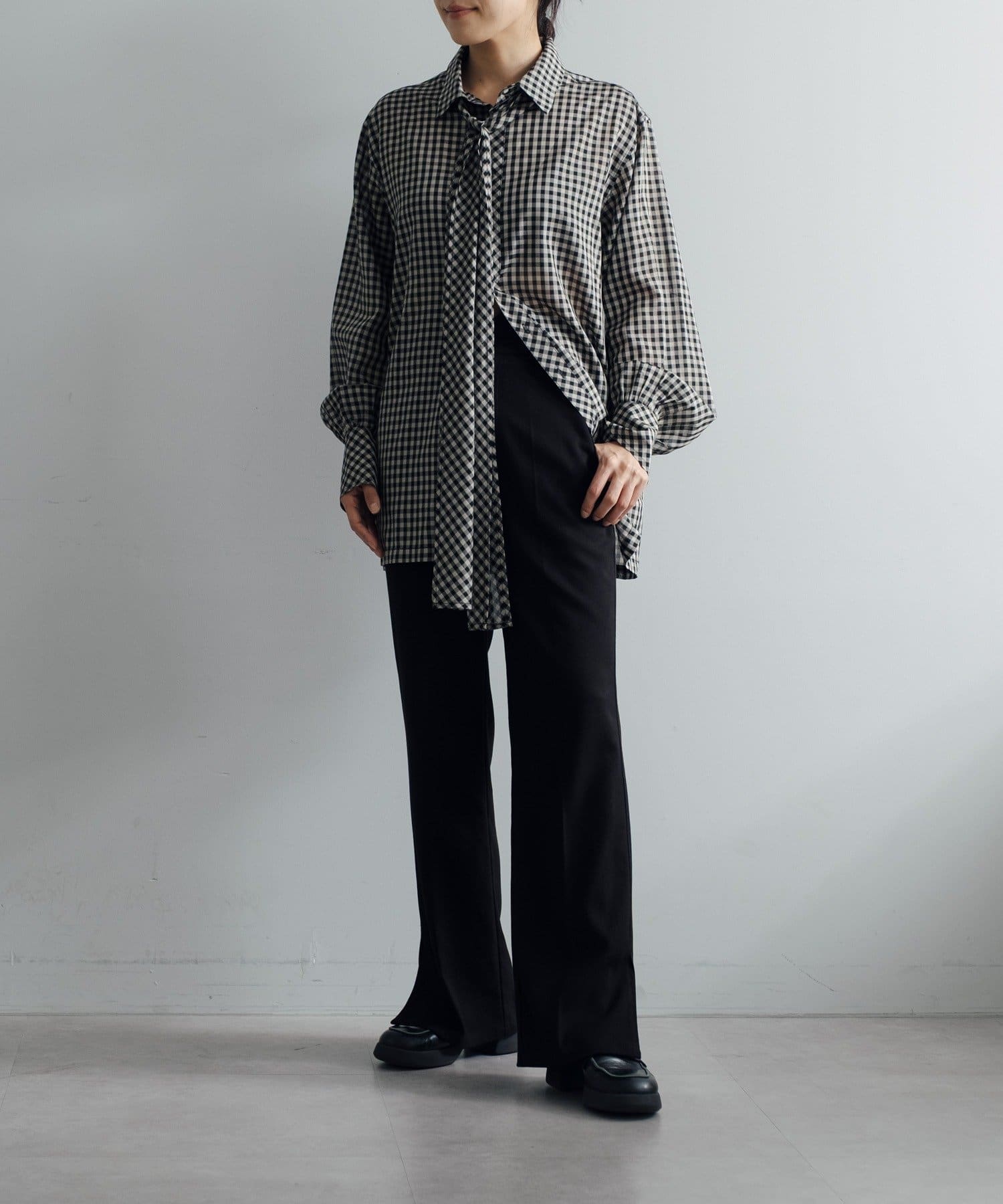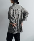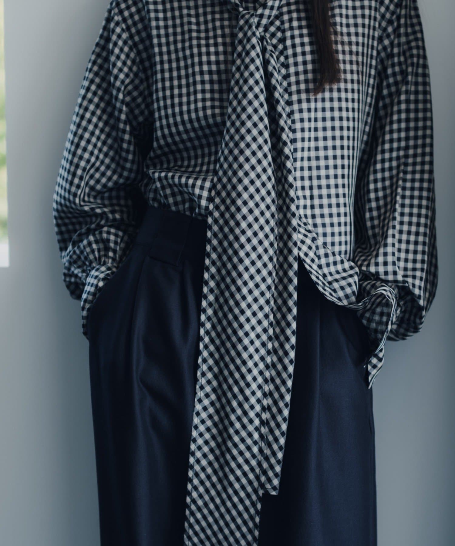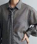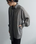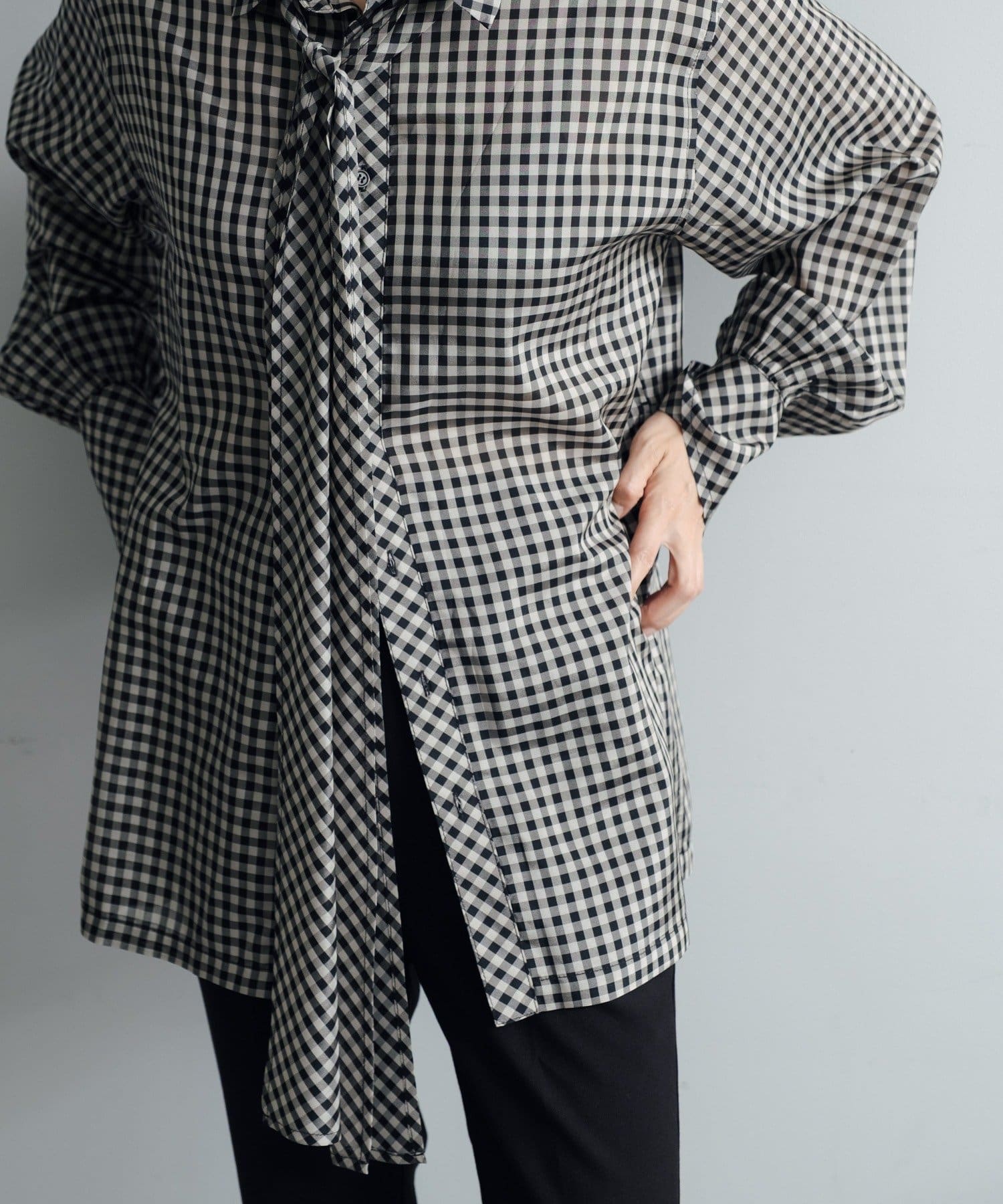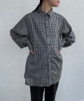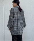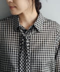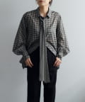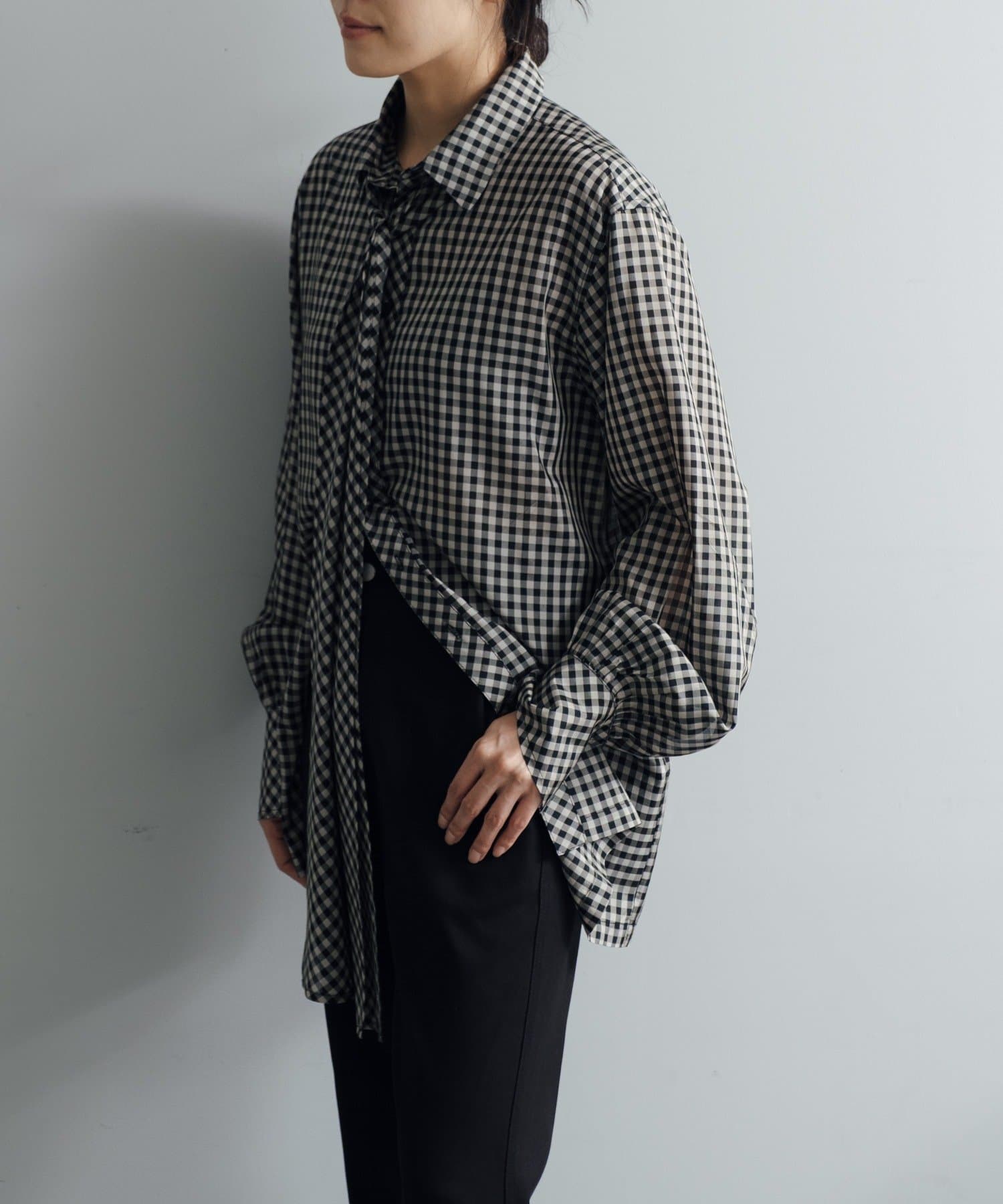 使用したのは、アセテート100%のギンガムチェックのシアー生地。素材の持つ特有のハリ感を活かして、美しいフォルムの贅沢なBIGシャツに仕立てました。腰がしっかりと隠れる長さ。袖口にはたっぷりとギャザーを寄せてボリューム感を出しています。