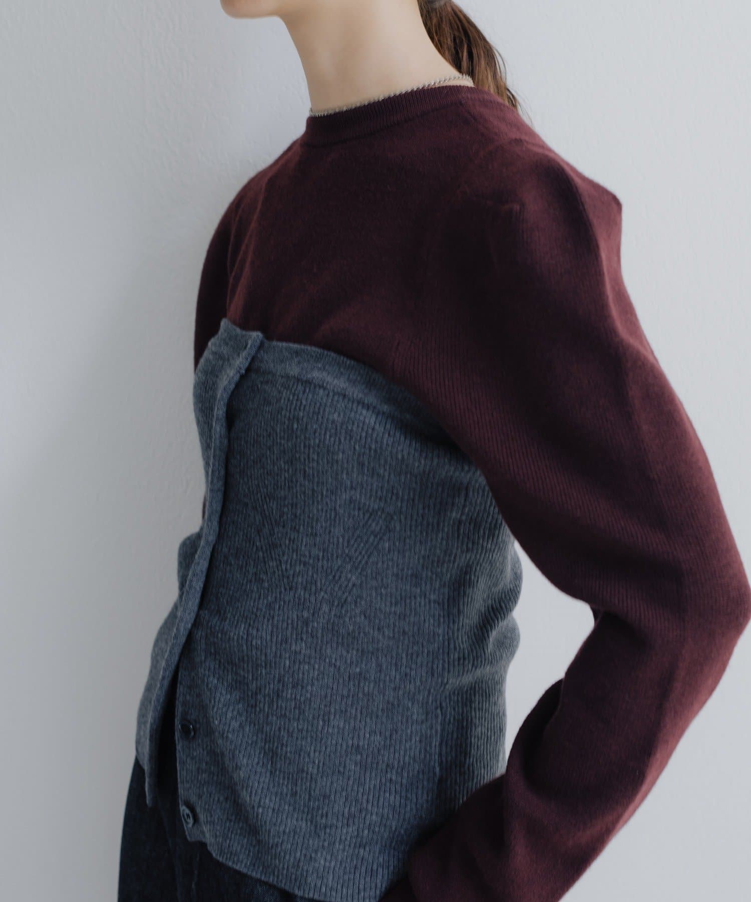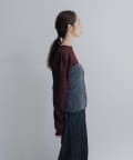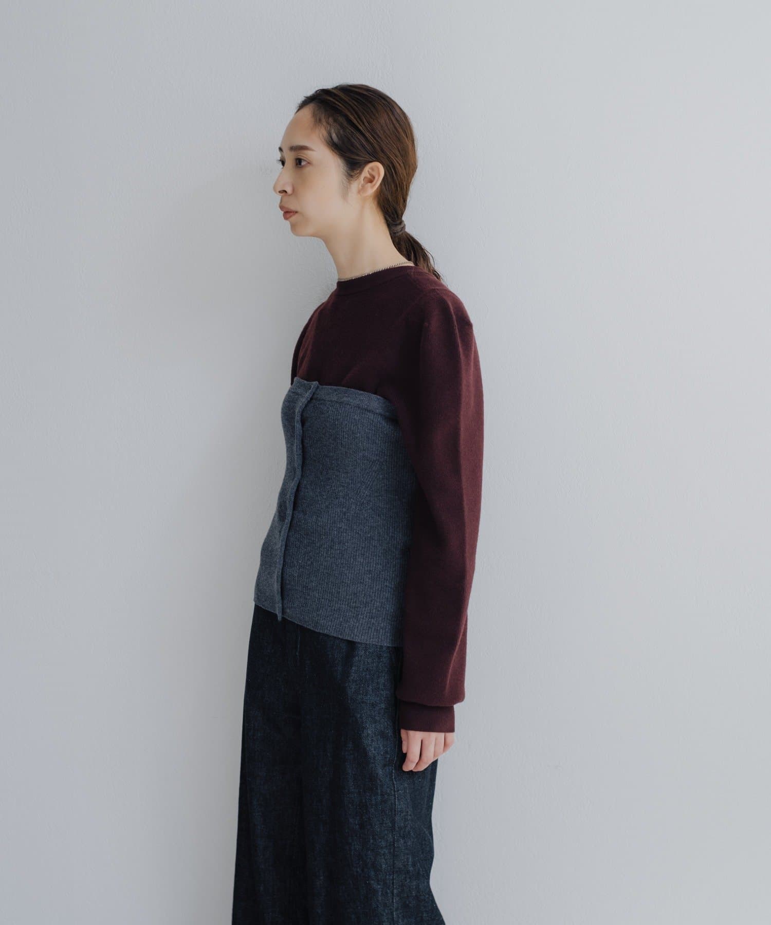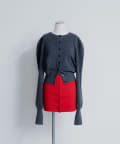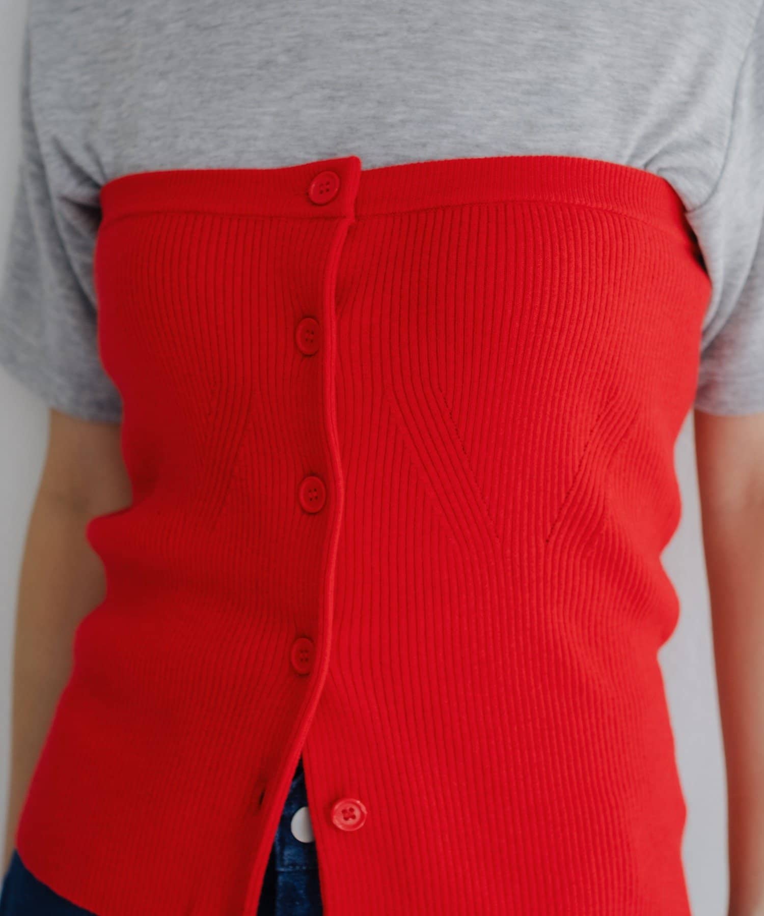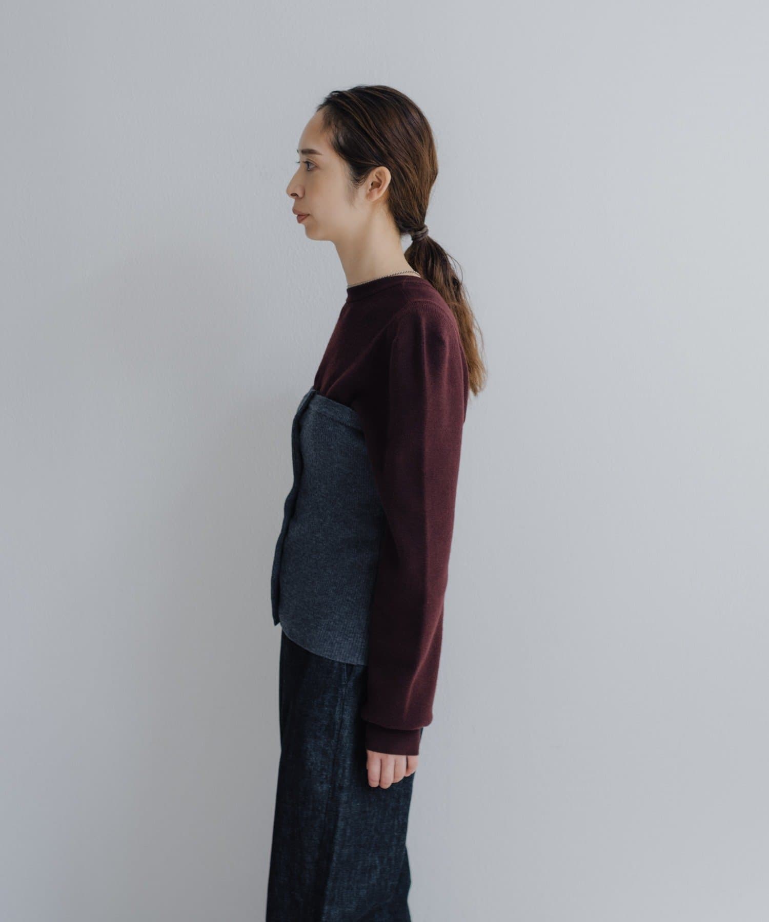 さらに、共糸でノベルティとしてビスチェを付けました。カーディガンとの着用はもちろん、まだ暑い時期からTシャツにあわせたり、寒くなったらネックウォーマーとしても活躍します。グレーには赤ビスチェ、バーガンディにはグレーのビスチェが付いてきます。