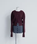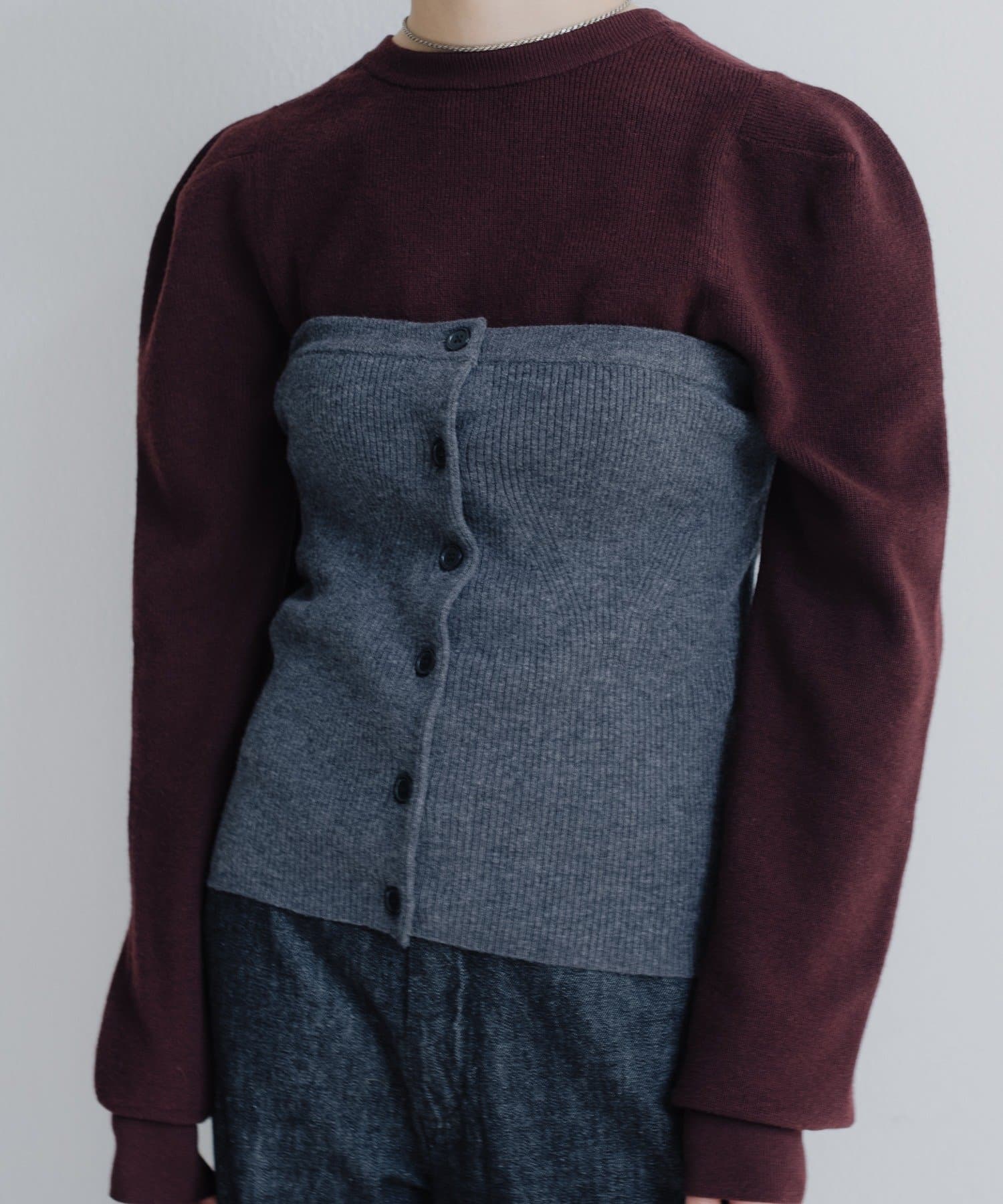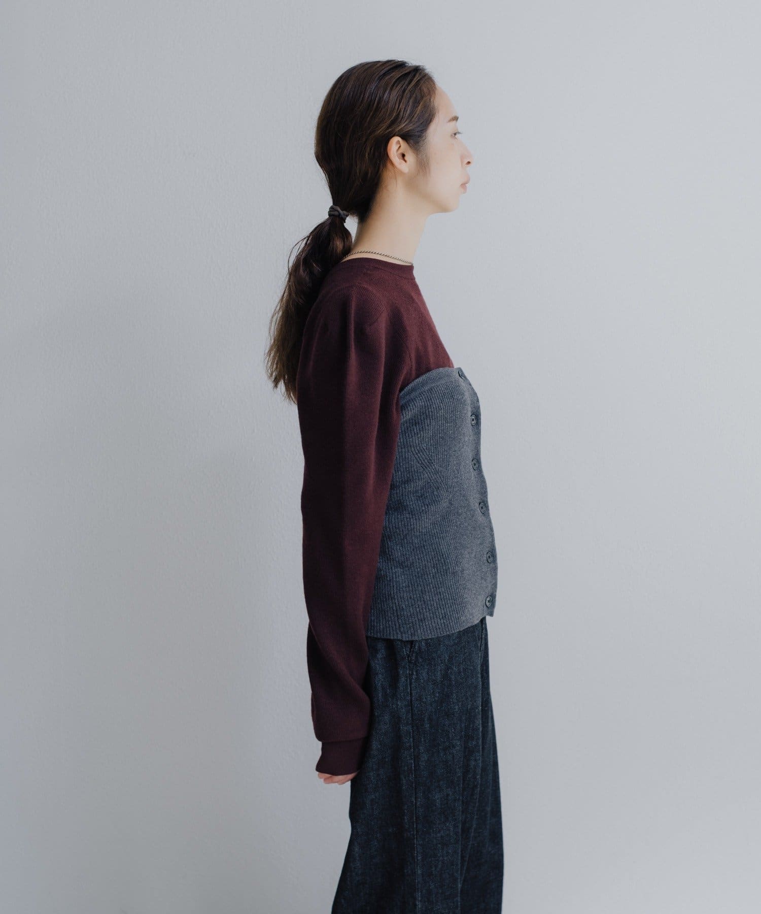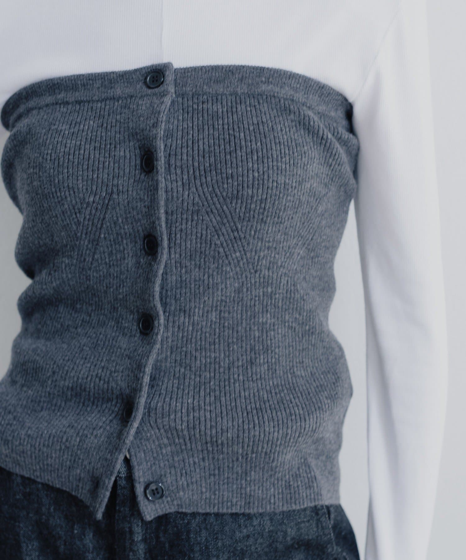 さらに、共糸でノベルティとしてビスチェを付けました。カーディガンとの着用はもちろん、まだ暑い時期からTシャツにあわせたり、寒くなったらネックウォーマーとしても活躍します。グレーには赤ビスチェ、バーガンディにはグレーのビスチェが付いてきます。