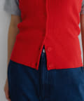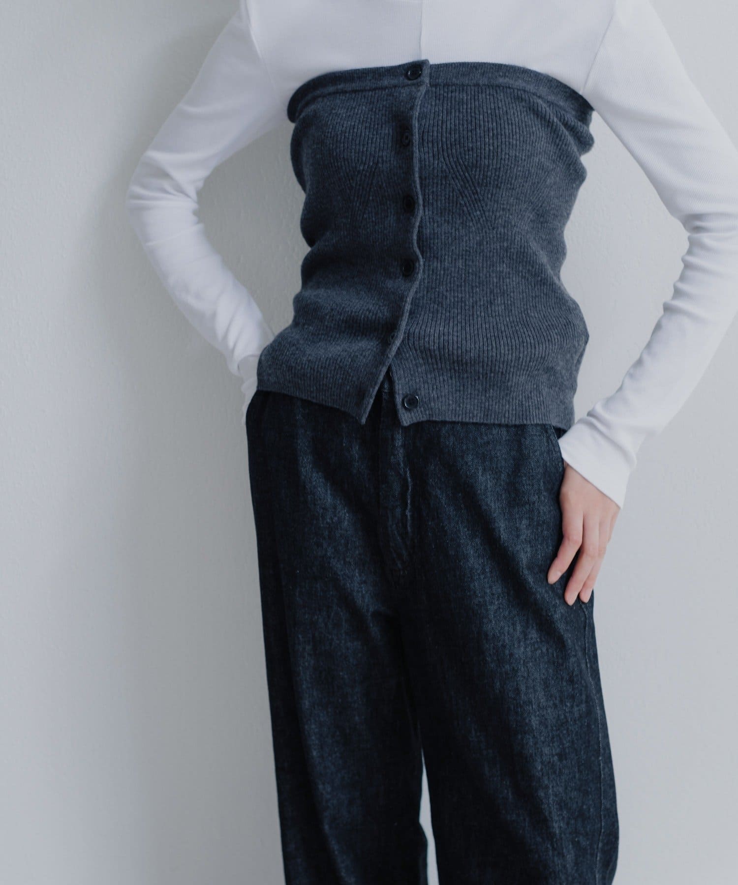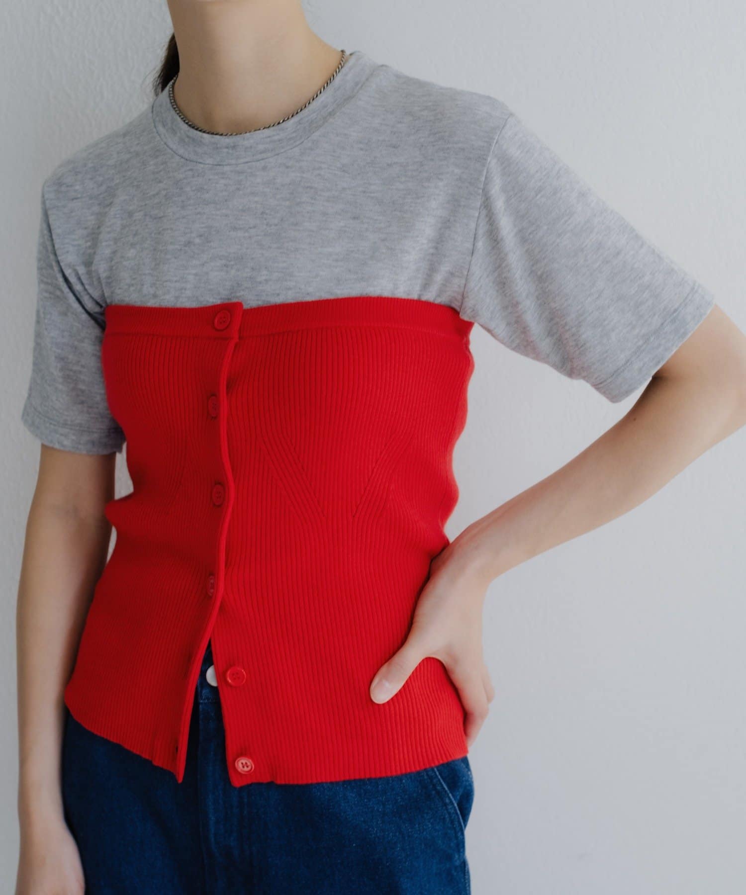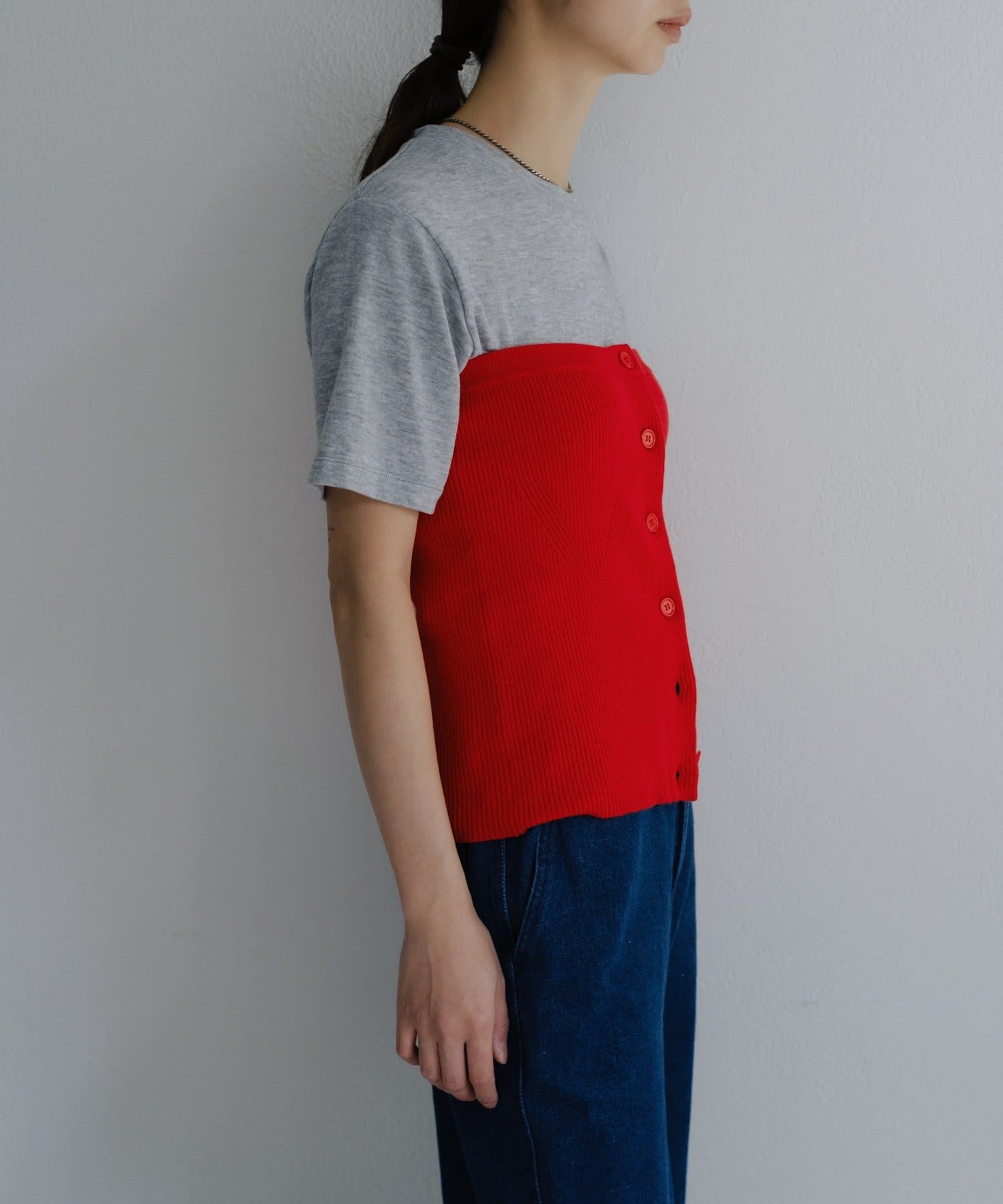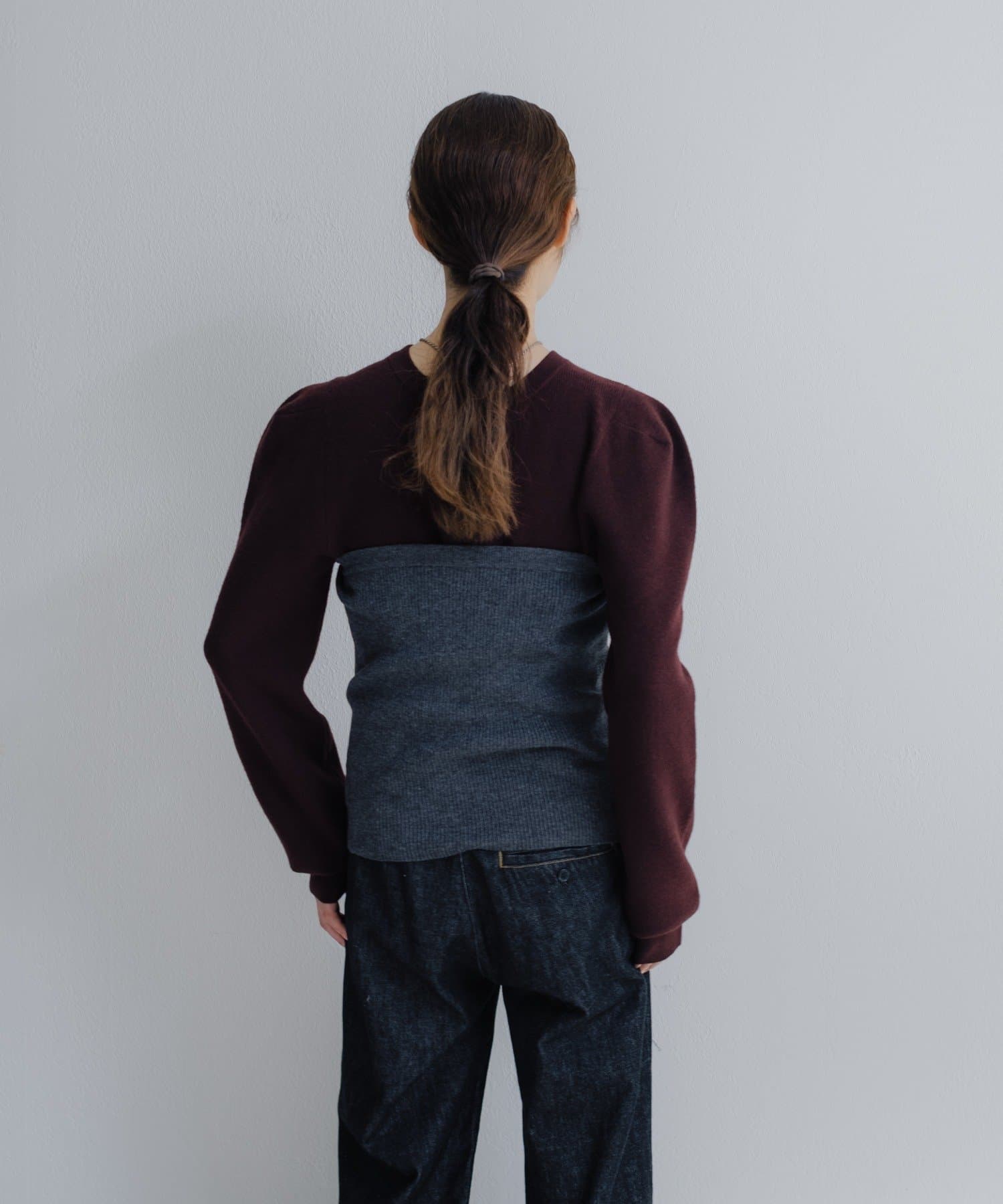 さらに、共糸でノベルティとしてビスチェを付けました。カーディガンとの着用はもちろん、まだ暑い時期からTシャツにあわせたり、寒くなったらネックウォーマーとしても活躍します。グレーには赤ビスチェ、バーガンディにはグレーのビスチェが付いてきます。