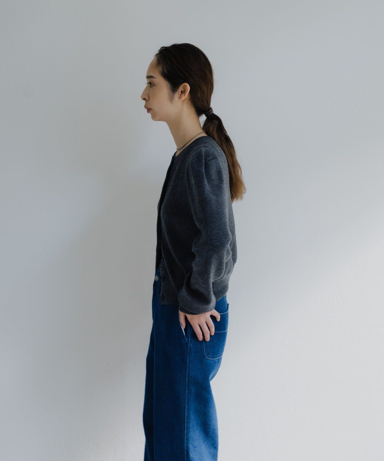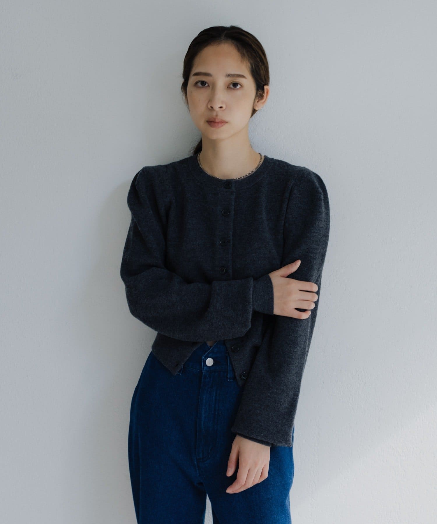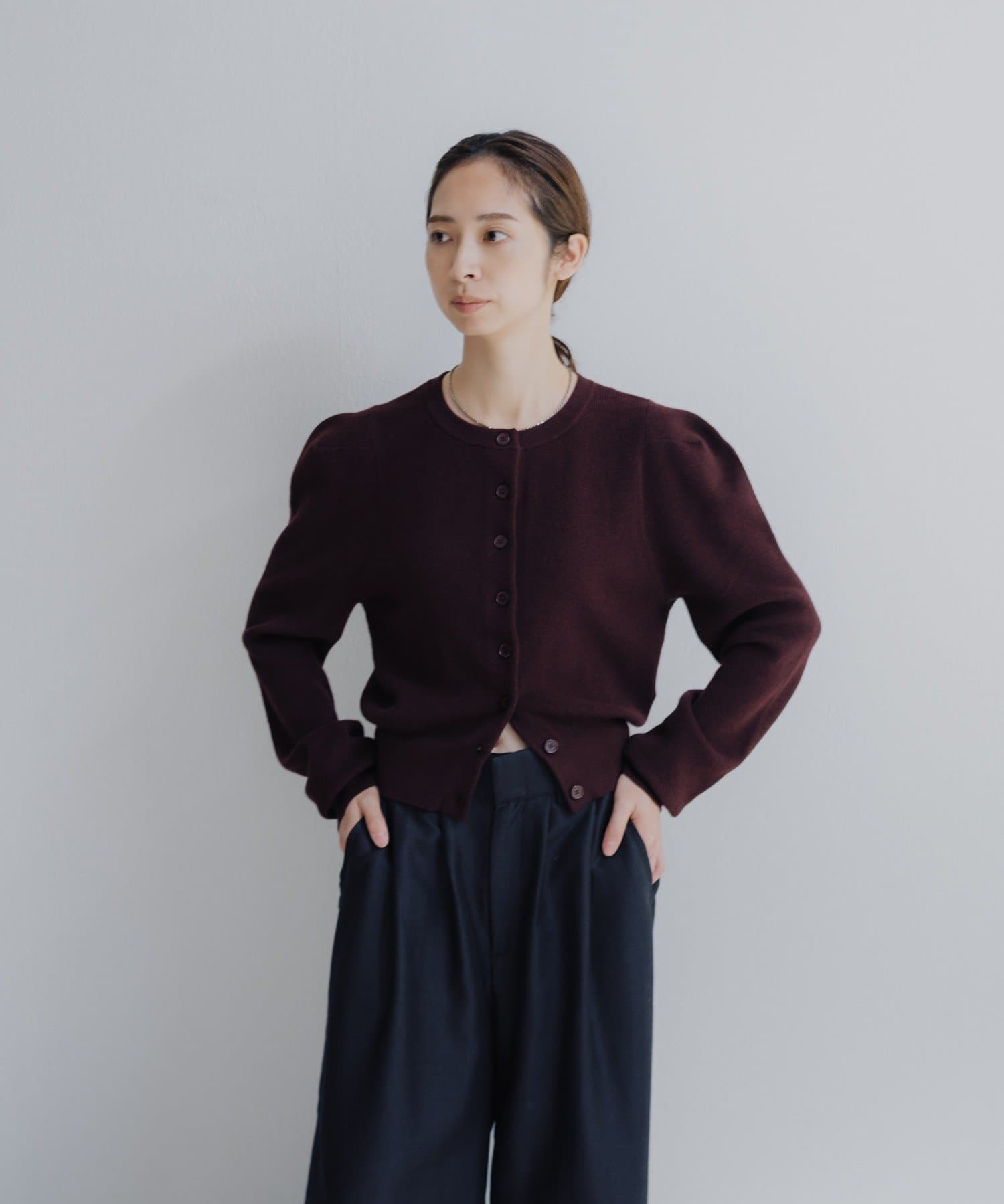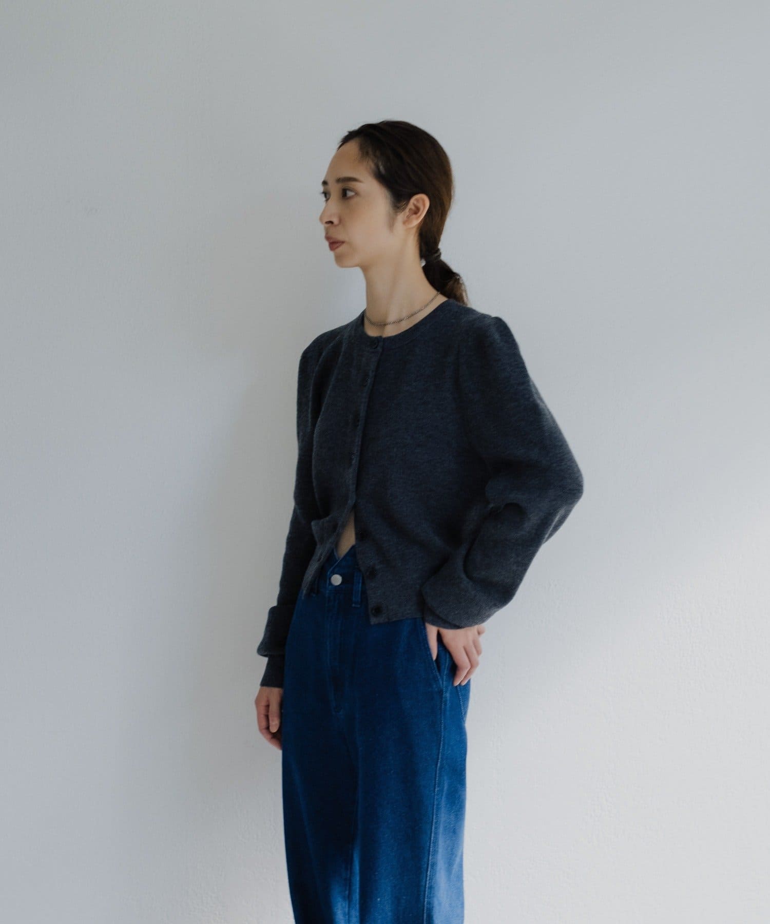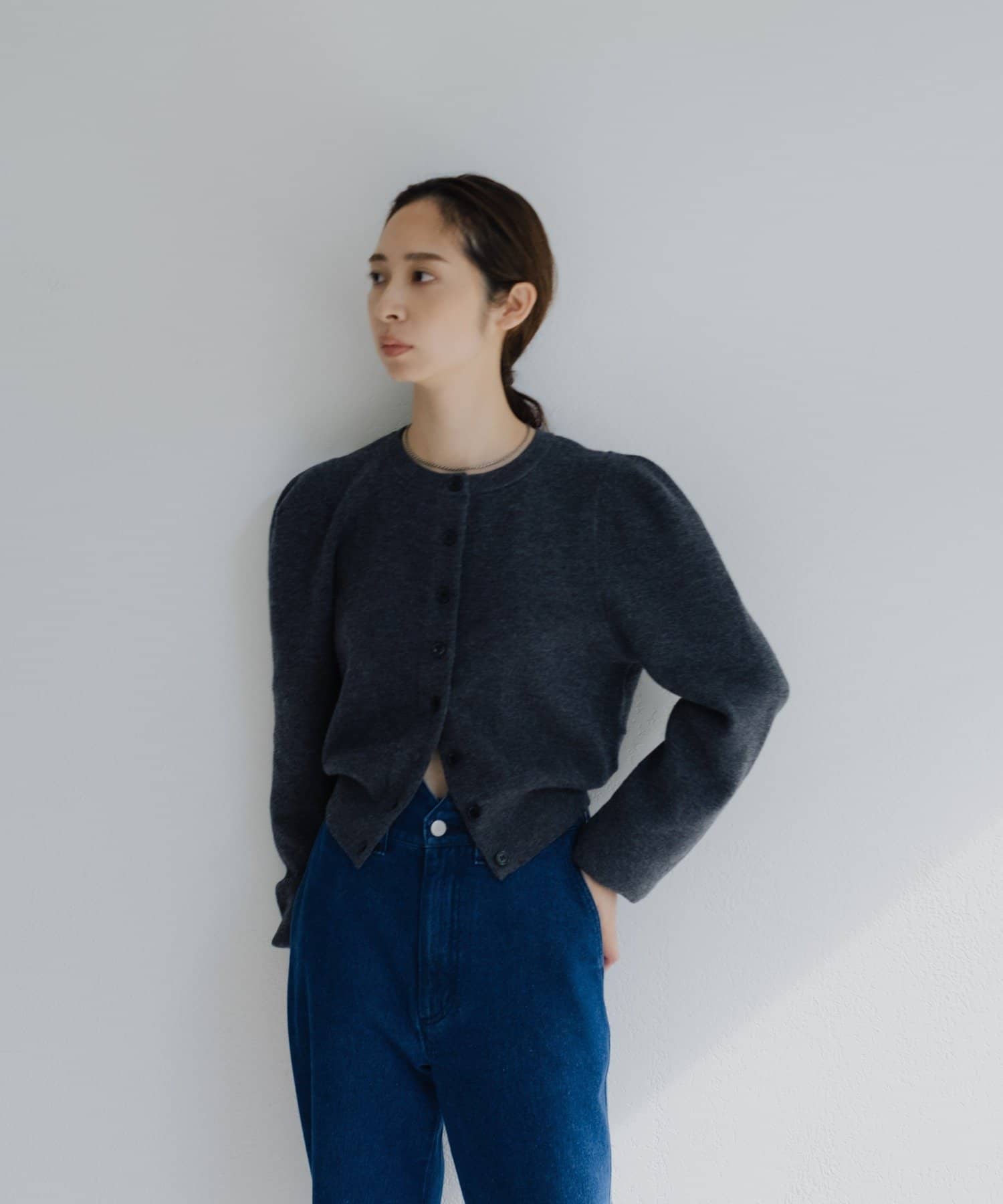 ナチュラルになりすぎず、かといって張り切りすぎない、理想のニットカーディガンが出来ました。今シーズンの秋アウターは気温調整が簡単なカーディガンが活躍の予感。ワイドパンツとのスタイリングにバランスのとりやすい、コンパクトなサイジングに設定をしていますが、肩の丸みや上半身の厚みが悪目立ちしないようなシルエットづくりに拘りました。昨年作っていたアームカバーとSETの半袖ニットのショルダーデザインをベースに、袖山にタックを入れたりギャザーを入れず自然な丸いフォルムを形作っています。個性的になりすぎることなく綺麗にスタイルアップできる気分の上がる1着に仕上がりました。
