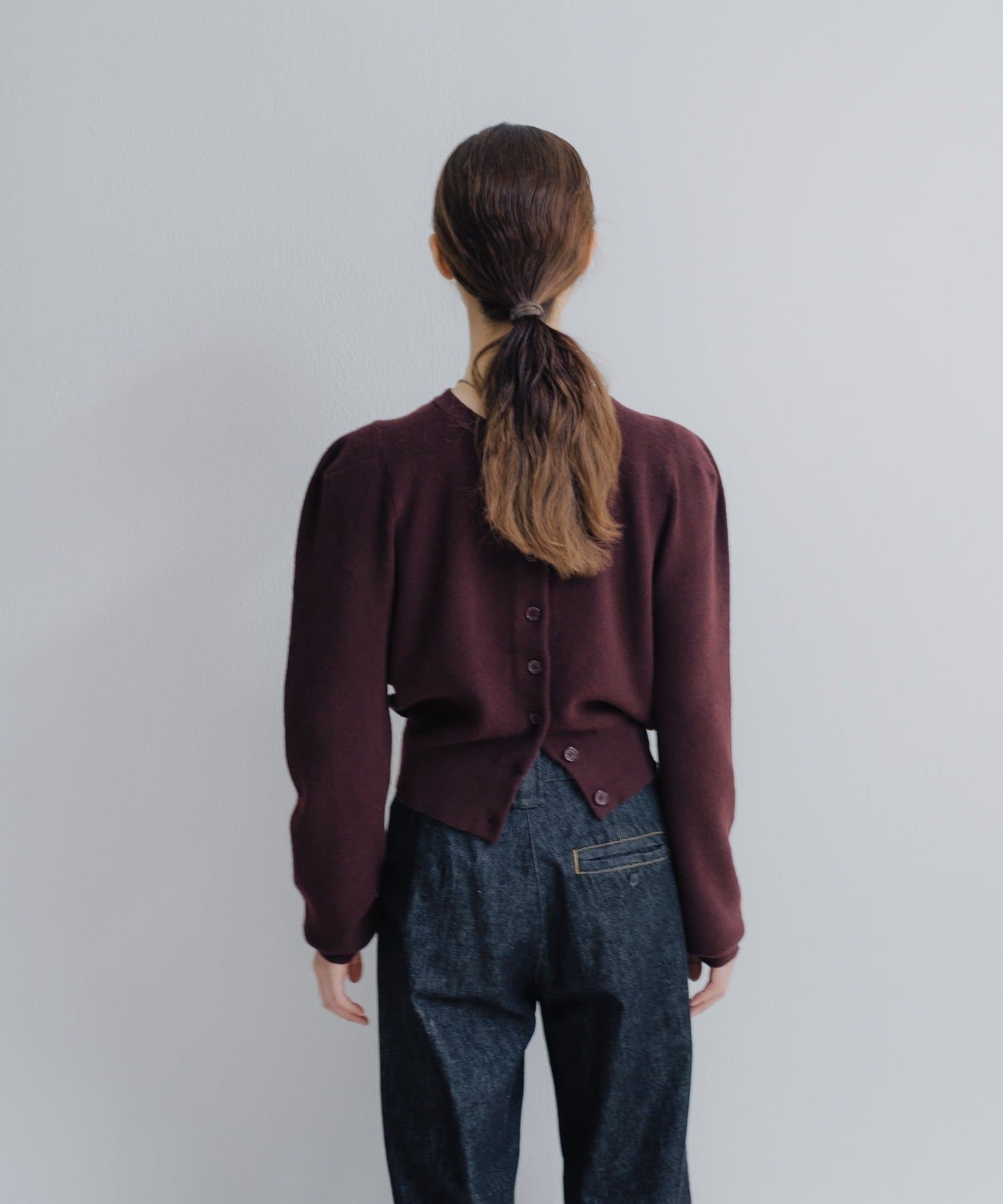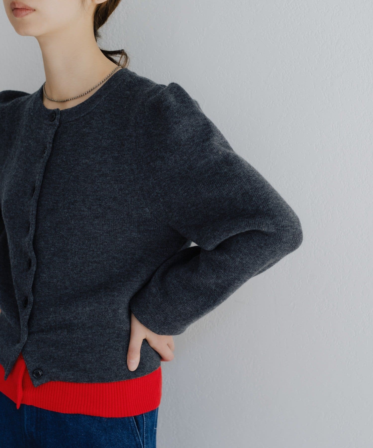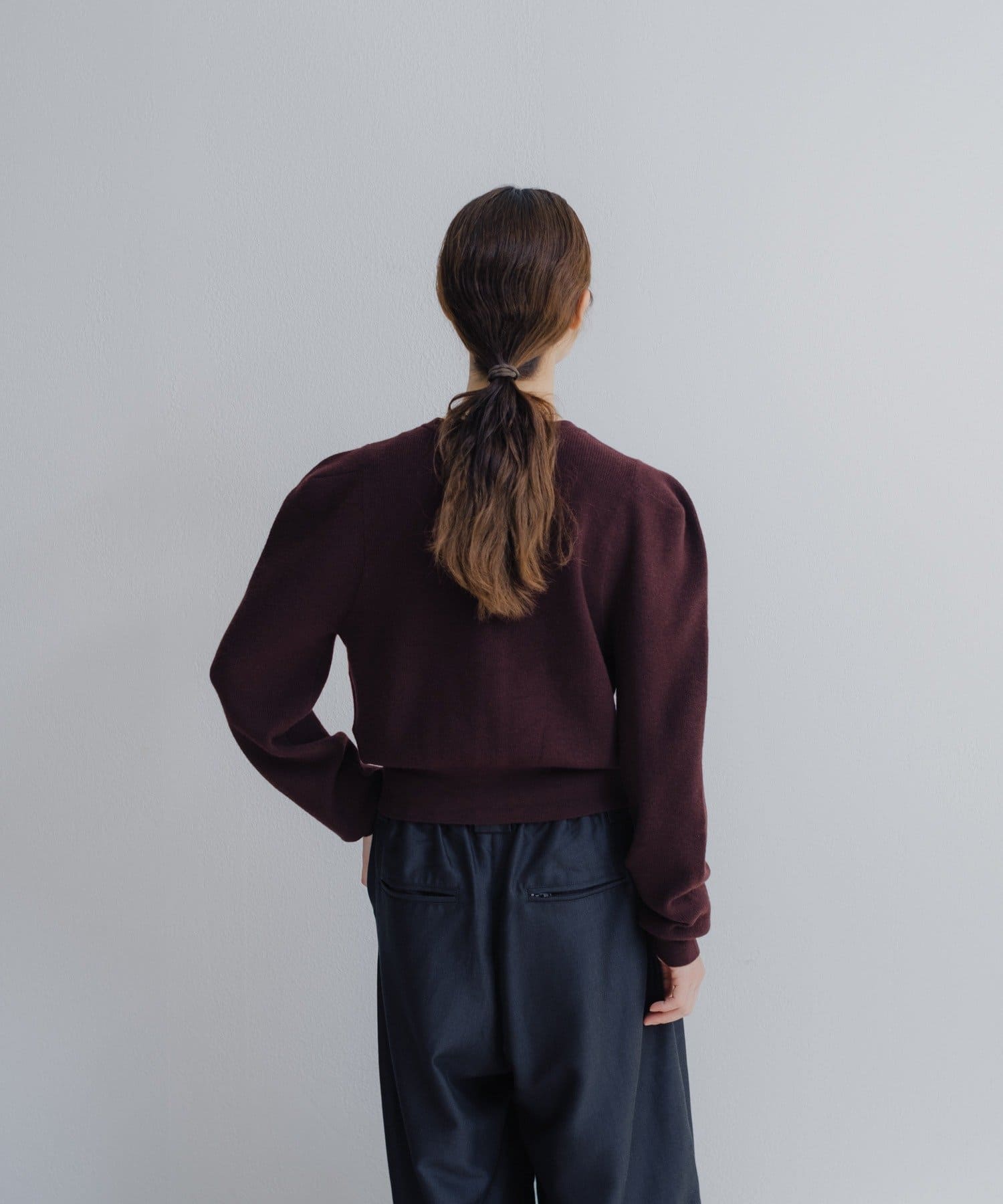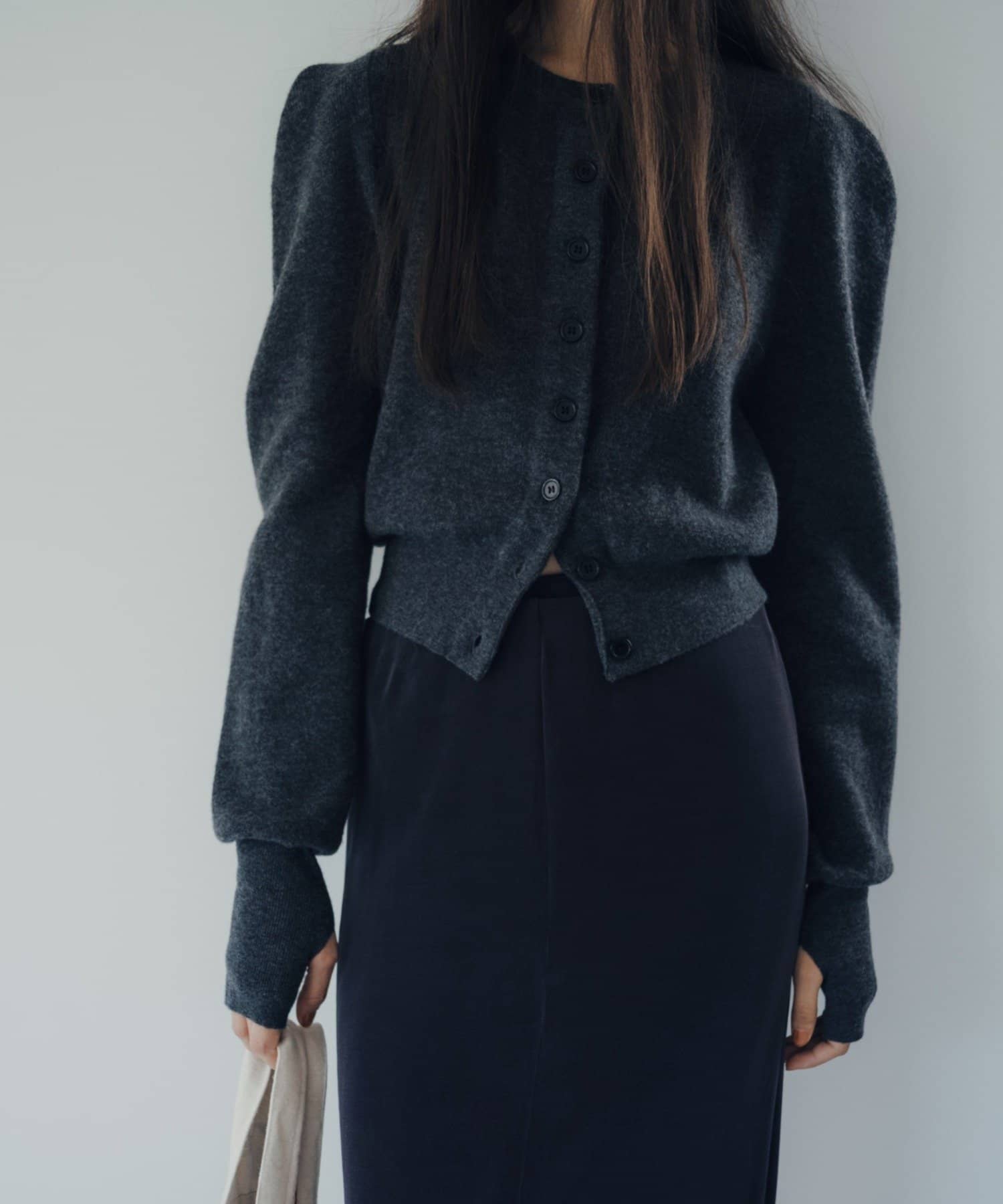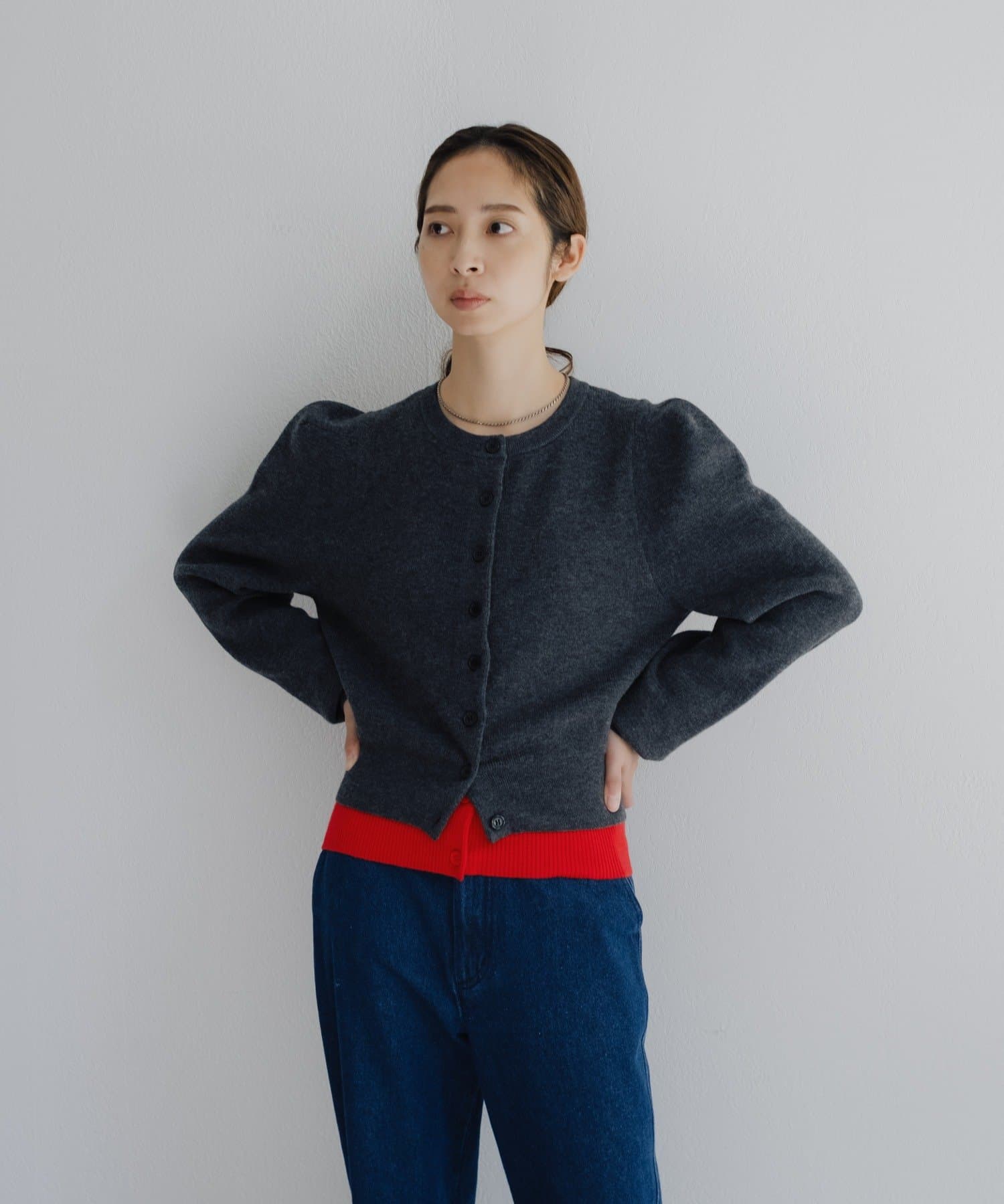 ナチュラルになりすぎず、かといって張り切りすぎない、理想のニットカーディガンが出来ました。今シーズンの秋アウターは気温調整が簡単なカーディガンが活躍の予感。ワイドパンツとのスタイリングにバランスのとりやすい、コンパクトなサイジングに設定をしていますが、肩の丸みや上半身の厚みが悪目立ちしないようなシルエットづくりに拘りました。昨年作っていたアームカバーとSETの半袖ニットのショルダーデザインをベースに、袖山にタックを入れたりギャザーを入れず自然な丸いフォルムを形作っています。個性的になりすぎることなく綺麗にスタイルアップできる気分の上がる1着に仕上がりました。