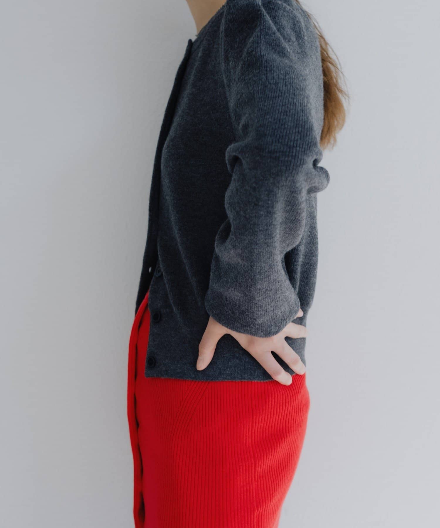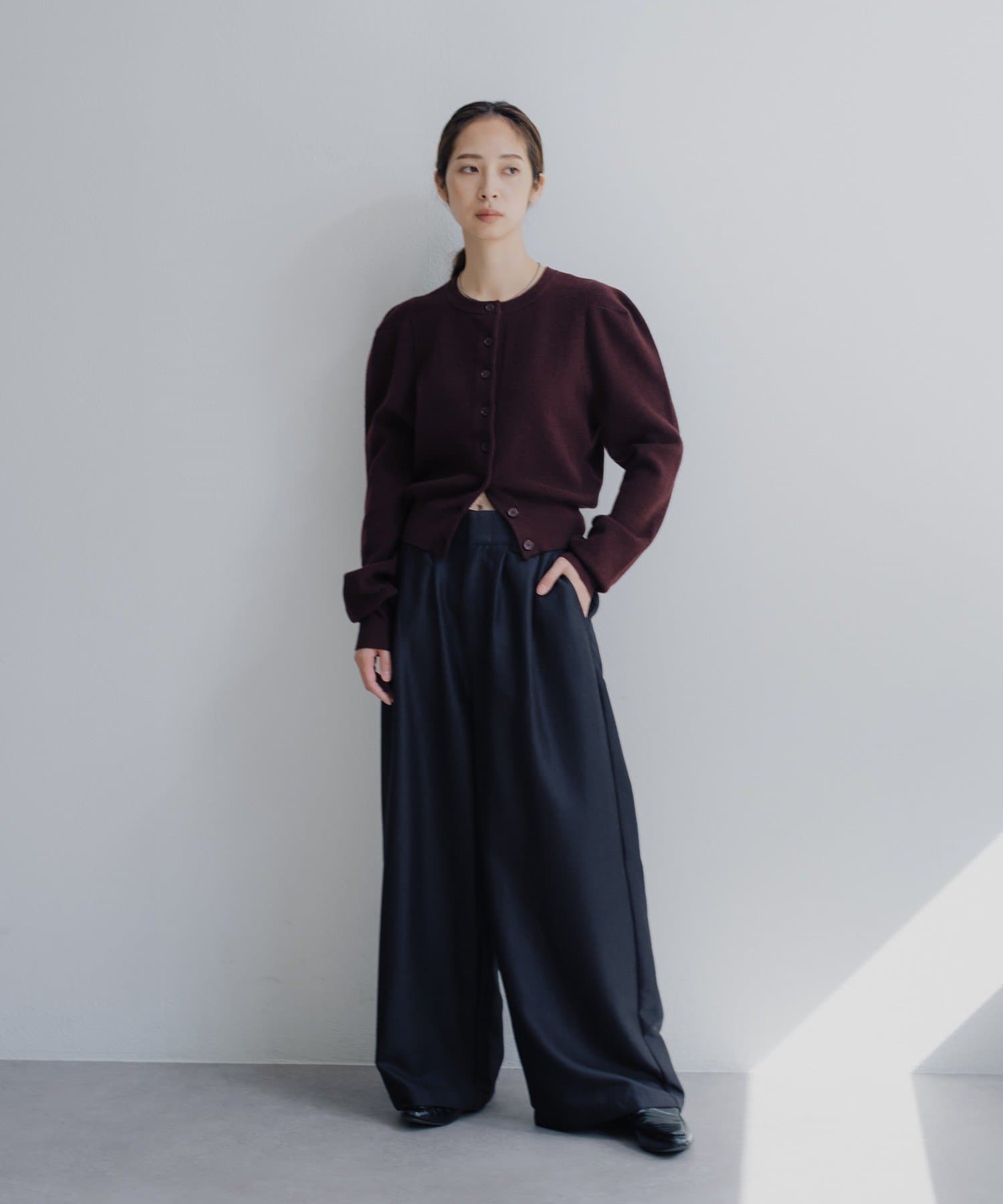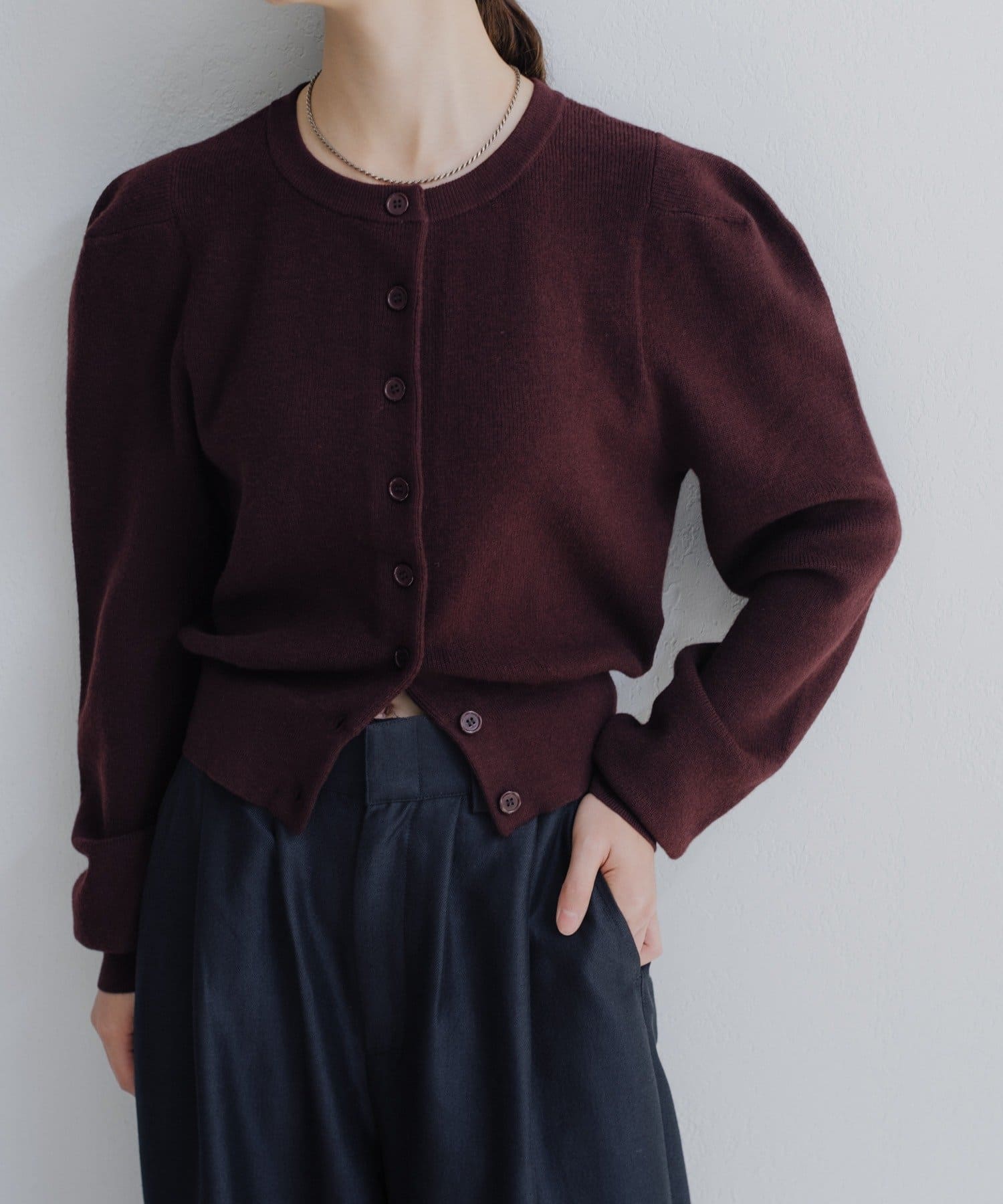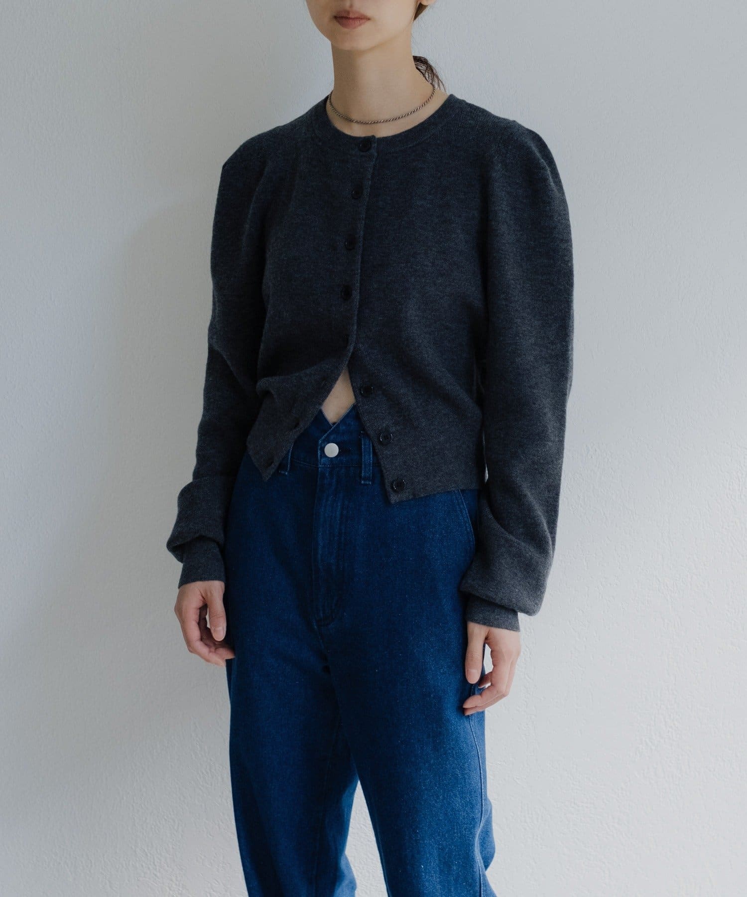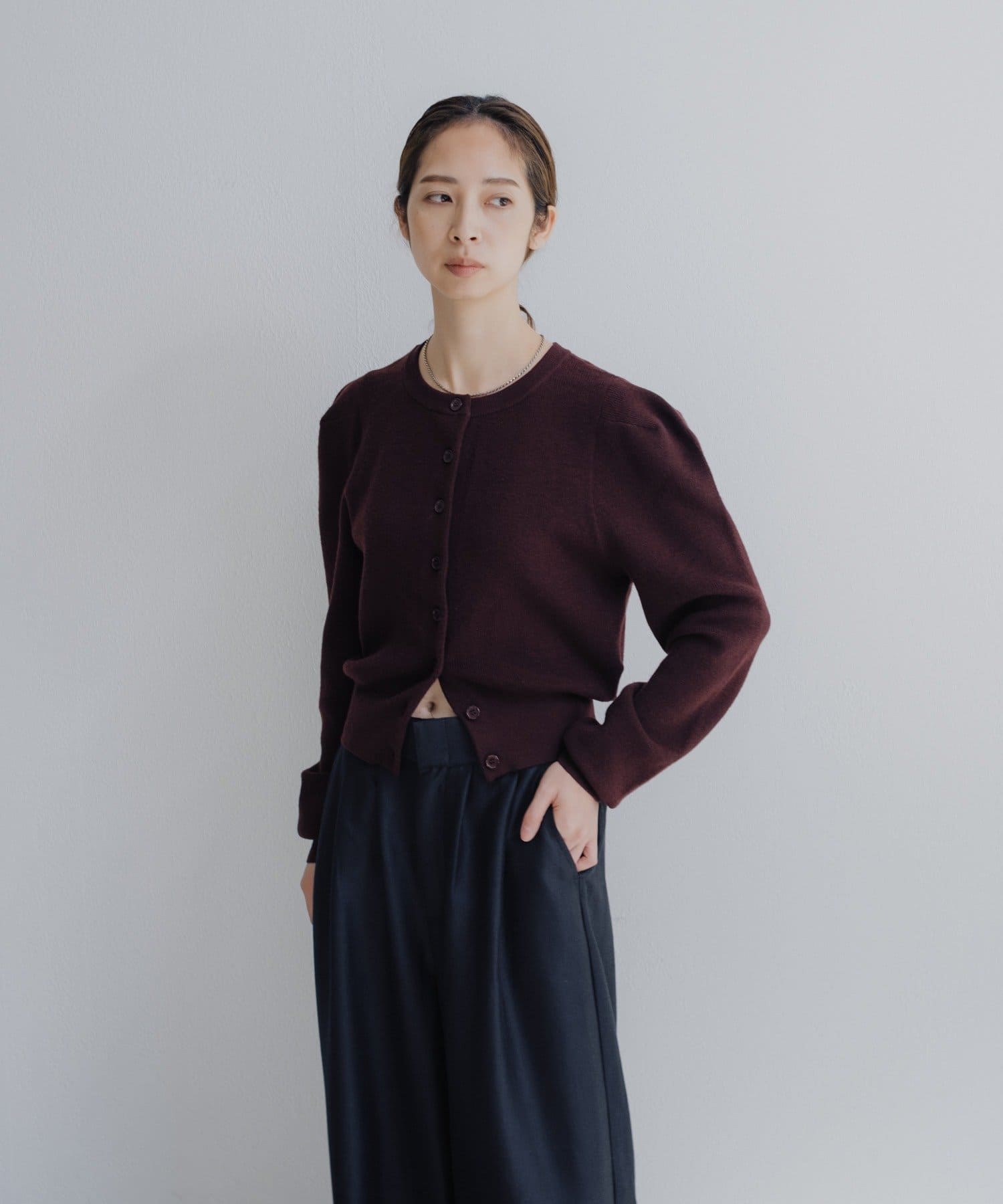 ナチュラルになりすぎず、かといって張り切りすぎない、理想のニットカーディガンが出来ました。今シーズンの秋アウターは気温調整が簡単なカーディガンが活躍の予感。ワイドパンツとのスタイリングにバランスのとりやすい、コンパクトなサイジングに設定をしていますが、肩の丸みや上半身の厚みが悪目立ちしないようなシルエットづくりに拘りました。昨年作っていたアームカバーとSETの半袖ニットのショルダーデザインをベースに、袖山にタックを入れたりギャザーを入れず自然な丸いフォルムを形作っています。個性的になりすぎることなく綺麗にスタイルアップできる気分の上がる1着に仕上がりました。