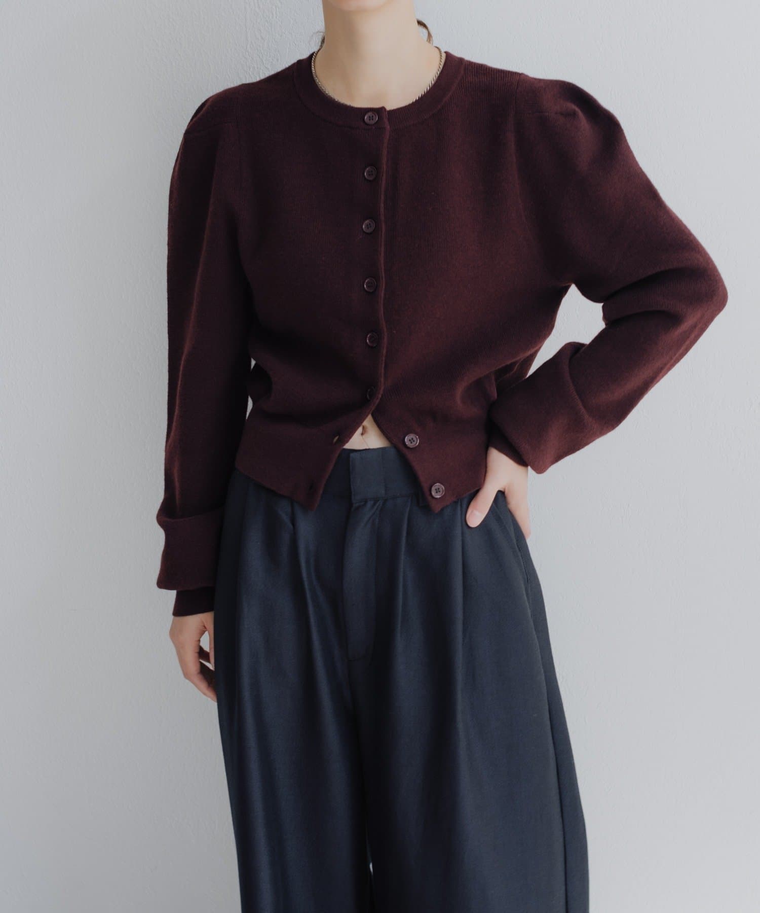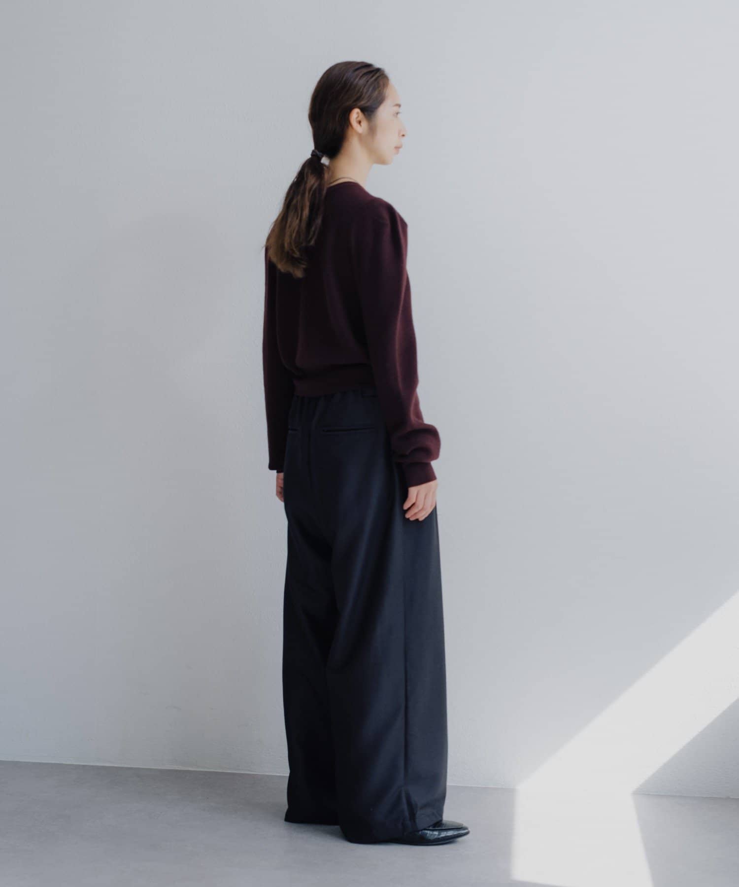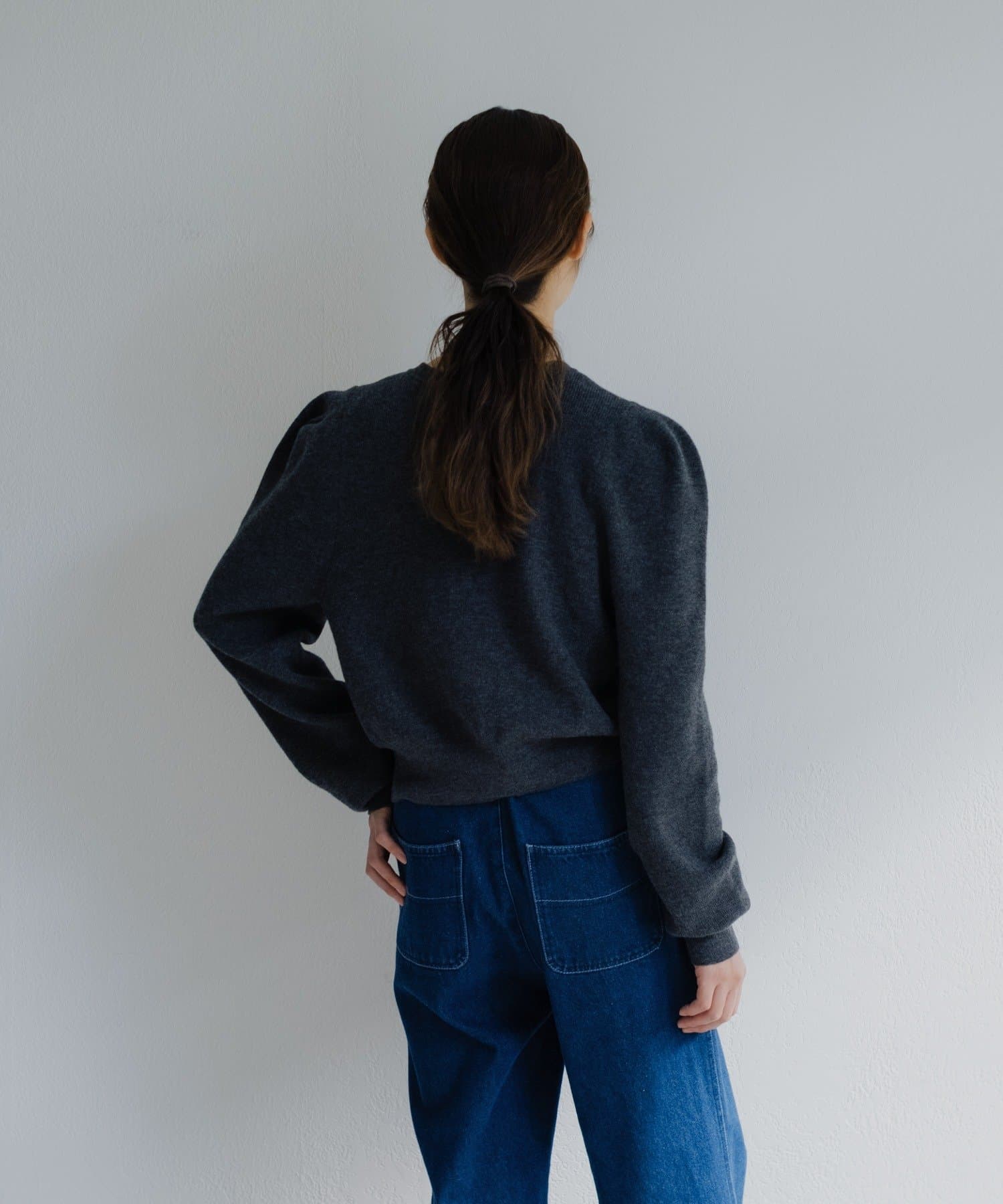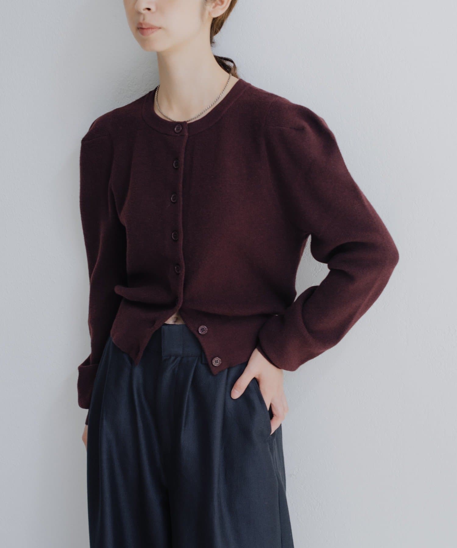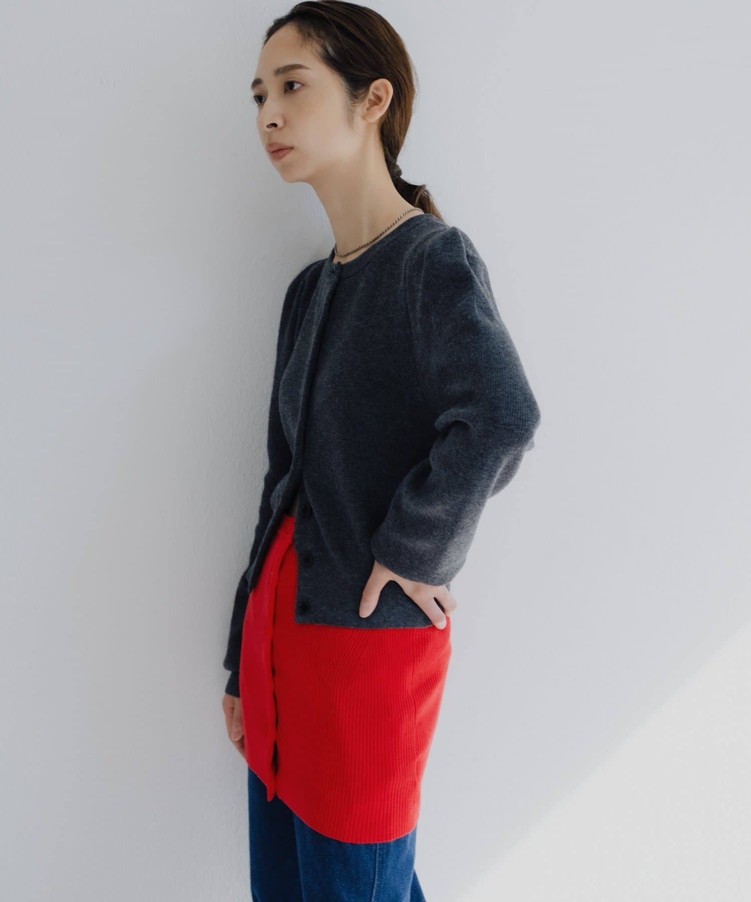 ナチュラルになりすぎず、かといって張り切りすぎない、理想のニットカーディガンが出来ました。今シーズンの秋アウターは気温調整が簡単なカーディガンが活躍の予感。ワイドパンツとのスタイリングにバランスのとりやすい、コンパクトなサイジングに設定をしていますが、肩の丸みや上半身の厚みが悪目立ちしないようなシルエットづくりに拘りました。昨年作っていたアームカバーとSETの半袖ニットのショルダーデザインをベースに、袖山にタックを入れたりギャザーを入れず自然な丸いフォルムを形作っています。個性的になりすぎることなく綺麗にスタイルアップできる気分の上がる1着に仕上がりました。