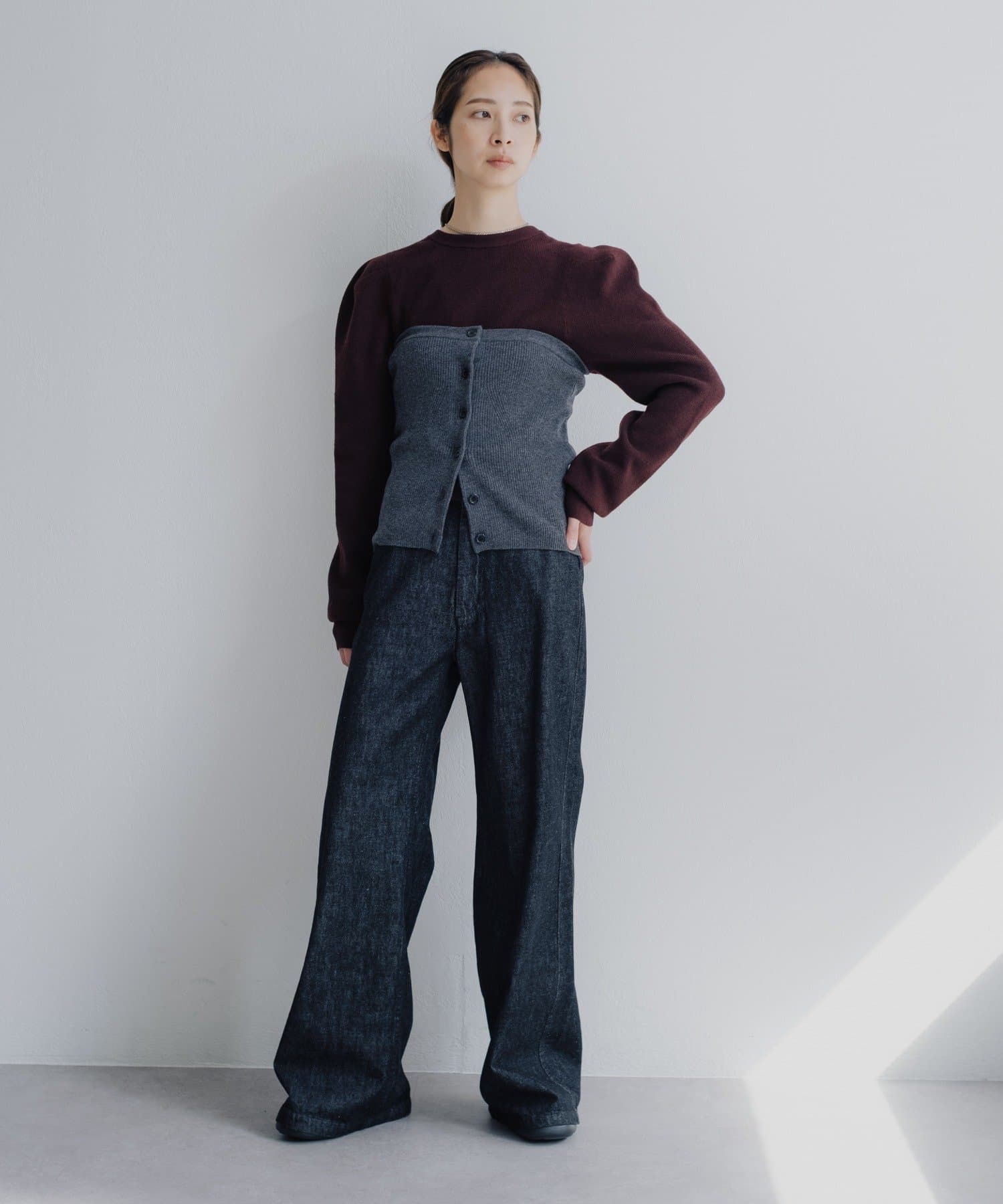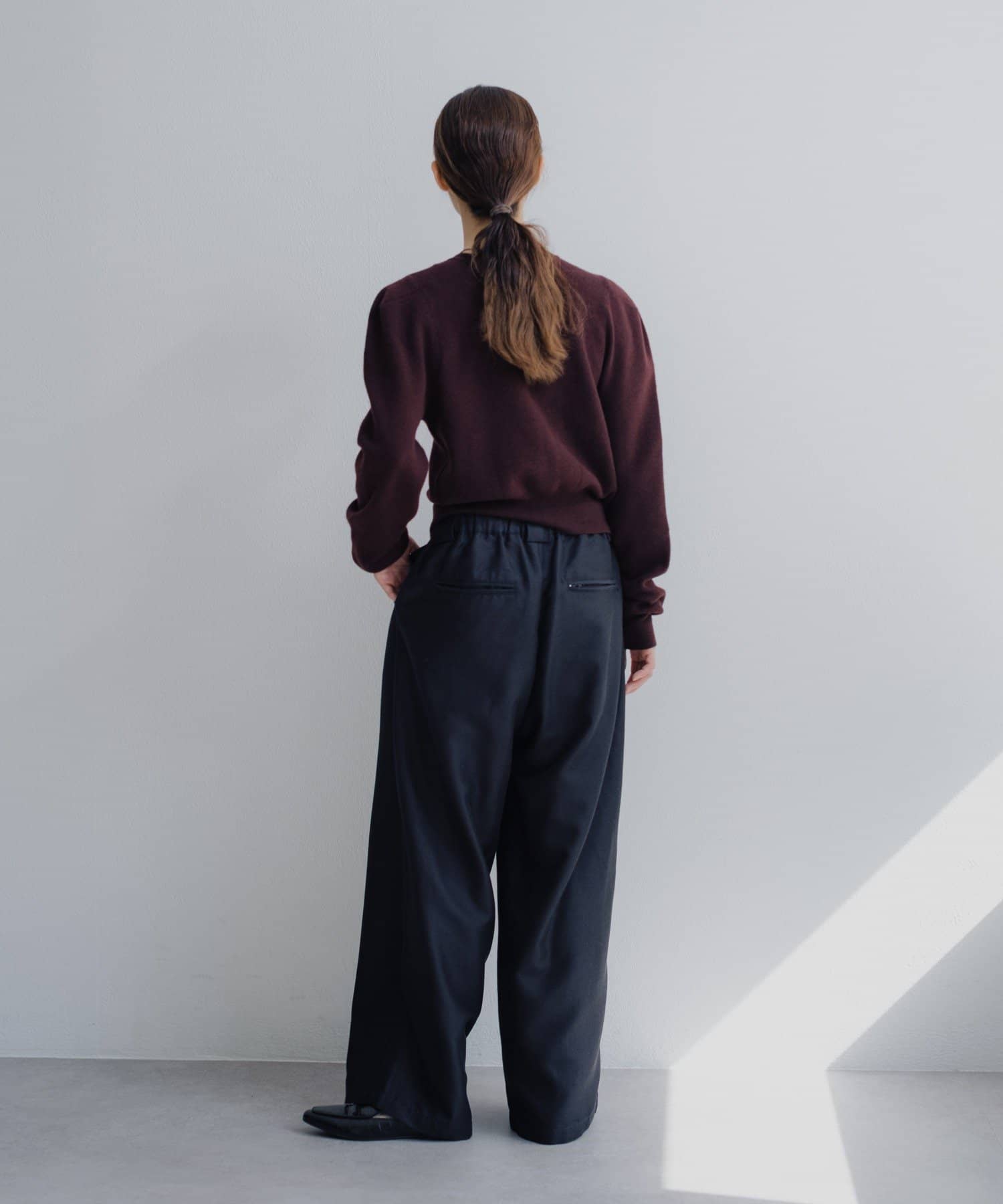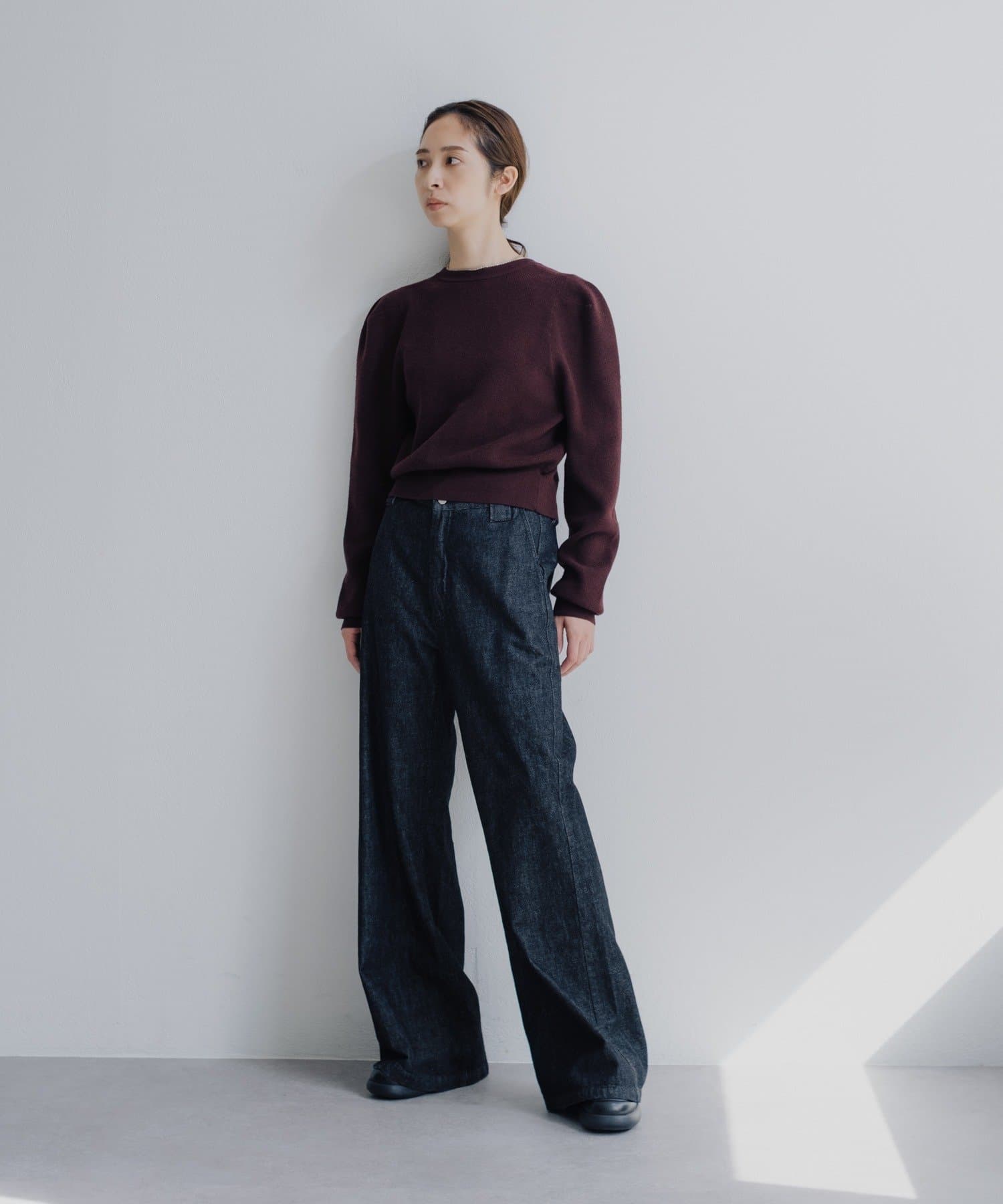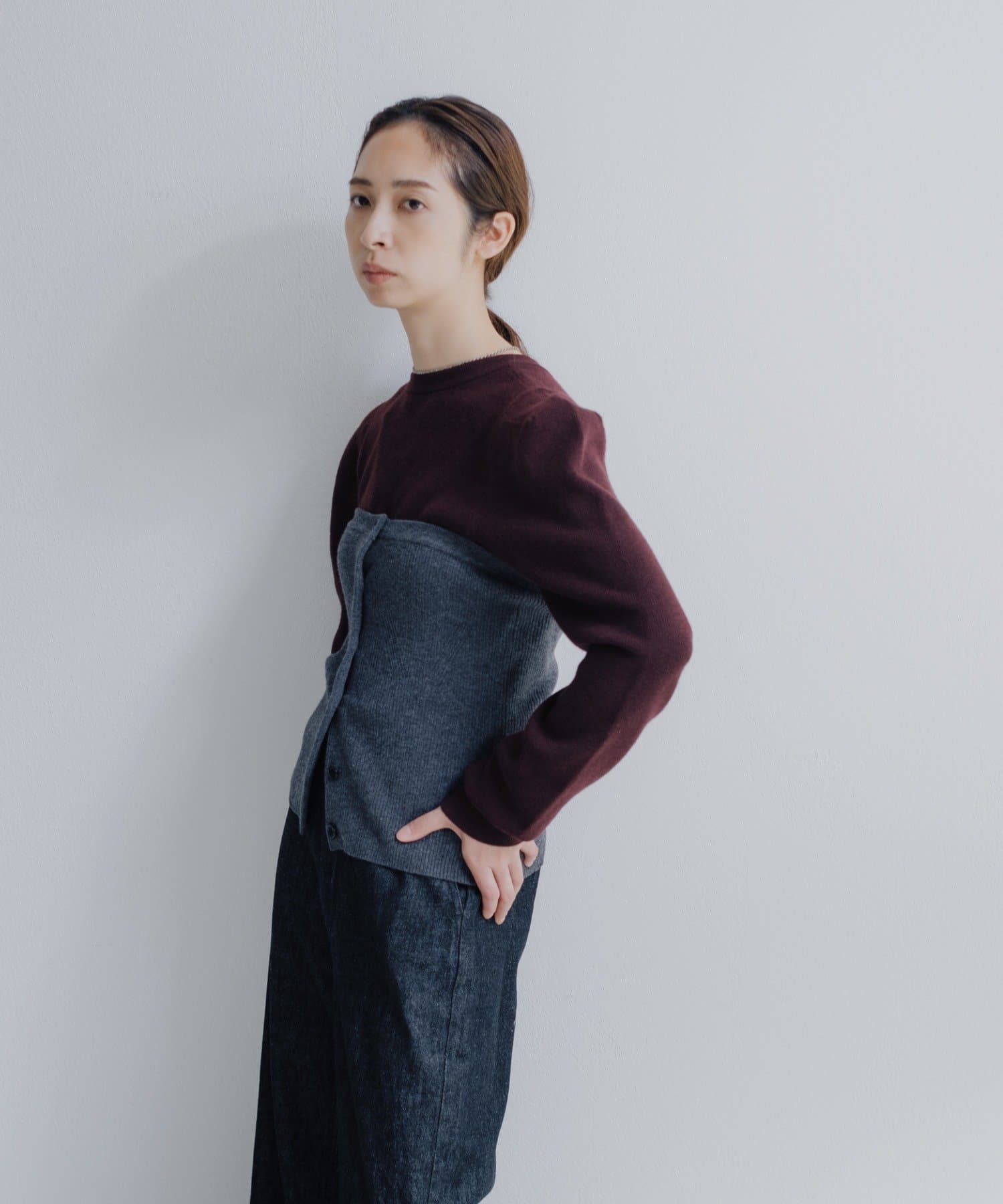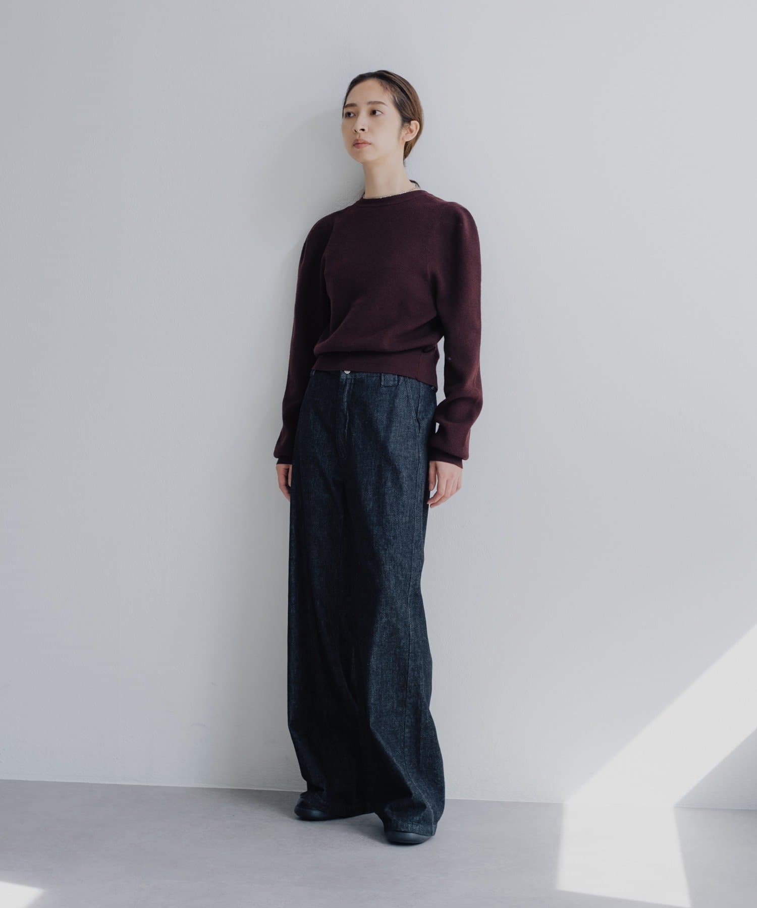 ナチュラルになりすぎず、かといって張り切りすぎない、理想のニットカーディガンが出来ました。今シーズンの秋アウターは気温調整が簡単なカーディガンが活躍の予感。ワイドパンツとのスタイリングにバランスのとりやすい、コンパクトなサイジングに設定をしていますが、肩の丸みや上半身の厚みが悪目立ちしないようなシルエットづくりに拘りました。昨年作っていたアームカバーとSETの半袖ニットのショルダーデザインをベースに、袖山にタックを入れたりギャザーを入れず自然な丸いフォルムを形作っています。個性的になりすぎることなく綺麗にスタイルアップできる気分の上がる1着に仕上がりました。